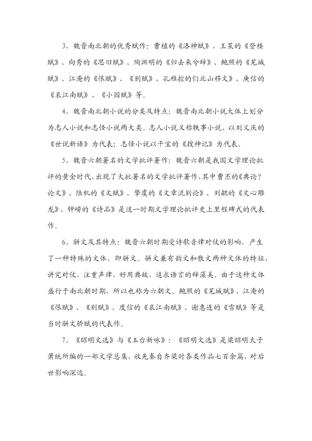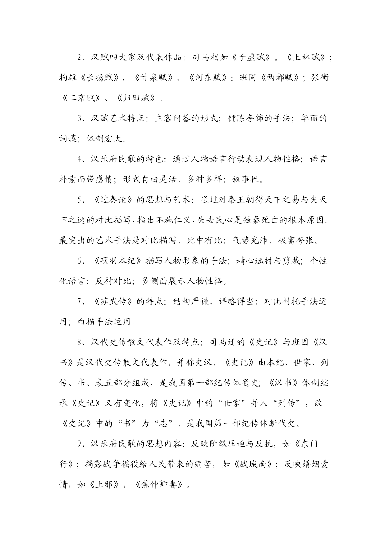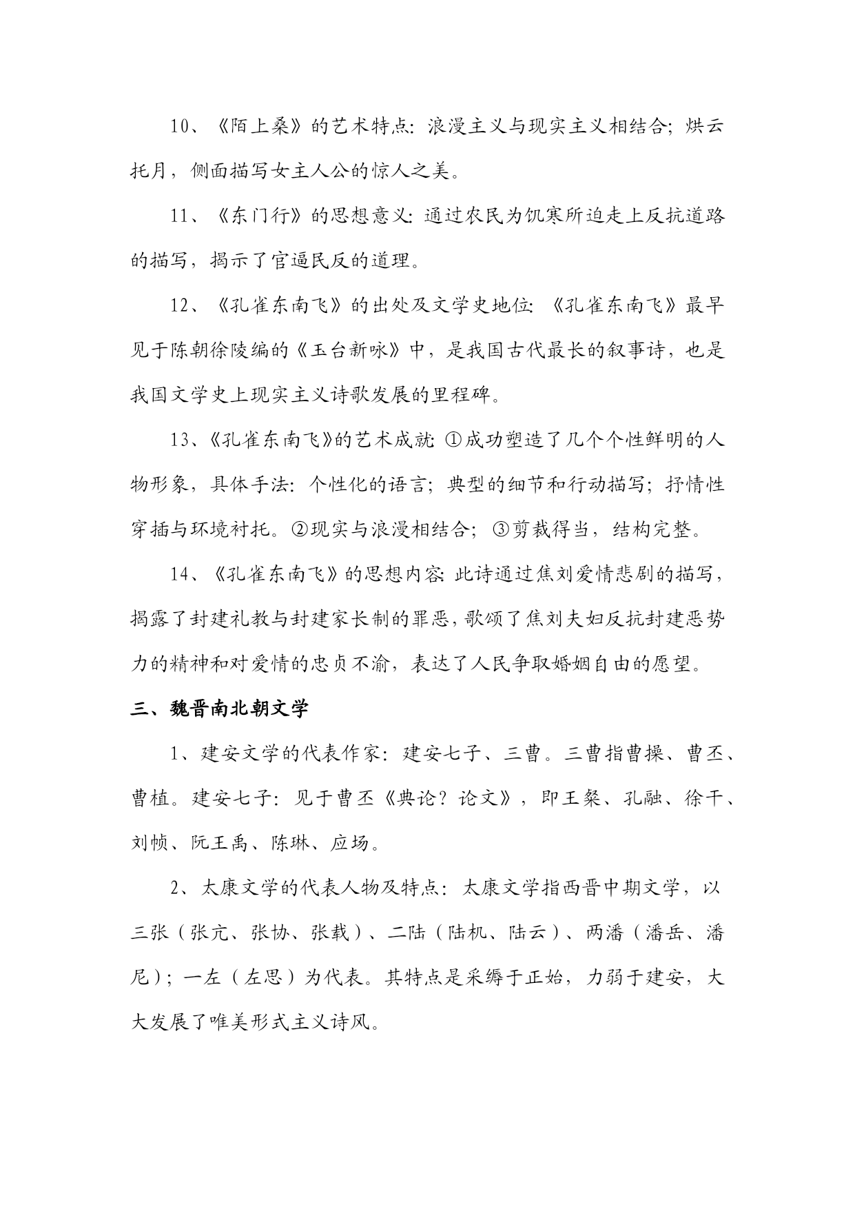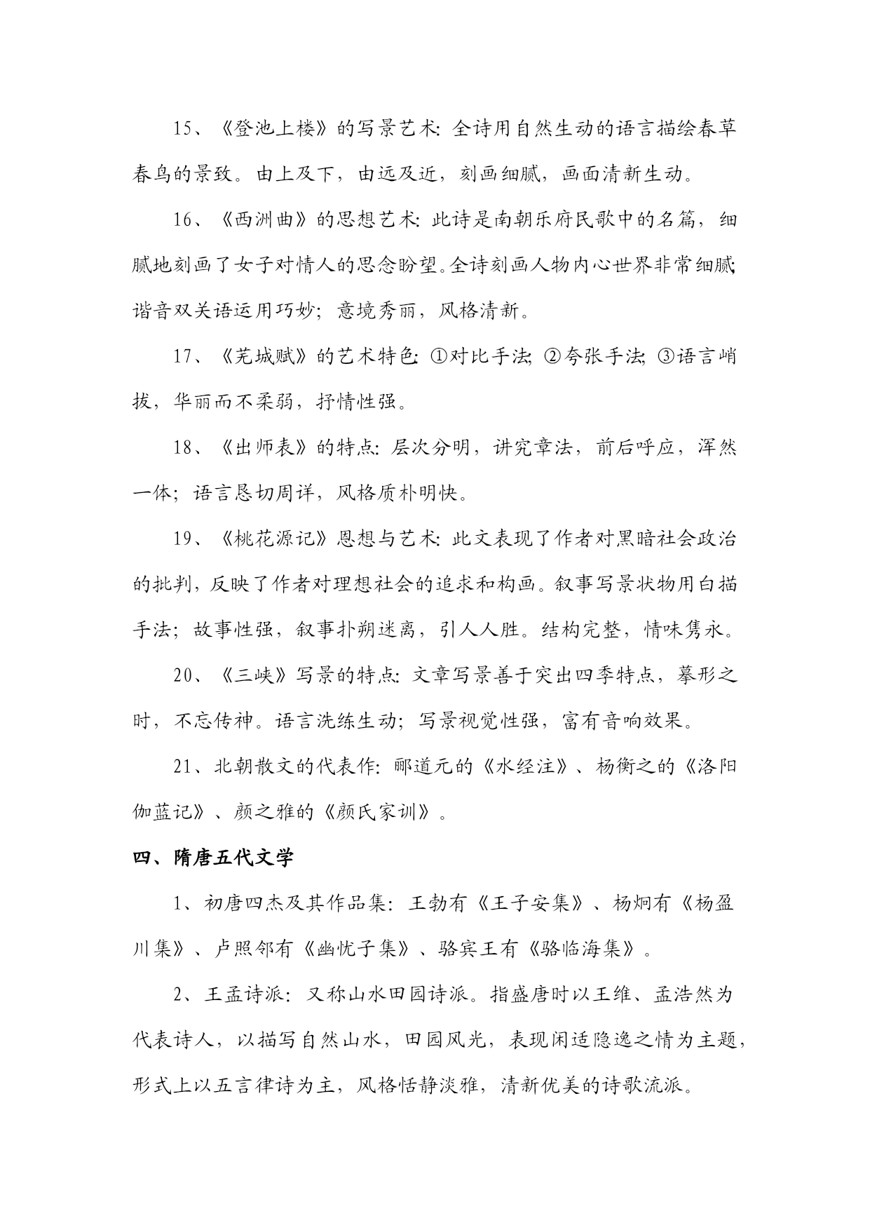 《中国古代文学作品选》知识汇编一、先秦文学1、《诗经》是我国第一部诗歌总集。分风、雅、颂三部分。风包括十五国风,160篇;雅分大雅、小雅,105篇;颂包括周颂,鲁颂,商颂,共40篇。2、《诗经》学史上有“三家诗”、“四家诗”之说。《诗经》“六义”指风、雅、颂、赋、比、兴。3、《诗经》的艺术成就:赋、比、兴手法的普遍采用;现实主义精神;重章复沓的章法;词汇丰富,韵律和谐。4、《诗经》的作品:《氓》是一首弃妇诗,叙述了一个女子从恋爱,结婚到被弃的全过程。此诗结构完整,叙事、议论、抒情巧妙结合,赋比兴手法运用巧妙。《黍离》抒情、议论、描写有机结合,寓深沉的亡国之痛于平实简介的语言之中,描绘了一个充满忧患意识且孤独寂寞的诗人形象。《君子于役》是一首思妇诗,白描是其最突出的艺术手法。《蒹葭》是一首情歌,托物比兴,情景交融的手法,虚实相间的手的关于农业生产情况的记录,也是国风最长的一篇。此篇反映了当时阶级社会的压迫与剥削,是周代社会的风俗画。以时令顺序来描写奴隶劳动与生活,适用对比描写,表现奴隶与奴隶主之间的对立,语言朴实,多用连绵词,增加了诗歌的音乐感。二、秦汉文学1、汉代政论散文的代表性作品:贾谊《过秦论》、晁错《论贵栗疏》、桓宽《盐铁论》、王符《潜夫论》,仲长流《昌言》。2、汉赋四大家及代表作品:司马相如《子虚赋》。《上林赋》;拘雄《长扬赋》,《甘泉赋》、《河东赋》:班固《两都赋》;张衡《二京赋》、《归田赋》。3、汉赋艺术特点:主客问答的形式;铺陈夸饰的手法;华丽的词藻;体制宏大。4、汉乐府民歌的特色:通过人物语言行动表现人物性格;语言朴素而带感情;形式自由灵活,多种多样;叙事性。5、《过秦论》的思想与艺术:通过对秦王朝得天下之易与失天下之速的对比描写,指出不施仁义,失去民心是强秦死亡的根本原因。最突出的艺术手法是对比描写,比中有比;气势充沛,极富夸张。6、《项羽本纪》描写人物形象的手法;精心选材与剪裁;个性化语言;反衬对比;多侧面展示人物性格。7、《苏武传》的特点:结构严谨,详略得当;对比衬托手法运用;白描手法运用。8、汉代史传散文代表作及特点:司马迁的《史记》与班固《汉书》是汉代史传散文代表作,并称史汉。《史记》由本纪、世家、列传、书、表五部分组成,是我国第一部纪传体通史;《汉书》体制继承《史记》又有变化,将《史记》中的“世家”并入“列传”,改《史记》中的“书”为“志”,是我国第一部纪传体断代史。9、汉乐府民歌的思想内容:反映阶级压迫与反抗,如《东门行》;揭露战争徭役给人民带来的痛苦,如《战城南》;反映婚姻爱情,如《上邪》,《焦仲卿妻》。10、《陌上桑》的艺术特点:浪漫主义与现实主义相结合;烘云托月,侧面描写女主人公的惊人之美。11、《东门行》的思想意义:通过农民为饥寒所迫走上反抗道路的描写,揭示了官逼民反的道理。12、《孔雀东南飞》的出处及文学史地位:《孔雀东南飞》最早见于陈朝徐陵编的《玉台新咏》中,是我国古代最长的叙事诗,也是我国文学史上现实主义诗歌发展的里程碑。13、《孔雀东南飞》的艺术成就:①成功塑造了几个个性鲜明的人物形象,具体手法:个性化的语言;典型的细节和行动描写;抒情性穿插与环境衬托。②现实与浪漫相结合;③剪裁得当,结构完整。14、《孔雀东南飞》的思想内容:此诗通过焦刘爱情悲剧的描写,揭露了封建礼教与封建家长制的罪恶,歌颂了焦刘夫妇反抗封建恶势力的精神和对爱情的忠贞不渝,表达了人民争取婚姻自由的愿望。三、魏晋南北朝文学1、建安文学的代表作家:建安七子、三曹。三曹指曹操、曹丕、曹植。建安七子:见于曹丕《典论?论文》,即王粲、孔融、徐干、刘帧、阮王禹、陈琳、应场。2、太康文学的代表人物及特点:太康文学指西晋中期文学,以三张(张亢、张协、张载)、二陆(陆机、陆云)、两潘(潘岳、潘尼);一左(左思)为代表。其特点是采缛于正始,力弱于建安,大大发展了唯美形式主义诗风。3、魏晋南北朝的优秀赋作:曹植的《洛神赋》、王莱的《登楼赋》、向秀的《思旧赋》、陶渊明的《归去来兮辞》、鲍照的《芜城赋》、江淹的《恨赋》、《别赋》、孔稚控的们北山移文》、庚信的《哀江南赋》、《小园赋》等。4、魏晋南北朝小说的分类及特点:魏晋南北朝小说大体上划分为志人小说和志怪小说两大类。志人小说又称轶事小说,以刘义庆的《世说新语》为代表;志怪小说以干宝的《搜神记》为代表。5、魏晋六朝著名的文学批评著作:魏晋六朝是我国文学理论批评的黄金时代,出现了大批著名的文学批评著作,其中曹丕的《典论?论文》、陆机的《文赋》、挚虞的《文章流别论》、刘勰的《文心雕龙》、钟崂的《诗品》是这一时期文学理论批评史上里程碑式的代表作。6、骈文及其特点:魏晋六朝时期受诗歌音律对仗的影响,产生了一种特殊的文体,即骈文。骈文兼
