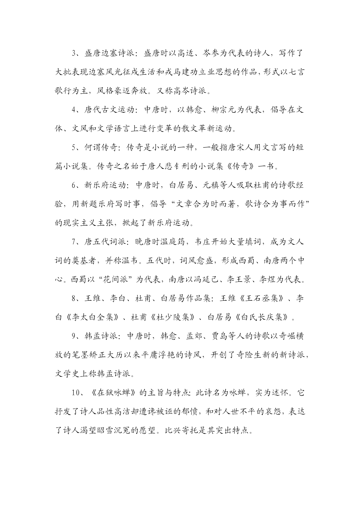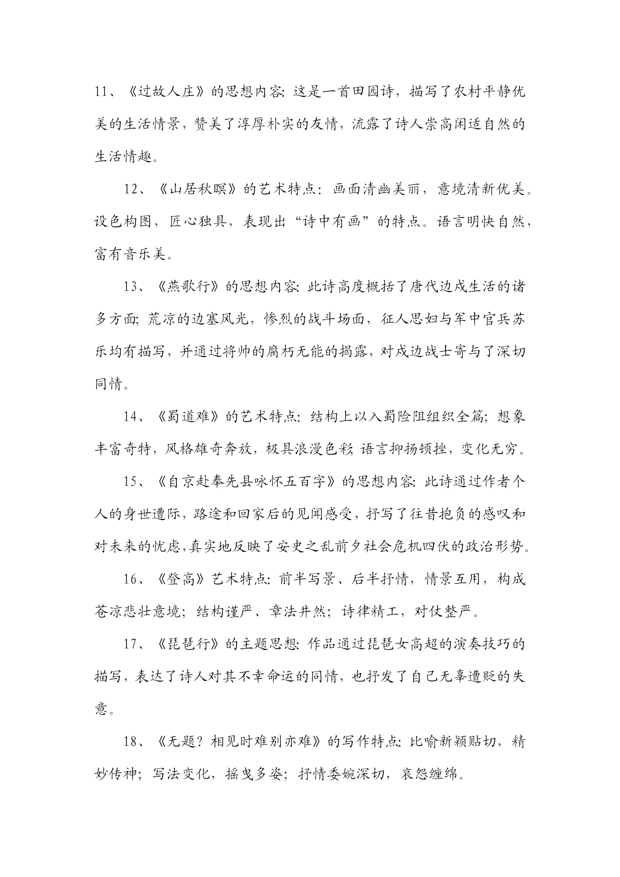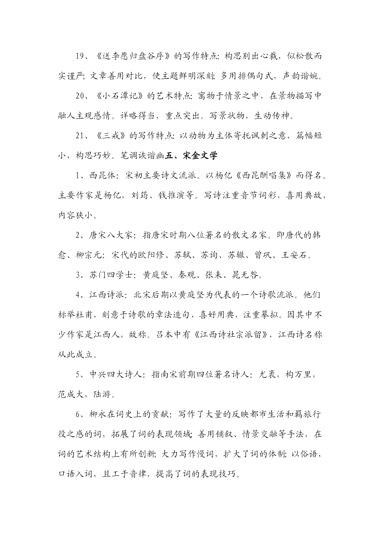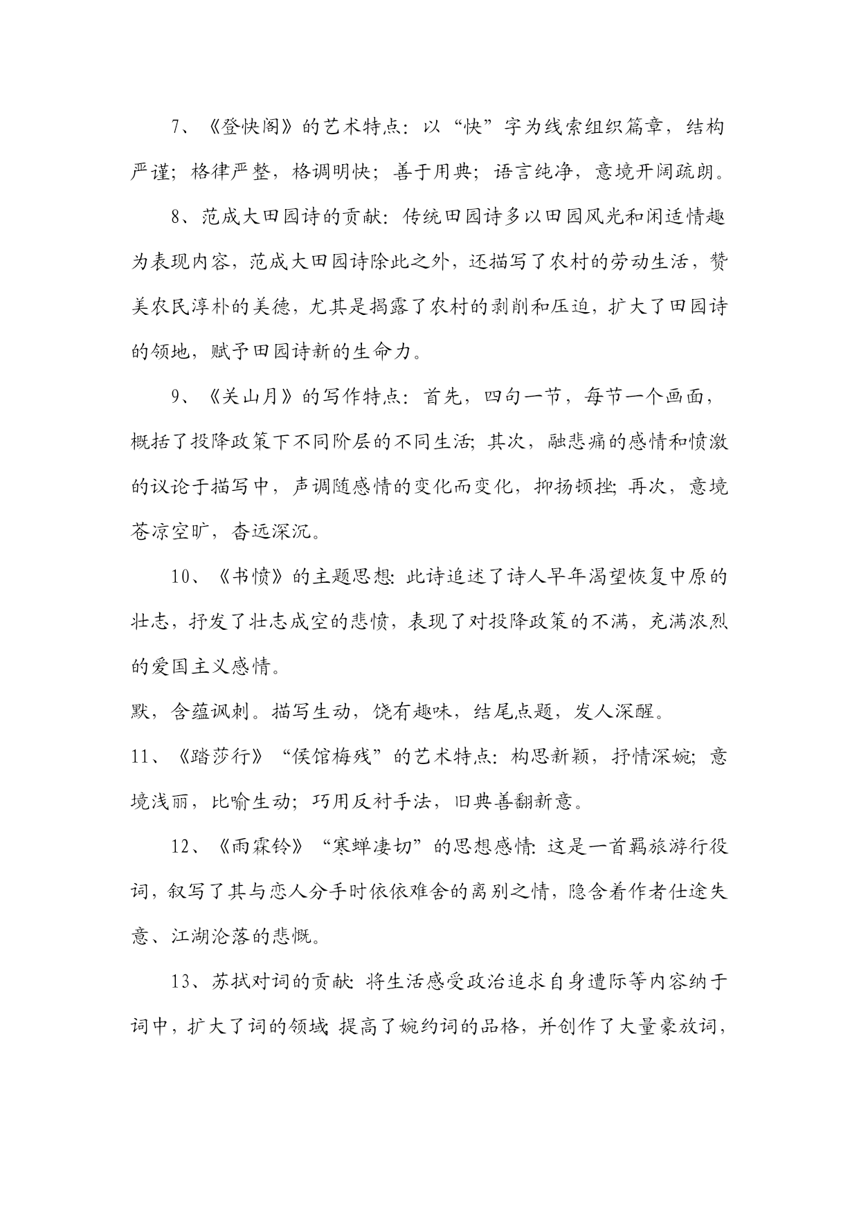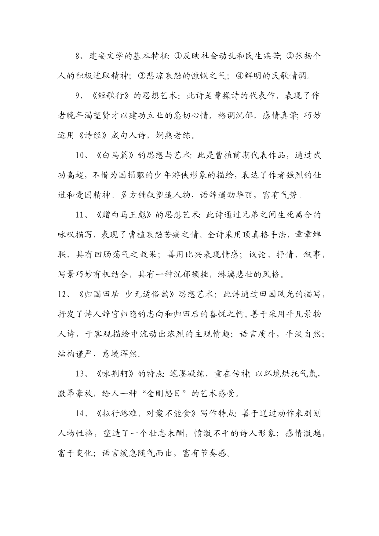 《中国古代文学作品选》知识汇编一、先秦文学1、《诗经》是我国第一部诗歌总集。分风、雅、颂三部分。风包括十五国风,160篇;雅分大雅、小雅,105篇;颂包括周颂,鲁颂,商颂,共40篇。2、《诗经》学史上有“三家诗”、“四家诗”之说。《诗经》“六义”指风、雅、颂、赋、比、兴。3、《诗经》的艺术成就:赋、比、兴手法的普遍采用;现实主义精神;重章复沓的章法;词汇丰富,韵律和谐。4、《诗经》的作品:《氓》是一首弃妇诗,叙述了一个女子从恋爱,结婚到被弃的全过程。此诗结构完整,叙事、议论、抒情巧妙结合,赋比兴手法运用巧妙。《黍离》抒情、议论、描写有机结合,寓深沉的亡国之痛于平实简介的语言之中,描绘了一个充满忧患意识且孤独寂寞的诗人形象。《君子于役》是一首思妇诗,白描是其最突出的艺术手法。《蒹葭》是一首情歌,托物比兴,情景交融的手法,虚实相间的手的关于农业生产情况的记录,也是国风最长的一篇。此篇反映了当时阶级社会的压迫与剥削,是周代社会的风俗画。以时令顺序来描写奴隶劳动与生活,适用对比描写,表现奴隶与奴隶主之间的对立,语言朴实,多用连绵词,增加了诗歌的音乐感。二、秦汉文学1、汉代政论散文的代表性作品:贾谊《过秦论》、晁错《论贵栗疏》、桓宽《盐铁论》、王符《潜夫论》,仲长流《昌言》。2、汉赋四大家及代表作品:司马相如《子虚赋》。《上林赋》;拘雄《长扬赋》,《甘泉赋》、《河东赋》:班固《两都赋》;张衡《二京赋》、《归田赋》。3、汉赋艺术特点:主客问答的形式;铺陈夸饰的手法;华丽的词藻;体制宏大。4、汉乐府民歌的特色:通过人物语言行动表现人物性格;语言朴素而带感情;形式自由灵活,多种多样;叙事性。5、《过秦论》的思想与艺术:通过对秦王朝得天下之易与失天下之速的对比描写,指出不施仁义,失去民心是强秦死亡的根本原因。最突出的艺术手法是对比描写,比中有比;气势充沛,极富夸张。6、《项羽本纪》描写人物形象的手法;精心选材与剪裁;个性化语言;反衬对比;多侧面展示人物性格。7、《苏武传》的特点:结构严谨,详略得当;对比衬托手法运用;白描手法运用。8、汉代史传散文代表作及特点:司马迁的《史记》与班固《汉书》是汉代史传散文代表作,并称史汉。《史记》由本纪、世家、列传、书、表五部分组成,是我国第一部纪传体通史;《汉书》体制继承《史记》又有变化,将《史记》中的“世家”并入“列传”,改《史记》中的“书”为“志”,是我国第一部纪传体断代史。9、汉乐府民歌的思想内容:反映阶级压迫与反抗,如《东门行》;揭露战争徭役给人民带来的痛苦,如《战城南》;反映婚姻爱情,如《上邪》,《焦仲卿妻》。10、《陌上桑》的艺术特点:浪漫主义与现实主义相结合;烘云托月,侧面描写女主人公的惊人之美。11、《东门行》的思想意义:通过农民为饥寒所迫走上反抗道路的描写,揭示了官逼民反的道理。12、《孔雀东南飞》的出处及文学史地位:《孔雀东南飞》最早见于陈朝徐陵编的《玉台新咏》中,是我国古代最长的叙事诗,也是我国文学史上现实主义诗歌发展的里程碑。13、《孔雀东南飞》的艺术成就:①成功塑造了几个个性鲜明的人物形象,具体手法:个性化的语言;典型的细节和行动描写;抒情性穿插与环境衬托。②现实与浪漫相结合;③剪裁得当,结构完整。14、《孔雀东南飞》的思想内容:此诗通过焦刘爱情悲剧的描写,揭露了封建礼教与封建家长制的罪恶,歌颂了焦刘夫妇反抗封建恶势力的精神和对爱情的忠贞不渝,表达了人民争取婚姻自由的愿望。三、魏晋南北朝文学1、建安文学的代表作家:建安七子、三曹。三曹指曹操、曹丕、曹植。建安七子:见于曹丕《典论?论文》,即王粲、孔融、徐干、刘帧、阮王禹、陈琳、应场。2、太康文学的代表人物及特点:太康文学指西晋中期文学,以三张(张亢、张协、张载)、二陆(陆机、陆云)、两潘(潘岳、潘尼);一左(左思)为代表。其特点是采缛于正始,力弱于建安,大大发展了唯美形式主义诗风。3、魏晋南北朝的优秀赋作:曹植的《洛神赋》、王莱的《登楼赋》、向秀的《思旧赋》、陶渊明的《归去来兮辞》、鲍照的《芜城赋》、江淹的《恨赋》、《别赋》、孔稚控的们北山移文》、庚信的《哀江南赋》、《小园赋》等。4、魏晋南北朝小说的分类及特点:魏晋南北朝小说大体上划分为志人小说和志怪小说两大类。志人小说又称轶事小说,以刘义庆的《世说新语》为代表;志怪小说以干宝的《搜神记》为代表。5、魏晋六朝著名的文学批评著作:魏晋六朝是我国文学理论批评的黄金时代,出现了大批著名的文学批评著作,其中曹丕的《典论?论文》、陆机的《文赋》、挚虞的《文章流别论》、刘勰的《文心雕龙》、钟崂的《诗品》是这一时期文学理论批评史上里程碑式的代表作。6、骈文及其特点:魏晋六朝时期受诗歌音律对仗的影响,产生了一种特殊的文体,即骈文。骈文兼