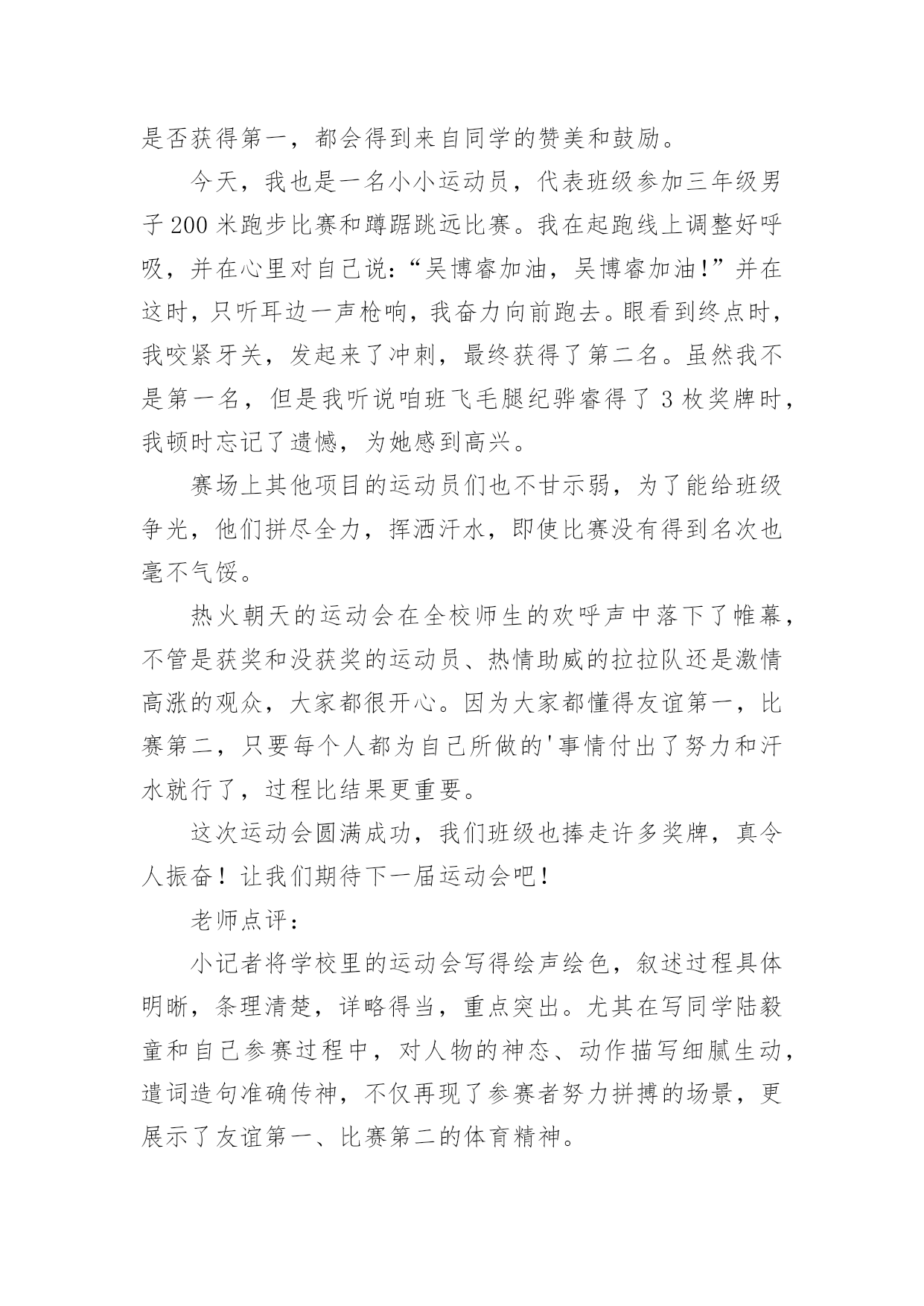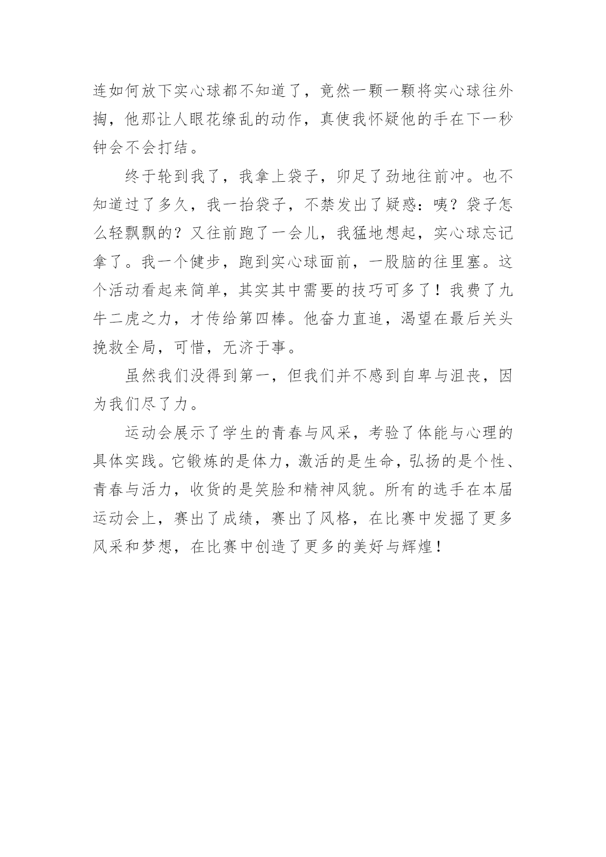 《运动会》作文600字在我们平凡的日常里,大家都接触过作文吧,作文是经过人的思想考虑和语言组织,通过文字来表达一个主题意义的记叙方法。你写作文时总是无从下笔?以下是小编精心整理的《运动会》作文600字,欢迎阅读与收藏。《运动会》作文600字1在一个下着绵绵细雨的星期日,我校迎来了第七届运动会。虽然天公不作美,但这丝毫影响不到同学们激动的心情和运动员们参赛的激情。在开幕仪式上,各班同学高喊着响亮的口号,迈着整齐的步伐,走向主席台。用丰富多彩的节目,为各班级运动员加油鼓劲。同时这些节目也体现了各个班级的特色文化。今天来现场的还有一支特殊的队伍――“运动爸爸”志愿者方阵,他们的登场让同学们惊喜不已,所到之处都是热烈的掌声。比赛即将开始了,整个赛场顿时沸腾起来。只见各个比赛项目运动员们早已各就各位,摩拳擦掌,跃跃欲试。只听“砰”的一声,跑步的运动员们像离弦的箭一样“射”出去。赛道两旁的“啦啦队”加油助威声此起彼伏,络绎不绝。快瞧我们班的陆毅童,在临近终点时后势发力,一个冲刺连续超越前面的第二,第一名赛手,最后一马当先,一举夺得了冠军,不愧是我们班的最佳的夺冠人选!当然,不论运动员是否获得第一,都会得到来自同学的赞美和鼓励。今天,我也是一名小小运动员,代表班级参加三年级男子200米跑步比赛和蹲踞跳远比赛。我在起跑线上调整好呼吸,并在心里对自己说:“吴博睿加油,吴博睿加油!”并在这时,只听耳边一声枪响,我奋力向前跑去。眼看到终点时,我咬紧牙关,发起来了冲刺,最终获得了第二名。虽然我不是第一名,但是我听说咱班飞毛腿纪骅睿得了3枚奖牌时,我顿时忘记了遗憾,为她感到高兴。赛场上其他项目的运动员们也不甘示弱,为了能给班级争光,他们拼尽全力,挥洒汗水,即使比赛没有得到名次也毫不气馁。热火朝天的运动会在全校师生的欢呼声中落下了帷幕,不管是获奖和没获奖的运动员、热情助威的拉拉队还是激情高涨的观众,大家都很开心。因为大家都懂得友谊第一,比赛第二,只要每个人都为自己所做的'事情付出了努力和汗水就行了,过程比结果更重要。这次运动会圆满成功,我们班级也捧走许多奖牌,真令人振奋!让我们期待下一届运动会吧!老师点评:小记者将学校里的运动会写得绘声绘色,叙述过程具体明晰,条理清楚,详略得当,重点突出。尤其在写同学陆毅童和自己参赛过程中,对人物的神态、动作描写细腻生动,遣词造句准确传神,不仅再现了参赛者努力拼搏的场景,更展示了友谊第一、比赛第二的体育精神。《运动会》作文600字2“加油,加油!”操场上传来一片排山倒海般的呼喊声,猛如雄狮,气壮山河,学校的运动会正式拉开帷幕。不幸的是,青春的号角未能奏响明媚的阳光,反之,却迎来了秋日的蒙蒙雨色。但是,这一切的一切并不能阻挡我们的努力拼搏,追求胜利,为班级争光的步伐。天时不如地利,地利不如人和,三者之中,人和最重要。你看!赛场上的运动员健步如飞,你追我赶,像利剑般冲向终点。虽然一个个都汗流浃背,可谁也不甘示弱。蹦蹦跳跳的小袋鼠们争先恐后;实心球像飞翔的鸟儿一样把灰蒙蒙的天空装点地别有一番风味,比赛的氛围更是被推向高潮!时隔几日,若再让我回想,那我一定毫不犹豫地选择“抢收抢种”,因为我也是队伍中的一员。漫长的等待,比赛终于开始了。只听见“吱――”的一声哨响,第一棒同学楞了一下,随机像豺狗般扑向那堆肉,等他拎着袋子回来时,别的队伍第二棒选手已经出发了。第二棒的同学生怕落后,抢了袋子就如离弦的箭般刺了出去。可是,拉弓射箭时,箭射的远不远不仅要看用的力气大不大,同时也要掌握技巧,考虑箭本身的重量。渐渐的,他看起来有点体力不支了,不知道是不是袋子里的实心球太重了。欲速则不达,越是心急,就越是落后。到了终点,他连如何放下实心球都不知道了,竟然一颗一颗将实心球往外掏,他那让人眼花缭乱的动作,真使我怀疑他的手在下一秒钟会不会打结。终于轮到我了,我拿上袋子,卯足了劲地往前冲。也不知道过了多久,我一抬袋子,不禁发出了疑惑:咦?袋子怎么轻飘飘的?又往前跑了一会儿,我猛地想起,实心球忘记拿了。我一个健步,跑到实心球面前,一股脑的往里塞。这个活动看起来简单,其实其中需要的技巧可多了!我费了九牛二虎之力,才传给第四棒。他奋力直追,渴望在最后关头挽救全局,可惜,无济于事。虽然我们没得到第一,但我们并不感到自卑与沮丧,因为我们尽了力。运动会展示了学生的青春与风采,考验了体能与心理的具体实践。它锻炼的是体力,激活的是生命,弘扬的是个性、青春与活力,收货的是笑脸和精神风貌。所有的选手在本届运动会上,赛出了成绩,赛出了风格,在比赛中发掘了更多风采和梦想,在比赛中创造了更多的美好与辉煌!