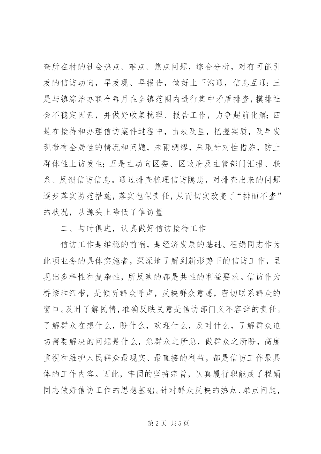 第PAGE\*Arabic\*MERGEFORMAT5页共NUMPAGES\*MERGEFORMAT5页信访司法先进事迹材料xx同志是洛河司法所所长,负责镇司法、综治、信访工作,自从事信访工作以来,她从“保稳定,促发展”的高度,认真贯彻执行《信访条例》,做到身怀民心,执政为民,利为民所谋,紧紧围绕百姓关心的热点难点问题,踏踏实实地开展信访工作,解决百姓的实际困难和问题,为营造洛河镇稳定的社会环境,促进区域经济平稳持续发展做出了贡献。一、重视信访工作,将信访责任落到实处当前,随着洛河镇各项事业的发展以及胡圩村土地征用、朝阳东路延伸等工程项目的建设,各种利益冲突时有发生,形成许多不稳定因素。信访工作任务重、覆盖面大,成为镇党政领导极度关心和重视的热点问题,在这种情况下,程娟同志坚持把信访工作当作大事来抓,每季度坚持召开一次信访工作例会,做到部署全局,坚持领导首问,层层落实责任制,对上访人员反映的问题进行研究,给予及时处理,形成了全镇抓信访,人人参与信访工作的新局面。同时,结合洛河镇信访工作的实际,程娟同志还指导构建了全镇“横到边,纵到底”多方位宽领域的信息网络体系。一是配齐配强村级信访信息员队伍,发挥其身处基层,发现信访苗头早,掌握信访信息多的优势,及时反馈信访信息;二是以村级组织为主体,建立了村级矛盾排查调处站,通过了解社情民意,积极排查所在村的社会热点、难点、焦点问题,综合分析,对有可能引发的信访动向,早发现、早报告,做好上下沟通,信息互通;三是与镇综治办联合每月在全镇范围内进行集中矛盾排查,摸排社会不稳定因素,并做好收集梳理、报告工作,力争超前化解;四是在接待和办理信访案件过程中,由表及里,把握实质,及早发现带有全局性的情况和问题,未雨绸缪,采取针对性措施,防止群体性上访发生;五是主动向区委、区政府及主管部门汇报、联系、反馈信访信息。通过排查梳理信访隐患,对排查出来的问题逐步落实防范措施,落实包保责任,从而切实改变了“排而不查”的状况,从源头上降低了信访量二、与时俱进,认真做好信访接待工作信访工作是维稳的前哨,是经济发展的基础。程娟同志作为此项业务的具体实施者,深深地了解到新形势下的信访工作,呈现出多样性和复杂性,所反映的都是共性的利益要求。信访作为桥梁和纽带,是倾听群众呼声,反映群众意愿,密切联系群众的窗口。及时了解民情,准确反映民意是信访部门义不容辞的责任。了解群众在想什么,盼什么,欢迎什么,反对什么,了解群众迫切需要解决的问题是什么,急群众之所急,做群众之所盼,高度重视和维护人民群众最现实、最直接的利益,都是信访工作最具体的工作内容。因此,牢固的坚持宗旨,认真履行职能成了程娟同志做好信访工作的思想基础。针对群众反映的热点、难点问题,她坚持以人为本的工作方法,在宣传教育、引导的同时尊重、理解、关心上访人,在信访接待工作中能够平等待人,以理服人,以情感人,把解决思想问题和解决实际问题结合起来,千方百计为群众排忧解难。信访工作说到底就是群众工作,每天面对的就是群众,以什么心态去面对,以什么样的感情去处理矛盾,这是每个信访干部必须直面的问题。作为一名女同志,在做信访工作坚持讲政策,讲法治的同时,程娟同志讲的更多的是对群众的感情。她认为讲感情就是尊重群众意愿,对人民群众倾心关切,站在群众立场维护群众利益。大多数信访的群众都是弱势群体,反映的问题处理难度都很大,就更要我们带着深厚的感情去面对信访群众,千方百计帮助他们解决实际困难。采取群众乐于接受或能够理解的方法及时化解矛盾。从另一个角度讲,信访工作是党和政府联系群众的桥梁,只有带着深厚感情做好信访工作,群众才能从我们一点一滴的的工作中,真切体会到党和政府的温暖,党和政府在群众中威信就会越来越高,就会形成强大的凝聚力,就能更好地加促进发展。例如在实际的接访过程中,会遇到很多老大难的问题,光靠执行政策讲法律是根本行不通也无法说服老百姓的,程娟同志就不厌其烦的地对那些重复访的群众进行耐心的劝服、教育,告诉他们换位思考,将心比心,不能因为个人的一点私利就否定政府的工作以及党对农民群众的关心。经过以理育人、以情服人,十分有效地遏制了多起上访隐患,为保一方平安作出了较大的贡献。在做好信访接待工作的同时,程娟同志还注重抓信访各项机制的健全。建立健全了信访隐患排查机制,争取超前做好信访预案,把握主动性,变单一处理为综合治理。对苗头性,倾向性的社会现象,早介入、早化解,做到信访不出镇。对一些集体访、重复访及群体性事件等突出问题,结合实际,研究制定实施方案,成立处理领导小组,由主要负责人一手抓到底,一套班子联动,一个方案应对,对每一件信访案件认真梳理核查,实行“四定”,即定领导、定专人、定方案、定时限,逐一处理落实。同时做到问题不查清不放过,问题不解决不放过,有关措施不落实