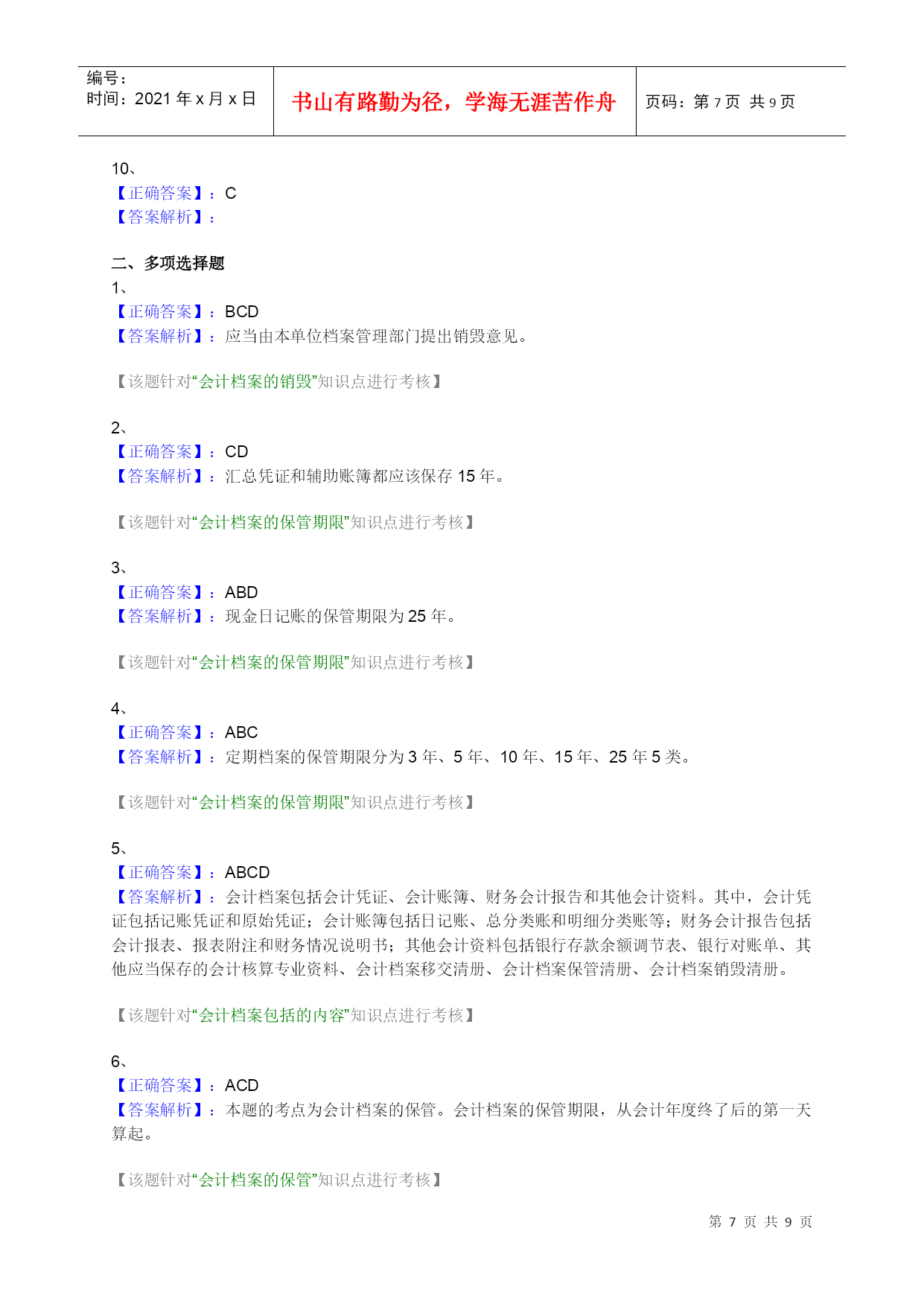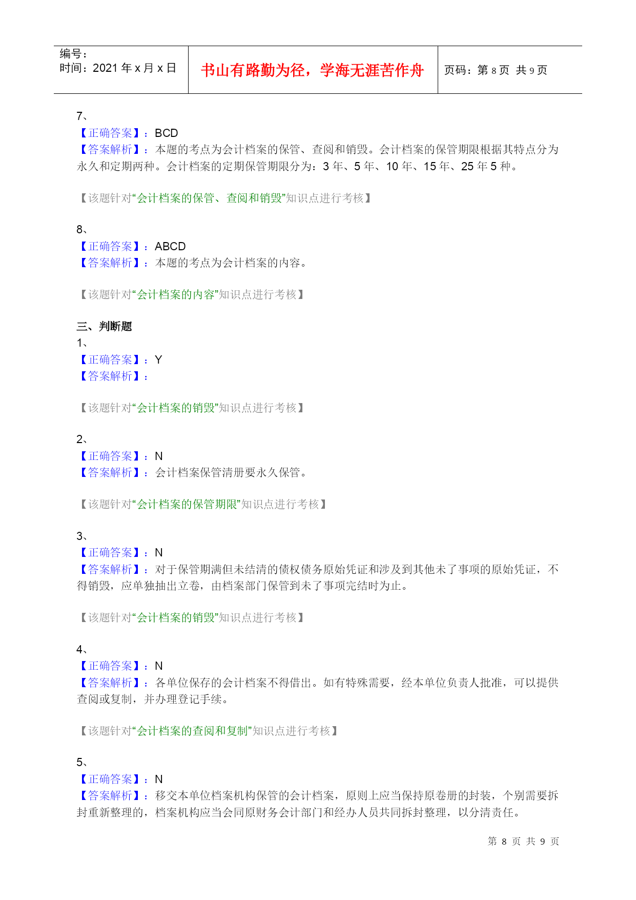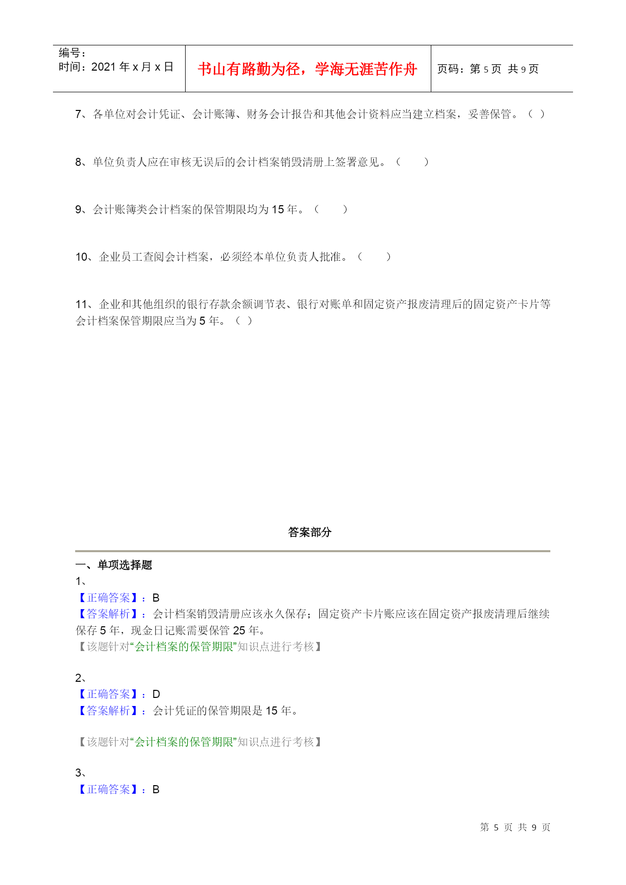 编号:时间:2021年x月x日书山有路勤为径,学海无涯苦作舟页码:第PAGE9页共NUMPAGES9页第PAGE\*MERGEFORMAT9页共NUMPAGES\*MERGEFORMAT9页第八章会计档案一、单项选择题1、下列说法正确的是()。A.会计档案销毁清册需要保管15年B.银行存款余额调节表需要保管5年C.固定资产卡片账应保管15年D.现金日记账需要保管15年2、原始凭证和记账凭证的保管期限为()年。A.3年B.5年C.10年D.15年3、下列会计档案中需要保管15年的是()。A.月、季度财务报告B.明细账C.会计档案保管清册D.银行对账单4、各单位每年形成的会计档案,都应由本单位()负责整理立卷,装订成册,编制会计档案保管清册。A.档案部门B.财务会计部门C.人事部门D.指定专人5、以下内容不属于会计档案的是()。A.银行存款日记账B.总账C.购销合同D.购货发票6、按照《会计档案管理办法》的规定,企业记账凭证的保管期限为()。A.15年B.5年C.3年D.10年7、保管期限为25年的会计档案有()。A.各类会计凭证和会计账簿B.银行存款余额调节表和银行对账单C.现金、银行存款及税收日记账D.月度和季度财务会计报告8、需要永久保存的会计档案是()。A.现金日记账B.原始凭证C.会计档案保管清册D.银行对账单9、会计档案和其他类是指与会计核算、会计监督密切相关,由会计部门负责办理的有关数据资料,不包括()。A.银行对账单B.存储在磁性介质上的会计数据C.财务数据统计资料D.生产计划书10、各种会计档案的保管期限,根据其特点分为永久、定期两类。定期保管期限分为()。A.1年、3年、5年、10年、25年5种B.3年、5年、10年、15年、20年5种C.3年、5年、10年、15年、25年5种D.1年、5年、10年、15年、20年5种二、多项选择题1、关于会计档案的销毁,下列说法正确的有()。A.应当由本单位财务会计部门提出销毁意见B.应当编制会计档案销毁清册C.单位负责人应在销毁清册上签署意见D.应当由单位档案机构和会计机构共同派员监销2、下列会计档案中,需要永久保存的有()。A.汇总凭证B.辅助账簿C.年度财务报告D.会计档案销毁清册3、企业的下列会计档案中,保管期限为15年的应有()。A.固定资产总账B.库存商品明细账C.现金日记账D.长期股权投资总账4、会计档案中的定期档案的保管期限有()。A.5年B.10年C.15年D.20年5、下列属于会计档案的内容的有()。A.记账凭证B.明细分类账C.会计报表D.银行存款余额调节表6、下列关于会计档案管理的说法中正确的有()。A.出纳人员不得兼管会计档案B.会计档案的保管期限,从会计档案形成后的第一天算起C.单位负责人应在会计档案销毁清册上签署意见D.采用电子计算机进行会计核算的单位,应保存打印出的纸质会计档案7、按照《会计档案管理办法》的规定,下列说法中正确的有()。A.会计档案的保管期限分为3年、5年、10年、15年、25年5类B.正在建设期间的建设单位,其会计档案不论是否已满保管期限,一律不得销毁C.固定资产卡片于固定资产报废清理后保管5年D.会计档案为本单位提供查阅利用,不得借出,如有特殊需要,经本单位负责人批准,可以提供查阅或复制8、会计档案的内容包括()。A.会计凭证类B.会计账簿类C.财务报告类D.其他会计核算资料三、判断题1、对于保管期满但未结清的债权债务原始凭证和涉及到其他未了事项的原始凭证,不得销毁,应单独抽出立卷,由档案部门保管到未了事项完结时为止。()2、会计档案保管清册要保管15年。()3、对于保管期满的会计档案可以直接销毁。()4、各单位保存的会计档案原则上不得借出,但如有特殊需要,经本单位负责人批准,可以借出。()5、本单位的会计档案机构为方便保管会计档案,可以根据需要对其拆封重新整理。()6、当年形成的会计档案,在会计年度终了后,可暂由本单位会计机构保管一年。()7、各单位对会计凭证、会计账簿、财务会计报告和其他会计资料应当建立档案,妥善保管。()8、单位负责人应在审核无误后的会计档案销毁清册上签署意见。()9、会计账簿类会计档案的保管期限均为15年。()10、企业员工查阅会计档案,必须经本单位负责人批准。()11、企业和其他组织的银行存款余额调节表、银行对账单和固定资产报废清理后的固定资产卡片等会计档案保管期限应当为5年。()答案部分一、单项选择题1、【正确答案】:B【答案解析】:会计档案销毁清册应该永久保存;固定资产卡片账应该在固定资产报废清理后继续保存5年,现金日记账需要保管25年。【该题针对“会计档案的保管期限