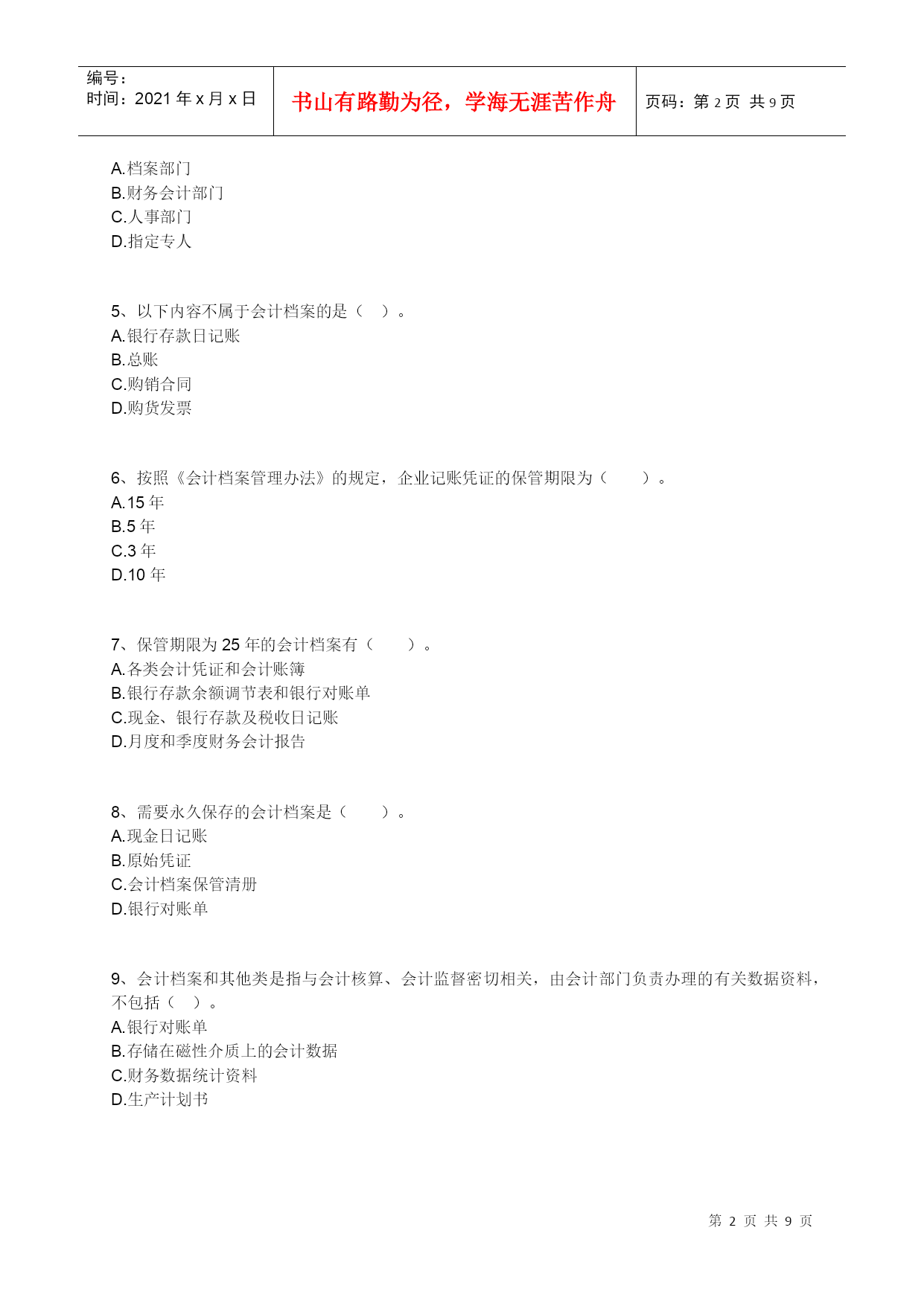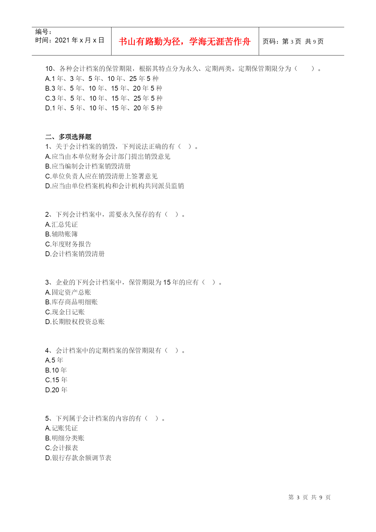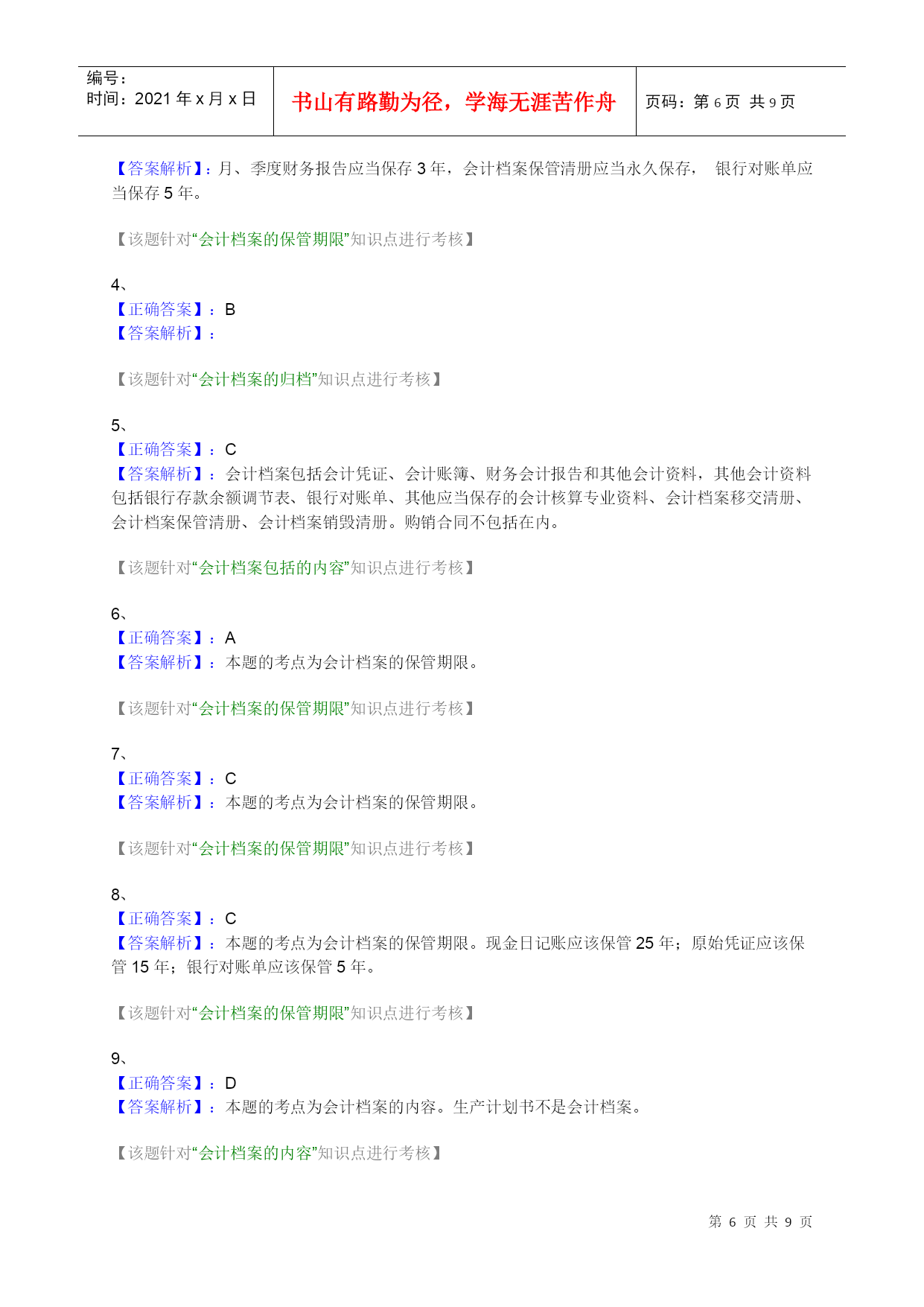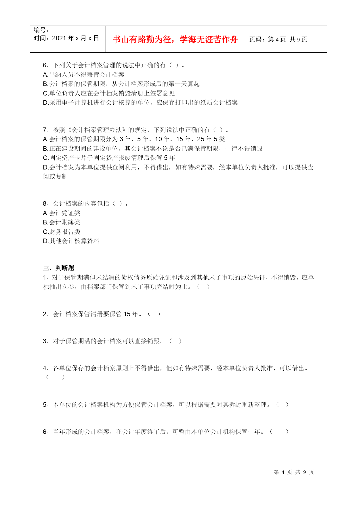 编号:时间:2021年x月x日书山有路勤为径,学海无涯苦作舟页码:第PAGE9页共NUMPAGES9页第PAGE\*MERGEFORMAT9页共NUMPAGES\*MERGEFORMAT9页第八章会计档案一、单项选择题1、下列说法正确的是()。A.会计档案销毁清册需要保管15年B.银行存款余额调节表需要保管5年C.固定资产卡片账应保管15年D.现金日记账需要保管15年2、原始凭证和记账凭证的保管期限为()年。A.3年B.5年C.10年D.15年3、下列会计档案中需要保管15年的是()。A.月、季度财务报告B.明细账C.会计档案保管清册D.银行对账单4、各单位每年形成的会计档案,都应由本单位()负责整理立卷,装订成册,编制会计档案保管清册。A.档案部门B.财务会计部门C.人事部门D.指定专人5、以下内容不属于会计档案的是()。A.银行存款日记账B.总账C.购销合同D.购货发票6、按照《会计档案管理办法》的规定,企业记账凭证的保管期限为()。A.15年B.5年C.3年D.10年7、保管期限为25年的会计档案有()。A.各类会计凭证和会计账簿B.银行存款余额调节表和银行对账单C.现金、银行存款及税收日记账D.月度和季度财务会计报告8、需要永久保存的会计档案是()。A.现金日记账B.原始凭证C.会计档案保管清册D.银行对账单9、会计档案和其他类是指与会计核算、会计监督密切相关,由会计部门负责办理的有关数据资料,不包括()。A.银行对账单B.存储在磁性介质上的会计数据C.财务数据统计资料D.生产计划书10、各种会计档案的保管期限,根据其特点分为永久、定期两类。定期保管期限分为()。A.1年、3年、5年、10年、25年5种B.3年、5年、10年、15年、20年5种C.3年、5年、10年、15年、25年5种D.1年、5年、10年、15年、20年5种二、多项选择题1、关于会计档案的销毁,下列说法正确的有()。A.应当由本单位财务会计部门提出销毁意见B.应当编制会计档案销毁清册C.单位负责人应在销毁清册上签署意见D.应当由单位档案机构和会计机构共同派员监销2、下列会计档案中,需要永久保存的有()。A.汇总凭证B.辅助账簿C.年度财务报告D.会计档案销毁清册3、企业的下列会计档案中,保管期限为15年的应有()。A.固定资产总账B.库存商品明细账C.现金日记账D.长期股权投资总账4、会计档案中的定期档案的保管期限有()。A.5年B.10年C.15年D.20年5、下列属于会计档案的内容的有()。A.记账凭证B.明细分类账C.会计报表D.银行存款余额调节表6、下列关于会计档案管理的说法中正确的有()。A.出纳人员不得兼管会计档案B.会计档案的保管期限,从会计档案形成后的第一天算起C.单位负责人应在会计档案销毁清册上签署意见D.采用电子计算机进行会计核算的单位,应保存打印出的纸质会计档案7、按照《会计档案管理办法》的规定,下列说法中正确的有()。A.会计档案的保管期限分为3年、5年、10年、15年、25年5类B.正在建设期间的建设单位,其会计档案不论是否已满保管期限,一律不得销毁C.固定资产卡片于固定资产报废清理后保管5年D.会计档案为本单位提供查阅利用,不得借出,如有特殊需要,经本单位负责人批准,可以提供查阅或复制8、会计档案的内容包括()。A.会计凭证类B.会计账簿类C.财务报告类D.其他会计核算资料三、判断题1、对于保管期满但未结清的债权债务原始凭证和涉及到其他未了事项的原始凭证,不得销毁,应单独抽出立卷,由档案部门保管到未了事项完结时为止。()2、会计档案保管清册要保管15年。()3、对于保管期满的会计档案可以直接销毁。()4、各单位保存的会计档案原则上不得借出,但如有特殊需要,经本单位负责人批准,可以借出。()5、本单位的会计档案机构为方便保管会计档案,可以根据需要对其拆封重新整理。()6、当年形成的会计档案,在会计年度终了后,可暂由本单位会计机构保管一年。()7、各单位对会计凭证、会计账簿、财务会计报告和其他会计资料应当建立档案,妥善保管。()8、单位负责人应在审核无误后的会计档案销毁清册上签署意见。()9、会计账簿类会计档案的保管期限均为15年。()10、企业员工查阅会计档案,必须经本单位负责人批准。()11、企业和其他组织的银行存款余额调节表、银行对账单和固定资产报废清理后的固定资产卡片等会计档案保管期限应当为5年。()答案部分一、单项选择题1、【正确答案】:B【答案解析】:会计档案销毁清册应该永久保存;固定资产卡片账应该在固定资产报废清理后继续保存5年,现金日记账需要保管25年。【该题针对“会计档案的保管期限