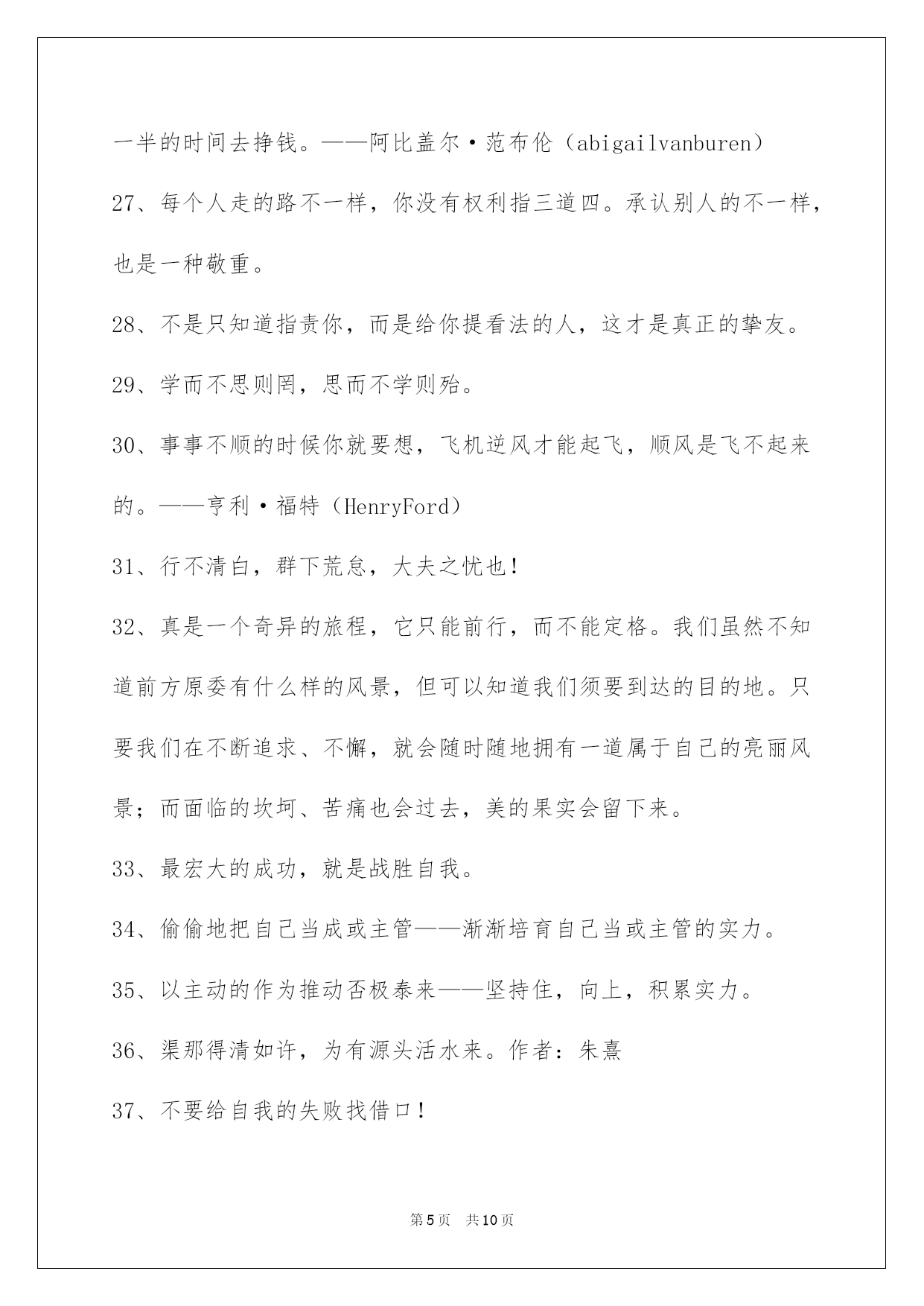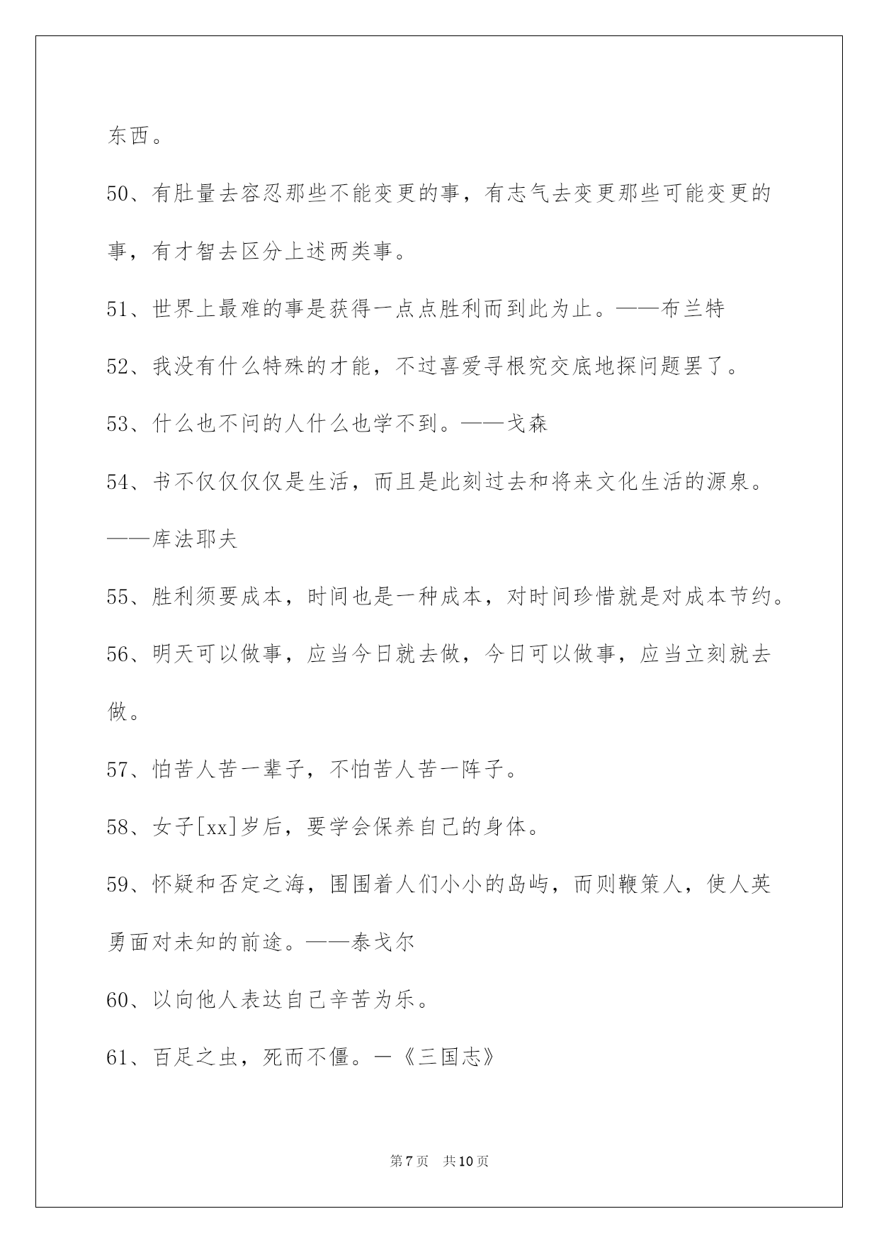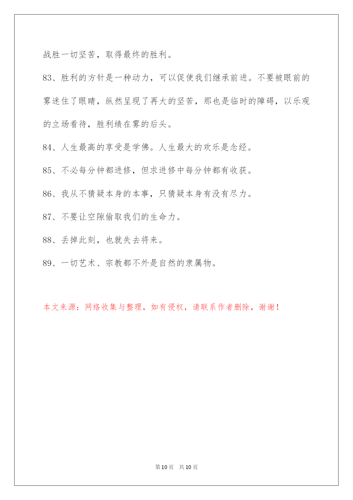 第PAGE\*Arabic\*MERGEFORMAT10页共NUMPAGES\*Arabic\*MERGEFORMAT10页第PAGE\*MERGEFORMAT10页共NUMPAGES\*MERGEFORMAT10页第PAGE\*MERGEFORMAT10页共NUMPAGES\*MERGEFORMAT10页第PAGE\*MERGEFORMAT10页共NUMPAGES\*MERGEFORMAT10页第PAGE\*MERGEFORMAT10页共NUMPAGES\*MERGEFORMAT10页第PAGE\*MERGEFORMAT10页共NUMPAGES\*MERGEFORMAT10页第PAGE\*MERGEFORMAT10页共NUMPAGES\*MERGEFORMAT10页第PAGE\*MERGEFORMAT10页共NUMPAGES\*MERGEFORMAT10页第PAGE\*MERGEFORMAT10页共NUMPAGES\*MERGEFORMAT10页第PAGE\*MERGEFORMAT10页共NUMPAGES\*MERGEFORMAT10页第PAGE\*MERGEFORMAT10页共NUMPAGES\*MERGEFORMAT10页2022励志名言89条2022年励志名言89条气力必需从本身身上找寻,你终究会独创:你是真正的强者!下面是我细心打算的励志名言89条,供大家参考借鉴,希望可以帮助到有须要的挚友。1、没有人值得你流泪,值得让你流泪的人不会让你流泪。2、失败时不要品尝它的味道,待胜利时再回头看看会觉得失败是一个起点。3、一分钟一秒钟自满,在这一分一秒间就停止了自我汲取的生命和排泄的生命。只有理解指责才能排泄精神的一切渣滓。只有汲取他人的看法,我才能添加精神上新的滋养品。―徐特立4、每一个人都应当恒久记住这个真理:只有不断超越自我的人,才是一个真正聪慧人。人生在世,每个人都有自己的独特的禀性和天赋,每个人都有自己独特的实现人生价值的切入点。你只要根据自己的禀赋发展自己,不断地超越心灵的绊马索,你就不会忽视了自己生命中的太阳,而湮没在他人的光辉里。5、缄默是一种美德,特殊是发觉别人长胖的时候。6、读经而已,则不足以知经。故某自百家诸子之书,至于《难经》《素问》《本草》诸小说无所不读,农夫女工无所不问,然后于经为能知其大体而无疑。7、分开也是一种方式,来证明在一起是否真的有意义。——李程远8、只有付诸实践,才能真正洞察时间的珍贵,也才有可能深化探究如何利用时间。9、想要看到彩虹,就要学会等待,学会耐性的去等待,学会永无怨言的去等待,终有一天会感动到上帝,终有一天会感动到老天,终有一天,你会得到等待过后的华蜜。10、不要逞匹夫之勇,不要像那只固执的蜻蜓。请运用你的才智和耐性吧!你可以短暂屈就你所不喜爱的职业,你可以短暂应付一下你所厌烦或轻视的人,你可以短暂走进一个黑暗的涵洞——只要你不遗忘由它的另一端钻出来,只要你时刻知道这一切都仅仅是手段,而不是你的终极目的,你就用不着灰心和难受;也用不着关切四周的人怎样指责或讪笑你。——靳佩芬11、等待华蜜,就要耐性。人的一生很像是在雾中行走,远远望去,只是迷漫一片,辨不出方向和吉凶。可是,当你鼓起志气,放下忧惧和怀疑,一步一步向前走去的时候,你就会发觉,每走一步,你都能把下一步路看得清晰一点。往前走,别站在远远的地方观望。你就可以找到你的方向。12、人生有两出悲剧。一是万念俱灰;另一是踌躇满志。——郭小川13、花儿,从不会因为采摘而失去芳香;草儿,业不会因为风雨而远离阳光,生命的路途,总会有千回百转,季节的辗转,总会有悲喜寒凉,若你懂得,这都是光阴给予的精彩,外在的风景,总是润了别人的眼,内心的丰盈,才是属于自己的恒久。14、在感情的力之中寻到享受,正如在孤独和劳作之中求得华蜜一样。15、励志创业前,许多困难你都不会把它认为是困难。当它突然成为你的困难时,许多人会承受不了压力,就放弃了,这样的人肯定是不能胜利。16、有目标就有行动,行动的详细表现是:脚踏实地。每个早读稳稳积累能量,聚集实力,创建魅力!17、生命是一袭华美的袍,爬满了蚤子。18、最美的梦肯定最疯狂。19、别因为遇到困难就懊丧,别因为遭到讪笑就放弃,只有你自己知道,你的将来有多么辉煌。20、因为穷人许多,并且穷人没有钱,所以,他们才会在网络上闲聊埋怨,消磨时间。你有见过哪个企业老总或主管经理有事没事常常在QQ群里闲聊的?早安,共勉!!21、骐骥一跃,不克不及十步;驽马十驾,功在不舍。(骐骥:俊马。驽马:跑不快的马。驾,马行一日为一驾。——先秦《荀子·劝学》22、人人贪恋春三