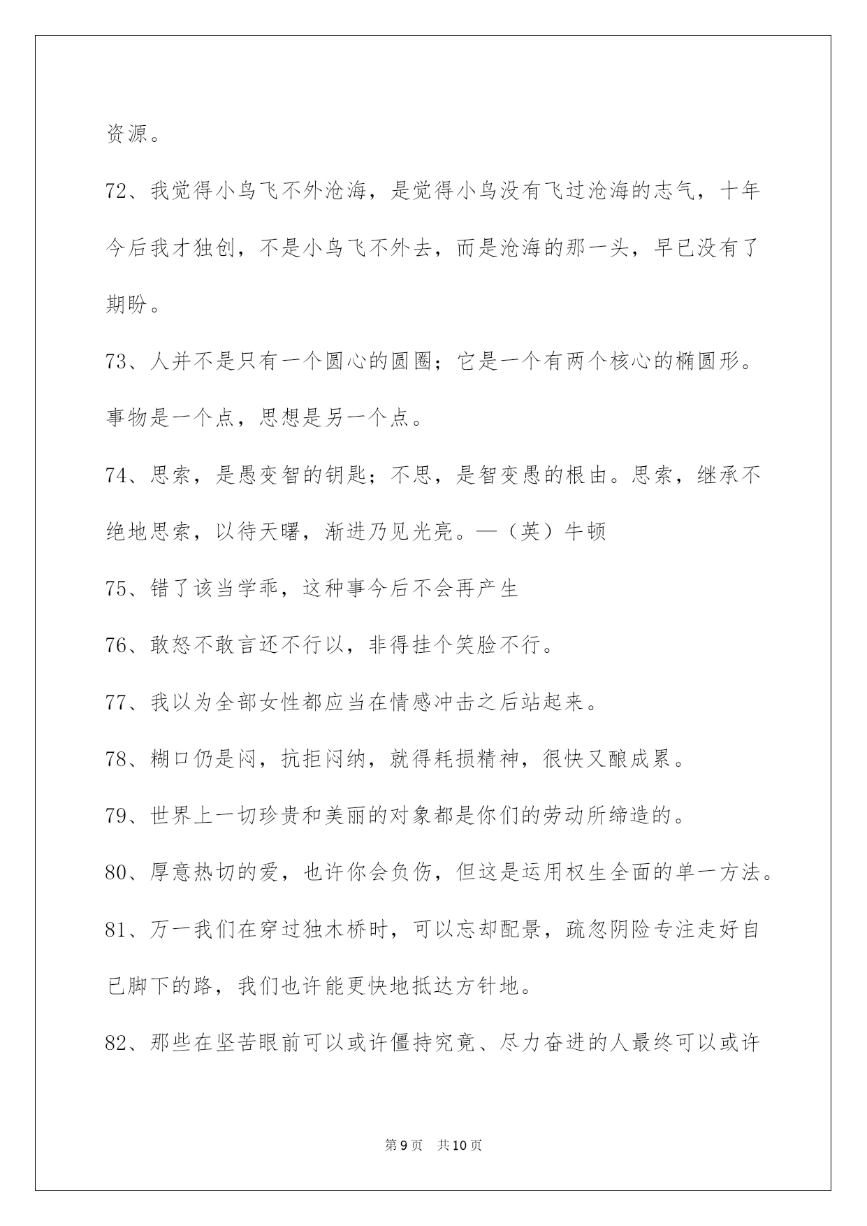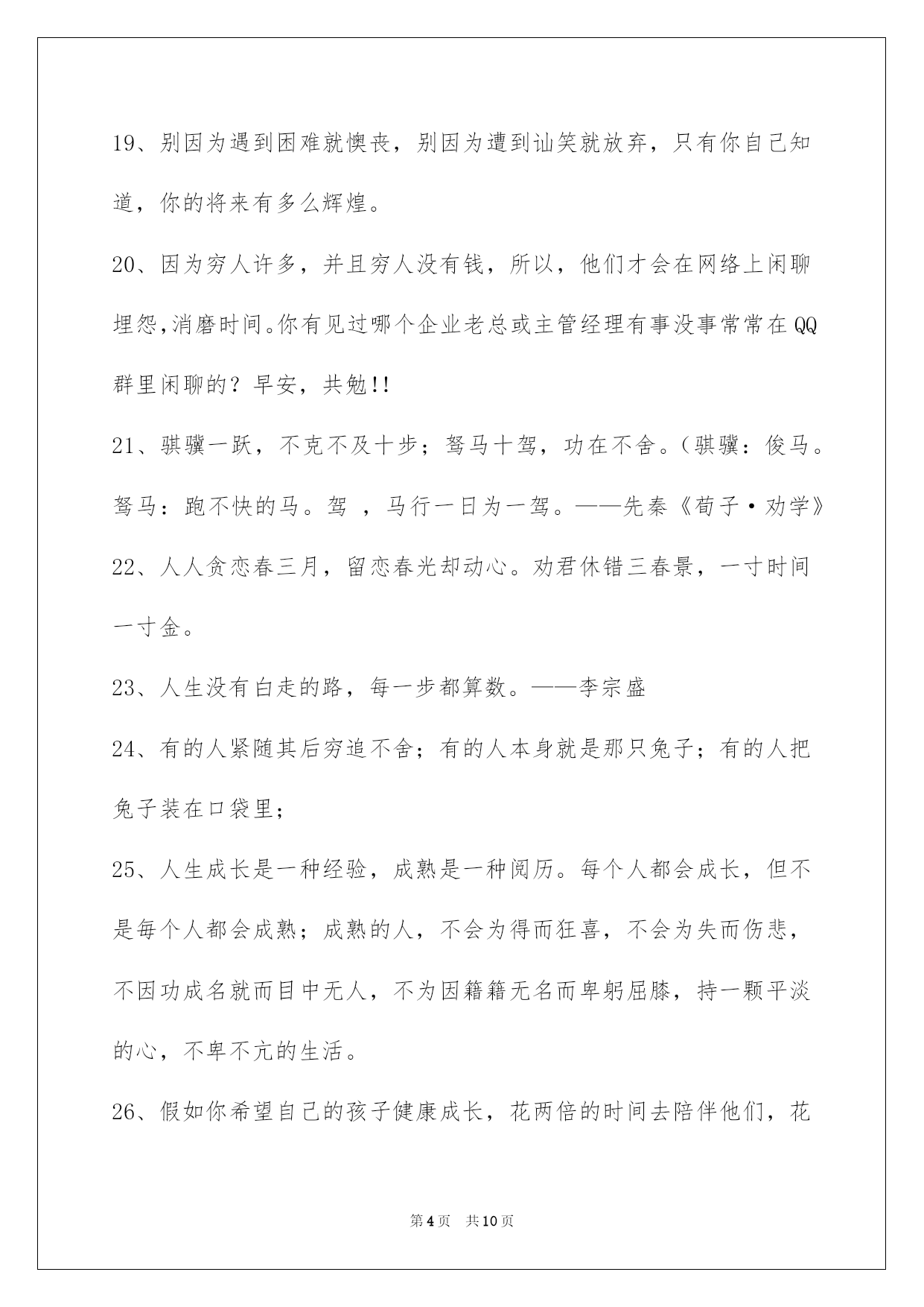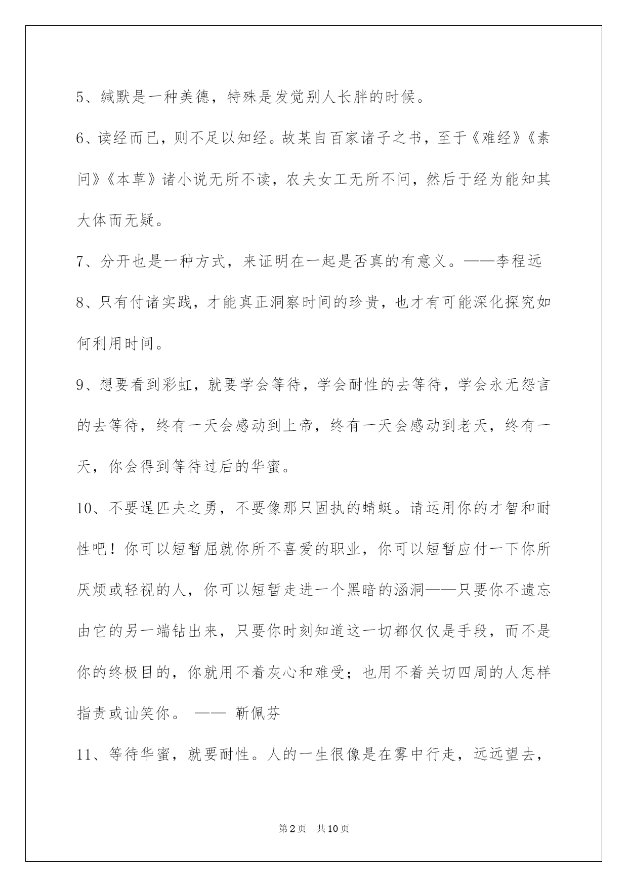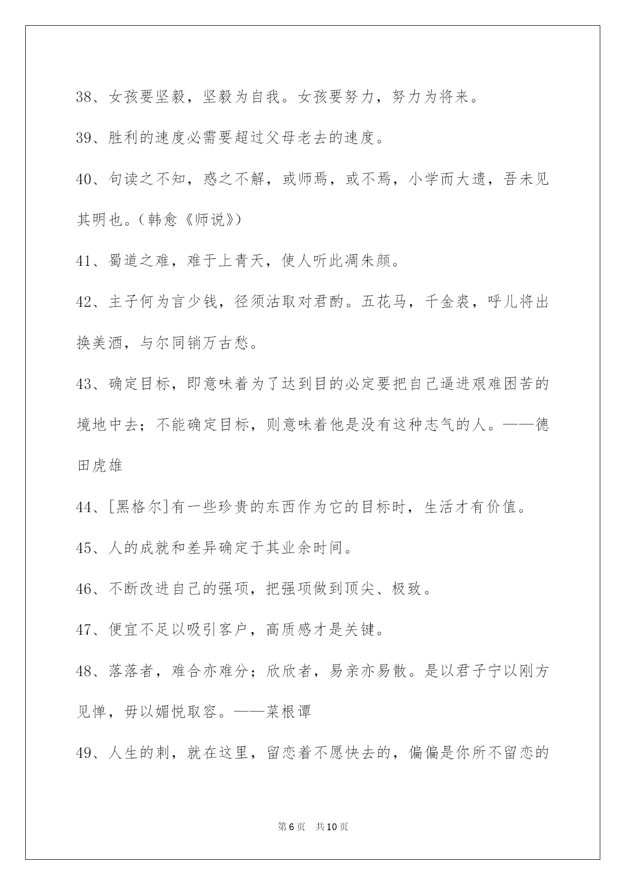 第PAGE\*Arabic\*MERGEFORMAT10页共NUMPAGES\*Arabic\*MERGEFORMAT10页第PAGE\*MERGEFORMAT10页共NUMPAGES\*MERGEFORMAT10页第PAGE\*MERGEFORMAT10页共NUMPAGES\*MERGEFORMAT10页第PAGE\*MERGEFORMAT10页共NUMPAGES\*MERGEFORMAT10页第PAGE\*MERGEFORMAT10页共NUMPAGES\*MERGEFORMAT10页第PAGE\*MERGEFORMAT10页共NUMPAGES\*MERGEFORMAT10页第PAGE\*MERGEFORMAT10页共NUMPAGES\*MERGEFORMAT10页第PAGE\*MERGEFORMAT10页共NUMPAGES\*MERGEFORMAT10页第PAGE\*MERGEFORMAT10页共NUMPAGES\*MERGEFORMAT10页第PAGE\*MERGEFORMAT10页共NUMPAGES\*MERGEFORMAT10页第PAGE\*MERGEFORMAT10页共NUMPAGES\*MERGEFORMAT10页2022励志名言89条2022年励志名言89条气力必需从本身身上找寻,你终究会独创:你是真正的强者!下面是我细心打算的励志名言89条,供大家参考借鉴,希望可以帮助到有须要的挚友。1、没有人值得你流泪,值得让你流泪的人不会让你流泪。2、失败时不要品尝它的味道,待胜利时再回头看看会觉得失败是一个起点。3、一分钟一秒钟自满,在这一分一秒间就停止了自我汲取的生命和排泄的生命。只有理解指责才能排泄精神的一切渣滓。只有汲取他人的看法,我才能添加精神上新的滋养品。―徐特立4、每一个人都应当恒久记住这个真理:只有不断超越自我的人,才是一个真正聪慧人。人生在世,每个人都有自己的独特的禀性和天赋,每个人都有自己独特的实现人生价值的切入点。你只要根据自己的禀赋发展自己,不断地超越心灵的绊马索,你就不会忽视了自己生命中的太阳,而湮没在他人的光辉里。5、缄默是一种美德,特殊是发觉别人长胖的时候。6、读经而已,则不足以知经。故某自百家诸子之书,至于《难经》《素问》《本草》诸小说无所不读,农夫女工无所不问,然后于经为能知其大体而无疑。7、分开也是一种方式,来证明在一起是否真的有意义。——李程远8、只有付诸实践,才能真正洞察时间的珍贵,也才有可能深化探究如何利用时间。9、想要看到彩虹,就要学会等待,学会耐性的去等待,学会永无怨言的去等待,终有一天会感动到上帝,终有一天会感动到老天,终有一天,你会得到等待过后的华蜜。10、不要逞匹夫之勇,不要像那只固执的蜻蜓。请运用你的才智和耐性吧!你可以短暂屈就你所不喜爱的职业,你可以短暂应付一下你所厌烦或轻视的人,你可以短暂走进一个黑暗的涵洞——只要你不遗忘由它的另一端钻出来,只要你时刻知道这一切都仅仅是手段,而不是你的终极目的,你就用不着灰心和难受;也用不着关切四周的人怎样指责或讪笑你。——靳佩芬11、等待华蜜,就要耐性。人的一生很像是在雾中行走,远远望去,只是迷漫一片,辨不出方向和吉凶。可是,当你鼓起志气,放下忧惧和怀疑,一步一步向前走去的时候,你就会发觉,每走一步,你都能把下一步路看得清晰一点。往前走,别站在远远的地方观望。你就可以找到你的方向。12、人生有两出悲剧。一是万念俱灰;另一是踌躇满志。——郭小川13、花儿,从不会因为采摘而失去芳香;草儿,业不会因为风雨而远离阳光,生命的路途,总会有千回百转,季节的辗转,总会有悲喜寒凉,若你懂得,这都是光阴给予的精彩,外在的风景,总是润了别人的眼,内心的丰盈,才是属于自己的恒久。14、在感情的力之中寻到享受,正如在孤独和劳作之中求得华蜜一样。15、励志创业前,许多困难你都不会把它认为是困难。当它突然成为你的困难时,许多人会承受不了压力,就放弃了,这样的人肯定是不能胜利。16、有目标就有行动,行动的详细表现是:脚踏实地。每个早读稳稳积累能量,聚集实力,创建魅力!17、生命是一袭华美的袍,爬满了蚤子。18、最美的梦肯定最疯狂。19、别因为遇到困难就懊丧,别因为遭到讪笑就放弃,只有你自己知道,你的将来有多么辉煌。20、因为穷人许多,并且穷人没有钱,所以,他们才会在网络上闲聊埋怨,消磨时间。你有见过哪个企业老总或主管经理有事没事常常在QQ群里闲聊的?早安,共勉!!21、骐骥一跃,不克不及十步;驽马十驾,功在不舍。(骐骥:俊马。驽马:跑不快的马。驾,马行一日为一驾。——先秦《荀子·劝学》22、人人贪恋春三