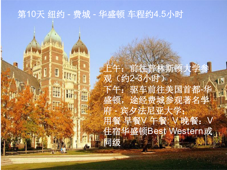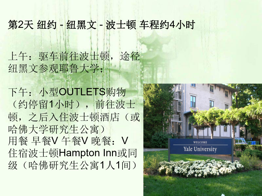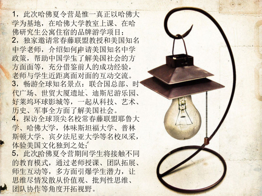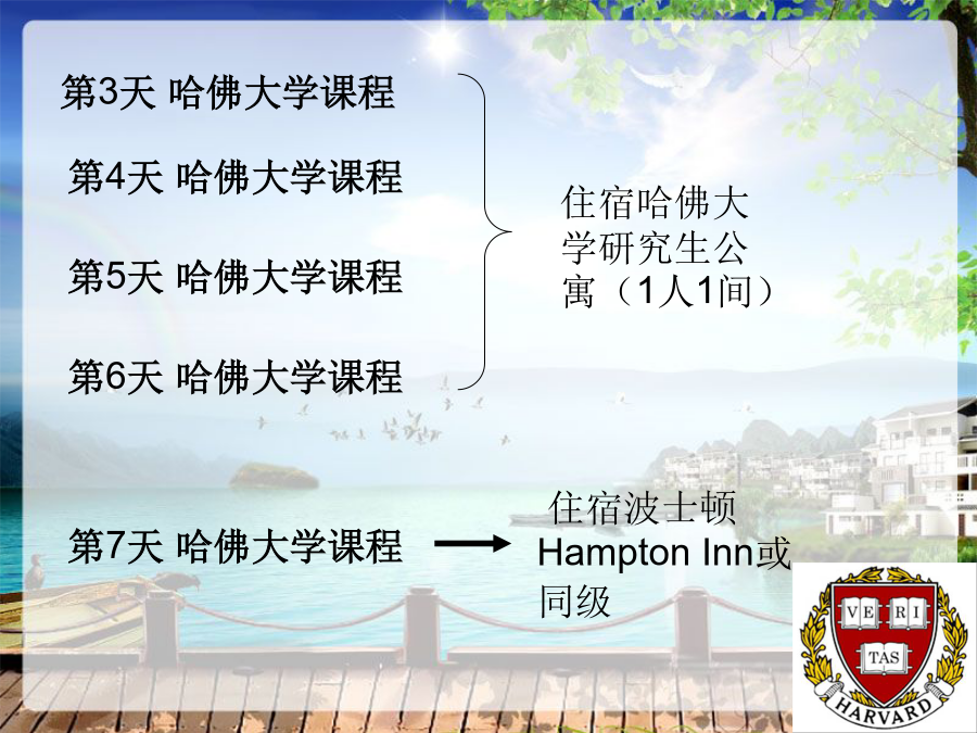 美国名校之旅1,此次哈佛夏令营是惟一真正以哈佛大学为基地,在哈佛大学教室上课、在哈佛研究生公寓住宿的品牌游学项目;2,独家邀请常春藤联盟教授和美国知名中学老师,介绍如何申请美国知名中学政策,帮助中国学生了解美国社会的方方面面等,充分借鉴前人的成功经验,老师与学生近距离面对面的互动交流。3,畅游全球知名景点:联合国总部、时代广场、世贸大厦遗址、迪斯尼游乐园、好莱坞环球影城等,一起从科技、艺术、历史、军事全方面了解美国社会。4,探访全球顶尖名校常春藤联盟耶鲁大学、哈佛大学,体味斯坦福大学、普林斯顿大学、宾夕法尼亚大学等名校风采,体验美国文化独到之处;5,此次哈佛夏令营期间学生将接触不同的教育模式,通过老师授课、团队拓展、师生互动等,多方面引爆学生潜力,让思维尽情发散从价值观、批判性思维、团队协作等角度开拓视野。第一天香港-纽约飞行时间约15小时早上前往香港国际机场,搭乘航班飞纽约,因时差关系.下午1点10分抵达纽约肯尼迪国际机场,导游接机晚餐后送往酒店休息,调整时差。用餐早餐:X午餐:X晚餐:V住宿纽约HolidayInn或同级第2天纽约-纽黑文-波士顿车程约4小时第4天哈佛大学课程第8天波士顿-西点军校-纽约车程约4小时第9天纽约第11天华盛顿第12天华盛顿-洛杉矶飞行约5小时时差3小时第13天洛杉矶第14天洛杉矶-环球影城第15天飞机上第16天香港早上抵达香港国际机场,专车送往深圳,结束愉快的美国游学之旅!用餐早餐:X午餐:X晚餐:X住宿温暖的家组员:魏梦洁李琼芝太明娟杨尔敏殷桃平邓云涛