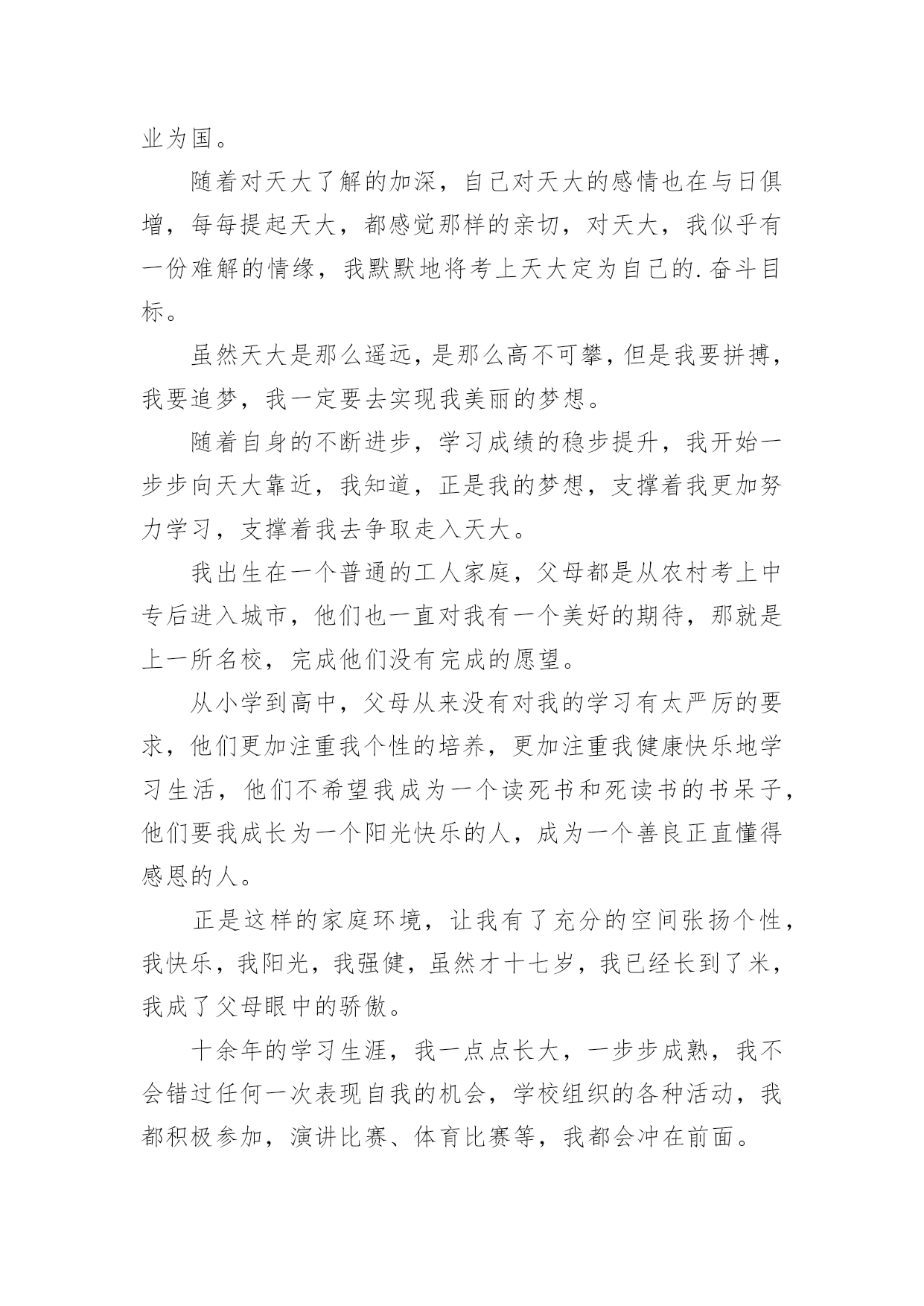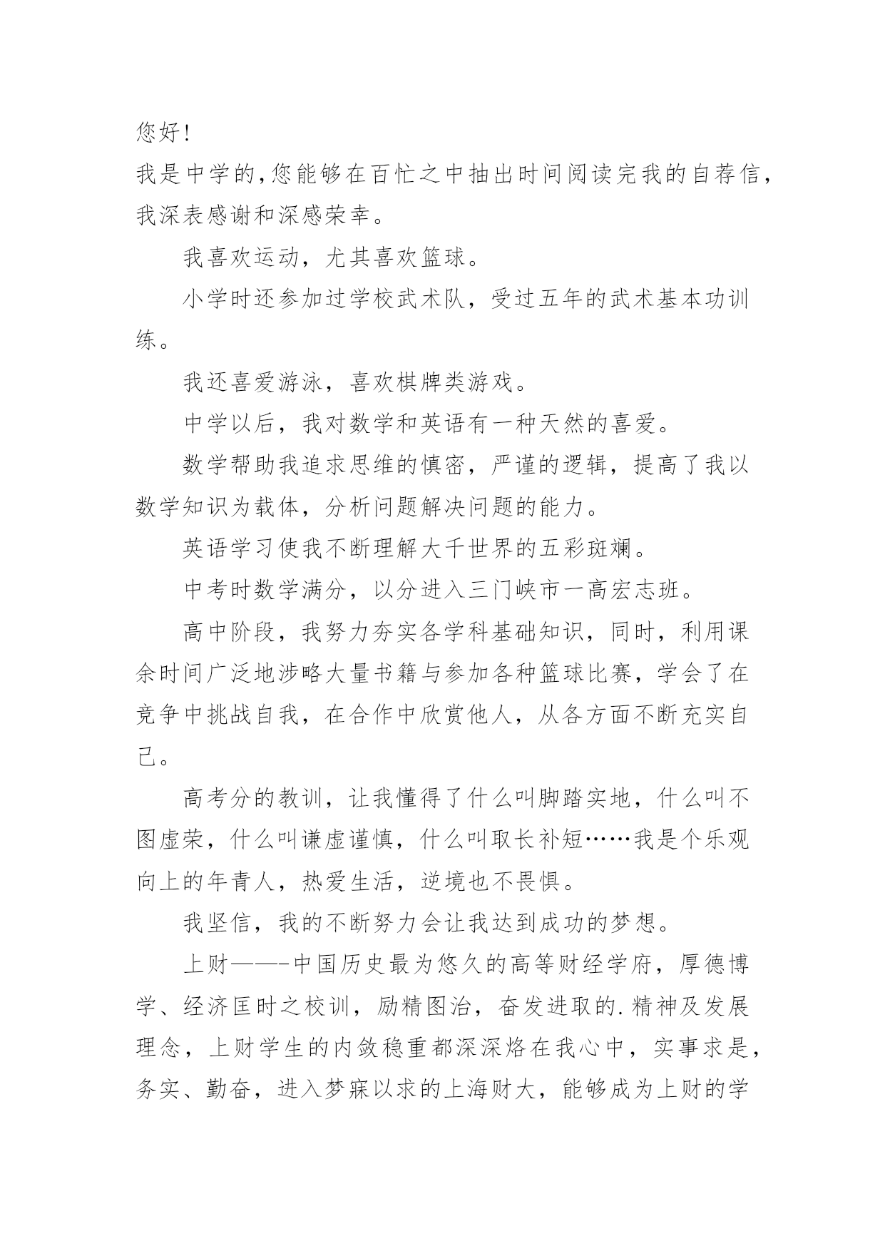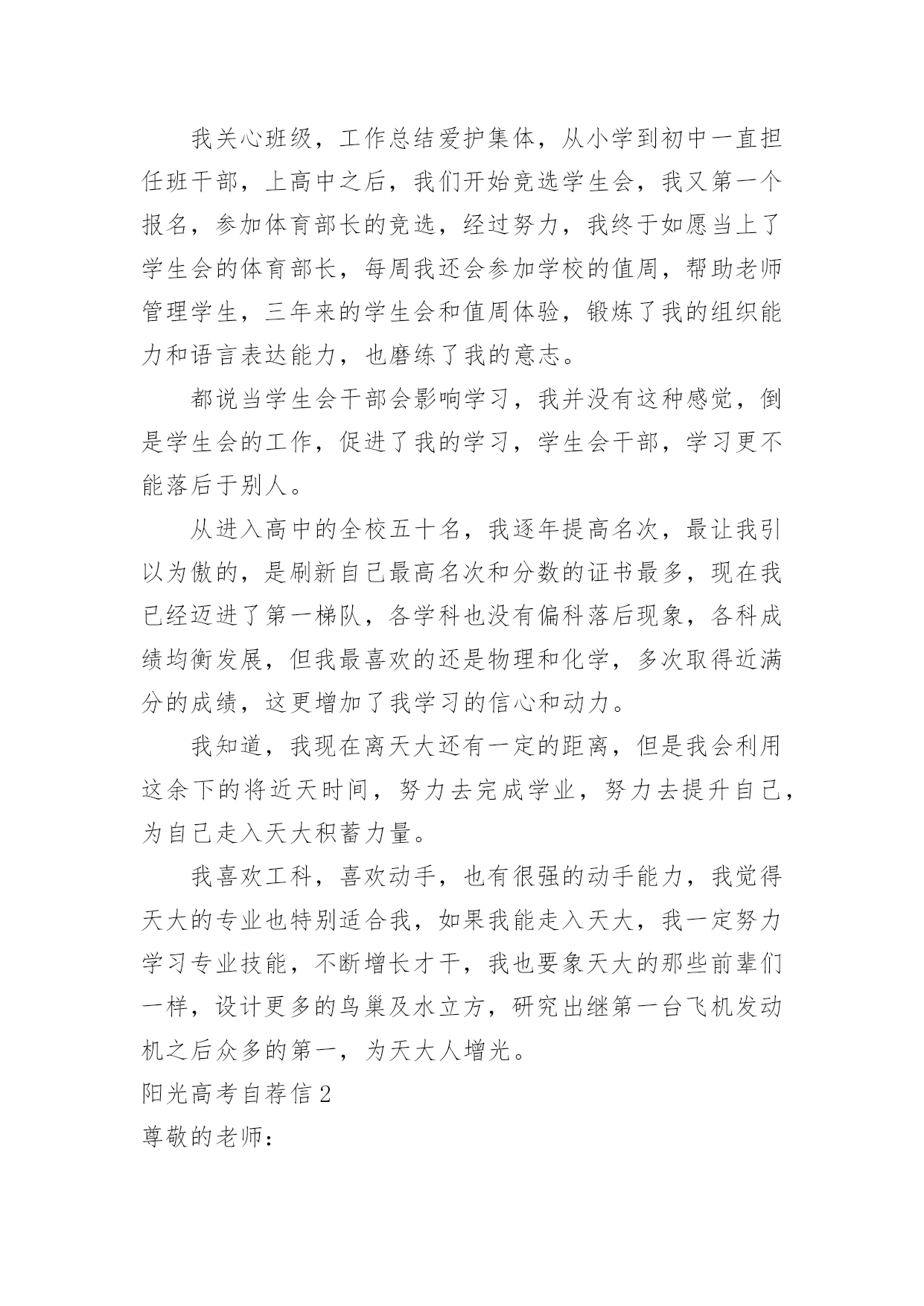 阳光高考自荐信阳光高考自荐信随着中国在不断地进步,需要使用自荐信的场合越来越多,自荐信也有着不同的类型。你还在为写自荐信而苦恼吗?以下是小编帮大家整理的阳光高考自荐信,欢迎阅读与收藏。阳光高考自荐信1尊敬的各位老师:阳光高考的时间到了,这也将是我人生旅程的第一个重大转折。我高级中学,我的名字叫,男,岁。今天我郑重向贵校推荐自己,因为考入天大是我梦想,我渴望成为天大的一名学子,成为一名真正的天大人。对天大的向往由来已久,从上高中那天起,就开始对全国高校有了逐步的认识,天津大学曾经不止一次被同学和老师提起,同学们也一直视考入天大为一种荣耀和自豪,我开始关注天大,了解天大的一点一滴。天津大学是中国近代第一所大学,其前身为北洋大学,始建于xxxx年xx月xx日,至今已走过了年的光辉历程,天大始终依循实事求是的校训,形成了严谨治学,严格教学要求的优良校风,正是百年积淀的深厚底蕴,给天大带来了生生不息的原动力,百度激励每一位天大学子励精图治、创业为国。随着对天大了解的加深,自己对天大的感情也在与日俱增,每每提起天大,都感觉那样的亲切,对天大,我似乎有一份难解的情缘,我默默地将考上天大定为自己的.奋斗目标。虽然天大是那么遥远,是那么高不可攀,但是我要拼搏,我要追梦,我一定要去实现我美丽的梦想。随着自身的不断进步,学习成绩的稳步提升,我开始一步步向天大靠近,我知道,正是我的梦想,支撑着我更加努力学习,支撑着我去争取走入天大。我出生在一个普通的工人家庭,父母都是从农村考上中专后进入城市,他们也一直对我有一个美好的期待,那就是上一所名校,完成他们没有完成的愿望。从小学到高中,父母从来没有对我的学习有太严厉的要求,他们更加注重我个性的培养,更加注重我健康快乐地学习生活,他们不希望我成为一个读死书和死读书的书呆子,他们要我成长为一个阳光快乐的人,成为一个善良正直懂得感恩的人。正是这样的家庭环境,让我有了充分的空间张扬个性,我快乐,我阳光,我强健,虽然才十七岁,我已经长到了米,我成了父母眼中的骄傲。十余年的学习生涯,我一点点长大,一步步成熟,我不会错过任何一次表现自我的机会,学校组织的各种活动,我都积极参加,演讲比赛、体育比赛等,我都会冲在前面。我关心班级,工作总结爱护集体,从小学到初中一直担任班干部,上高中之后,我们开始竞选学生会,我又第一个报名,参加体育部长的竞选,经过努力,我终于如愿当上了学生会的体育部长,每周我还会参加学校的值周,帮助老师管理学生,三年来的学生会和值周体验,锻炼了我的组织能力和语言表达能力,也磨练了我的意志。都说当学生会干部会影响学习,我并没有这种感觉,倒是学生会的工作,促进了我的学习,学生会干部,学习更不能落后于别人。从进入高中的全校五十名,我逐年提高名次,最让我引以为傲的,是刷新自己最高名次和分数的证书最多,现在我已经迈进了第一梯队,各学科也没有偏科落后现象,各科成绩均衡发展,但我最喜欢的还是物理和化学,多次取得近满分的成绩,这更增加了我学习的信心和动力。我知道,我现在离天大还有一定的距离,但是我会利用这余下的将近天时间,努力去完成学业,努力去提升自己,为自己走入天大积蓄力量。我喜欢工科,喜欢动手,也有很强的动手能力,我觉得天大的专业也特别适合我,如果我能走入天大,我一定努力学习专业技能,不断增长才干,我也要象天大的那些前辈们一样,设计更多的鸟巢及水立方,研究出继第一台飞机发动机之后众多的第一,为天大人增光。阳光高考自荐信2尊敬的老师:您好!我是中学的,您能够在百忙之中抽出时间阅读完我的自荐信,我深表感谢和深感荣幸。我喜欢运动,尤其喜欢篮球。小学时还参加过学校武术队,受过五年的武术基本功训练。我还喜爱游泳,喜欢棋牌类游戏。中学以后,我对数学和英语有一种天然的喜爱。数学帮助我追求思维的慎密,严谨的逻辑,提高了我以数学知识为载体,分析问题解决问题的能力。英语学习使我不断理解大千世界的五彩斑斓。中考时数学满分,以分进入三门峡市一高宏志班。高中阶段,我努力夯实各学科基础知识,同时,利用课余时间广泛地涉略大量书籍与参加各种篮球比赛,学会了在竞争中挑战自我,在合作中欣赏他人,从各方面不断充实自己。高考分的教训,让我懂得了什么叫脚踏实地,什么叫不图虚荣,什么叫谦虚谨慎,什么叫取长补短……我是个乐观向上的年青人,热爱生活,逆境也不畏惧。我坚信,我的不断努力会让我达到成功的梦想。上财——-中国历史最为悠久的高等财经学府,厚德博学、经济匡时之校训,励精图治,奋发进取的.精神及发展理念,上财学生的内敛稳重都深深烙在我心中,实事求是,务实、勤奋,进入梦寐以求的上海财大,能够成为上财的学子,将是我一生的骄傲。上财学风之浓厚,如果我能有幸进入上财学习,我将一步一个脚印地学好每一门功课。我希望自己大学毕业后能继续深造。恳请贵校领导能够接受我的申请,实