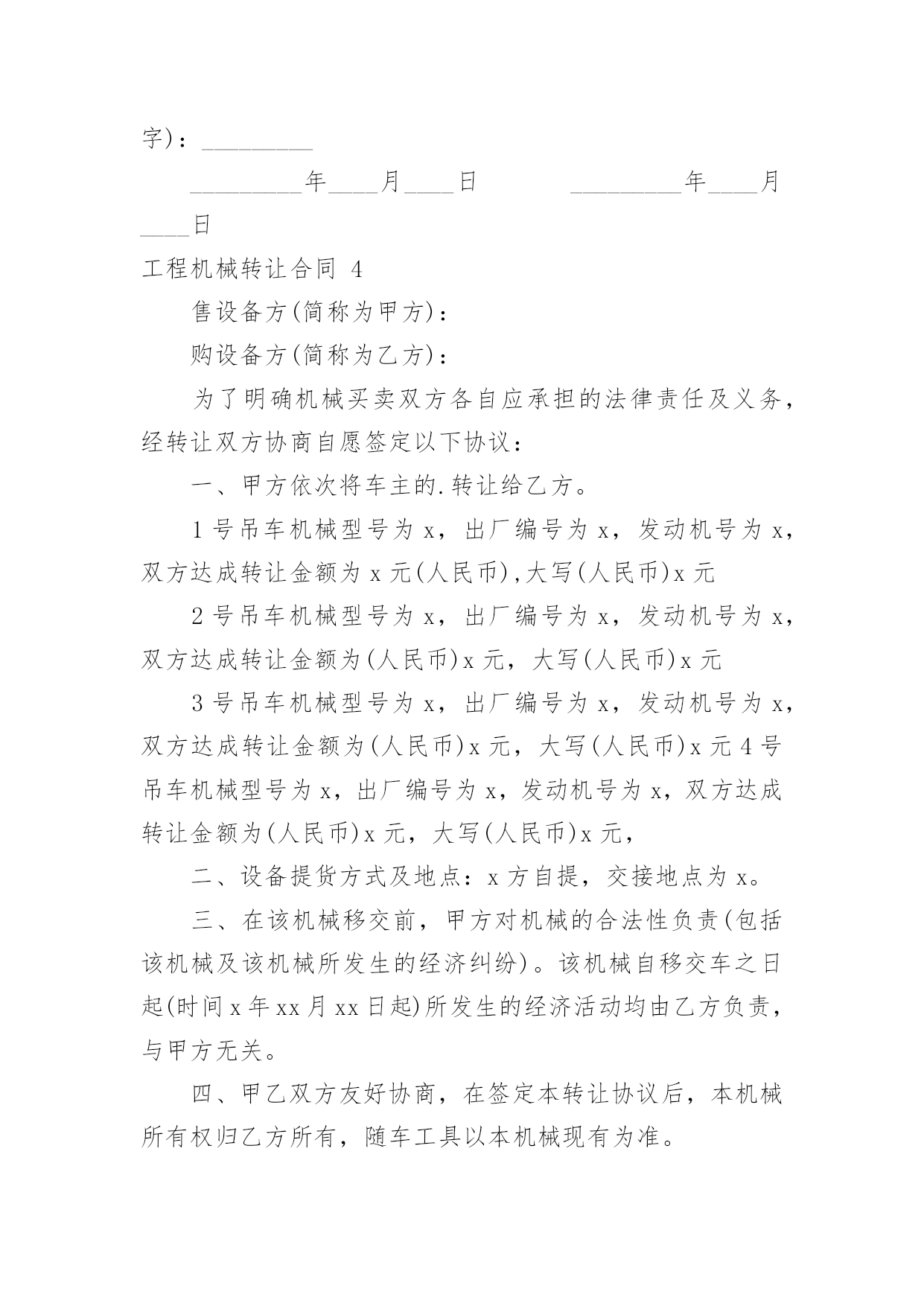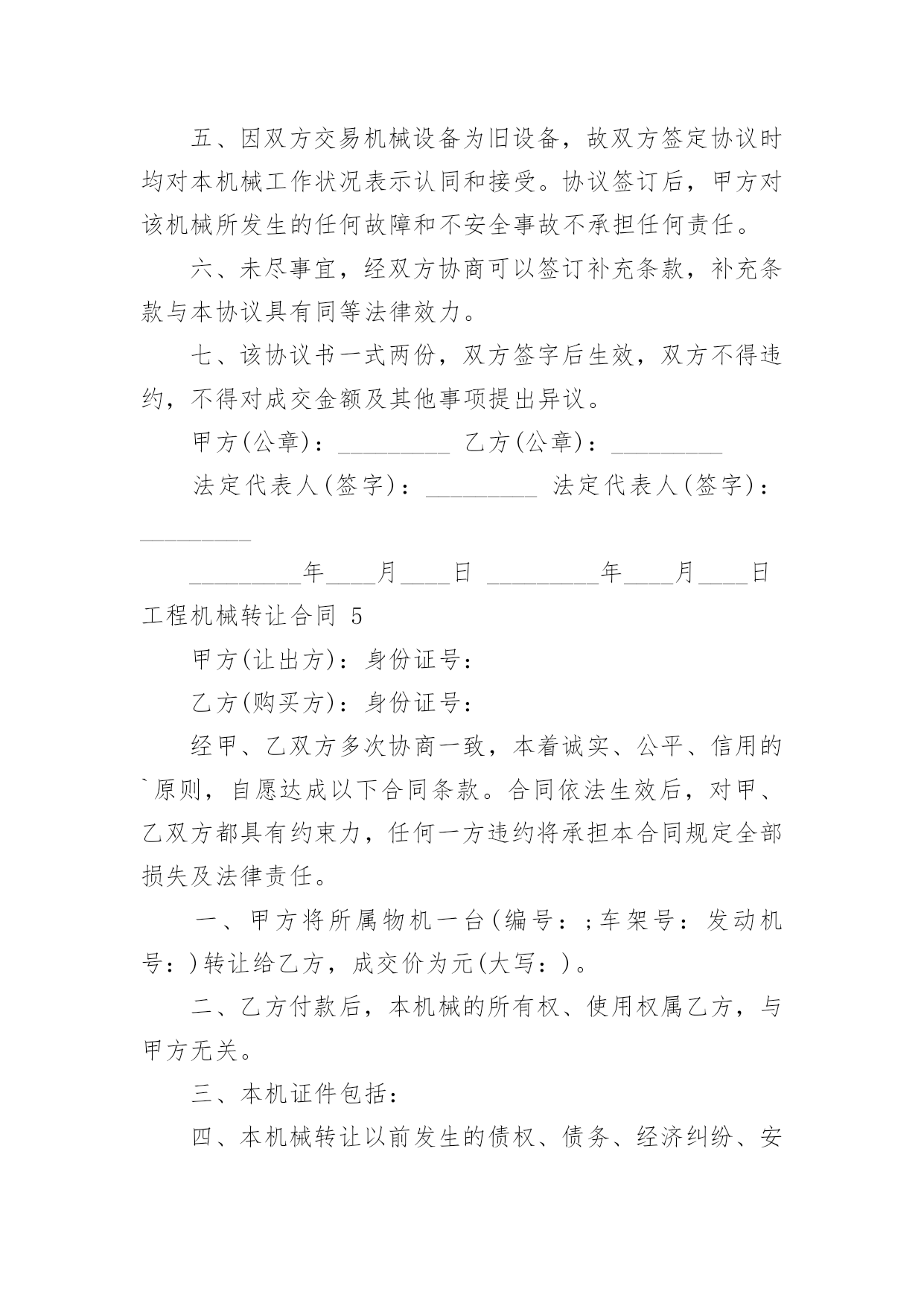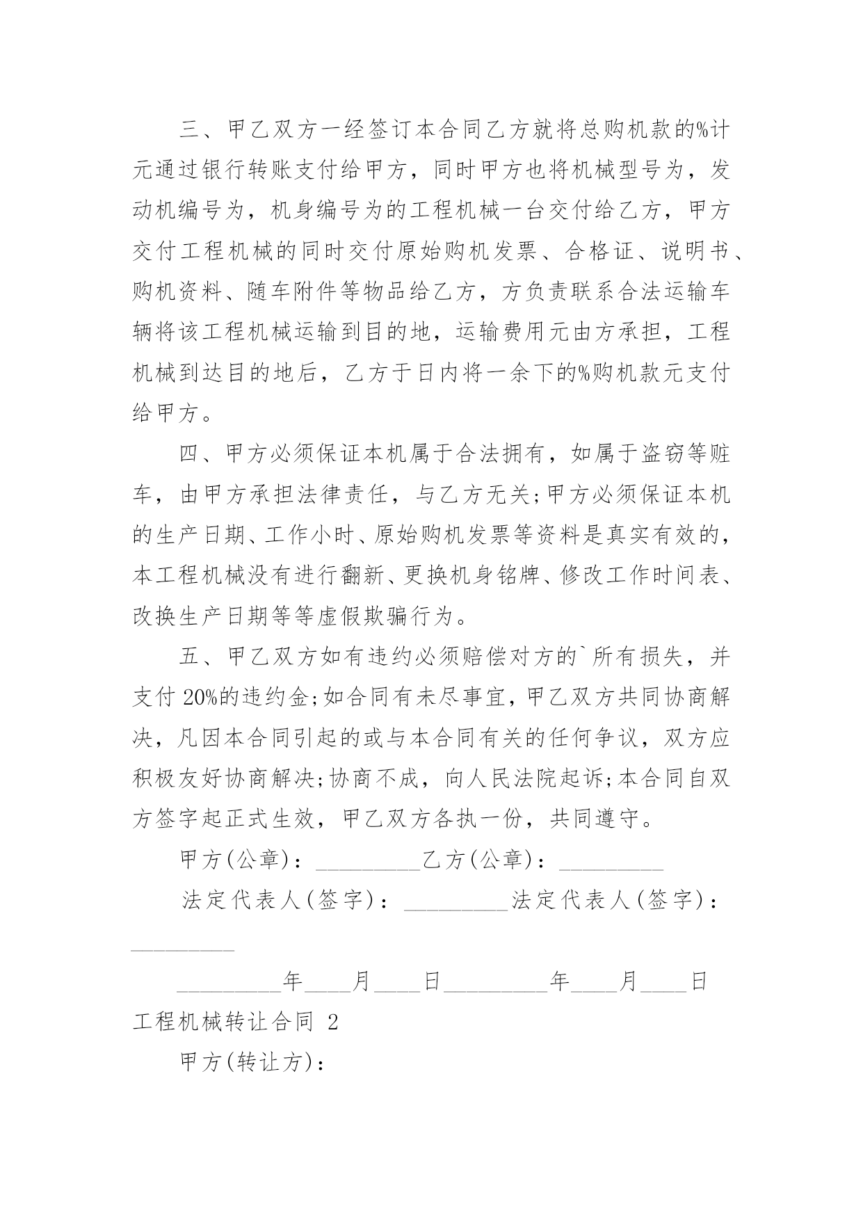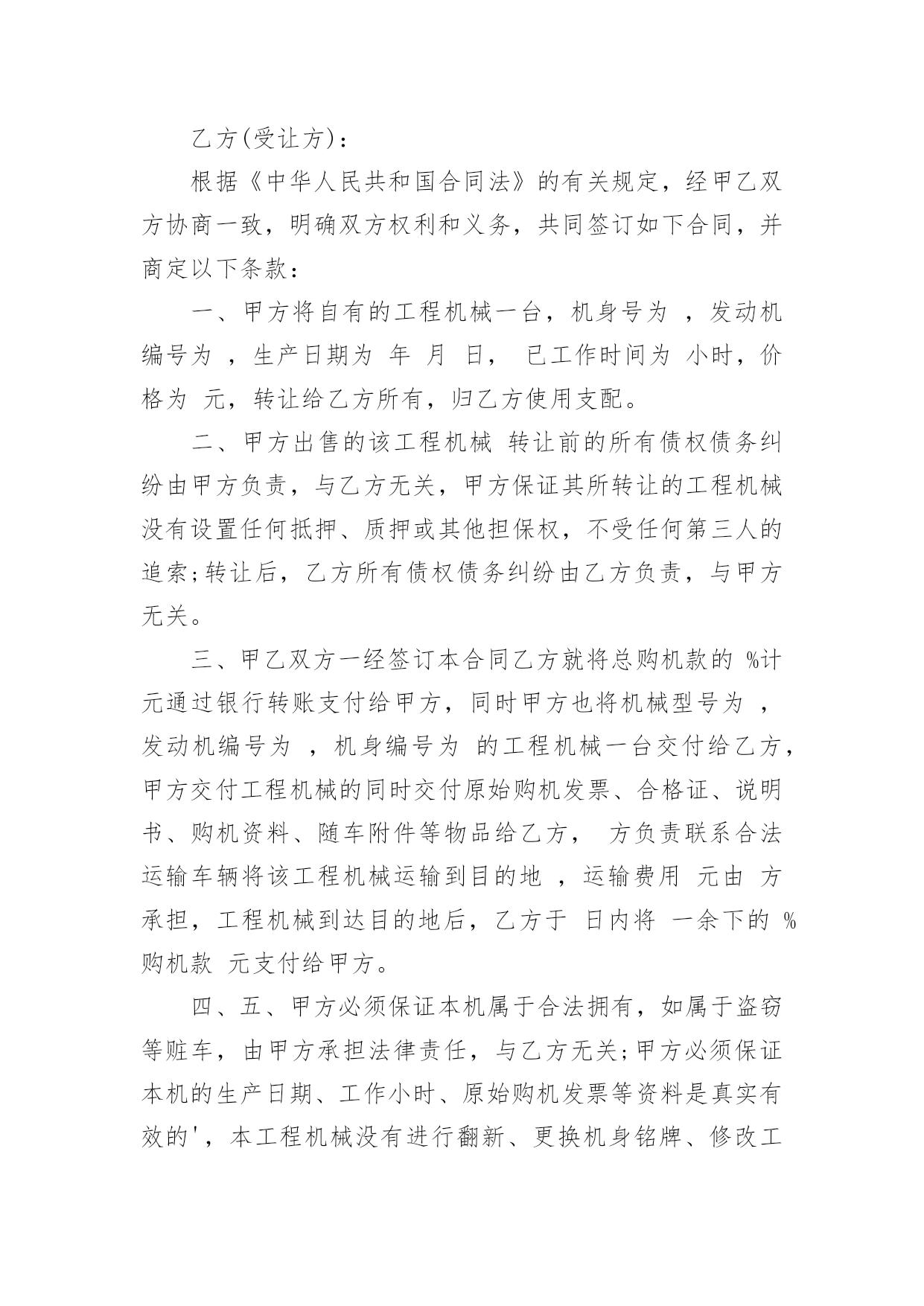 工程机械转让合同工程机械转让合同【常用10篇】随着广大人民群众法律意识的普遍提高,合同出现在我们生活中的次数越来越多,签订合同是减少和防止发生争议的重要措施。知道吗,写合同可是有方法的哦,以下是小编为大家收集的工程机械转让合同,欢迎大家借鉴与参考,希望对大家有所帮助。工程机械转让合同1甲方(转让方):乙方(受让方):根据《中华人民共和国合同法》的有关规定,经甲乙双方协商一致,明确双方权利和义务,共同签订如下合同,并商定以下条款:一、甲方将自有的工程机械一台,机身号为,发动机编号为,生产日期为_______年____月____日,已工作时间为小时,价格为元,转让给乙方所有,归乙方使用支配。二、甲方出售的该工程机械转让前的所有债权债务纠纷由甲方负责,与乙方无关,甲方保证其所转让的工程机械没有设置任何抵押、质押或其他担保权,不受任何第三人的追索;转让后,乙方所有债权债务纠纷由乙方负责,与甲方无关。三、甲乙双方一经签订本合同乙方就将总购机款的%计元通过银行转账支付给甲方,同时甲方也将机械型号为,发动机编号为,机身编号为的工程机械一台交付给乙方,甲方交付工程机械的同时交付原始购机发票、合格证、说明书、购机资料、随车附件等物品给乙方,方负责联系合法运输车辆将该工程机械运输到目的地,运输费用元由方承担,工程机械到达目的地后,乙方于日内将一余下的%购机款元支付给甲方。四、甲方必须保证本机属于合法拥有,如属于盗窃等赃车,由甲方承担法律责任,与乙方无关;甲方必须保证本机的生产日期、工作小时、原始购机发票等资料是真实有效的,本工程机械没有进行翻新、更换机身铭牌、修改工作时间表、改换生产日期等等虚假欺骗行为。五、甲乙双方如有违约必须赔偿对方的`所有损失,并支付20%的违约金;如合同有未尽事宜,甲乙双方共同协商解决,凡因本合同引起的或与本合同有关的任何争议,双方应积极友好协商解决;协商不成,向人民法院起诉;本合同自双方签字起正式生效,甲乙双方各执一份,共同遵守。甲方(公章):_________乙方(公章):_________法定代表人(签字):_________法定代表人(签字):__________________年____月____日_________年____月____日工程机械转让合同2甲方(转让方):乙方(受让方):根据《中华人民共和国合同法》的有关规定,经甲乙双方协商一致,明确双方权利和义务,共同签订如下合同,并商定以下条款:一、甲方将自有的工程机械一台,机身号为,发动机编号为,生产日期为年月日,已工作时间为小时,价格为元,转让给乙方所有,归乙方使用支配。二、甲方出售的该工程机械转让前的所有债权债务纠纷由甲方负责,与乙方无关,甲方保证其所转让的工程机械没有设置任何抵押、质押或其他担保权,不受任何第三人的追索;转让后,乙方所有债权债务纠纷由乙方负责,与甲方无关。三、甲乙双方一经签订本合同乙方就将总购机款的%计元通过银行转账支付给甲方,同时甲方也将机械型号为,发动机编号为,机身编号为的工程机械一台交付给乙方,甲方交付工程机械的同时交付原始购机发票、合格证、说明书、购机资料、随车附件等物品给乙方,方负责联系合法运输车辆将该工程机械运输到目的地,运输费用元由方承担,工程机械到达目的地后,乙方于日内将一余下的%购机款元支付给甲方。四、五、甲方必须保证本机属于合法拥有,如属于盗窃等赃车,由甲方承担法律责任,与乙方无关;甲方必须保证本机的生产日期、工作小时、原始购机发票等资料是真实有效的',本工程机械没有进行翻新、更换机身铭牌、修改工作时间表、改换生产日期等等虚假欺骗行为。六、甲乙双方如有违约必须赔偿对方的所有损失,并支付20%的违约金;如合同有未尽事宜,甲乙双方共同协商解决,凡因本合同引起的或与本合同有关的任何争议,双方应积极友好协商解决;协商不成,向人民法院起诉;本合同自双方签字起正式生效,甲乙双方各执一份,共同遵守。甲方(转让方):乙方(受让方):身份证号:身份证号:电话:电话:年月日年月日见证人:身份证号:年月日电话:工程机械转让合同3转让方:(以下称甲方)住址:法定代表人:受让方:_____________________(以下称乙方)住址:____________________________________身份证号:______________________________为实现生产经营需要,甲方向乙方转让甲方拥有和控制的机器设备,经甲乙双方协商一致,特签订本合同:第一条设备名称、规格、数量、价格甲方转让给乙方的设备为20xx年6月出产的辽宁抚顺QUV50A型(产品编号:1460)履带式强夯机壹台,经双方约定价格为人民币。第二条付款方式在本合同生效后2个工作日内乙方向甲方支付人民币的定金,其余转让款人民币乙方在本合同生效后10个工作