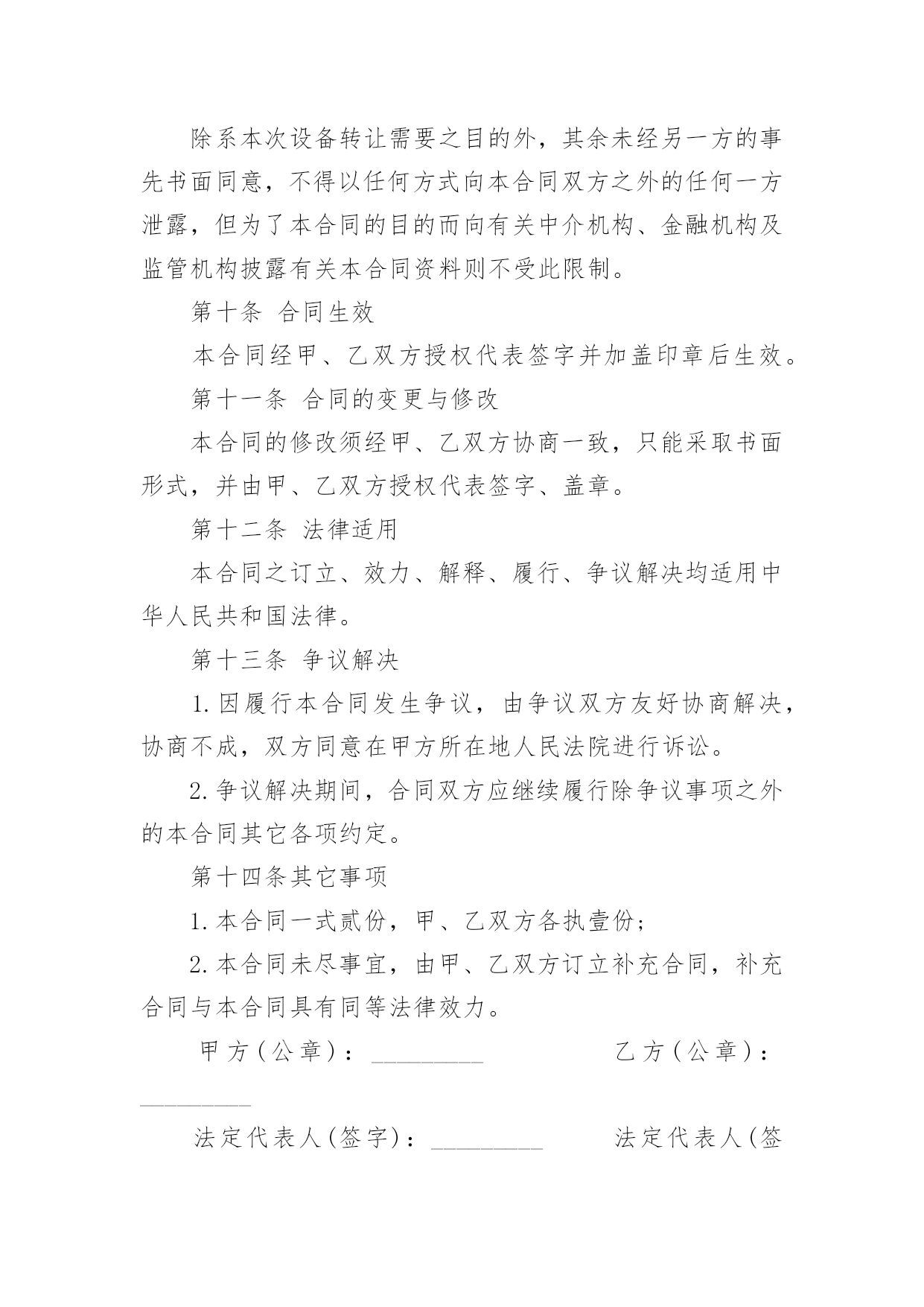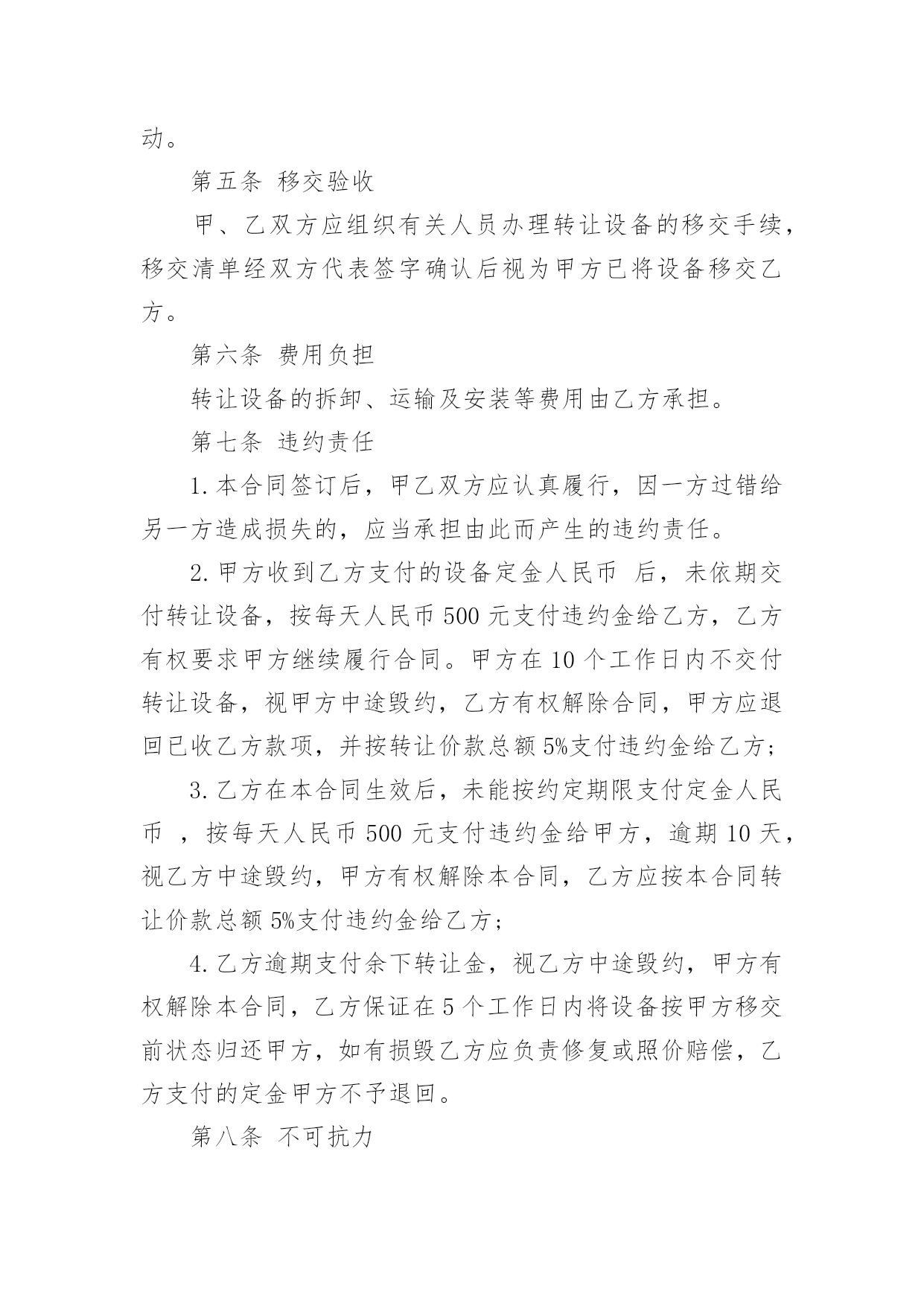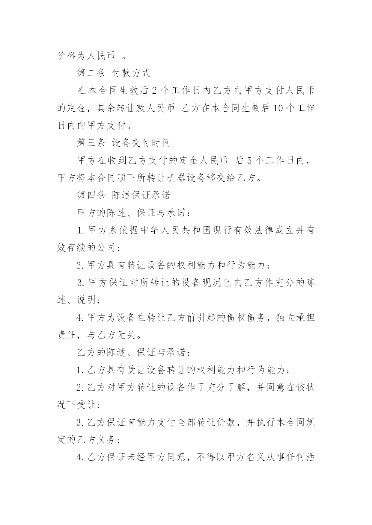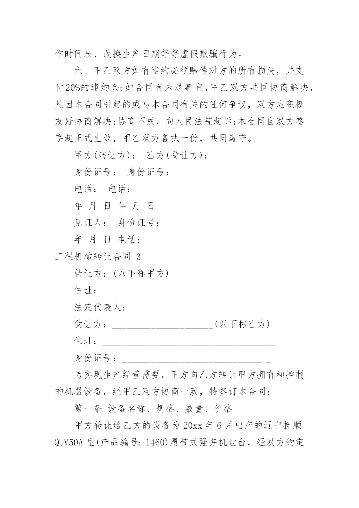 工程机械转让合同工程机械转让合同【常用10篇】随着广大人民群众法律意识的普遍提高,合同出现在我们生活中的次数越来越多,签订合同是减少和防止发生争议的重要措施。知道吗,写合同可是有方法的哦,以下是小编为大家收集的工程机械转让合同,欢迎大家借鉴与参考,希望对大家有所帮助。工程机械转让合同1甲方(转让方):乙方(受让方):根据《中华人民共和国合同法》的有关规定,经甲乙双方协商一致,明确双方权利和义务,共同签订如下合同,并商定以下条款:一、甲方将自有的工程机械一台,机身号为,发动机编号为,生产日期为_______年____月____日,已工作时间为小时,价格为元,转让给乙方所有,归乙方使用支配。二、甲方出售的该工程机械转让前的所有债权债务纠纷由甲方负责,与乙方无关,甲方保证其所转让的工程机械没有设置任何抵押、质押或其他担保权,不受任何第三人的追索;转让后,乙方所有债权债务纠纷由乙方负责,与甲方无关。三、甲乙双方一经签订本合同乙方就将总购机款的%计元通过银行转账支付给甲方,同时甲方也将机械型号为,发动机编号为,机身编号为的工程机械一台交付给乙方,甲方交付工程机械的同时交付原始购机发票、合格证、说明书、购机资料、随车附件等物品给乙方,方负责联系合法运输车辆将该工程机械运输到目的地,运输费用元由方承担,工程机械到达目的地后,乙方于日内将一余下的%购机款元支付给甲方。四、甲方必须保证本机属于合法拥有,如属于盗窃等赃车,由甲方承担法律责任,与乙方无关;甲方必须保证本机的生产日期、工作小时、原始购机发票等资料是真实有效的,本工程机械没有进行翻新、更换机身铭牌、修改工作时间表、改换生产日期等等虚假欺骗行为。五、甲乙双方如有违约必须赔偿对方的`所有损失,并支付20%的违约金;如合同有未尽事宜,甲乙双方共同协商解决,凡因本合同引起的或与本合同有关的任何争议,双方应积极友好协商解决;协商不成,向人民法院起诉;本合同自双方签字起正式生效,甲乙双方各执一份,共同遵守。甲方(公章):_________乙方(公章):_________法定代表人(签字):_________法定代表人(签字):__________________年____月____日_________年____月____日工程机械转让合同2甲方(转让方):乙方(受让方):根据《中华人民共和国合同法》的有关规定,经甲乙双方协商一致,明确双方权利和义务,共同签订如下合同,并商定以下条款:一、甲方将自有的工程机械一台,机身号为,发动机编号为,生产日期为年月日,已工作时间为小时,价格为元,转让给乙方所有,归乙方使用支配。二、甲方出售的该工程机械转让前的所有债权债务纠纷由甲方负责,与乙方无关,甲方保证其所转让的工程机械没有设置任何抵押、质押或其他担保权,不受任何第三人的追索;转让后,乙方所有债权债务纠纷由乙方负责,与甲方无关。三、甲乙双方一经签订本合同乙方就将总购机款的%计元通过银行转账支付给甲方,同时甲方也将机械型号为,发动机编号为,机身编号为的工程机械一台交付给乙方,甲方交付工程机械的同时交付原始购机发票、合格证、说明书、购机资料、随车附件等物品给乙方,方负责联系合法运输车辆将该工程机械运输到目的地,运输费用元由方承担,工程机械到达目的地后,乙方于日内将一余下的%购机款元支付给甲方。四、五、甲方必须保证本机属于合法拥有,如属于盗窃等赃车,由甲方承担法律责任,与乙方无关;甲方必须保证本机的生产日期、工作小时、原始购机发票等资料是真实有效的',本工程机械没有进行翻新、更换机身铭牌、修改工作时间表、改换生产日期等等虚假欺骗行为。六、甲乙双方如有违约必须赔偿对方的所有损失,并支付20%的违约金;如合同有未尽事宜,甲乙双方共同协商解决,凡因本合同引起的或与本合同有关的任何争议,双方应积极友好协商解决;协商不成,向人民法院起诉;本合同自双方签字起正式生效,甲乙双方各执一份,共同遵守。甲方(转让方):乙方(受让方):身份证号:身份证号:电话:电话:年月日年月日见证人:身份证号:年月日电话:工程机械转让合同3转让方:(以下称甲方)住址:法定代表人:受让方:_____________________(以下称乙方)住址:____________________________________身份证号:______________________________为实现生产经营需要,甲方向乙方转让甲方拥有和控制的机器设备,经甲乙双方协商一致,特签订本合同:第一条设备名称、规格、数量、价格甲方转让给乙方的设备为20xx年6月出产的辽宁抚顺QUV50A型(产品编号:1460)履带式强夯机壹台,经双方约定价格为人民币。第二条付款方式在本合同生效后2个工作日内乙方向甲方支付人民币的定金,其余转让款人民币乙方在本合同生效后10个工作