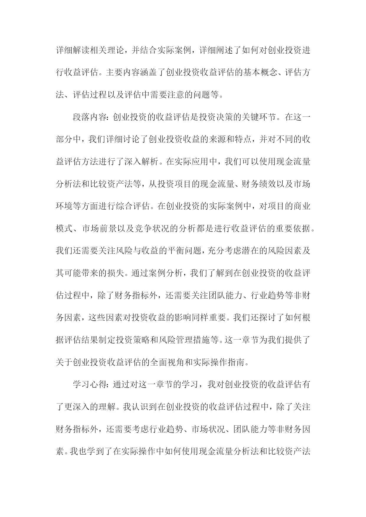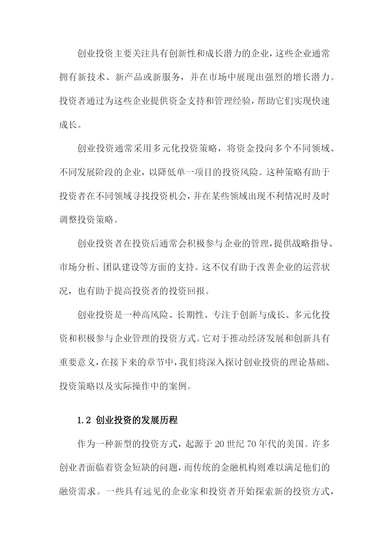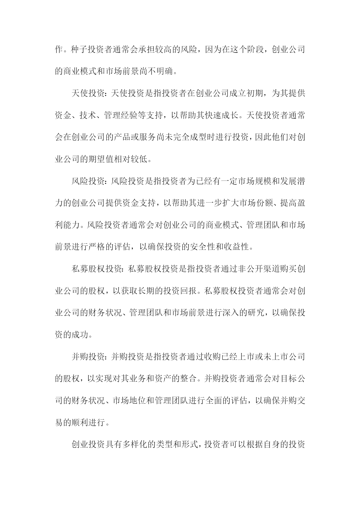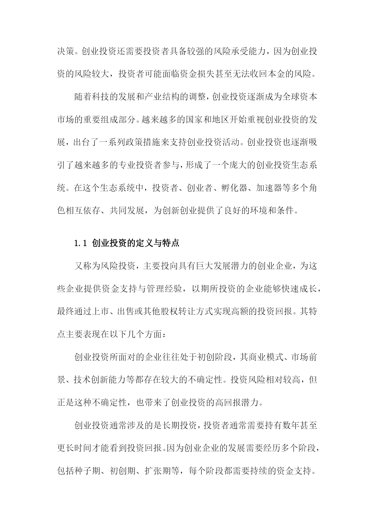 《创业投资理论与案例》读书笔记1.创业投资概述创业投资是指投资者将资金投入到创新型企业,以期获得企业成长、扩张和盈利的收益。创业投资是一种长期、高风险的投资方式,其投资周期、回报率和风险程度都较高。创业投资的主要目的是支持创新型企业的发展,推动科技进步和产业升级,从而为社会创造更多的就业机会和经济效益。创业投资通常包括种子投资、天使投资、风险投资、私募股权投资等多种形式。种子投资主要针对初创阶段的企业,投资者通常会为企业提供一定的资金支持,帮助企业完成产品研发、市场拓展等前期工作;天使投资则主要关注企业的商业模式和市场潜力,投资者会在企业成立初期提供资金支持,帮助企业度过初创期的生存危机;风险投资和私募股权投资则主要针对成长期和成熟期的企业,投资者通常会为企业提供大量的资金支持,帮助企业进行扩张和并购等战略性布局。创业投资的成功与否取决于多种因素,如创业者的能力和经验、市场环境、政策法规等。投资者在进行创业投资时,需要充分了解企业的核心竞争力、市场前景、竞争格局等因素,以便做出明智的投资决策。创业投资还需要投资者具备较强的风险承受能力,因为创业投资的风险较大,投资者可能面临资金损失甚至无法收回本金的风险。随着科技的发展和产业结构的调整,创业投资逐渐成为全球资本市场的重要组成部分。越来越多的国家和地区开始重视创业投资的发展,出台了一系列政策措施来支持创业投资活动。创业投资也逐渐吸引了越来越多的专业投资者参与,形成了一个庞大的创业投资生态系统。在这个生态系统中,投资者、创业者、孵化器、加速器等多个角色相互依存、共同发展,为创新创业提供了良好的环境和条件。1.1创业投资的定义与特点又称为风险投资,主要投向具有巨大发展潜力的创业企业,为这些企业提供资金支持与管理经验,以期所投资的企业能够快速成长,最终通过上市、出售或其他股权转让方式实现高额的投资回报。其特点主要表现在以下几个方面:创业投资所面对的企业往往处于初创阶段,其商业模式、市场前景、技术创新能力等都存在较大的不确定性。投资风险相对较高,但正是这种不确定性,也带来了创业投资的高回报潜力。创业投资通常涉及的是长期投资,投资者通常需要持有数年甚至更长时间才能看到投资回报。因为创业企业的发展需要经历多个阶段,包括种子期、初创期、扩张期等,每个阶段都需要持续的资金支持。创业投资主要关注具有创新性和成长潜力的企业,这些企业通常拥有新技术、新产品或新服务,并在市场中展现出强烈的增长潜力。投资者通过为这些企业提供资金支持和管理经验,帮助它们实现快速成长。创业投资通常采用多元化投资策略,将资金投向多个不同领域、不同发展阶段的企业,以降低单一项目的投资风险。这种策略有助于投资者在不同领域寻找投资机会,并在某些领域出现不利情况时及时调整投资策略。创业投资者在投资后通常会积极参与企业的管理,提供战略指导、市场分析、团队建设等方面的支持。这不仅有助于改善企业的运营状况,也有助于提高投资者的投资回报。创业投资是一种高风险、长期性、专注于创新与成长、多元化投资和积极参与企业管理的投资方式。它对于推动经济发展和创新具有重要意义,在接下来的章节中,我们将深入探讨创业投资的理论基础、投资策略以及实际操作中的案例。1.2创业投资的发展历程作为一种新型的投资方式,起源于20世纪70年代的美国。许多创业者面临着资金短缺的问题,而传统的金融机构则难以满足他们的融资需求。一些具有远见的企业家和投资者开始探索新的投资方式,即创业投资。最早出现的创业投资机构是1973年成立的美国研究与发展公司(ARD)。ARD以提供长期股权投资为主,重点支持具有创新性和高成长潜力的初创企业。创业投资机构如雨后春笋般涌现,到80年代末,美国的创业投资机构已超过500家。随着创业投资机构的快速发展,其投资领域也日益扩大。除了科技领域外,还包括了医疗健康、先进制造、消费服务等众多行业。创业投资的退出渠道也逐渐多样化,包括上市、并购、股权转让等多种方式。进入21世纪后,创业投资在全球范围内得到了更广泛的关注和发展。欧洲、亚洲等地区的创业投资机构数量迅速增长,投资策略和领域也更加多元化。创业投资还与互联网、人工智能等新兴技术紧密结合,为创业者提供了更加便捷和高效的融资渠道。创业投资自诞生以来,经历了从无到有、从小到大的发展历程。它已经成为全球创新创业生态中不可或缺的重要组成部分,为无数创新型企业提供了宝贵的资本和资源支持。1.3创业投资的主要类型种子投资:种子投资是指投资者在创业公司成立初期,为其提供资金支持,以帮助其完成初步的市场调研、产品开发、团队建设等工作。种子投资者通常会承担较高的风险,因为在这个阶段,创业公司的商业模式和市场前景尚不明确。天使投资:天使投资是指投资者在创业公司成立初期,为其提供资金、
