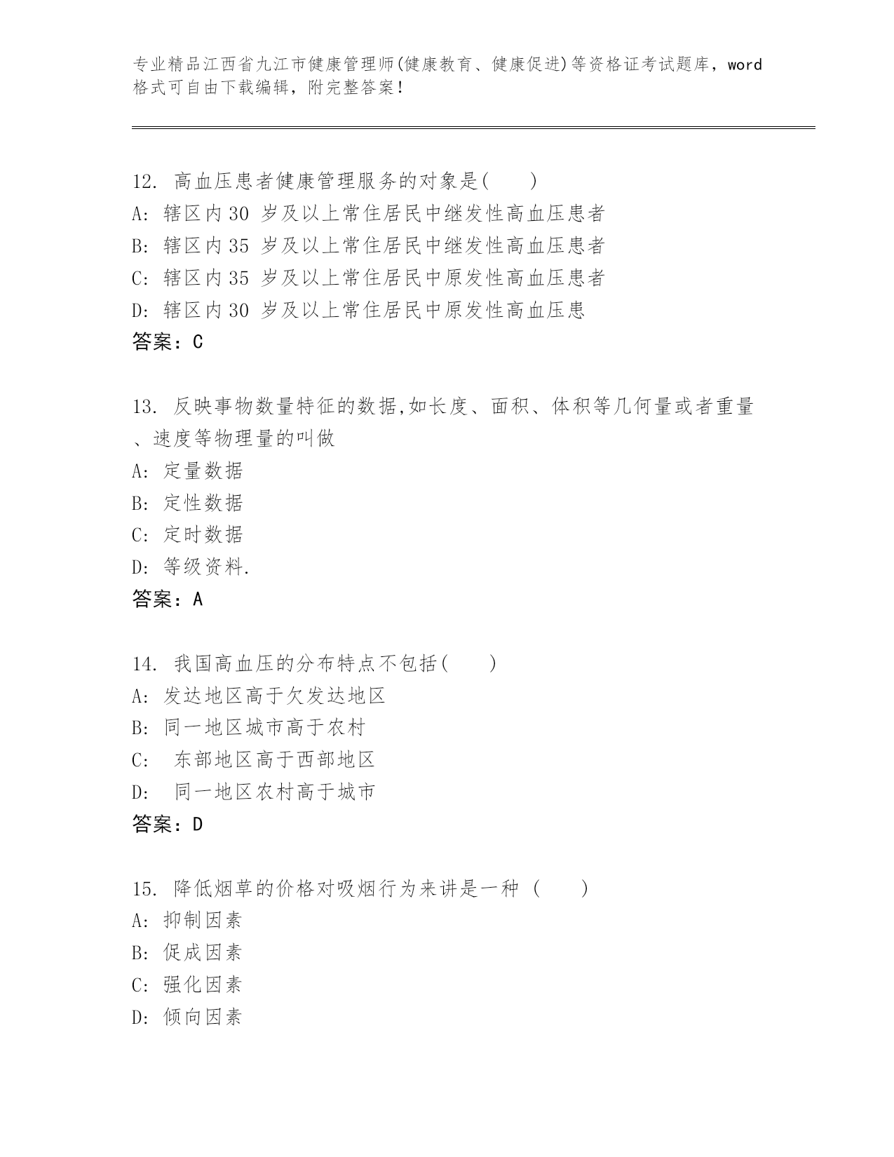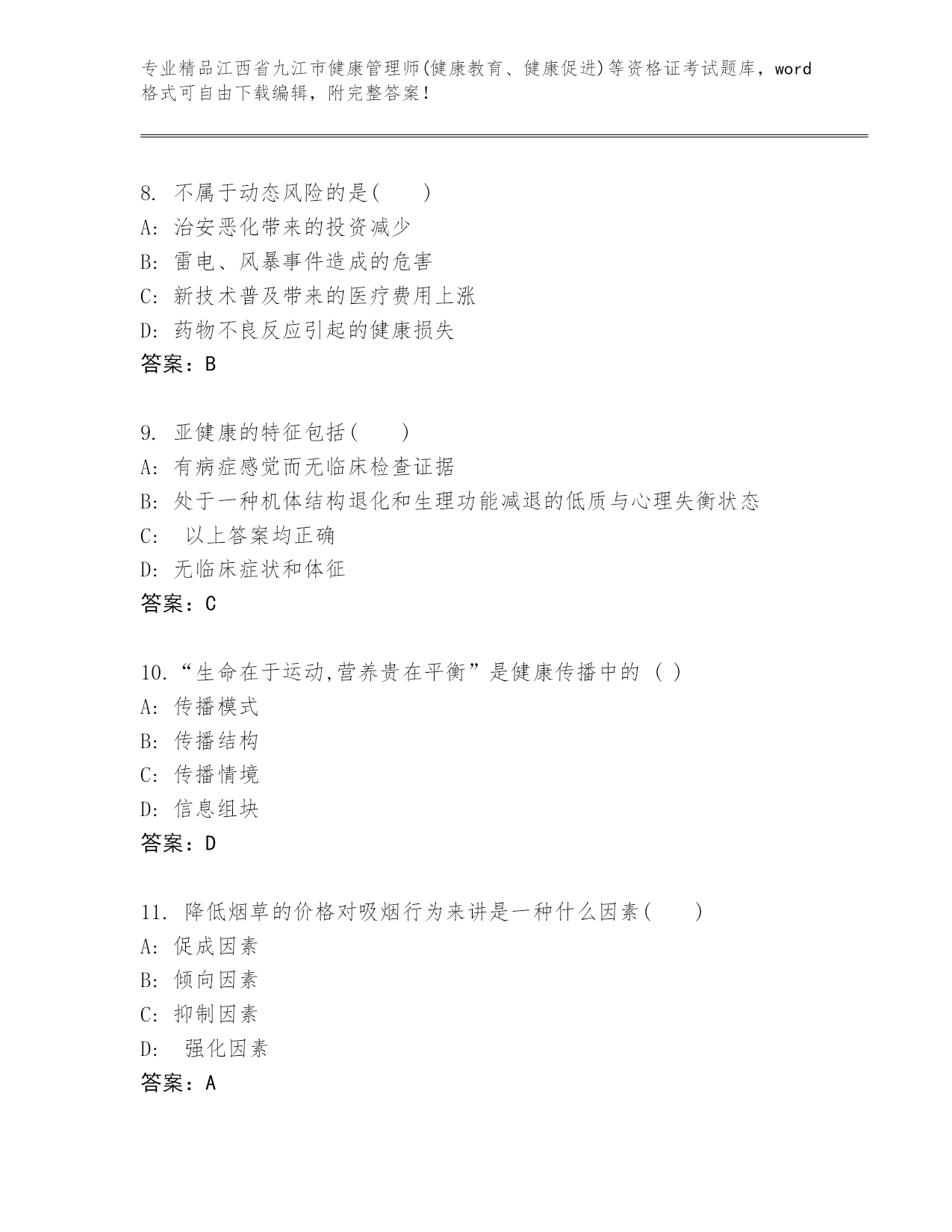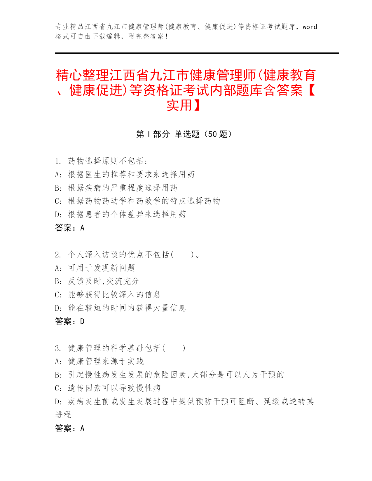 精心整理江西省九江市健康管理师(健康教育、健康促进)等资格证考试内部题库含答案【实用】.docx