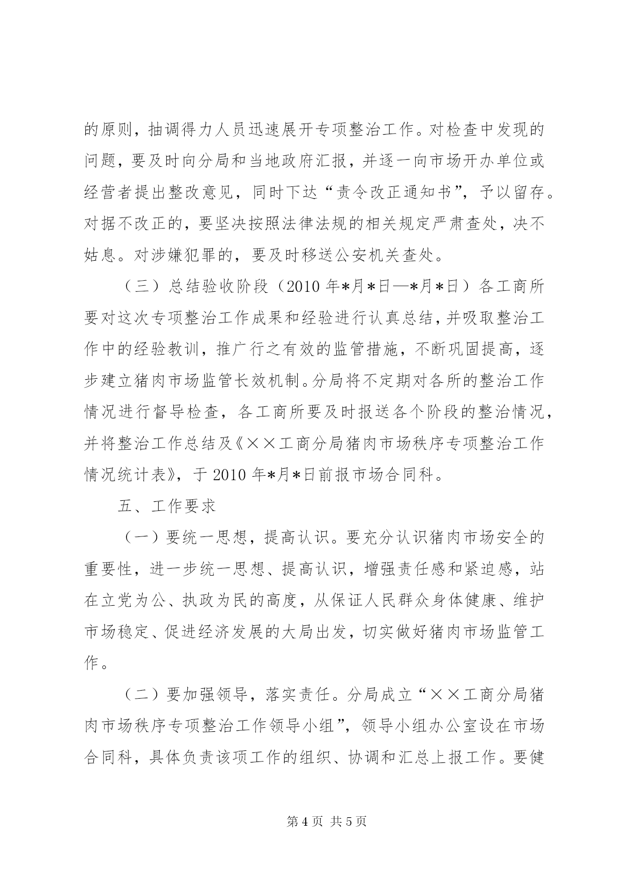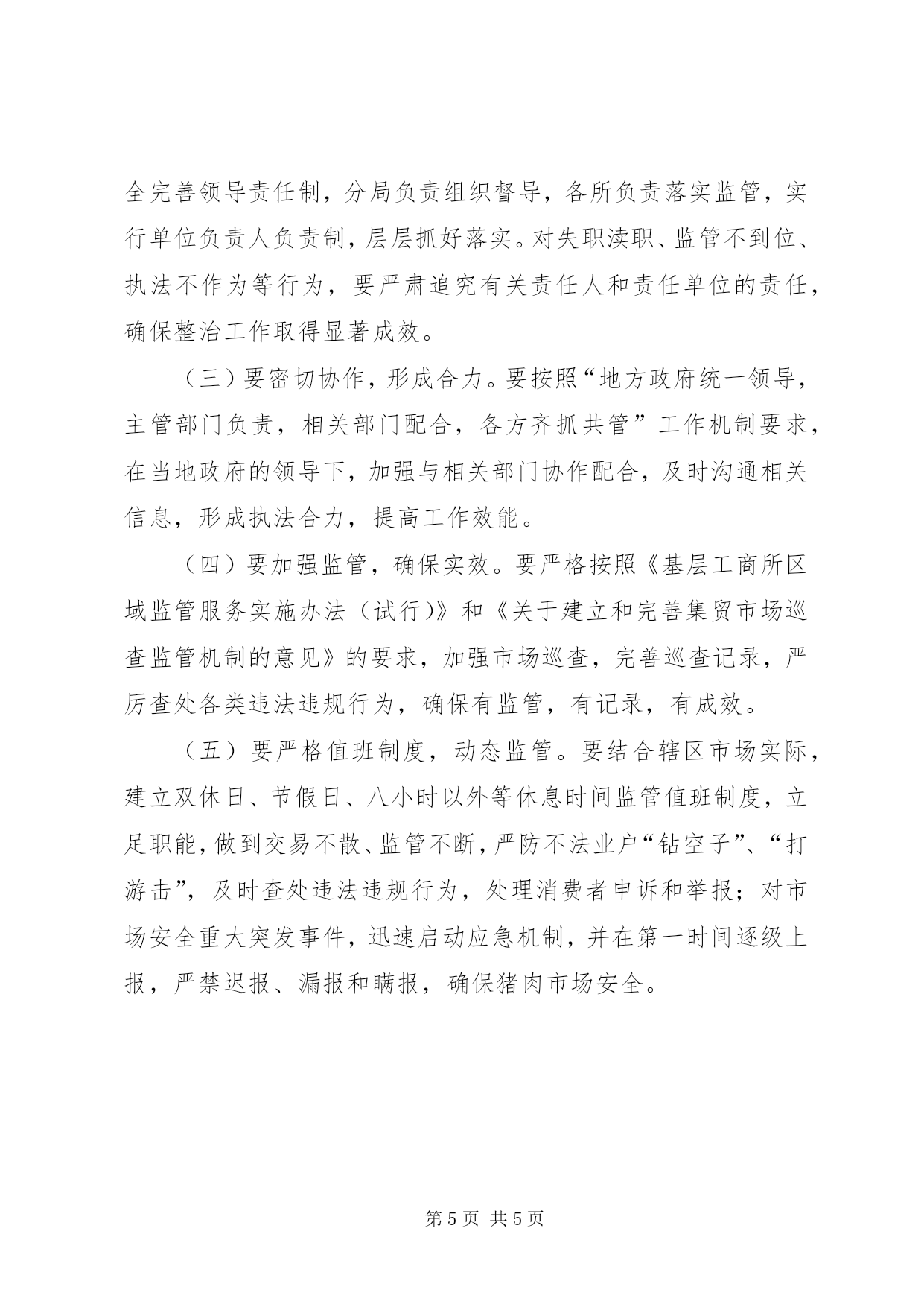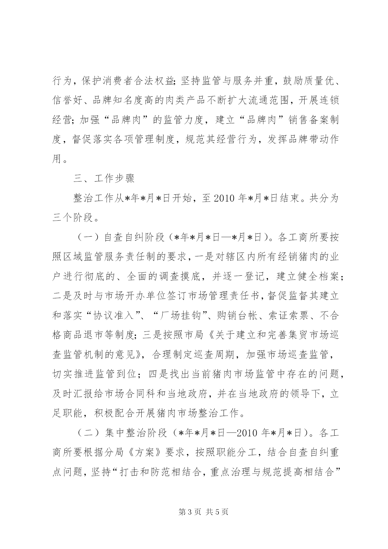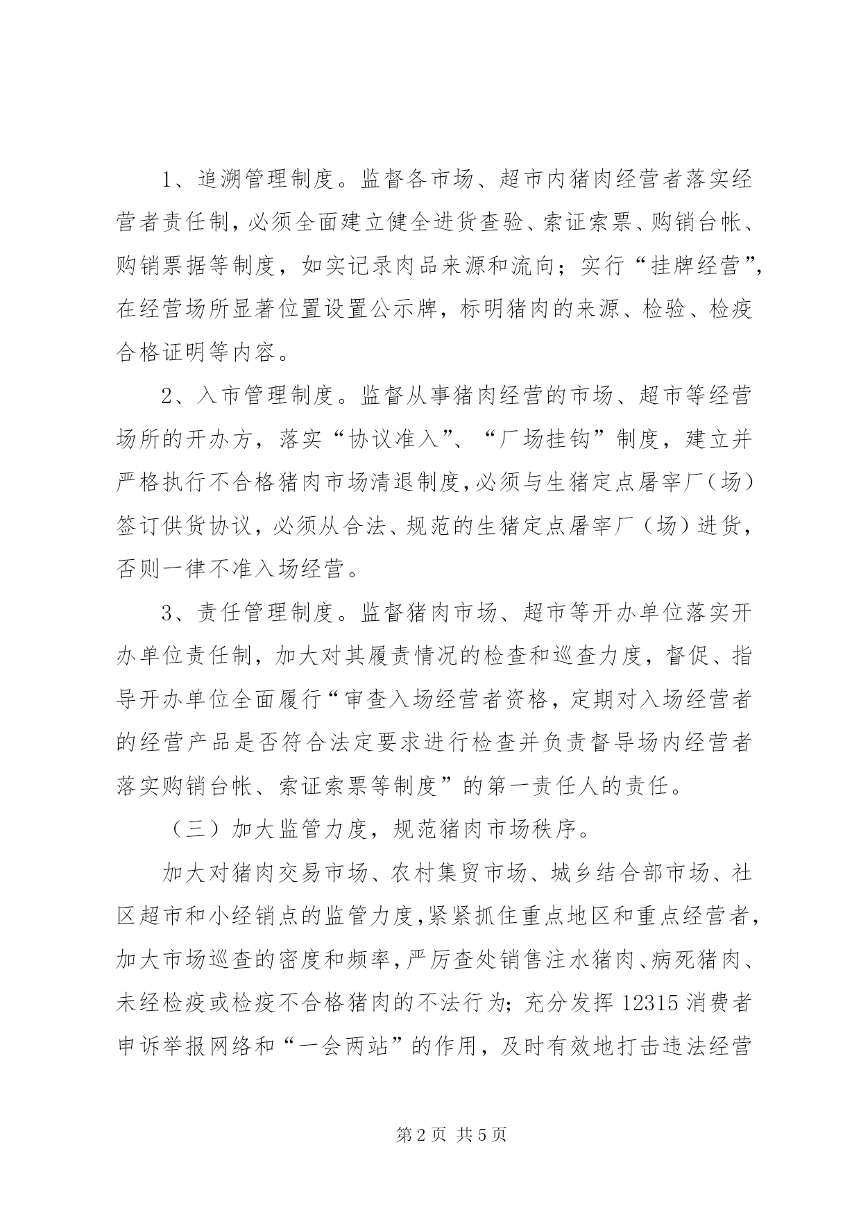 第PAGE\*Arabic\*MERGEFORMAT5页共NUMPAGES\*MERGEFORMAT5页工商分局猪肉市场整治工作方案加强猪肉市场管理,维护猪肉市场秩序,确保元旦、春节两大节日市场安全,我局决定利用两个月的时间,在全区开展猪肉市场秩序专项整治活动方案。一、工作目标认真履行工商部门职责,严把市场主体准入关,严格猪肉“两证两章”检验检疫上市制度,进一步健全完善猪肉市场准入管理制度,严厉查处各类违法违规行为,构建长效监管机制,确保猪肉质量安全,维护市场秩序稳定。二、整治的内容和任务按照“立足职能、加强监管、健全制度、注重实效”的原则,和“监管前移、源头治理,标本兼治、注重实效,分步实施、整体推进”的工作方针,针对猪肉市场特别是农村集贸市场存在的问题开展集中整治,突出解决流通领域猪肉商品质量监管问题。(一)严格市场准入,把好市场入市关口。严格市场主体准入,严格执行猪肉检验检疫上市制度,上市猪肉必须是经政府主管部门批准的定点屠宰厂(场)生产,经检疫、检验合格,两证(肉品品质检验合格证、动物产品检疫合格证)两章(肉品品质检验合格针刺章、动物产品检疫合格章)齐全的肉品,严禁无“两证两章”猪肉、不合格猪肉上市经营。(二)落实各项管理制度,实现可追溯管理。1、追溯管理制度。监督各市场、超市内猪肉经营者落实经营者责任制,必须全面建立健全进货查验、索证索票、购销台帐、购销票据等制度,如实记录肉品来源和流向;实行“挂牌经营”,在经营场所显著位置设置公示牌,标明猪肉的来源、检验、检疫合格证明等内容。2、入市管理制度。监督从事猪肉经营的市场、超市等经营场所的开办方,落实“协议准入”、“厂场挂钩”制度,建立并严格执行不合格猪肉市场清退制度,必须与生猪定点屠宰厂(场)签订供货协议,必须从合法、规范的生猪定点屠宰厂(场)进货,否则一律不准入场经营。3、责任管理制度。监督猪肉市场、超市等开办单位落实开办单位责任制,加大对其履责情况的检查和巡查力度,督促、指导开办单位全面履行“审查入场经营者资格,定期对入场经营者的经营产品是否符合法定要求进行检查并负责督导场内经营者落实购销台帐、索证索票等制度”的第一责任人的责任。(三)加大监管力度,规范猪肉市场秩序。加大对猪肉交易市场、农村集贸市场、城乡结合部市场、社区超市和小经销点的监管力度,紧紧抓住重点地区和重点经营者,加大市场巡查的密度和频率,严厉查处销售注水猪肉、病死猪肉、未经检疫或检疫不合格猪肉的不法行为;充分发挥12315消费者申诉举报网络和“一会两站”的作用,及时有效地打击违法经营行为,保护消费者合法权益;坚持监管与服务并重,鼓励质量优、信誉好、品牌知名度高的肉类产品不断扩大流通范围,开展连锁经营;加强“品牌肉”的监管力度,建立“品牌肉”销售备案制度,督促落实各项管理制度,规范其经营行为,发挥品牌带动作用。三、工作步骤整治工作从*年*月*日开始,至2010年*月*日结束。共分为三个阶段。(一)自查自纠阶段(*年*月*日—*月*日)。各工商所要按照区域监管服务责任制的要求,一是对辖区内所有经销猪肉的业户进行彻底的、全面的调查摸底,并逐一登记,建立健全档案;二是及时与市场开办单位签订市场管理责任书,督促监督其建立和落实“协议准入”、“厂场挂钩”、购销台帐、索证索票、不合格商品退市等制度;三是按照市局《关于建立和完善集贸市场巡查监管机制的意见》,合理制定巡查周期,加强市场巡查监管,切实推进监管到位;四是找出当前猪肉市场监管中存在的问题,及时汇报给市场合同科和当地政府,并在当地政府的领导下,立足职能,积极配合开展猪肉市场整治工作。(二)集中整治阶段(*年*月*日—2010年*月*日)。各工商所要根据分局《方案》要求,按照职能分工,结合自查自纠重点问题,坚持“打击和防范相结合,重点治理与规范提高相结合”的原则,抽调得力人员迅速展开专项整治工作。对检查中发现的问题,要及时向分局和当地政府汇报,并逐一向市场开办单位或经营者提出整改意见,同时下达“责令改正通知书”,予以留存。对据不改正的,要坚决按照法律法规的相关规定严肃查处,决不姑息。对涉嫌犯罪的,要及时移送公安机关查处。(三)总结验收阶段(2010年*月*日—*月*日)各工商所要对这次专项整治工作成果和经验进行认真总结,并吸取整治工作中的经验教训,推广行之有效的监管措施,不断巩固提高,逐步建立猪肉市场监管长效机制。分局将不定期对各所的整治工作情况进行督导检查,各工商所要及时报送各个阶段的整治情况,并将整治工作总结及《××工商分局猪肉市场秩序专项整治工作情况统计表》,于2010年*月*日前报市场合同科。五、工作要求(一)要统一思想,提高认识。要充分认识猪肉市场安全的重要性,进一步统一思想、提高认识,增强责任感和紧迫感,站在立党为公、执政为民
