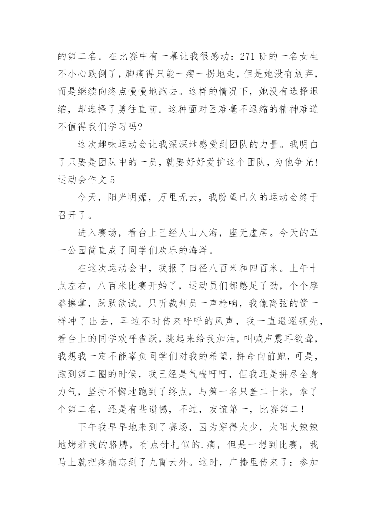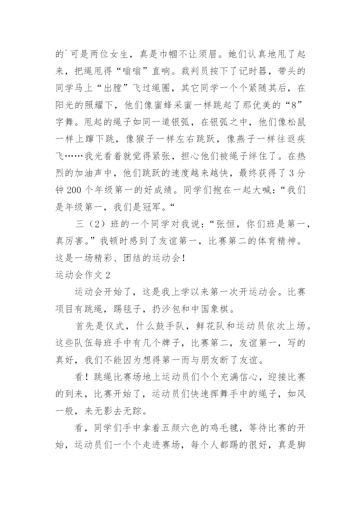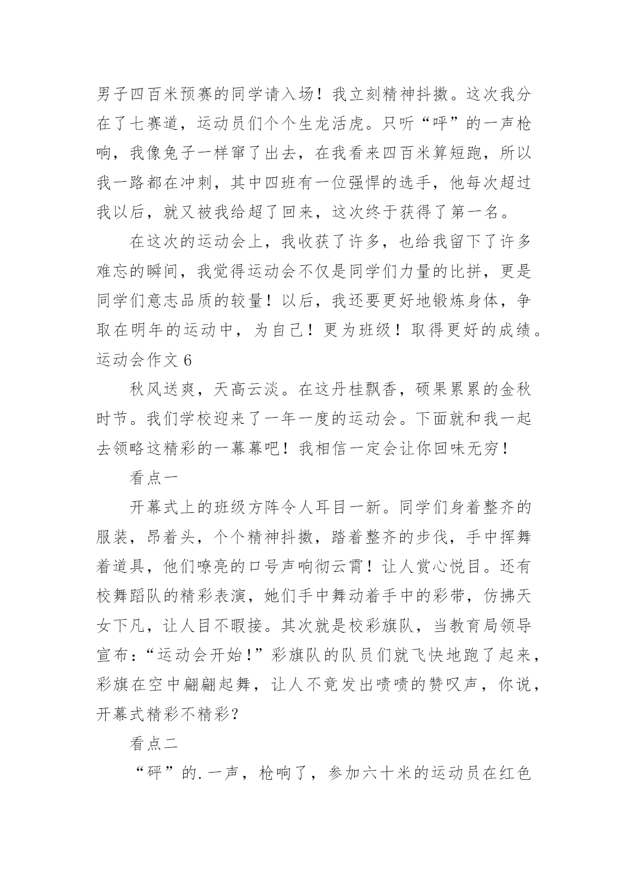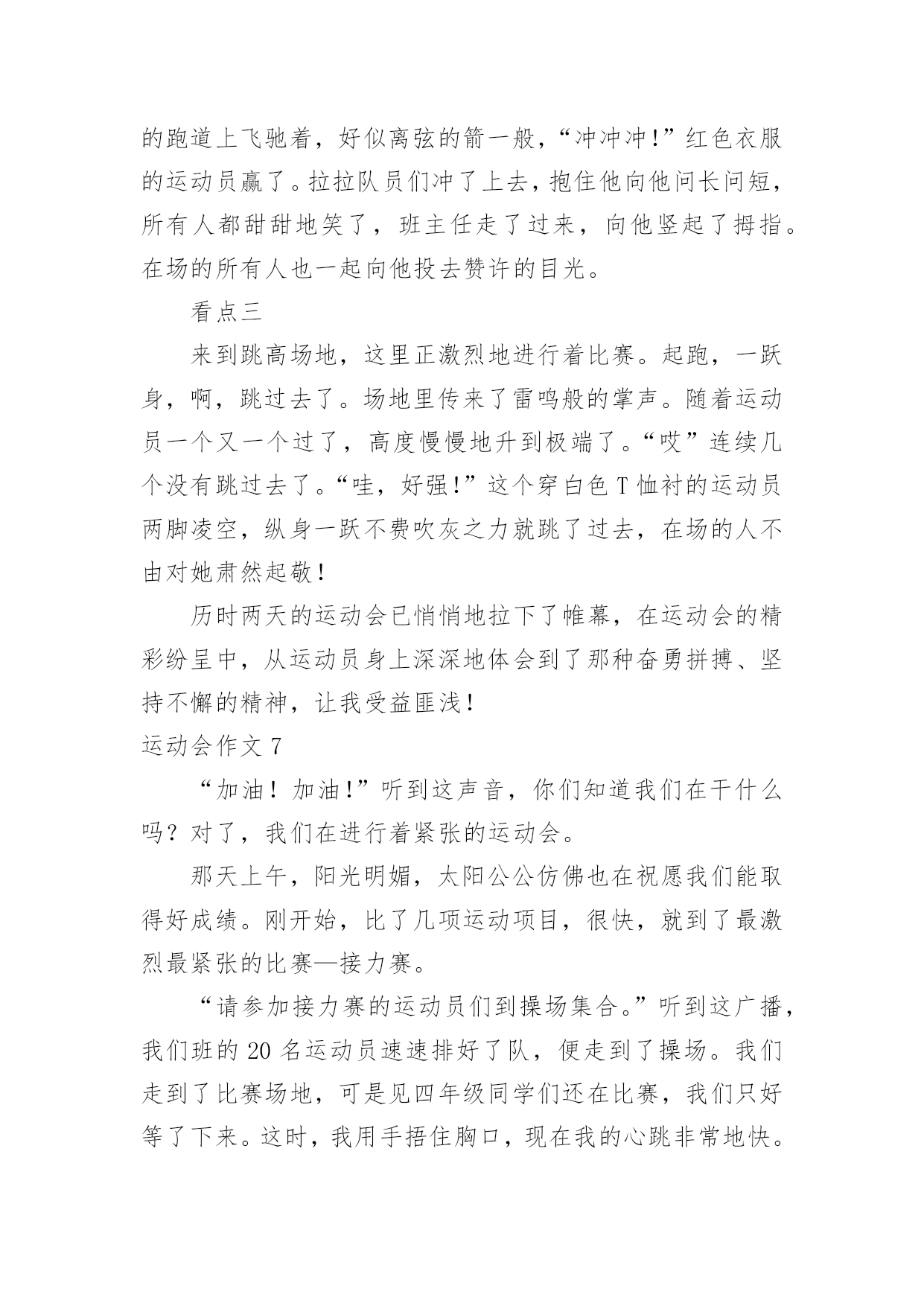 运动会作文(优秀)运动会作文在生活、工作和学习中,大家一定都接触过作文吧,作文是经过人的思想考虑和语言组织,通过文字来表达一个主题意义的记叙方法。相信许多人会觉得作文很难写吧,以下是小编整理的运动会作文,仅供参考,欢迎大家阅读。运动会作文1在这个秋高气爽的十月里,伴着明媚的阳光,我校迎来了20xx年小海燕体育节。所有同学的脸上都洋溢着笑容,心情无比激动。一大早,全校师生就来到了运动场,他们有的安排场地,有的整理服装,有的安放运动器材,忙得不亦乐乎,原本寂静的赛场一下子热闹起来。眨眼之间,运动会在大家热烈的掌声中拉开了序幕。首先是升旗仪式,场上响起了庄严的国歌声,歌声在空中回荡着。全场寂静无声,静静地聆听着,默默地注视着冉冉升起的五星红旗……接着,是各个年级的体能测试,包括跳绳、50米跑、仰卧起坐、坐位体前屈等。场上的同学们有的在做热身,有的在大声地交谈,还有的在做最后的练习……个个像一只欣喜若狂的小兔子,想要发挥自己最好的水平。最激动的人心的时刻到了——跳长绳比赛。我们班摇绳的`可是两位女生,真是巾帼不让须眉。她们认真地甩了起来,把绳甩得“嗡嗡”直响。裁判员按下了记时器,带头的同学马上“出膛”飞过绳圈,其它同学一个个紧随其后,在阳光的照耀下,他们像蜜蜂采蜜一样跳起了那优美的“8”字舞。甩起的绳子如同一道银弧,在银弧之中,他们像松鼠一样上蹿下跳,像猴子一样左右跳跃,像燕子一样往返疾飞……我光看着就觉得紧张,担心他们被绳子绊住了。在热烈的加油声中,他们跳跃的速度越来越快,最终获得了3分钟200个年级第一的好成绩。同学们抱在一起大喊:“我们是年级第一,我们是冠军。“三(2)班的一个同学对我说:“张恒,你们班是第一,真厉害。”我顿时感到了友谊第一,比赛第二的体育精神。这是一场精彩、团结的运动会!运动会作文2运动会开始了,这是我上学以来第一次开运动会。比赛项目有跳绳,踢毯子,扔沙包和中国象棋。首先是仪式,什么鼓手队,鲜花队和运动员依次上场。这些队伍每班手中有几个牌子,比赛第二,友谊第一,写的真好,我们不能因为想得第一而与朋友断了友谊。看!跳绳比赛场地上运动员们个个充满信心,迎接比赛的到来,比赛开始了,运动员们快速挥舞手中的绳子,如风一般,来无影去无踪。看,同学们手中拿着五颜六色的鸡毛毽,等待比赛的开始,运动员们一个个走进赛场,每个人都踢的很好,真是脚底生花,仿佛都可以拿到冠军。象棋比赛在二(1)班教室里,各位同学安静的、聚精会神的下着棋,努力让自己不走错一步棋。再看扔沙包比赛,是看谁扔的远,谁就胜出,每个人有三次机会。运动员们摩拳擦掌,毫不示弱,即使矢败也毫不放弃。比赛一直延续到下牛,师生们热情毫无减退。本届运动会全校师生的共同努力下,圆满的完成了各项比赛,顺利的结束了。体育是精神文明建设的'一个重要组成部分,是民簇素质,人民精神面貌的集中体现。运动会即是检验学校教育水平质量,展示学生青春风采,考验体能与心理的具体能与心理的具体实践。它锻炼的是体力,激活的是生命,弘扬的是个性和青春活力,收获的是笑和精神面貌。所有的选手在本届运动会上赛出了成绩,赛出了风格,发扬了友谊第一,比赛第二的精神,在比赛中寻觅了更多的光彩和梦想,在比寒中创造了更美好和辉煌。"运动会作文3在一个阳光明媚,万物复苏,春暖花开的季节,我们学校举行了一年一度春季田径运动会,同学很高兴,运动员更是精神抖擞,神采飞扬。在跑道上不时发出一阵一阵的发令枪响,那响声,如同一个命令一个任务,是开始冲刺,为了个人荣誉,为了班级荣誉的号召声,有了它才有努力拼搏的.力量。“呯”又又一声枪响了,这是六年级男子组1500米的决赛开始了,一开始,五道的运动员遥遥领先,像一只羚羊,飞速的奔跑着。一圈、两圈、三圈,只剩下200米了,只见3道的运动员冲刺了,他以猎豹捕食的速度冲了上去,原本保持第3名,一下子爆发了,就在这时台上的观众沸腾了起来,不时喊着:“xxx加油!”“加油xx加油……”运动员更快了,3道的运动员第一个冲过了终点,获得了胜利!“耶!”又一声喊过来了,这是胜利的喊叫。“请四年级男子组200米决赛的运动员道点名处。”该我跑了,我喝了口水,就到跑到了点名处……终于到我们这一组跑了,活动了一下腿脚就开始跑了,做起跑姿势。“嘭”的一声枪响不会吧?连“各就位”“预备”都没喊枪就响了。我不管三七二十一,就开跑,其他选手起跑慢了一点,追上了一个,剩100米了这时我该用脚尖跑,。我马上要得第一了,又听见班上的同学喊:“谢海洋加油!谢海洋加油”仿佛上天给我一股强大的力量,使我追过海广田,第一个冲过终点!“耶!”我欢呼起来。我获得了第一名有我自己的努更有同学们的大力支持啊!接下来有进行了许多精彩的项目,我想到,老师们组织这种活动真好,学生就应该德智体全面发展。这次运动会真精彩啊!运动会作文4上个星期六