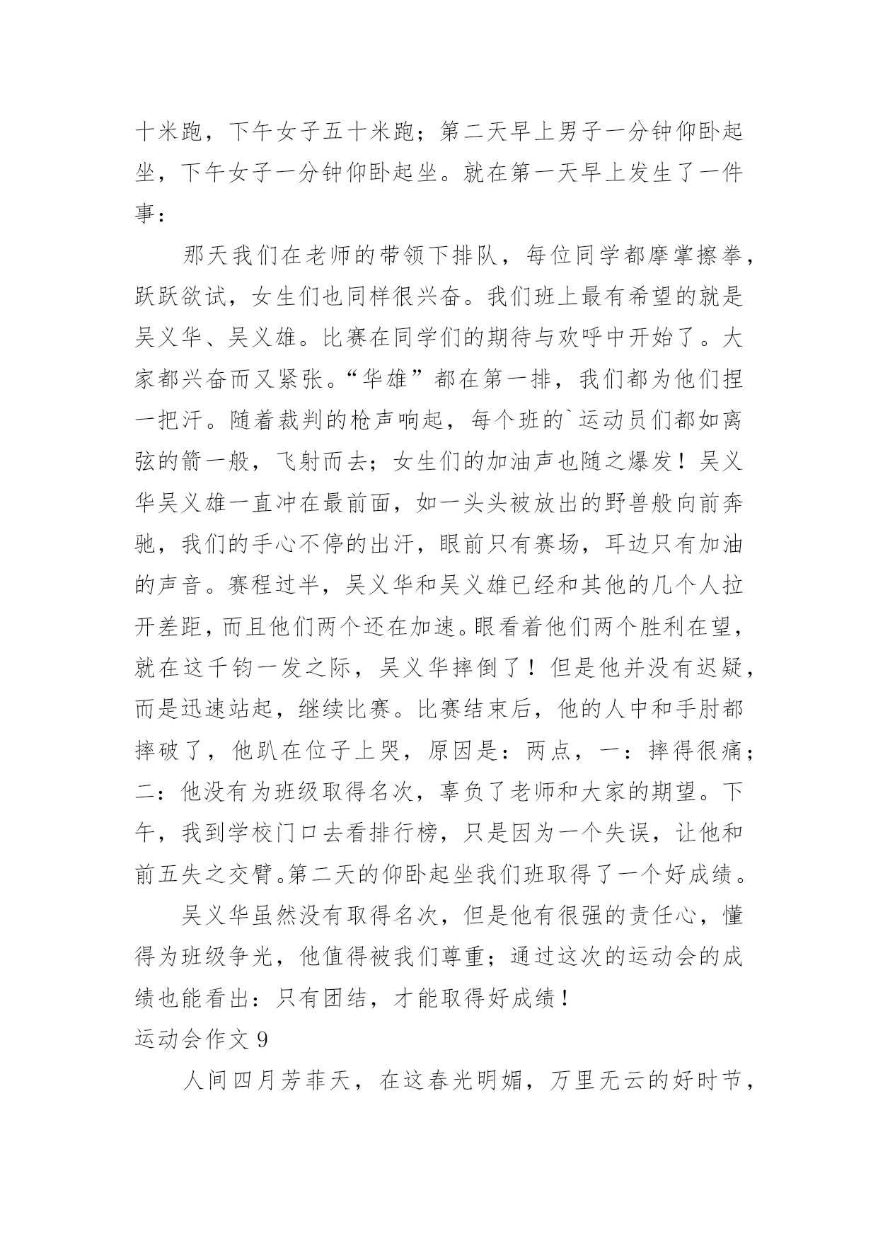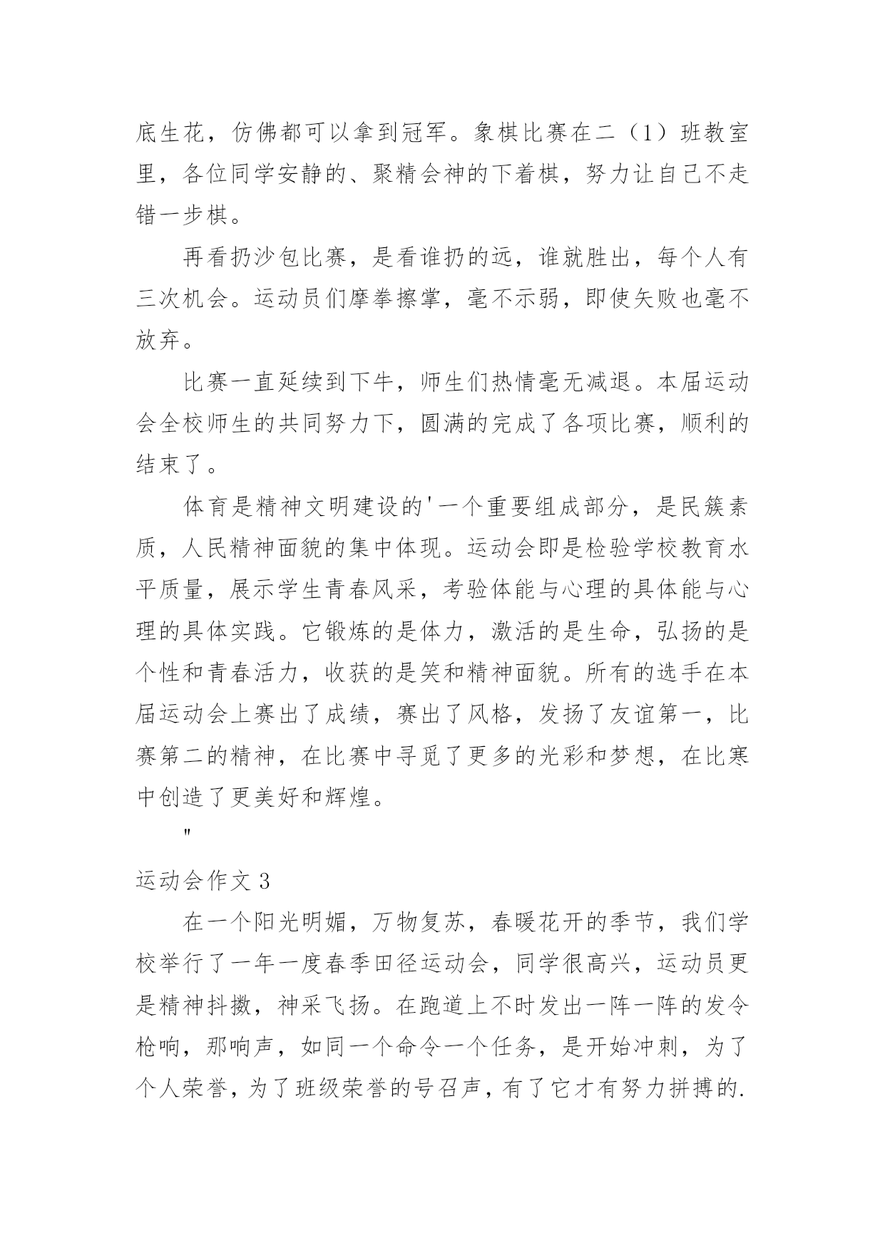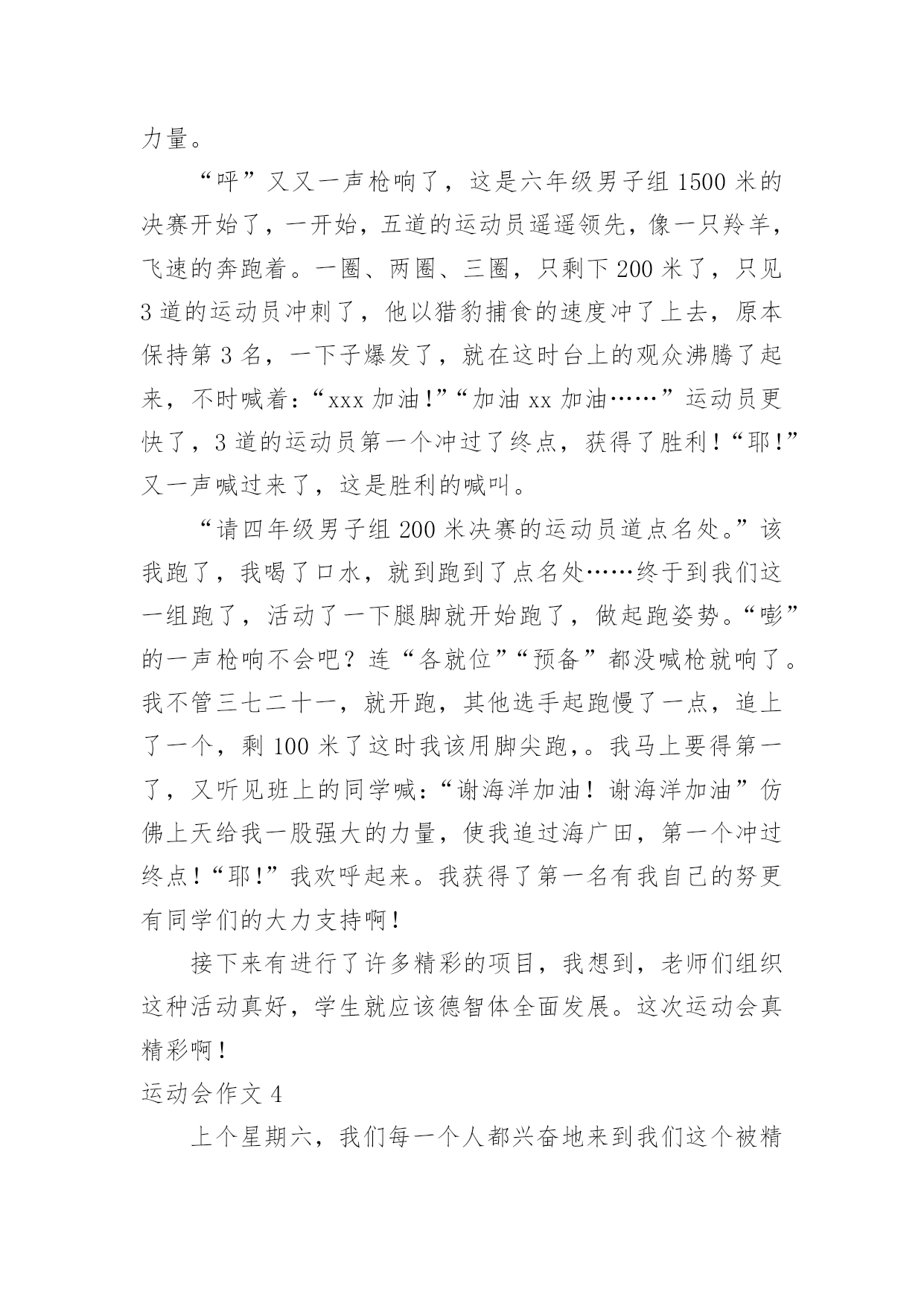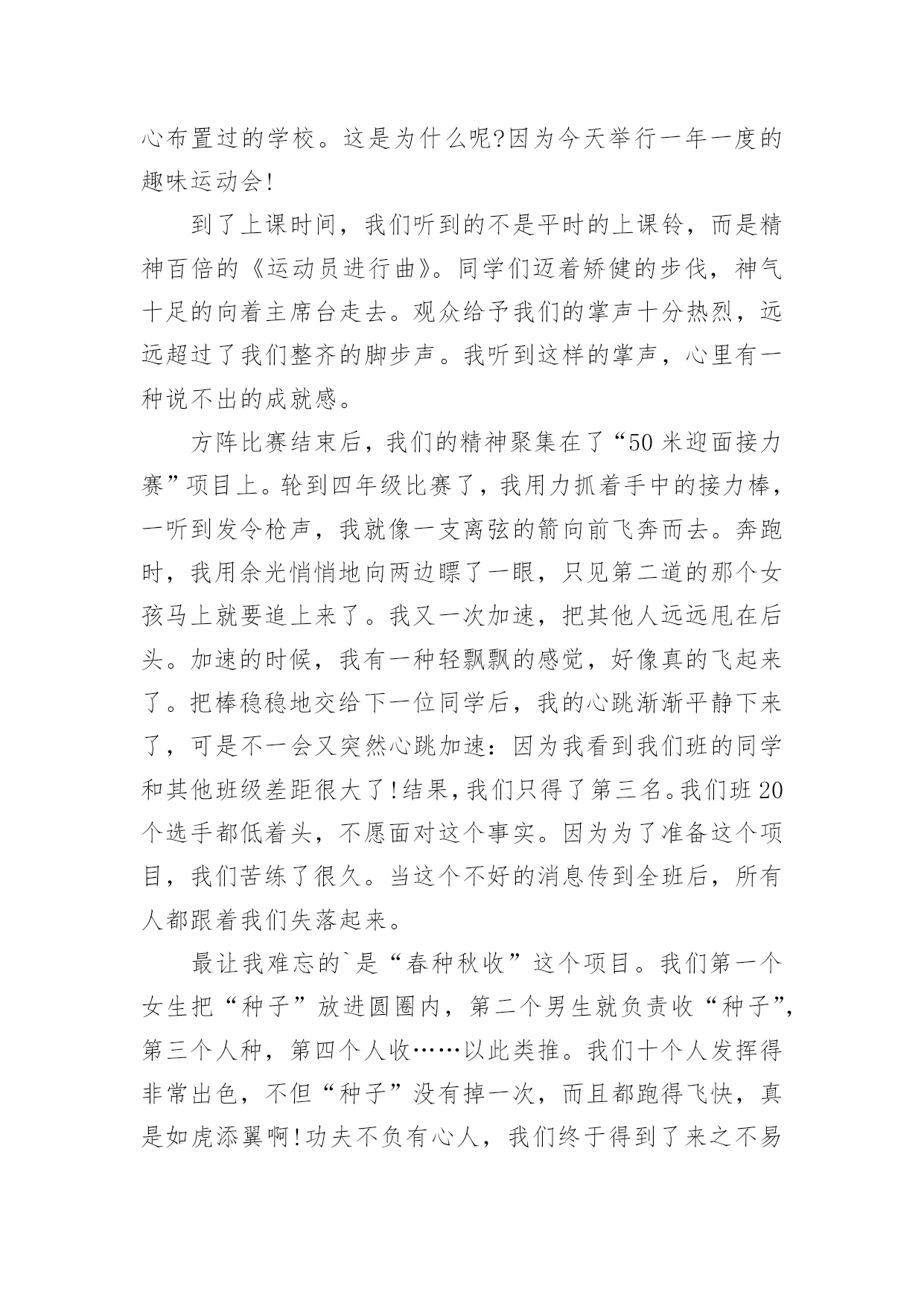 运动会作文(优秀)运动会作文在生活、工作和学习中,大家一定都接触过作文吧,作文是经过人的思想考虑和语言组织,通过文字来表达一个主题意义的记叙方法。相信许多人会觉得作文很难写吧,以下是小编整理的运动会作文,仅供参考,欢迎大家阅读。运动会作文1在这个秋高气爽的十月里,伴着明媚的阳光,我校迎来了20xx年小海燕体育节。所有同学的脸上都洋溢着笑容,心情无比激动。一大早,全校师生就来到了运动场,他们有的安排场地,有的整理服装,有的安放运动器材,忙得不亦乐乎,原本寂静的赛场一下子热闹起来。眨眼之间,运动会在大家热烈的掌声中拉开了序幕。首先是升旗仪式,场上响起了庄严的国歌声,歌声在空中回荡着。全场寂静无声,静静地聆听着,默默地注视着冉冉升起的五星红旗……接着,是各个年级的体能测试,包括跳绳、50米跑、仰卧起坐、坐位体前屈等。场上的同学们有的在做热身,有的在大声地交谈,还有的在做最后的练习……个个像一只欣喜若狂的小兔子,想要发挥自己最好的水平。最激动的人心的时刻到了——跳长绳比赛。我们班摇绳的`可是两位女生,真是巾帼不让须眉。她们认真地甩了起来,把绳甩得“嗡嗡”直响。裁判员按下了记时器,带头的同学马上“出膛”飞过绳圈,其它同学一个个紧随其后,在阳光的照耀下,他们像蜜蜂采蜜一样跳起了那优美的“8”字舞。甩起的绳子如同一道银弧,在银弧之中,他们像松鼠一样上蹿下跳,像猴子一样左右跳跃,像燕子一样往返疾飞……我光看着就觉得紧张,担心他们被绳子绊住了。在热烈的加油声中,他们跳跃的速度越来越快,最终获得了3分钟200个年级第一的好成绩。同学们抱在一起大喊:“我们是年级第一,我们是冠军。“三(2)班的一个同学对我说:“张恒,你们班是第一,真厉害。”我顿时感到了友谊第一,比赛第二的体育精神。这是一场精彩、团结的运动会!运动会作文2运动会开始了,这是我上学以来第一次开运动会。比赛项目有跳绳,踢毯子,扔沙包和中国象棋。首先是仪式,什么鼓手队,鲜花队和运动员依次上场。这些队伍每班手中有几个牌子,比赛第二,友谊第一,写的真好,我们不能因为想得第一而与朋友断了友谊。看!跳绳比赛场地上运动员们个个充满信心,迎接比赛的到来,比赛开始了,运动员们快速挥舞手中的绳子,如风一般,来无影去无踪。看,同学们手中拿着五颜六色的鸡毛毽,等待比赛的开始,运动员们一个个走进赛场,每个人都踢的很好,真是脚底生花,仿佛都可以拿到冠军。象棋比赛在二(1)班教室里,各位同学安静的、聚精会神的下着棋,努力让自己不走错一步棋。再看扔沙包比赛,是看谁扔的远,谁就胜出,每个人有三次机会。运动员们摩拳擦掌,毫不示弱,即使矢败也毫不放弃。比赛一直延续到下牛,师生们热情毫无减退。本届运动会全校师生的共同努力下,圆满的完成了各项比赛,顺利的结束了。体育是精神文明建设的'一个重要组成部分,是民簇素质,人民精神面貌的集中体现。运动会即是检验学校教育水平质量,展示学生青春风采,考验体能与心理的具体能与心理的具体实践。它锻炼的是体力,激活的是生命,弘扬的是个性和青春活力,收获的是笑和精神面貌。所有的选手在本届运动会上赛出了成绩,赛出了风格,发扬了友谊第一,比赛第二的精神,在比赛中寻觅了更多的光彩和梦想,在比寒中创造了更美好和辉煌。"运动会作文3在一个阳光明媚,万物复苏,春暖花开的季节,我们学校举行了一年一度春季田径运动会,同学很高兴,运动员更是精神抖擞,神采飞扬。在跑道上不时发出一阵一阵的发令枪响,那响声,如同一个命令一个任务,是开始冲刺,为了个人荣誉,为了班级荣誉的号召声,有了它才有努力拼搏的.力量。“呯”又又一声枪响了,这是六年级男子组1500米的决赛开始了,一开始,五道的运动员遥遥领先,像一只羚羊,飞速的奔跑着。一圈、两圈、三圈,只剩下200米了,只见3道的运动员冲刺了,他以猎豹捕食的速度冲了上去,原本保持第3名,一下子爆发了,就在这时台上的观众沸腾了起来,不时喊着:“xxx加油!”“加油xx加油……”运动员更快了,3道的运动员第一个冲过了终点,获得了胜利!“耶!”又一声喊过来了,这是胜利的喊叫。“请四年级男子组200米决赛的运动员道点名处。”该我跑了,我喝了口水,就到跑到了点名处……终于到我们这一组跑了,活动了一下腿脚就开始跑了,做起跑姿势。“嘭”的一声枪响不会吧?连“各就位”“预备”都没喊枪就响了。我不管三七二十一,就开跑,其他选手起跑慢了一点,追上了一个,剩100米了这时我该用脚尖跑,。我马上要得第一了,又听见班上的同学喊:“谢海洋加油!谢海洋加油”仿佛上天给我一股强大的力量,使我追过海广田,第一个冲过终点!“耶!”我欢呼起来。我获得了第一名有我自己的努更有同学们的大力支持啊!接下来有进行了许多精彩的项目,我想到,老师们组织这种活动真好,学生就应该德智体全面发展。这次运动会真精彩啊!运动会作文4上个星期六