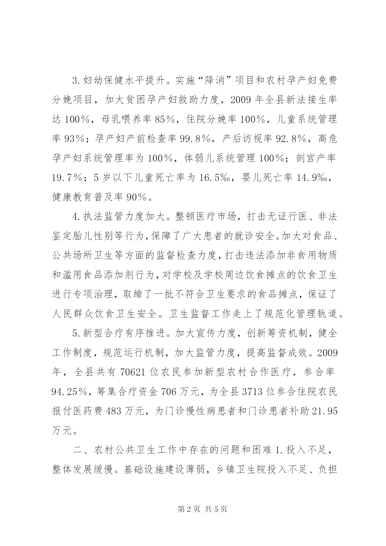 第PAGE\*Arabic\*MERGEFORMAT5页共NUMPAGES\*MERGEFORMAT5页县农村公共卫生建设调研报告一、我县农村公共卫生建设现状1.卫生网络日趋完善。坚持把农村三级卫生网络建设、稳定乡医队伍和强化预防保健作为重点工作,铺摊子、打基础、抓规范。一是狠抓村级卫生人员业务培训。举办培训班5期,专题讲座13场次,通过省级乡村医生资格考试54人,有效提高了乡村医生队伍整体素质。二是加强村卫生室规范化建设。出台《xx县村卫生室规范化管理工作实施方案》及相关配套文件,在全县191个行政村建成卫生室166个,投资55.3万元为达标卫生室配备了医疗器械和用品。三是改善乡镇卫生院xx县级医院基础设施。先后投资1560万元实施了隆坊、桥山、康崖底、龙首门诊楼和店头中心卫生院综合楼主体建设以及县中医门诊住院楼改造等工程,为店头、隆坊、田庄3所中心卫生院配备了救护车。2.疾病防控不断加强。一是加强疾控工作规范化管理。加快疫苗冷库、生物实验室等基础设施建设步伐,全苗覆盖率达98%以上。免疫规划工作走在了全省前列。二是加大传染病防治力度,使各类传染病在我县得到了有效防控,人民群众的身体健康得到有效保障。三是肺结核防治项目进展顺利,肺结核病人得到了全面的免费检查和治疗。四是地方病的防控工作成效显著。对碘缺乏病患者实施免费治疗,完成克山病监测、线索调查和免费跟踪治疗任务。3.妇幼保健水平提升。实施“降消”项目和农村孕产妇免费分娩项目,加大贫困孕产妇救助力度,2009年全县新法接生率达100%,母乳喂养率85%,住院分娩率100%,儿童系统管理率93%;孕产妇产前检查率99.8%,产后访视率92.8%,高危孕产妇系统管理率为100%,体弱儿系统管理100%;剖宫产率19.7%;5岁以下儿童死亡率为16.5‰,婴儿死亡率14.9‰,健康教育普及率90%。4.执法监管力度加大。整顿医疗市场,打击无证行医、非法鉴定胎儿性别等行为,保障了广大患者的就诊安全。加大对食品、公共场所卫生等方面的监督检查力度,打击违法添加非食用物质和滥用食品添加剂行为,对学校及学校周边饮食摊点的饮食卫生进行专项治理,取缔了一批不符合卫生要求的食品摊点,保证了人民群众饮食卫生安全。卫生监督工作走上了规范化管理轨道。5.新型合疗有序推进。加大宣传力度,创新筹资机制,健全工作制度,规范运行机制,加大监管力度,提高监督成效。2009年,全县共有70621位农民参加新型农村合作医疗,参合率94.25%,筹集合疗资金706万元,为全县3713位参合住院农民报付医药费483万元,为门诊慢性病患者和门诊患者补助21.95万元。二、农村公共卫生工作中存在的问题和困难1.投入不足,整体发展缓慢。基础设施建设薄弱,乡镇卫生院投入不足、负担沉重,器械短缺,设备简陋、老化问题普遍存在,职工收入低,医疗水平低,整体发展与农民群众健康需求仍有一定差距。2.人才缺乏,队伍结构不优。农村卫生技术队伍总量不足、素质不高、队伍不稳。乡镇卫生院多以中专毕业的卫生技术人员为主,业务素质普遍偏低。在岗人员业务深造机会少,医疗水平难以提高。有的乡村卫生院连职工的正常工资都无法保证,难以留住高素质人才,外科、妇科、放射、检验、b超等岗位短缺专业人才现象普遍存在。3.基础较差,防病意识不强。农村自来水常规消毒不到位,卫生厕所粪便无害化处理率低。受经济条件、文化水平及传统观念的影响,农村群众卫生意识淡薄,对常见传染病和群体性食物中毒的预防措施知晓甚少,“不干不净、吃了没病”、“小病能拖则拖、大病能捱就捱”等观念严重。三、进一步加强我县公共卫生建设的对策和建议1.坚持科学发展,加大投入力度。按照科学发展观要求,在大力推进经济社会发展的同时,协调推进公共卫生事业发展。要进一步加大政府的投入力度,加快“覆盖城乡、功能完善”的疾病预防控制、卫生监督和医疗救治体系建设步伐。要按照统筹规划、分类指导、分步实施、加快进度的原则,切实加强农村卫生机构基础设施建设,为构筑农村卫生保健长效防治机制提供财力保证。2.坚持统筹发展,构建监督体系。建立以县疾病预防控制中心为主体、乡镇卫生院为枢纽、村卫生室为基础的疾病预防控制体系。进一步加强妇幼保健工作,加大重点人群的监测力度,开展妇女病普查、婚前医学检查、新生儿疾病筛查及“三项监测”等工作。逐步建成以县卫生监督所为主体、各派出机构为补充的卫生监督体系。3.坚持协调发展,解决基本医疗。虽然近年来我县积极实施了农村合作医疗工作,但是大病保障型合作医疗制度还不能从根本上解决农民的基本医疗问题,农村“有病不看、看不起病”的现象仍不同程度存在,农村因病致贫、因病返贫现象比较突出。一些传染病、地方病、职业病和严重疾病不同程度地危害着广大人民群众的身体健康。对此,必须进一步重视