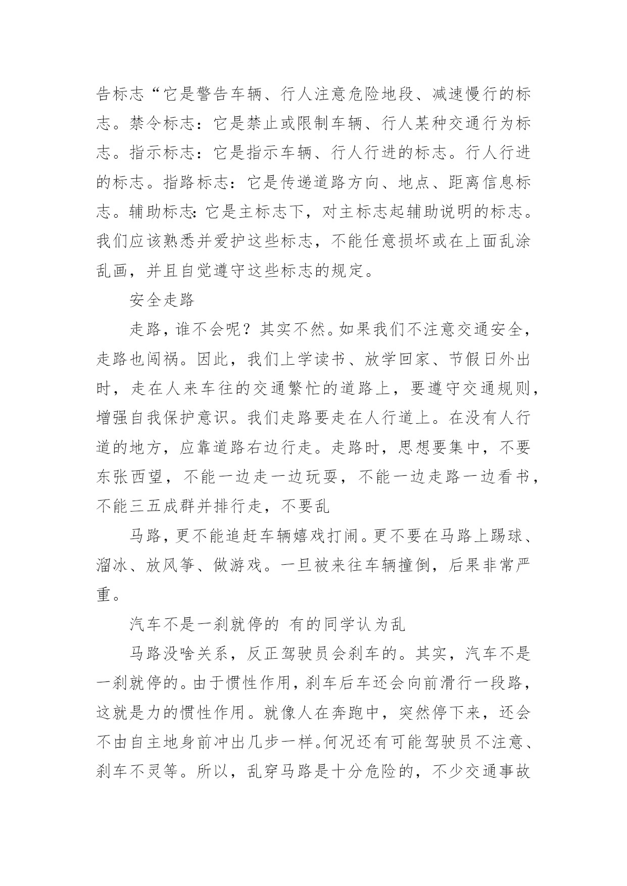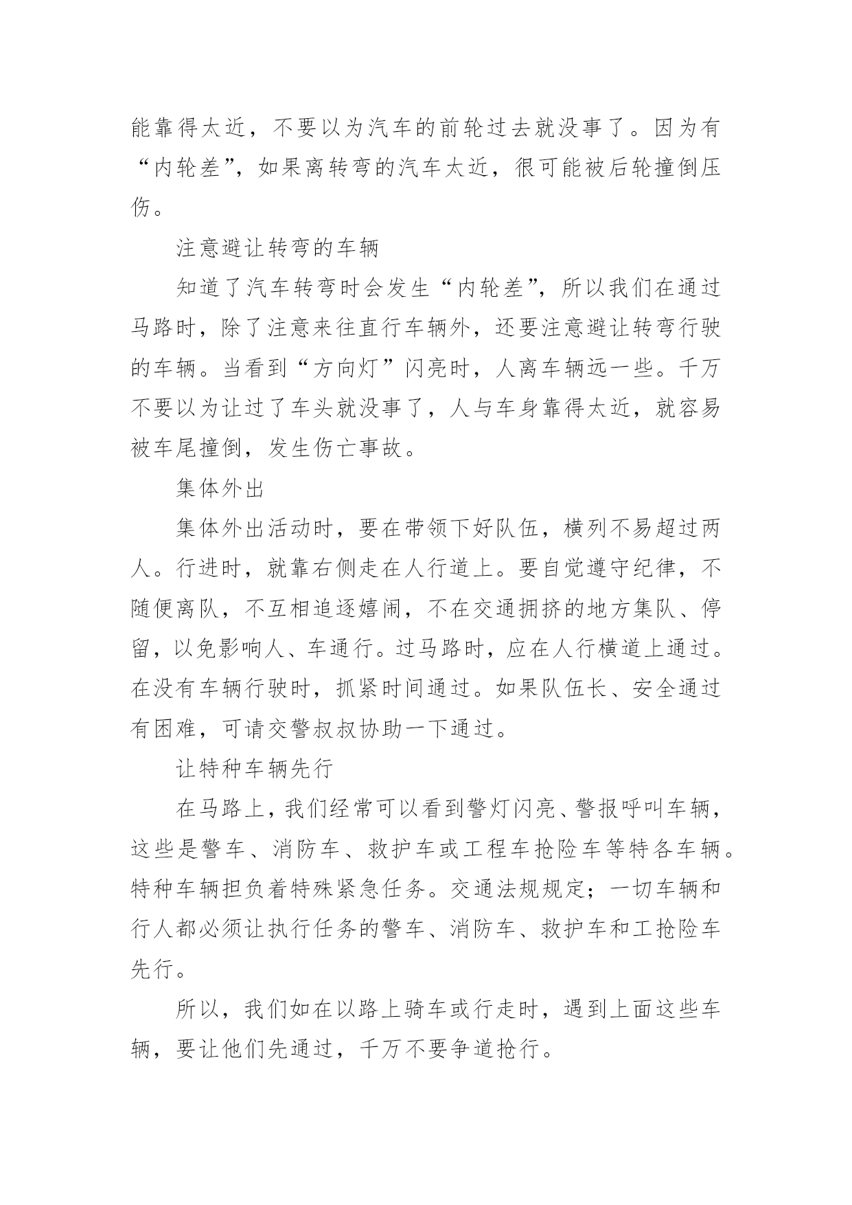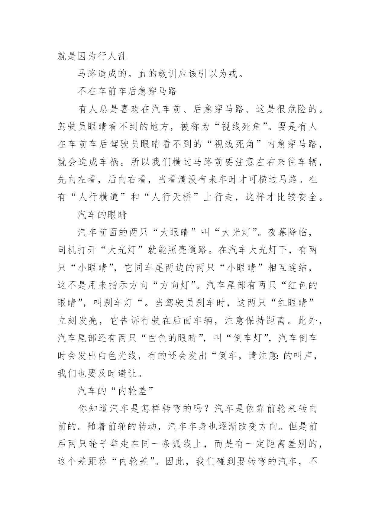交通安全教育小报内容导语:交通安全是指人们在道路上进行活动、玩耍时,要按照交通法规的规定,安全地行车、走路,避免发生人身伤亡或财物损失。下面由小编为大家整理的交通安全教育小报内容,希望可以帮助到大家!交通安全教育小报内容大全交通信号灯在繁忙的十字路口,四面都悬挂着红、黄、绿、三色交通信号灯,它是不出声的“交通警”。红绿灯是国际统一交通信号灯。红灯是停止信号,绿灯是通行信号。交叉路口,几个方向来的车都汇集在这儿,有的要直行,有的要拐弯,到底让谁先走,这就是要听从红绿灯指挥。红灯亮,行或左转弯,在不碍行人和车辆情况下,允许车辆右转弯;绿灯亮,准许车辆直行或转弯;黄灯亮,停在路口停止线或人行横道线以内,已经继续通行;黄灯闪烁时,警告车辆注意安全。人车分流各行其道每当你走马路,就会看到许多行人的车辆来来往往,川流不息。如果行人和车辆爱怎么走就怎么走,那么就会交叉冲突,发生混。交通道路上用“交通标线”划出车辆、行人应走的规则:机动车走“机动车道”。在道路上,我们可以看到各式各样的交通标志。它们用图案、符号和文字来表达特定的意思。告诉驾驶员和行人注意附近环境情况。这些标志对于安全车非常重要,被称为“永不下岗的交通警”。警告标志“它是警告车辆、行人注意危险地段、减速慢行的标志。禁令标志:它是禁止或限制车辆、行人某种交通行为标志。指示标志:它是指示车辆、行人行进的标志。行人行进的标志。指路标志:它是传递道路方向、地点、距离信息标志。辅助标志:它是主标志下,对主标志起辅助说明的标志。我们应该熟悉并爱护这些标志,不能任意损坏或在上面乱涂乱画,并且自觉遵守这些标志的规定。安全走路走路,谁不会呢?其实不然。如果我们不注意交通安全,走路也闯祸。因此,我们上学读书、放学回家、节假日外出时,走在人来车往的交通繁忙的道路上,要遵守交通规则,增强自我保护意识。我们走路要走在人行道上。在没有人行道的地方,应靠道路右边行走。走路时,思想要集中,不要东张西望,不能一边走一边玩耍,不能一边走路一边看书,不能三五成群并排行走,不要乱马路,更不能追赶车辆嬉戏打闹。更不要在马路上踢球、溜冰、放风筝、做游戏。一旦被来往车辆撞倒,后果非常严重。汽车不是一刹就停的有的同学认为乱马路没啥关系,反正驾驶员会刹车的。其实,汽车不是一刹就停的。由于惯性作用,刹车后车还会向前滑行一段路,这就是力的惯性作用。就像人在奔跑中,突然停下来,还会不由自主地身前冲出几步一样。何况还有可能驾驶员不注意、刹车不灵等。所以,乱穿马路是十分危险的,不少交通事故就是因为行人乱马路造成的。血的教训应该引以为戒。不在车前车后急穿马路有人总是喜欢在汽车前、后急穿马路、这是很危险的。驾驶员眼睛看不到的地方,被称为“视线死角”。要是有人在车前车后驾驶员眼睛看不到的“视线死角”内急穿马路,就会造成车祸。所以我们横过马路前要注意左右来往车辆,先向左看,后向右看,当看清没有来车时才可横过马路。在有“人行横道”和“人行天桥”上行走,这样才比较安全。汽车的眼睛汽车前面的两只“大眼睛”叫“大光灯”。夜幕降临,司机打开“大光灯”就能照亮道路。在汽车大光灯下,有两只“小眼睛”,它同车尾两边的两只“小眼睛”相互连结,这不是用来指示方向“方向灯”。汽车尾部有两只“红色的眼睛”,叫刹车灯“。当驾驶员刹车时,这两只“红眼睛”立刻发亮,它告诉行驶在后面车辆,注意保持距离。此外,汽车尾部还有两只“白色的眼睛”,叫“倒车灯”,汽车倒车时会发出白色光线,有的还会发出“倒车,请注意:的叫声,我们也要及时避让。汽车的“内轮差”你知道汽车是怎样转弯的吗?汽车是依靠前轮来转向前的。随着前轮的转动,汽车车身也逐渐改变方向。但是前后两只轮子举走在同一条弧线上,而是有一定距离差别的,这个差距称“内轮差”。因此,我们碰到要转弯的汽车,不能靠得太近,不要以为汽车的前轮过去就没事了。因为有“内轮差”,如果离转弯的汽车太近,很可能被后轮撞倒压伤。注意避让转弯的车辆知道了汽车转弯时会发生“内轮差”,所以我们在通过马路时,除了注意来往直行车辆外,还要注意避让转弯行驶的车辆。当看到“方向灯”闪亮时,人离车辆远一些。千万不要以为让过了车头就没事了,人与车身靠得太近,就容易被车尾撞倒,发生伤亡事故。集体外出集体外出活动时,要在带领下好队伍,横列不易超过两人。行进时,就靠右侧走在人行道上。要自觉遵守纪律,不随便离队,不互相追逐嬉闹,不在交通拥挤的地方集队、停留,以免影响人、车通行。过马路时,应在人行横道上通过。在没有车辆行驶时,抓紧时间通过。如果队伍长、安全通过有困难,可请交警叔叔协助一下通过。让特种车辆先行在马路上,我们经常可以看到警灯闪亮、警报呼叫车辆,这些是警车、消防车、救护车或工程车抢险车等特各车辆。特种车辆担负着特殊紧急任务。交通法规规定;一切车辆和行人都必须让执行任务
