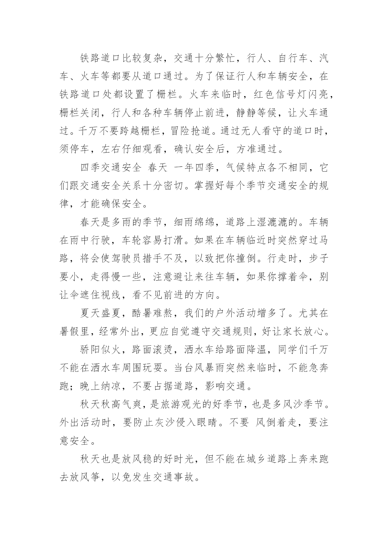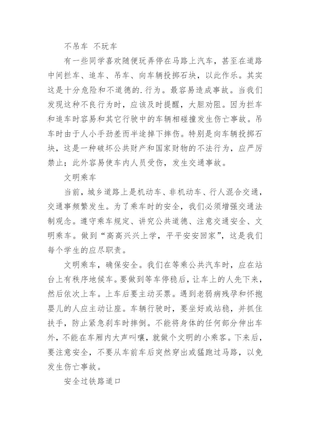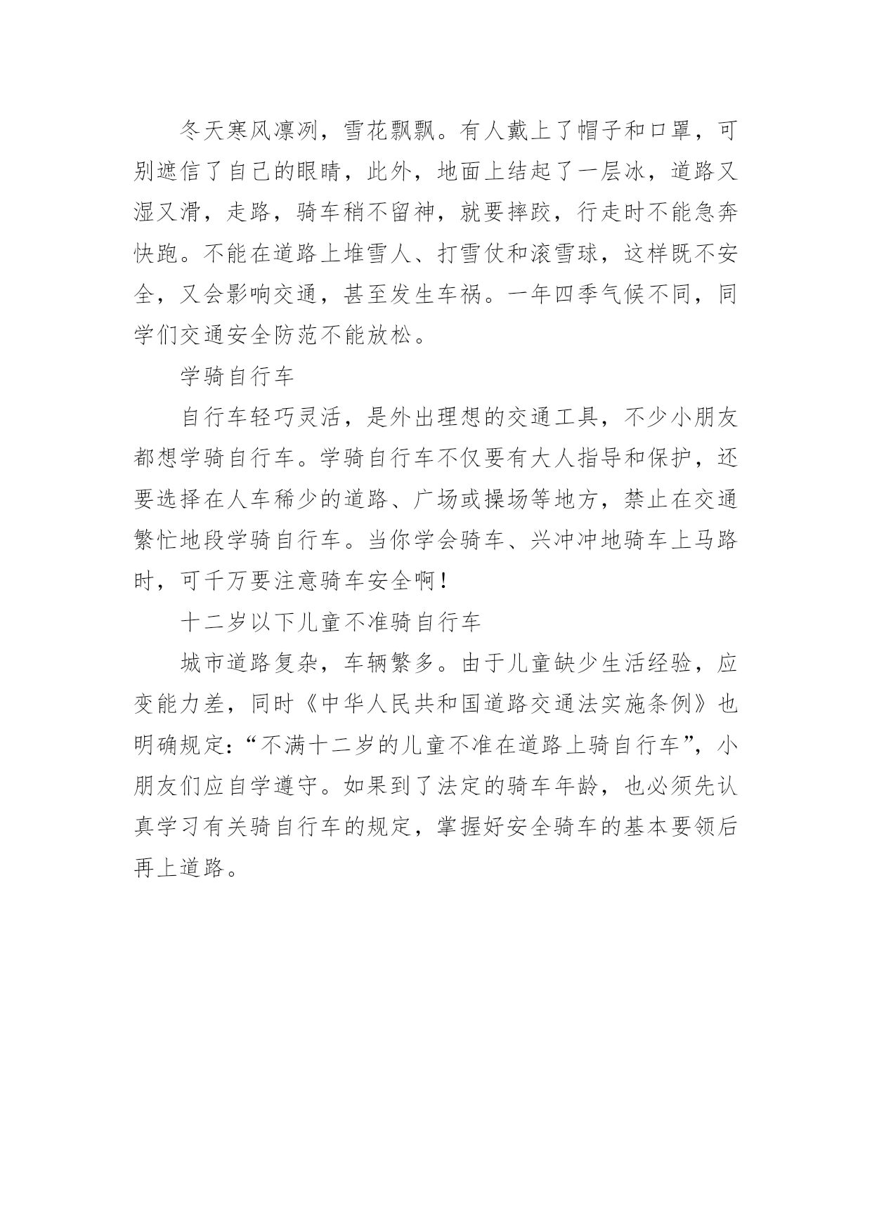 交通安全教育小报内容导语:交通安全是指人们在道路上进行活动、玩耍时,要按照交通法规的规定,安全地行车、走路,避免发生人身伤亡或财物损失。下面由小编为大家整理的交通安全教育小报内容,希望可以帮助到大家!交通安全教育小报内容大全交通信号灯在繁忙的十字路口,四面都悬挂着红、黄、绿、三色交通信号灯,它是不出声的“交通警”。红绿灯是国际统一交通信号灯。红灯是停止信号,绿灯是通行信号。交叉路口,几个方向来的车都汇集在这儿,有的要直行,有的要拐弯,到底让谁先走,这就是要听从红绿灯指挥。红灯亮,行或左转弯,在不碍行人和车辆情况下,允许车辆右转弯;绿灯亮,准许车辆直行或转弯;黄灯亮,停在路口停止线或人行横道线以内,已经继续通行;黄灯闪烁时,警告车辆注意安全。人车分流各行其道每当你走马路,就会看到许多行人的车辆来来往往,川流不息。如果行人和车辆爱怎么走就怎么走,那么就会交叉冲突,发生混。交通道路上用“交通标线”划出车辆、行人应走的规则:机动车走“机动车道”。在道路上,我们可以看到各式各样的交通标志。它们用图案、符号和文字来表达特定的意思。告诉驾驶员和行人注意附近环境情况。这些标志对于安全车非常重要,被称为“永不下岗的交通警”。警告标志“它是警告车辆、行人注意危险地段、减速慢行的标志。禁令标志:它是禁止或限制车辆、行人某种交通行为标志。指示标志:它是指示车辆、行人行进的标志。行人行进的标志。指路标志:它是传递道路方向、地点、距离信息标志。辅助标志:它是主标志下,对主标志起辅助说明的标志。我们应该熟悉并爱护这些标志,不能任意损坏或在上面乱涂乱画,并且自觉遵守这些标志的规定。安全走路走路,谁不会呢?其实不然。如果我们不注意交通安全,走路也闯祸。因此,我们上学读书、放学回家、节假日外出时,走在人来车往的交通繁忙的道路上,要遵守交通规则,增强自我保护意识。我们走路要走在人行道上。在没有人行道的地方,应靠道路右边行走。走路时,思想要集中,不要东张西望,不能一边走一边玩耍,不能一边走路一边看书,不能三五成群并排行走,不要乱马路,更不能追赶车辆嬉戏打闹。更不要在马路上踢球、溜冰、放风筝、做游戏。一旦被来往车辆撞倒,后果非常严重。汽车不是一刹就停的有的同学认为乱马路没啥关系,反正驾驶员会刹车的。其实,汽车不是一刹就停的。由于惯性作用,刹车后车还会向前滑行一段路,这就是力的惯性作用。就像人在奔跑中,突然停下来,还会不由自主地身前冲出几步一样。何况还有可能驾驶员不注意、刹车不灵等。所以,乱穿马路是十分危险的,不少交通事故就是因为行人乱马路造成的。血的教训应该引以为戒。不在车前车后急穿马路有人总是喜欢在汽车前、后急穿马路、这是很危险的。驾驶员眼睛看不到的地方,被称为“视线死角”。要是有人在车前车后驾驶员眼睛看不到的“视线死角”内急穿马路,就会造成车祸。所以我们横过马路前要注意左右来往车辆,先向左看,后向右看,当看清没有来车时才可横过马路。在有“人行横道”和“人行天桥”上行走,这样才比较安全。汽车的眼睛汽车前面的两只“大眼睛”叫“大光灯”。夜幕降临,司机打开“大光灯”就能照亮道路。在汽车大光灯下,有两只“小眼睛”,它同车尾两边的两只“小眼睛”相互连结,这不是用来指示方向“方向灯”。汽车尾部有两只“红色的眼睛”,叫刹车灯“。当驾驶员刹车时,这两只“红眼睛”立刻发亮,它告诉行驶在后面车辆,注意保持距离。此外,汽车尾部还有两只“白色的眼睛”,叫“倒车灯”,汽车倒车时会发出白色光线,有的还会发出“倒车,请注意:的叫声,我们也要及时避让。汽车的“内轮差”你知道汽车是怎样转弯的吗?汽车是依靠前轮来转向前的。随着前轮的转动,汽车车身也逐渐改变方向。但是前后两只轮子举走在同一条弧线上,而是有一定距离差别的,这个差距称“内轮差”。因此,我们碰到要转弯的汽车,不能靠得太近,不要以为汽车的前轮过去就没事了。因为有“内轮差”,如果离转弯的汽车太近,很可能被后轮撞倒压伤。注意避让转弯的车辆知道了汽车转弯时会发生“内轮差”,所以我们在通过马路时,除了注意来往直行车辆外,还要注意避让转弯行驶的车辆。当看到“方向灯”闪亮时,人离车辆远一些。千万不要以为让过了车头就没事了,人与车身靠得太近,就容易被车尾撞倒,发生伤亡事故。集体外出集体外出活动时,要在带领下好队伍,横列不易超过两人。行进时,就靠右侧走在人行道上。要自觉遵守纪律,不随便离队,不互相追逐嬉闹,不在交通拥挤的地方集队、停留,以免影响人、车通行。过马路时,应在人行横道上通过。在没有车辆行驶时,抓紧时间通过。如果队伍长、安全通过有困难,可请交警叔叔协助一下通过。让特种车辆先行在马路上,我们经常可以看到警灯闪亮、警报呼叫车辆,这些是警车、消防车、救护车或工程车抢险车等特各车辆。特种车辆担负着特殊紧急任务。交通法规规定;一切车辆和行人都必须让执行任务