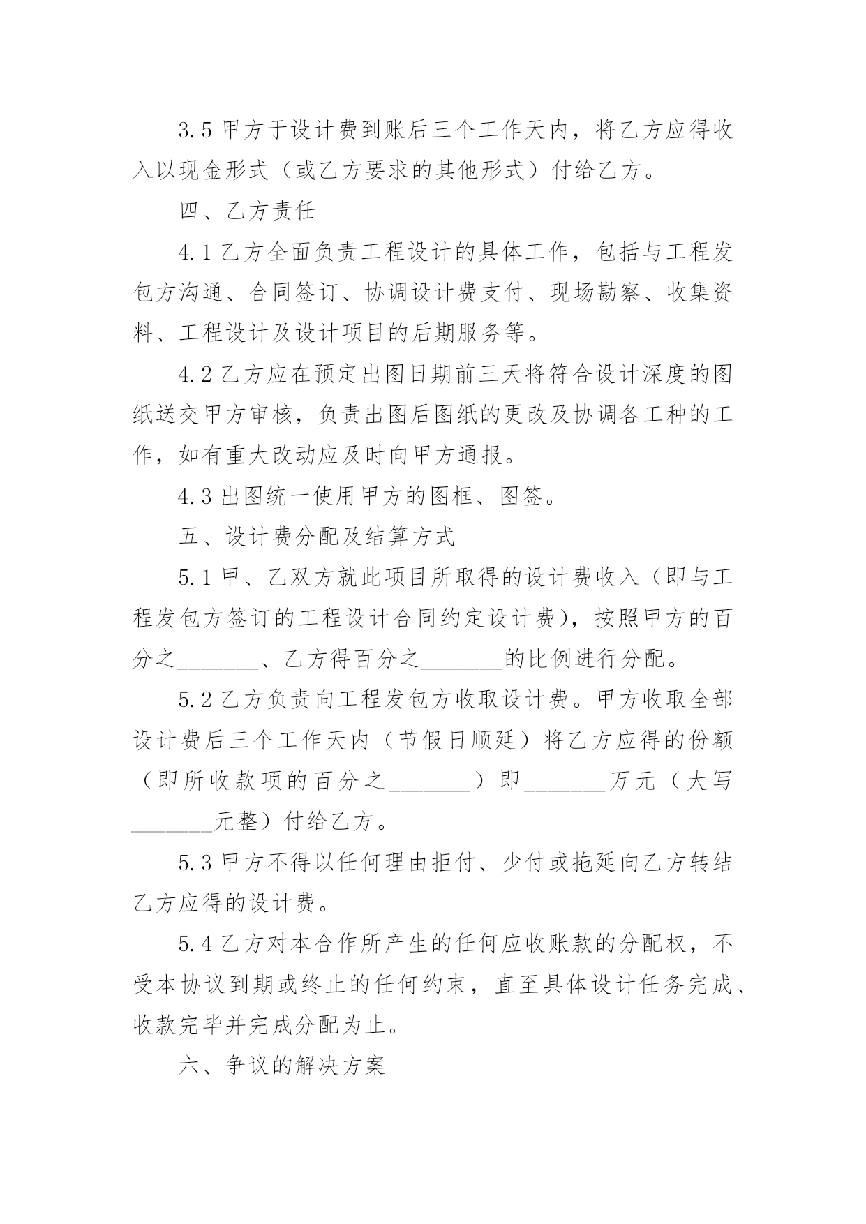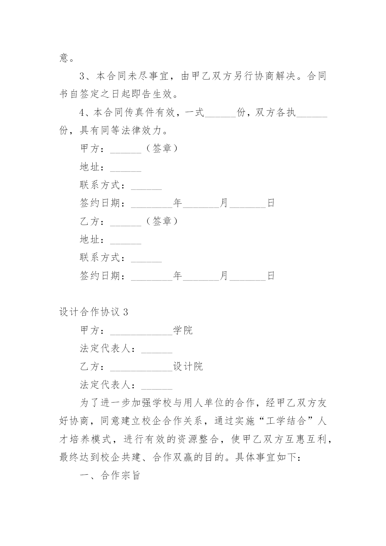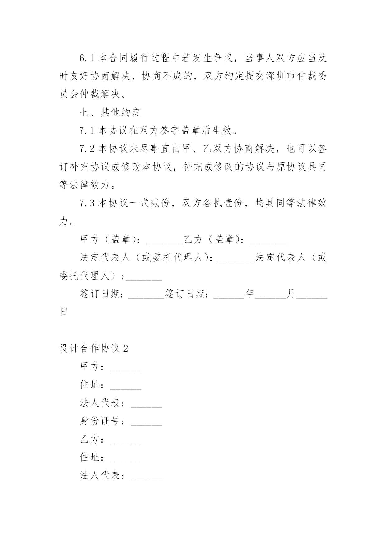 设计合作协议现如今,人们运用到协议的场合不断增多,协议具有法律效力,确立某种法律关系。那么协议的格式,你掌握了吗以下是小编收集整理的设计合作协议,仅供参考,大家一起来看看吧。设计合作协议1甲方:______乙方:______甲、乙双方经友好协商,本着友好合作、互惠互利的原则,就合作经营工程设计业务事宜,达成如下协议:一、业务管理1.1甲方授权乙方作为其全权代理,以甲方名义承接“”的设计工作。二、协议期限2.1协议有效期至本项目竣工验收。三、甲方责任3.1甲方负责在乙方设计完成的图纸上签审核名、审定名,并加盖出图章、注册章、消防章,于乙方送交图纸后三天内完成。3.2甲方保证为乙方提供上述工作的方便性及派出乙方缺少的专业人员协助其工作。3.3甲方负责开具发票。3.5甲方于设计费到账后三个工作天内,将乙方应得收入以现金形式(或乙方要求的其他形式)付给乙方。四、乙方责任4.1乙方全面负责工程设计的具体工作,包括与工程发包方沟通、合同签订、协调设计费支付、现场勘察、收集资料、工程设计及设计项目的后期服务等。4.2乙方应在预定出图日期前三天将符合设计深度的图纸送交甲方审核,负责出图后图纸的更改及协调各工种的工作,如有重大改动应及时向甲方通报。4.3出图统一使用甲方的图框、图签。五、设计费分配及结算方式5.1甲、乙双方就此项目所取得的设计费收入(即与工程发包方签订的工程设计合同约定设计费),按照甲方的百分之_______、乙方得百分之_______的比例进行分配。5.2乙方负责向工程发包方收取设计费。甲方收取全部设计费后三个工作天内(节假日顺延)将乙方应得的份额(即所收款项的百分之_______)即_______万元(大写_______元整)付给乙方。5.3甲方不得以任何理由拒付、少付或拖延向乙方转结乙方应得的设计费。5.4乙方对本合作所产生的任何应收账款的分配权,不受本协议到期或终止的任何约束,直至具体设计任务完成、收款完毕并完成分配为止。六、争议的解决方案6.1本合同履行过程中若发生争议,当事人双方应当及时友好协商解决,协商不成的,双方约定提交深圳市仲裁委员会仲裁解决。七、其他约定7.1本协议在双方签字盖章后生效。7.2本协议未尽事宜由甲、乙双方协商解决,也可以签订补充协议或修改本协议,补充或修改的协议与原协议具同等法律效力。7.3本协议一式贰份,双方各执壹份,均具同等法律效力。甲方(盖章):_______乙方(盖章):_______法定代表人(或委托代理人):_______法定代表人(或委托代理人):_______签订日期:_______签订日期:______年______月______日设计合作协议2甲方:______住址:______法人代表:______身份证号:______乙方:______住址:______法人代表:______身份证号:______双方本着诚信为本、互惠互利、公平交易的原则,就甲方委托乙方设计策划服务事宜达成如下协议:一、服务内容:1、设计项目:______________________。2、规格、要求:______________________。3、设计服务费用:______________________。4、备注:______________________。二、合同总费用:______________________。三、甲乙双方责任:1、甲方需提供明确的工作要求,同时及时向乙方提供相关的资料及咨询等;甲方需及时对乙方提的设计方案进行反馈;甲方须按合同规定向乙方支付有关费用。2、乙方需通过电子文件向甲方提供详细设计方案,供甲方指定人员审定;乙方需严格按甲方要求专业水准进行合同规定之工作;乙方需遵守甲方商业(资料)机密。3、乙方需向甲方提供至少______款的不同设计方案,供甲方确认,并在双方沟通基础上进行修改至完善;若因乙方水准或设计思路偏差所致,乙方提交设计稿无法为甲方所认可,乙方需再次向甲方提供设计方案。当前______次向甲方所提供的设计方案,在经乙方与甲方决策人积极沟通都不被甲方认可的情况下,甲方有权要求终止合同。在甲方向乙方承诺不使用、不传播乙方向甲方提供的所有的设计方案基础上,乙方需在______个工作日内将甲方所预付定金全额退返给甲方。4、为给予甲乙双方同等的约束力,如属于甲方对乙方设计提案未能给予具体的不满意意见,或甲方决策人不与乙方保持积极沟通,乙方在______次提案后也有权要求终止合同,甲方不得要求乙方退还所付定金,同时甲方也不得使用、传播乙方所有提案之设计作品。5、甲、乙双方诚信为本,协作完成上述工作内容时间要求为:___年___月___日前。四、付款方式:1、自甲乙双方签订合同之日起______日内,甲方向乙方预付合同总金额的______(比例)作为订金。2、本合同