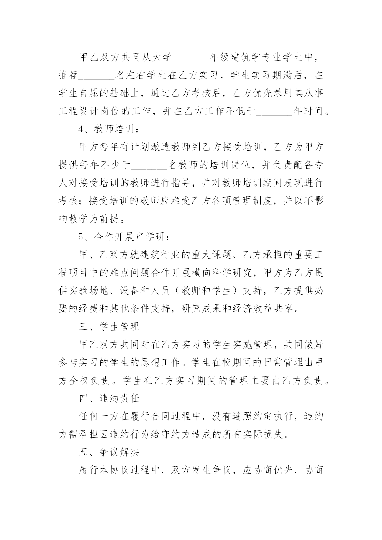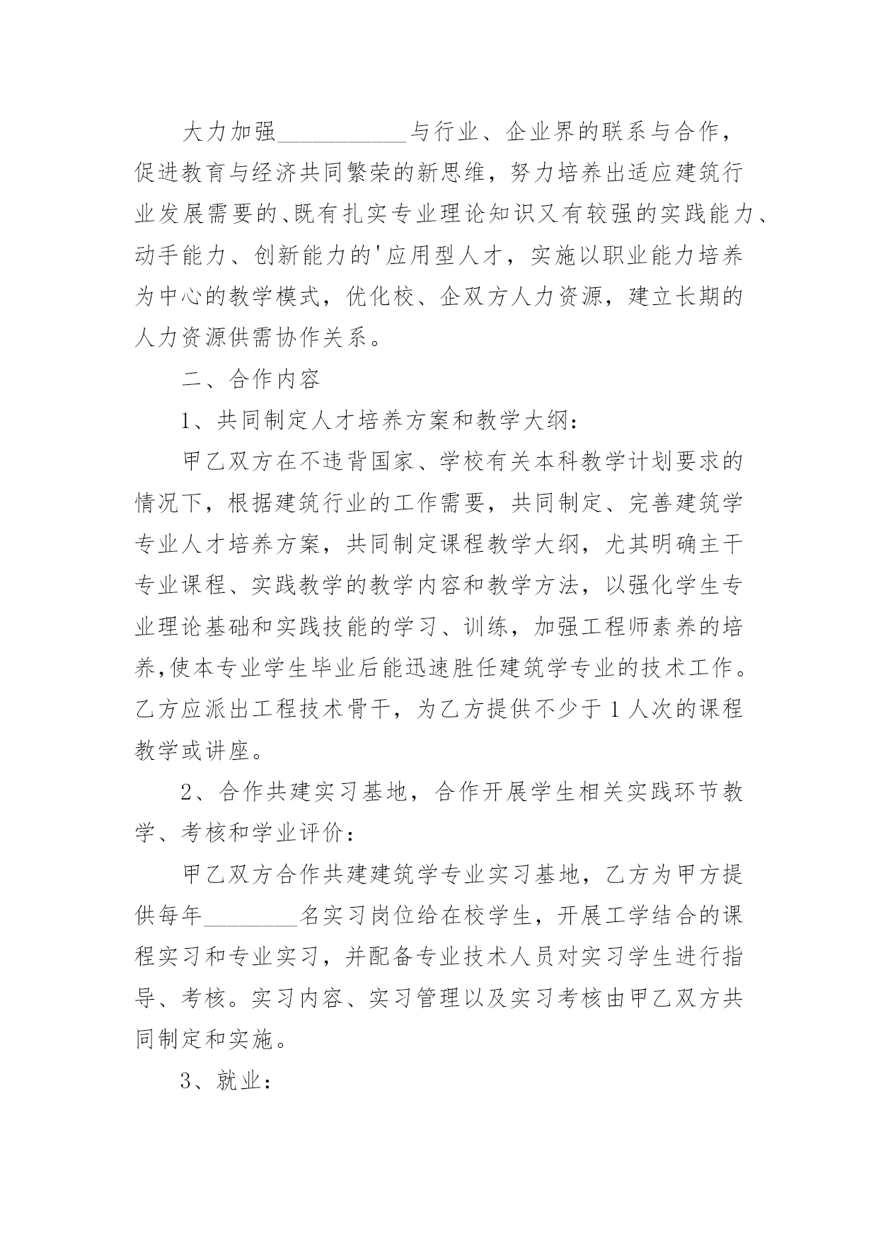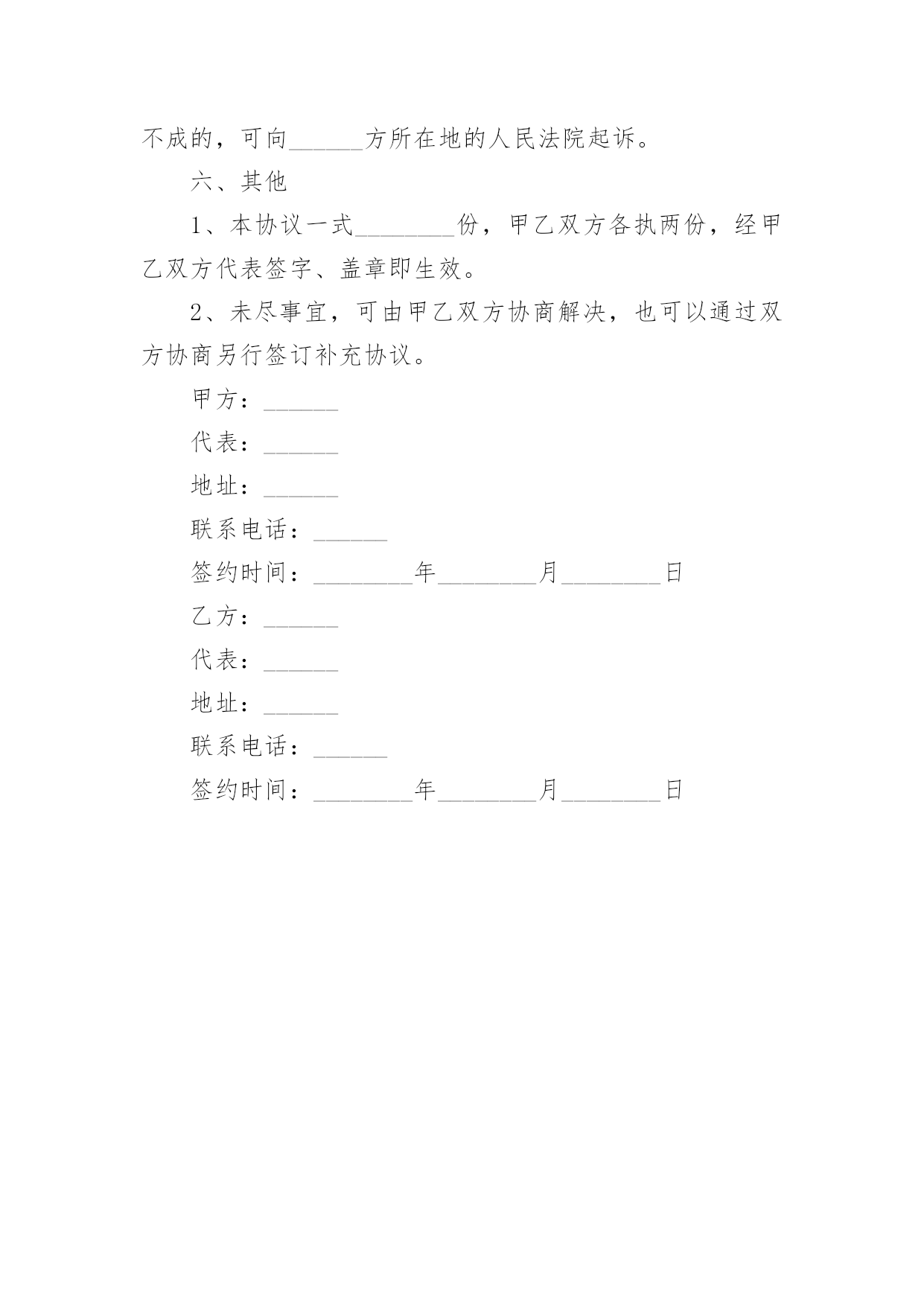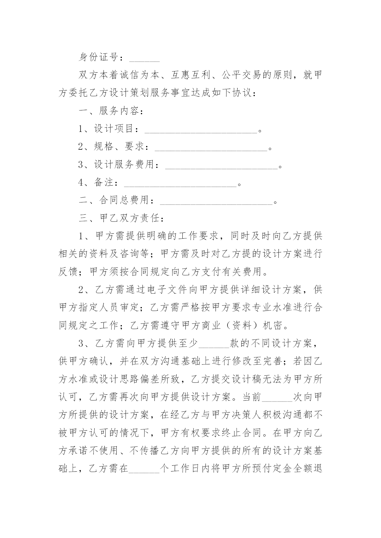 设计合作协议现如今,人们运用到协议的场合不断增多,协议具有法律效力,确立某种法律关系。那么协议的格式,你掌握了吗以下是小编收集整理的设计合作协议,仅供参考,大家一起来看看吧。设计合作协议1甲方:______乙方:______甲、乙双方经友好协商,本着友好合作、互惠互利的原则,就合作经营工程设计业务事宜,达成如下协议:一、业务管理1.1甲方授权乙方作为其全权代理,以甲方名义承接“”的设计工作。二、协议期限2.1协议有效期至本项目竣工验收。三、甲方责任3.1甲方负责在乙方设计完成的图纸上签审核名、审定名,并加盖出图章、注册章、消防章,于乙方送交图纸后三天内完成。3.2甲方保证为乙方提供上述工作的方便性及派出乙方缺少的专业人员协助其工作。3.3甲方负责开具发票。3.5甲方于设计费到账后三个工作天内,将乙方应得收入以现金形式(或乙方要求的其他形式)付给乙方。四、乙方责任4.1乙方全面负责工程设计的具体工作,包括与工程发包方沟通、合同签订、协调设计费支付、现场勘察、收集资料、工程设计及设计项目的后期服务等。4.2乙方应在预定出图日期前三天将符合设计深度的图纸送交甲方审核,负责出图后图纸的更改及协调各工种的工作,如有重大改动应及时向甲方通报。4.3出图统一使用甲方的图框、图签。五、设计费分配及结算方式5.1甲、乙双方就此项目所取得的设计费收入(即与工程发包方签订的工程设计合同约定设计费),按照甲方的百分之_______、乙方得百分之_______的比例进行分配。5.2乙方负责向工程发包方收取设计费。甲方收取全部设计费后三个工作天内(节假日顺延)将乙方应得的份额(即所收款项的百分之_______)即_______万元(大写_______元整)付给乙方。5.3甲方不得以任何理由拒付、少付或拖延向乙方转结乙方应得的设计费。5.4乙方对本合作所产生的任何应收账款的分配权,不受本协议到期或终止的任何约束,直至具体设计任务完成、收款完毕并完成分配为止。六、争议的解决方案6.1本合同履行过程中若发生争议,当事人双方应当及时友好协商解决,协商不成的,双方约定提交深圳市仲裁委员会仲裁解决。七、其他约定7.1本协议在双方签字盖章后生效。7.2本协议未尽事宜由甲、乙双方协商解决,也可以签订补充协议或修改本协议,补充或修改的协议与原协议具同等法律效力。7.3本协议一式贰份,双方各执壹份,均具同等法律效力。甲方(盖章):_______乙方(盖章):_______法定代表人(或委托代理人):_______法定代表人(或委托代理人):_______签订日期:_______签订日期:______年______月______日设计合作协议2甲方:______住址:______法人代表:______身份证号:______乙方:______住址:______法人代表:______身份证号:______双方本着诚信为本、互惠互利、公平交易的原则,就甲方委托乙方设计策划服务事宜达成如下协议:一、服务内容:1、设计项目:______________________。2、规格、要求:______________________。3、设计服务费用:______________________。4、备注:______________________。二、合同总费用:______________________。三、甲乙双方责任:1、甲方需提供明确的工作要求,同时及时向乙方提供相关的资料及咨询等;甲方需及时对乙方提的设计方案进行反馈;甲方须按合同规定向乙方支付有关费用。2、乙方需通过电子文件向甲方提供详细设计方案,供甲方指定人员审定;乙方需严格按甲方要求专业水准进行合同规定之工作;乙方需遵守甲方商业(资料)机密。3、乙方需向甲方提供至少______款的不同设计方案,供甲方确认,并在双方沟通基础上进行修改至完善;若因乙方水准或设计思路偏差所致,乙方提交设计稿无法为甲方所认可,乙方需再次向甲方提供设计方案。当前______次向甲方所提供的设计方案,在经乙方与甲方决策人积极沟通都不被甲方认可的情况下,甲方有权要求终止合同。在甲方向乙方承诺不使用、不传播乙方向甲方提供的所有的设计方案基础上,乙方需在______个工作日内将甲方所预付定金全额退返给甲方。4、为给予甲乙双方同等的约束力,如属于甲方对乙方设计提案未能给予具体的不满意意见,或甲方决策人不与乙方保持积极沟通,乙方在______次提案后也有权要求终止合同,甲方不得要求乙方退还所付定金,同时甲方也不得使用、传播乙方所有提案之设计作品。5、甲、乙双方诚信为本,协作完成上述工作内容时间要求为:___年___月___日前。四、付款方式:1、自甲乙双方签订合同之日起______日内,甲方向乙方预付合同总金额的______(比例)作为订金。2、本合同