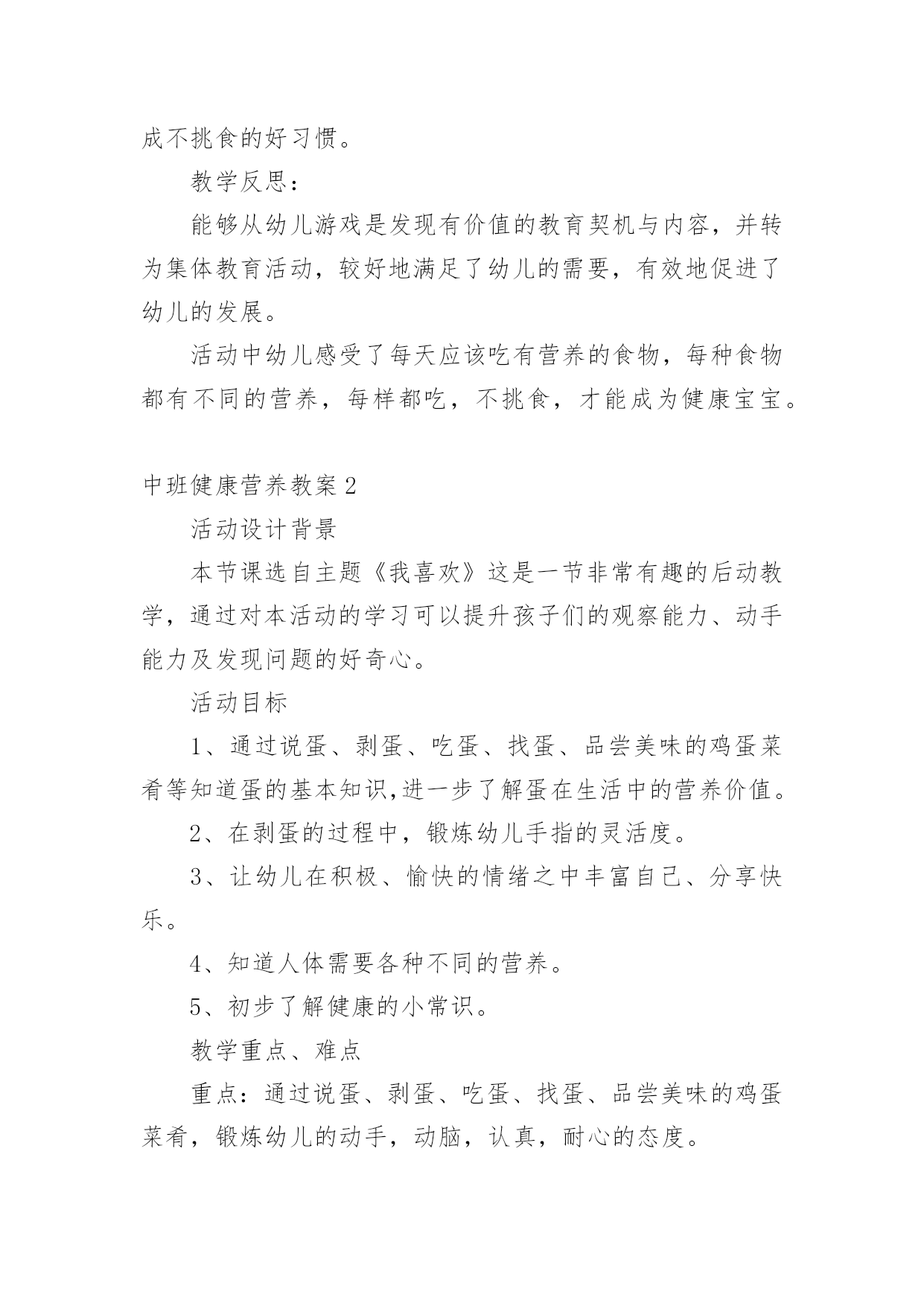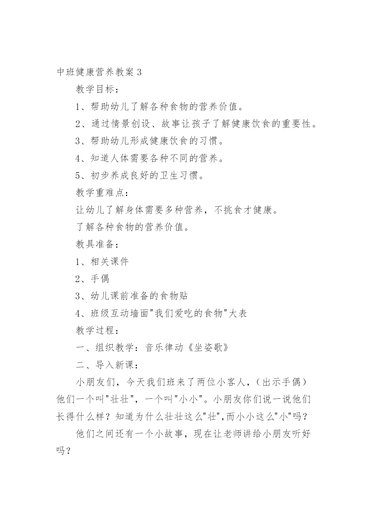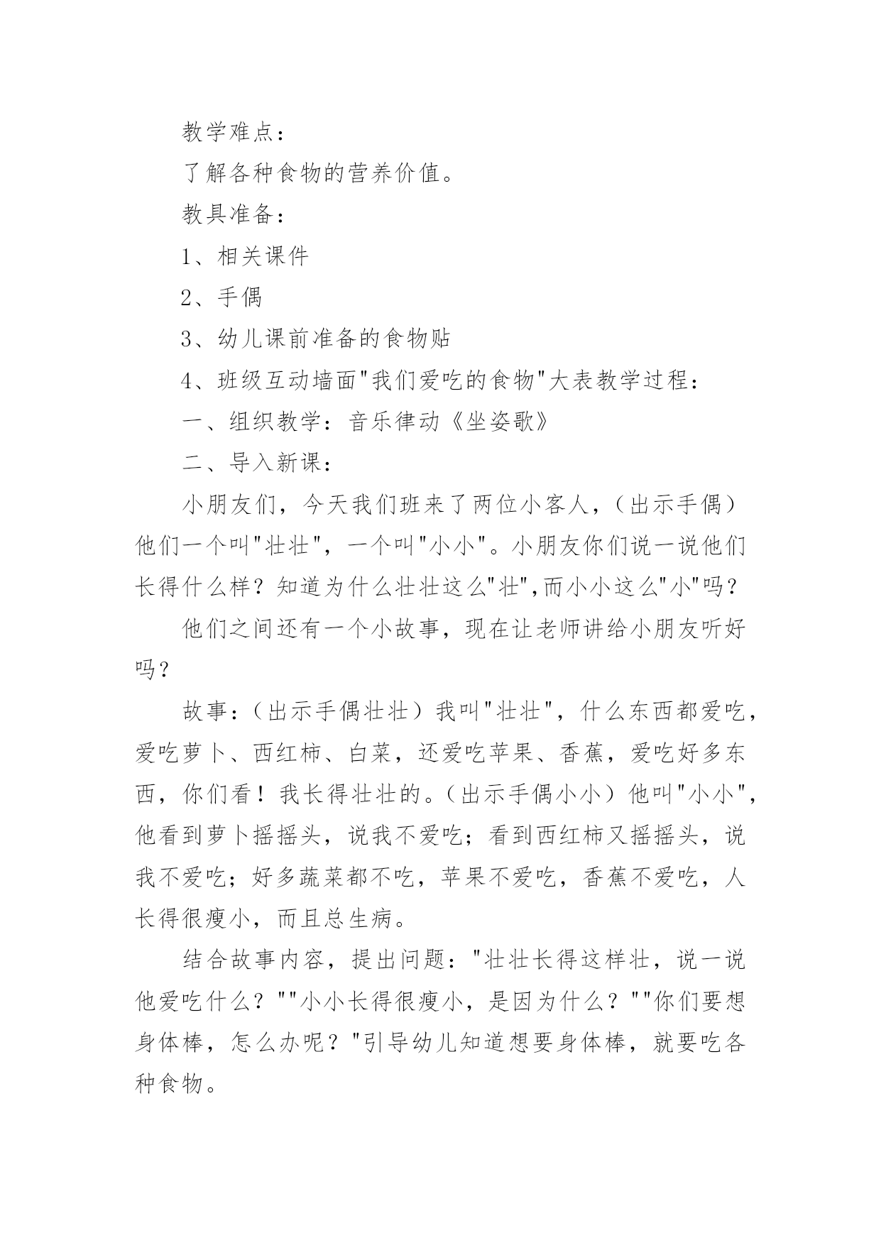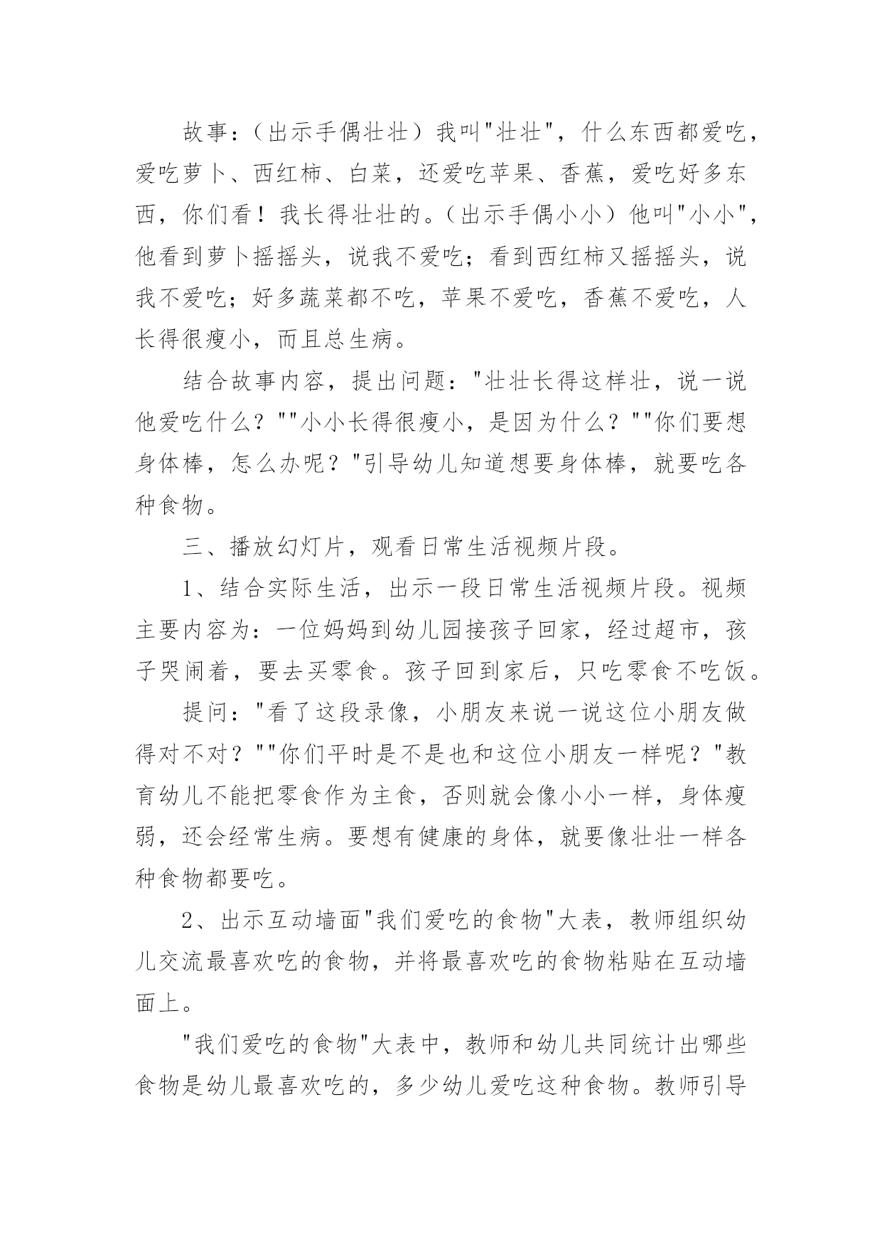 中班健康营养教案作为一名教学工作者,就难以避免地要准备教案,教案是保证教学取得成功、提高教学质量的基本条件。那么什么样的教案才是好的呢?以下是小编为大家整理的中班健康营养教案,仅供参考,大家一起来看看吧。中班健康营养教案1设计理念:现在大多数家庭都是独生子女家庭,许多家长都会溺爱孩子,孩子的各种要求都尽量满足。我发现许多家长经常给孩子买一大堆零食,这样孩子就吃零食多,吃饭少,长期下去,孩子容易形成偏食,挑食的不良习惯,最终导致孩子营养不均衡,生长发育受到影响。通过这节课要教育幼儿不要挑食,只有营养平衡才能健康成长。教学目标:1、知识与技能:帮助幼儿了解各种食物的营养价值。2、过程与方法:通过情景创设、故事让孩子了解健康饮食的重要性。3、情感态度价值观:帮助幼儿形成健康饮食的习惯。4、愿意交流,清楚明白地表达自己的想法。5、能大胆、清楚地表达自己的见解,体验成功的快乐。教学重点:让幼儿了解身体需要多种营养,不挑食才健康。教学难点:了解各种食物的营养价值。教具准备:1、相关课件2、手偶3、幼儿课前准备的食物贴4、班级互动墙面"我们爱吃的食物"大表教学过程:一、组织教学:音乐律动《坐姿歌》二、导入新课:小朋友们,今天我们班来了两位小客人,(出示手偶)他们一个叫"壮壮",一个叫"小小"。小朋友你们说一说他们长得什么样?知道为什么壮壮这么"壮",而小小这么"小"吗?他们之间还有一个小故事,现在让老师讲给小朋友听好吗?故事:(出示手偶壮壮)我叫"壮壮",什么东西都爱吃,爱吃萝卜、西红柿、白菜,还爱吃苹果、香蕉,爱吃好多东西,你们看!我长得壮壮的。(出示手偶小小)他叫"小小",他看到萝卜摇摇头,说我不爱吃;看到西红柿又摇摇头,说我不爱吃;好多蔬菜都不吃,苹果不爱吃,香蕉不爱吃,人长得很瘦小,而且总生病。结合故事内容,提出问题:"壮壮长得这样壮,说一说他爱吃什么?""小小长得很瘦小,是因为什么?""你们要想身体棒,怎么办呢?"引导幼儿知道想要身体棒,就要吃各种食物。三、播放幻灯片,观看日常生活视频片段。1、结合实际生活,出示一段日常生活视频片段。视频主要内容为:一位妈妈到幼儿园接孩子回家,经过超市,孩子哭闹着,要去买零食。孩子回到家后,只吃零食不吃饭。提问:"看了这段录像,小朋友来说一说这位小朋友做得对不对?""你们平时是不是也和这位小朋友一样呢?"教育幼儿不能把零食作为主食,否则就会像小小一样,身体瘦弱,还会经常生病。要想有健康的身体,就要像壮壮一样各种食物都要吃。2、出示互动墙面"我们爱吃的食物"大表,教师组织幼儿交流最喜欢吃的食物,并将最喜欢吃的食物粘贴在互动墙面上。"我们爱吃的食物"大表中,教师和幼儿共同统计出哪些食物是幼儿最喜欢吃的,多少幼儿爱吃这种食物。教师引导幼儿讨论:"爱吃的东西能不能吃很多?""哪些东西要少吃?"3、老师向幼儿介绍各种食物的营养成分。(蔬菜和水果中含有大量的维生素,含有从其他食物中补充不到的营养成分。并且有预防和治疗疾病的功效。)总结:不同的食物有不同的营养成分,吃不同的食物就能获得不同的营养,有了丰富的`营养,身体才能更加健康。四、延伸活动家园配合:1、让家长记录幼儿饮食情况,反馈给老师。2、根据记录情况,开展"不挑食的好孩子"颁奖会,可以邀请家长参加,鼓励挑食的孩子做到各种食物都要吃,养成不挑食的好习惯。教学反思:能够从幼儿游戏是发现有价值的教育契机与内容,并转为集体教育活动,较好地满足了幼儿的需要,有效地促进了幼儿的发展。活动中幼儿感受了每天应该吃有营养的食物,每种食物都有不同的营养,每样都吃,不挑食,才能成为健康宝宝。中班健康营养教案2活动设计背景本节课选自主题《我喜欢》这是一节非常有趣的后动教学,通过对本活动的学习可以提升孩子们的观察能力、动手能力及发现问题的好奇心。活动目标1、通过说蛋、剥蛋、吃蛋、找蛋、品尝美味的鸡蛋菜肴等知道蛋的基本知识,进一步了解蛋在生活中的营养价值。2、在剥蛋的过程中,锻炼幼儿手指的灵活度。3、让幼儿在积极、愉快的情绪之中丰富自己、分享快乐。4、知道人体需要各种不同的营养。5、初步了解健康的小常识。教学重点、难点重点:通过说蛋、剥蛋、吃蛋、找蛋、品尝美味的鸡蛋菜肴,锻炼幼儿的动手,动脑,认真,耐心的态度。难点:让幼儿知道鸡蛋的基本知识,更进一步了解蛋在生活中的营养价值。活动准备生、熟鸡蛋、各种餐具、美味的鸡蛋菜肴、课件等。活动过程:(一)说蛋1、今天王老师带来了什么?——教师出示鸡蛋2、你们都知道是鸡蛋,那你们知道的鸡蛋里面是怎么样的?——根据幼儿的回答,教师出示生鸡蛋图片。3、那鸡蛋里面是不是和小朋友说的一样的呢,我们一起来看一下。(二)吃蛋1、让幼儿通过动手剥蛋了解蛋的结构(蛋壳、蛋清、蛋黄)2、通过吃蛋让幼儿知道鸡蛋的吃法(煮、炒、煎、蒸等)3、提问:小朋友平时喜