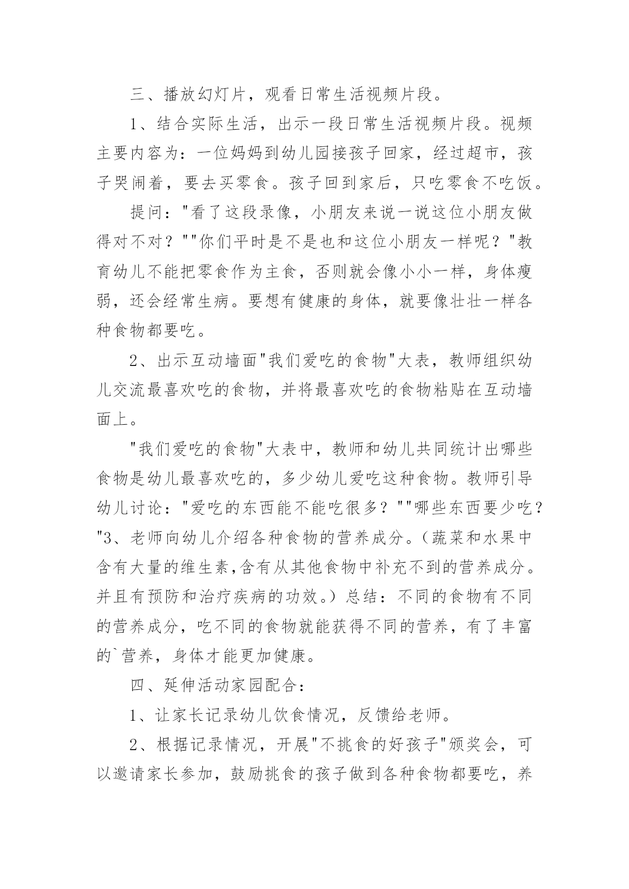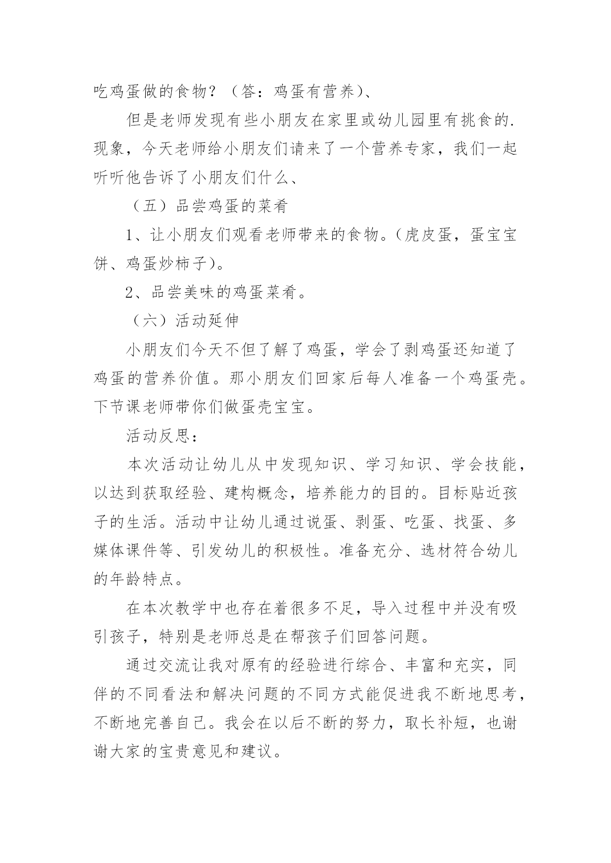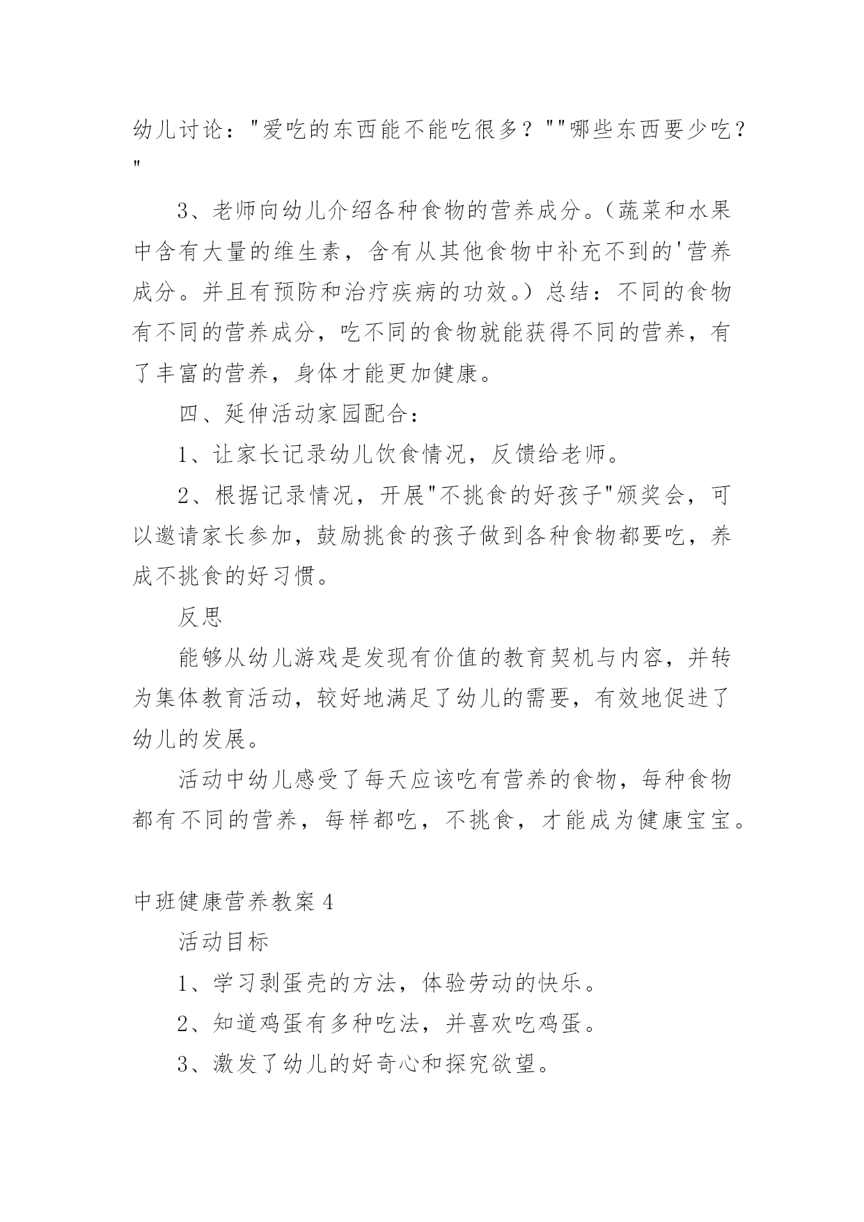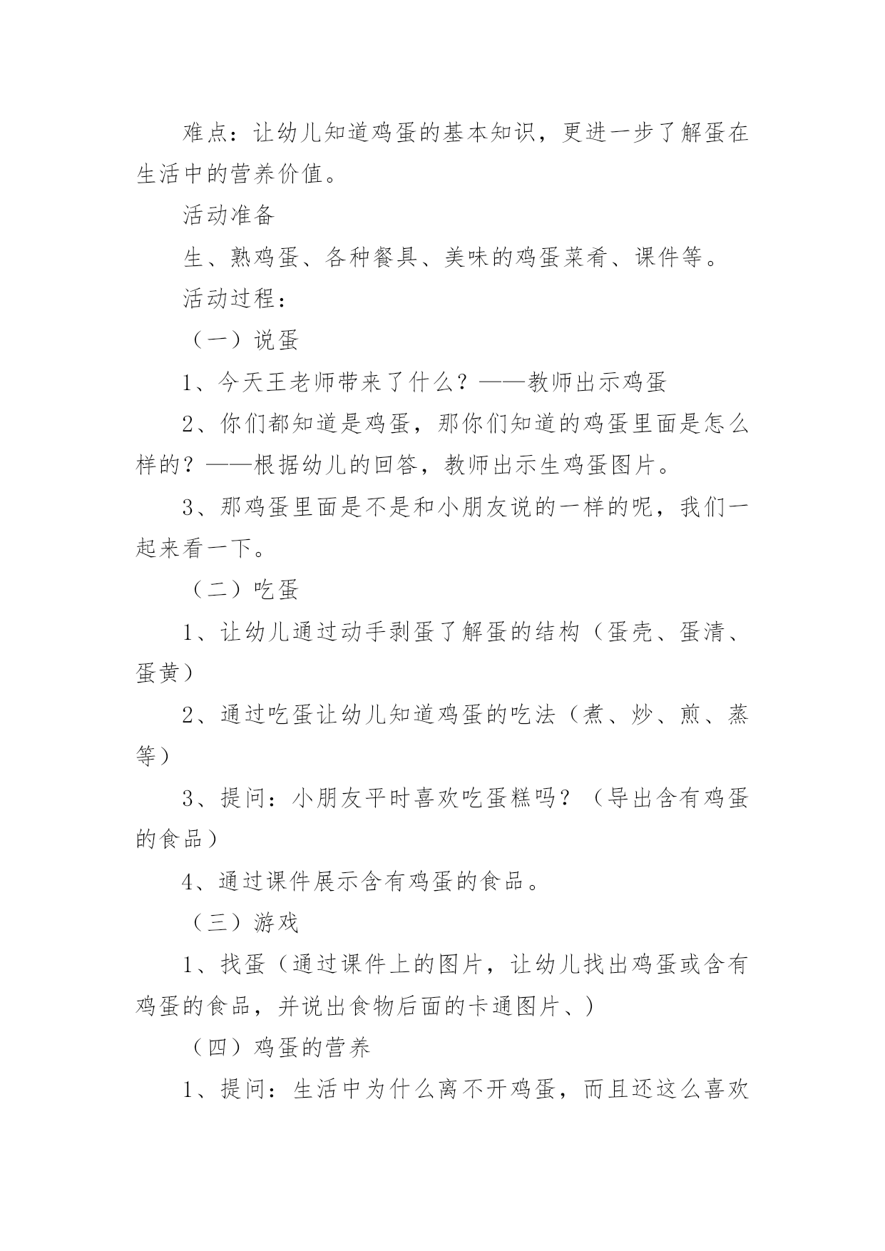 中班健康营养教案作为一名教学工作者,就难以避免地要准备教案,教案是保证教学取得成功、提高教学质量的基本条件。那么什么样的教案才是好的呢?以下是小编为大家整理的中班健康营养教案,仅供参考,大家一起来看看吧。中班健康营养教案1设计理念:现在大多数家庭都是独生子女家庭,许多家长都会溺爱孩子,孩子的各种要求都尽量满足。我发现许多家长经常给孩子买一大堆零食,这样孩子就吃零食多,吃饭少,长期下去,孩子容易形成偏食,挑食的不良习惯,最终导致孩子营养不均衡,生长发育受到影响。通过这节课要教育幼儿不要挑食,只有营养平衡才能健康成长。教学目标:1、知识与技能:帮助幼儿了解各种食物的营养价值。2、过程与方法:通过情景创设、故事让孩子了解健康饮食的重要性。3、情感态度价值观:帮助幼儿形成健康饮食的习惯。4、愿意交流,清楚明白地表达自己的想法。5、能大胆、清楚地表达自己的见解,体验成功的快乐。教学重点:让幼儿了解身体需要多种营养,不挑食才健康。教学难点:了解各种食物的营养价值。教具准备:1、相关课件2、手偶3、幼儿课前准备的食物贴4、班级互动墙面"我们爱吃的食物"大表教学过程:一、组织教学:音乐律动《坐姿歌》二、导入新课:小朋友们,今天我们班来了两位小客人,(出示手偶)他们一个叫"壮壮",一个叫"小小"。小朋友你们说一说他们长得什么样?知道为什么壮壮这么"壮",而小小这么"小"吗?他们之间还有一个小故事,现在让老师讲给小朋友听好吗?故事:(出示手偶壮壮)我叫"壮壮",什么东西都爱吃,爱吃萝卜、西红柿、白菜,还爱吃苹果、香蕉,爱吃好多东西,你们看!我长得壮壮的。(出示手偶小小)他叫"小小",他看到萝卜摇摇头,说我不爱吃;看到西红柿又摇摇头,说我不爱吃;好多蔬菜都不吃,苹果不爱吃,香蕉不爱吃,人长得很瘦小,而且总生病。结合故事内容,提出问题:"壮壮长得这样壮,说一说他爱吃什么?""小小长得很瘦小,是因为什么?""你们要想身体棒,怎么办呢?"引导幼儿知道想要身体棒,就要吃各种食物。三、播放幻灯片,观看日常生活视频片段。1、结合实际生活,出示一段日常生活视频片段。视频主要内容为:一位妈妈到幼儿园接孩子回家,经过超市,孩子哭闹着,要去买零食。孩子回到家后,只吃零食不吃饭。提问:"看了这段录像,小朋友来说一说这位小朋友做得对不对?""你们平时是不是也和这位小朋友一样呢?"教育幼儿不能把零食作为主食,否则就会像小小一样,身体瘦弱,还会经常生病。要想有健康的身体,就要像壮壮一样各种食物都要吃。2、出示互动墙面"我们爱吃的食物"大表,教师组织幼儿交流最喜欢吃的食物,并将最喜欢吃的食物粘贴在互动墙面上。"我们爱吃的食物"大表中,教师和幼儿共同统计出哪些食物是幼儿最喜欢吃的,多少幼儿爱吃这种食物。教师引导幼儿讨论:"爱吃的东西能不能吃很多?""哪些东西要少吃?"3、老师向幼儿介绍各种食物的营养成分。(蔬菜和水果中含有大量的维生素,含有从其他食物中补充不到的营养成分。并且有预防和治疗疾病的功效。)总结:不同的食物有不同的营养成分,吃不同的食物就能获得不同的营养,有了丰富的`营养,身体才能更加健康。四、延伸活动家园配合:1、让家长记录幼儿饮食情况,反馈给老师。2、根据记录情况,开展"不挑食的好孩子"颁奖会,可以邀请家长参加,鼓励挑食的孩子做到各种食物都要吃,养成不挑食的好习惯。教学反思:能够从幼儿游戏是发现有价值的教育契机与内容,并转为集体教育活动,较好地满足了幼儿的需要,有效地促进了幼儿的发展。活动中幼儿感受了每天应该吃有营养的食物,每种食物都有不同的营养,每样都吃,不挑食,才能成为健康宝宝。中班健康营养教案2活动设计背景本节课选自主题《我喜欢》这是一节非常有趣的后动教学,通过对本活动的学习可以提升孩子们的观察能力、动手能力及发现问题的好奇心。活动目标1、通过说蛋、剥蛋、吃蛋、找蛋、品尝美味的鸡蛋菜肴等知道蛋的基本知识,进一步了解蛋在生活中的营养价值。2、在剥蛋的过程中,锻炼幼儿手指的灵活度。3、让幼儿在积极、愉快的情绪之中丰富自己、分享快乐。4、知道人体需要各种不同的营养。5、初步了解健康的小常识。教学重点、难点重点:通过说蛋、剥蛋、吃蛋、找蛋、品尝美味的鸡蛋菜肴,锻炼幼儿的动手,动脑,认真,耐心的态度。难点:让幼儿知道鸡蛋的基本知识,更进一步了解蛋在生活中的营养价值。活动准备生、熟鸡蛋、各种餐具、美味的鸡蛋菜肴、课件等。活动过程:(一)说蛋1、今天王老师带来了什么?——教师出示鸡蛋2、你们都知道是鸡蛋,那你们知道的鸡蛋里面是怎么样的?——根据幼儿的回答,教师出示生鸡蛋图片。3、那鸡蛋里面是不是和小朋友说的一样的呢,我们一起来看一下。(二)吃蛋1、让幼儿通过动手剥蛋了解蛋的结构(蛋壳、蛋清、蛋黄)2、通过吃蛋让幼儿知道鸡蛋的吃法(煮、炒、煎、蒸等)3、提问:小朋友平时喜