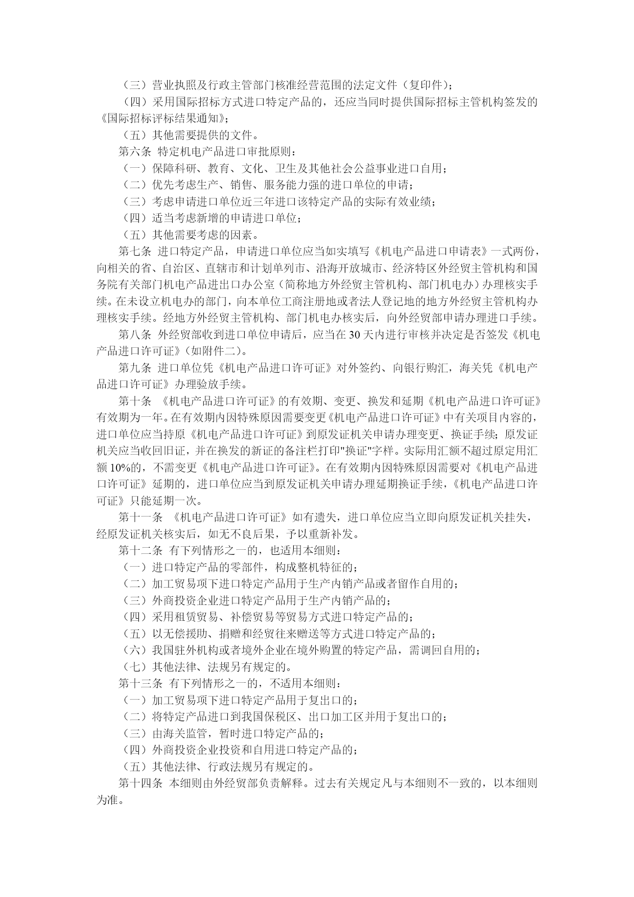 对外贸易经济合作部、海关总署二00一年第24号令根据《中华人民共和国对外贸易法》、《中华人民共和国货物进出口管理条例》和《机电产品进口管理办法》,现公布《特定机电产品进口管理实施细则》,自2002年1月1日起施行。2002年1月1日以前对外贸易经济合作部签发的《机电产品进口证明》在有效期内继续有效,但不再延期,逾期失效。对外贸易经济合作部部长石广生海关总署署长牟新生二○○一年十二月二十日特定机电产品进口管理实施细则第一条为规范特定机电产品进口管理,依据《中华人民共和国货物进出口管理条例》和《机电产品进口管理办法》,制定本细则。第二条本细则适用于进口单位将特定机电产品进口到中华人民共和国关境内的行为。第三条中华人民共和国对外贸易经济合作部(简称为外经贸部)负责会同海关总署制定、调整和公布特定机电产品目录并组织实施。第四条申请进口特定机电产品的资格与条件:(一)申请进口单位应当在近三年内没有逃汇、套汇、骗取出口退税、走私等违法、违规行为;(二)申请进口单位应当具有所申请特定产品的经营权;(三)申请进口单位应当具有与所申请特定产品相适应的生产、销售、维修、服务和配件供应能力;(四)申请进口单位应当具有良好的财务状况;(五)申请自用的可不具备本条(二)、(三)、(四)项规定的资格与条件,但是应当提交合理的申请理由和适当的申请数量。第五条申请进口特定机电产品应当提供如下文件:(一)申请进口特定机电产品的报告;(二)《机电产品进口申请表》(如附件一);(三)营业执照及行政主管部门核准经营范围的法定文件(复印件);(四)采用国际招标方式进口特定产品的,还应当同时提供国际招标主管机构签发的《国际招标评标结果通知》;(五)其他需要提供的文件。第六条特定机电产品进口审批原则:(一)保障科研、教育、文化、卫生及其他社会公益事业进口自用;(二)优先考虑生产、销售、服务能力强的进口单位的申请;(三)考虑申请进口单位近三年进口该特定产品的实际有效业绩;(四)适当考虑新增的申请进口单位;(五)其他需要考虑的因素。第七条进口特定产品,申请进口单位应当如实填写《机电产品进口申请表》一式两份,向相关的省、自治区、直辖市和计划单列市、沿海开放城市、经济特区外经贸主管机构和国务院有关部门机电产品进出口办公室(简称地方外经贸主管机构、部门机电办)办理核实手续。在未设立机电办的部门,向本单位工商注册地或者法人登记地的地方外经贸主管机构办理核实手续。经地方外经贸主管机构、部门机电办核实后,向外经贸部申请办理进口手续。第八条外经贸部收到进口单位申请后,应当在30天内进行审核并决定是否签发《机电产品进口许可证》(如附件二)。第九条进口单位凭《机电产品进口许可证》对外签约、向银行购汇,海关凭《机电产品进口许可证》办理验放手续。第十条《机电产品进口许可证》的有效期、变更、换发和延期《机电产品进口许可证》有效期为一年。在有效期内因特殊原因需要变更《机电产品进口许可证》中有关项目内容的,进口单位应当持原《机电产品进口许可证》到原发证机关申请办理变更、换证手续;原发证机关应当收回旧证,并在换发的新证的备注栏打印"换证"字样。实际用汇额不超过原定用汇额10%的,不需变更《机电产品进口许可证》。在有效期内因特殊原因需要对《机电产品进口许可证》延期的,进口单位应当到原发证机关申请办理延期换证手续,《机电产品进口许可证》只能延期一次。第十一条《机电产品进口许可证》如有遗失,进口单位应当立即向原发证机关挂失,经原发证机关核实后,如无不良后果,予以重新补发。第十二条有下列情形之一的,也适用本细则:(一)进口特定产品的零部件,构成整机特征的;(二)加工贸易项下进口特定产品用于生产内销产品或者留作自用的;(三)外商投资企业进口特定产品用于生产内销产品的;(四)采用租赁贸易、补偿贸易等贸易方式进口特定产品的;(五)以无偿援助、捐赠和经贸往来赠送等方式进口特定产品的;(六)我国驻外机构或者境外企业在境外购置的特定产品,需调回自用的;(七)其他法律、法规另有规定的。第十三条有下列情形之一的,不适用本细则:(一)加工贸易项下进口特定产品用于复出口的;(二)将特定产品进口到我国保税区、出口加工区并用于复出口的;(三)由海关监管,暂时进口特定产品的;(四)外商投资企业投资和自用进口特定产品的;(五)其他法律、行政法规另有规定的。第十四条本细则由外经贸部负责解释。过去有关规定凡与本细则不一致的,以本细则为准。第十五条本细则自二○○二年一月一日起施行。