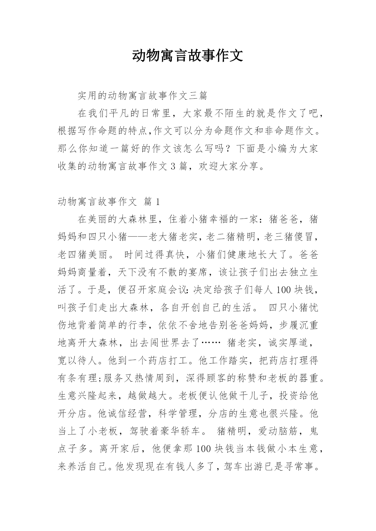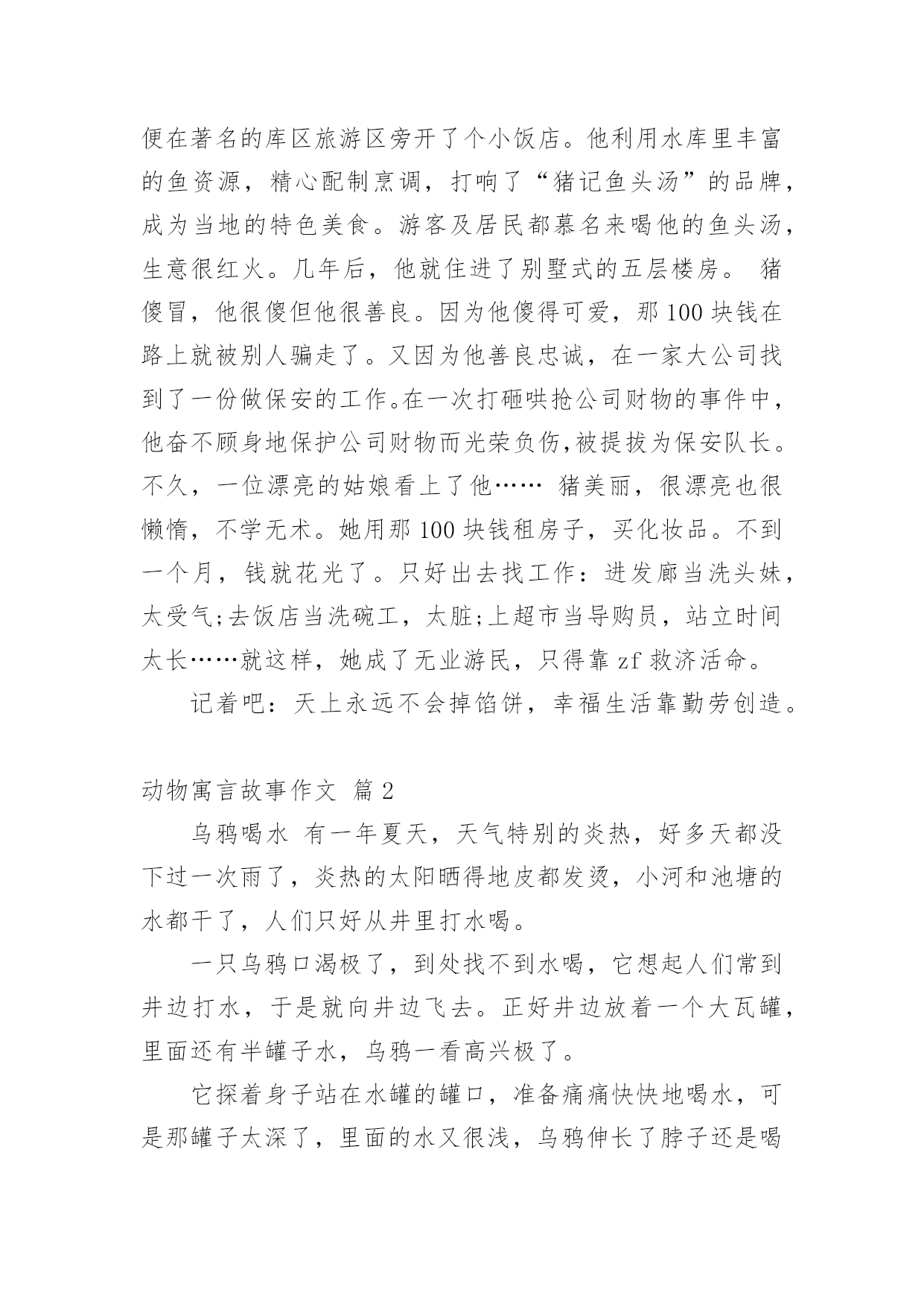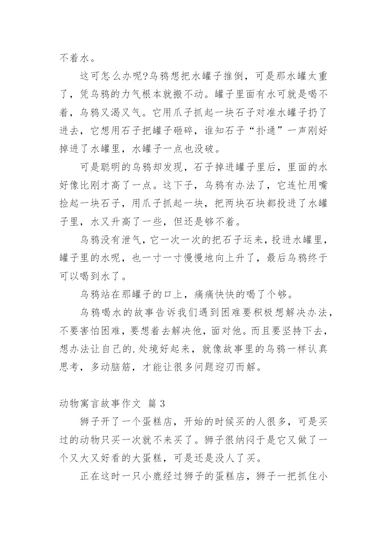 动物寓言故事作文实用的动物寓言故事作文三篇在我们平凡的日常里,大家最不陌生的就是作文了吧,根据写作命题的特点,作文可以分为命题作文和非命题作文。那么你知道一篇好的作文该怎么写吗?下面是小编为大家收集的动物寓言故事作文3篇,欢迎大家分享。动物寓言故事作文篇1在美丽的大森林里,住着小猪幸福的一家:猪爸爸,猪妈妈和四只小猪——老大猪老实,老二猪精明,老三猪傻冒,老四猪美丽。时间过得真快,小猪们健康地长大了。爸爸妈妈商量着,天下没有不散的宴席,该让孩子们出去独立生活了。于是,便召开家庭会议:决定给孩子们每人100块钱,叫孩子们走出大森林,各自开创自己的生活。四只小猪忧伤地背着简单的行李,依依不舍地告别爸爸妈妈,步履沉重地离开大森林,出去闯世界去了……猪老实,诚实厚道,宽以待人。他到一个药店打工。他工作踏实,把药店打理得有条有理;服务又热情周到,深得顾客的称赞和老板的器重。生意兴隆起来,越做越大。老板便认他做干儿子,投资给他开分店。他诚信经营,科学管理,分店的生意也很兴隆。他当上了小老板,驾驶着豪华轿车。猪精明,爱动脑筋,鬼点子多。离开家后,他便拿那100块钱当本钱做小本生意,来养活自己。他发现现在有钱人多了,驾车出游已是寻常事。便在著名的库区旅游区旁开了个小饭店。他利用水库里丰富的鱼资源,精心配制烹调,打响了“猪记鱼头汤”的品牌,成为当地的特色美食。游客及居民都慕名来喝他的鱼头汤,生意很红火。几年后,他就住进了别墅式的五层楼房。猪傻冒,他很傻但他很善良。因为他傻得可爱,那100块钱在路上就被别人骗走了。又因为他善良忠诚,在一家大公司找到了一份做保安的工作。在一次打砸哄抢公司财物的事件中,他奋不顾身地保护公司财物而光荣负伤,被提拔为保安队长。不久,一位漂亮的姑娘看上了他……猪美丽,很漂亮也很懒惰,不学无术。她用那100块钱租房子,买化妆品。不到一个月,钱就花光了。只好出去找工作:进发廊当洗头妹,太受气;去饭店当洗碗工,太脏;上超市当导购员,站立时间太长……就这样,她成了无业游民,只得靠zf救济活命。记着吧:天上永远不会掉馅饼,幸福生活靠勤劳创造。动物寓言故事作文篇2乌鸦喝水有一年夏天,天气特别的炎热,好多天都没下过一次雨了,炎热的太阳晒得地皮都发烫,小河和池塘的水都干了,人们只好从井里打水喝。一只乌鸦口渴极了,到处找不到水喝,它想起人们常到井边打水,于是就向井边飞去。正好井边放着一个大瓦罐,里面还有半罐子水,乌鸦一看高兴极了。它探着身子站在水罐的罐口,准备痛痛快快地喝水,可是那罐子太深了,里面的水又很浅,乌鸦伸长了脖子还是喝不着水。这可怎么办呢?乌鸦想把水罐子推倒,可是那水罐太重了,凭乌鸦的力气根本就搬不动。罐子里面有水可就是喝不着,乌鸦又渴又气。它用爪子抓起一块石子对准水罐子扔了进去,它想用石子把罐子砸碎,谁知石子“扑通”一声刚好掉进了水罐里,水罐子一点也没破。可是聪明的乌鸦却发现,石子掉进罐子里后,里面的水好像比刚才高了一点。这下子,乌鸦有办法了,它连忙用嘴捡起一块石子,用爪子抓起一块,把两块石块都投进了水罐子里,水又升高了一些,但还是够不着。乌鸦没有泄气,它一次一次的把石子运来,投进水罐里,罐子里的水呢,也一寸一寸慢慢地向上升了,最后乌鸦终于可以喝到水了。乌鸦站在那罐子的口上,痛痛快快的喝了个够。乌鸦喝水的故事告诉我们遇到困难要积极想解决办法,不要害怕困难,要想着去解决他,面对他。而且要坚持下去,想办法让自己的.处境好起来,就像故事里的乌鸦一样认真思考,多动脑筋,才能让很多问题迎刃而解。动物寓言故事作文篇3狮子开了一个蛋糕店,开始的时候买的人很多,可是买过的动物只买一次就不来买了。狮子很纳闷于是它又做了一个又大又好看的大蛋糕,可是还是没人了买。正在这时一只小鹿经过狮子的蛋糕店,狮子一把抓住小鹿问:“你们为什么不来买我的蛋糕?”小鹿说:“因为你做的蛋糕不好吃。”狮子不相信小鹿的话拿了一块蛋糕自己吃了一口,说:“挺好吃的呀!”小鹿问:“你不觉得咸吗?”狮子说:“不咸呀!”这时大象来了,大象对狮子说:“我知道你的蛋糕为什么卖不掉,。”“为什么”狮子问,“因为你是按照自己的口味去做的不适合别人的口味,所以大家不来买你的蛋糕”,大象说。听了大象的话狮子才明白自己喜欢的口味别人不一定喜欢。我从中也学习到了一点道理。