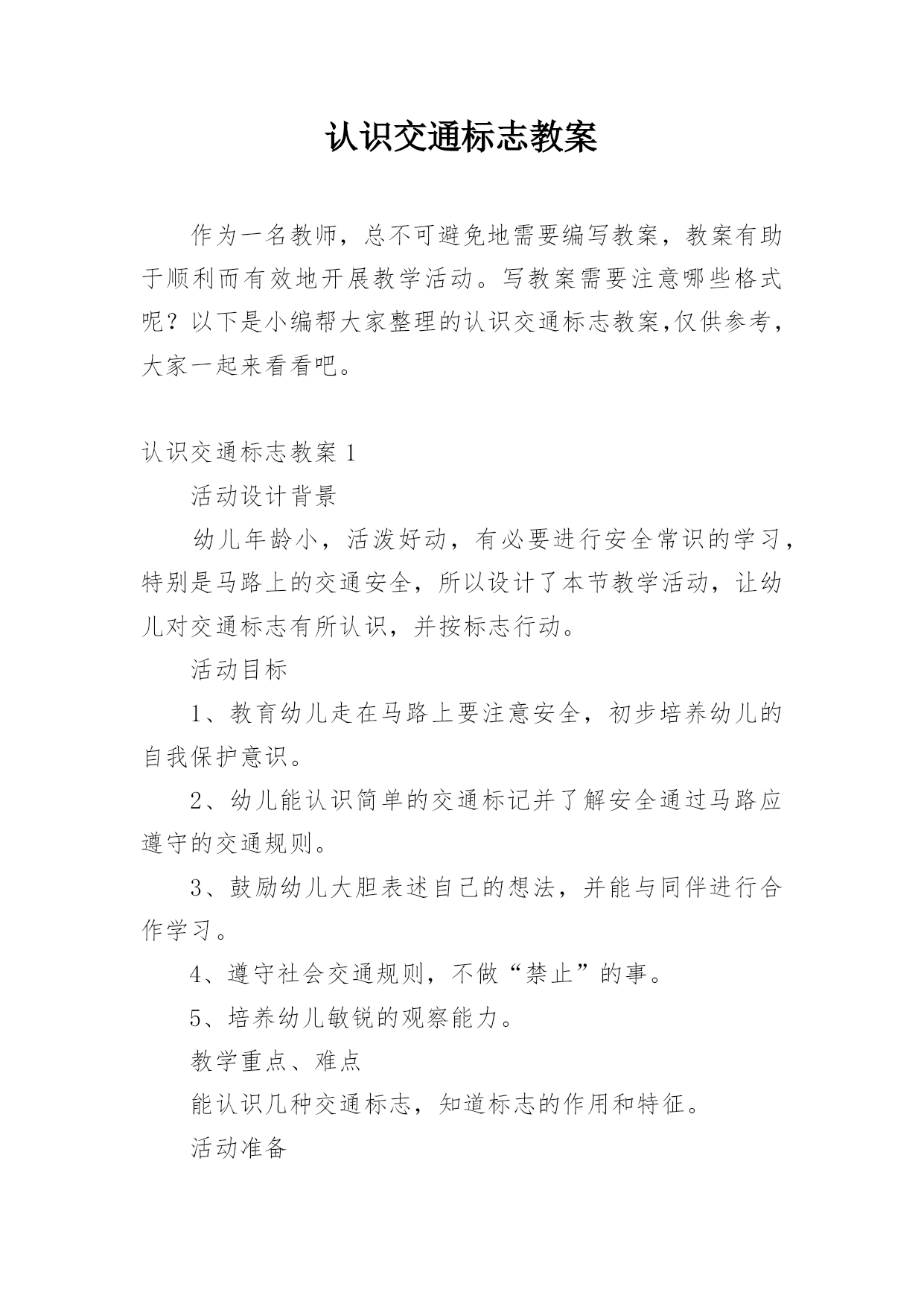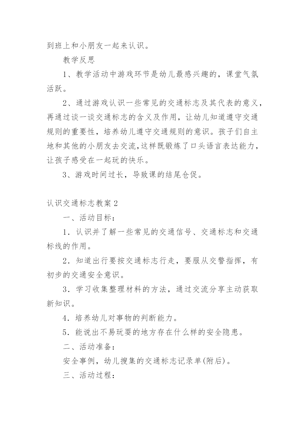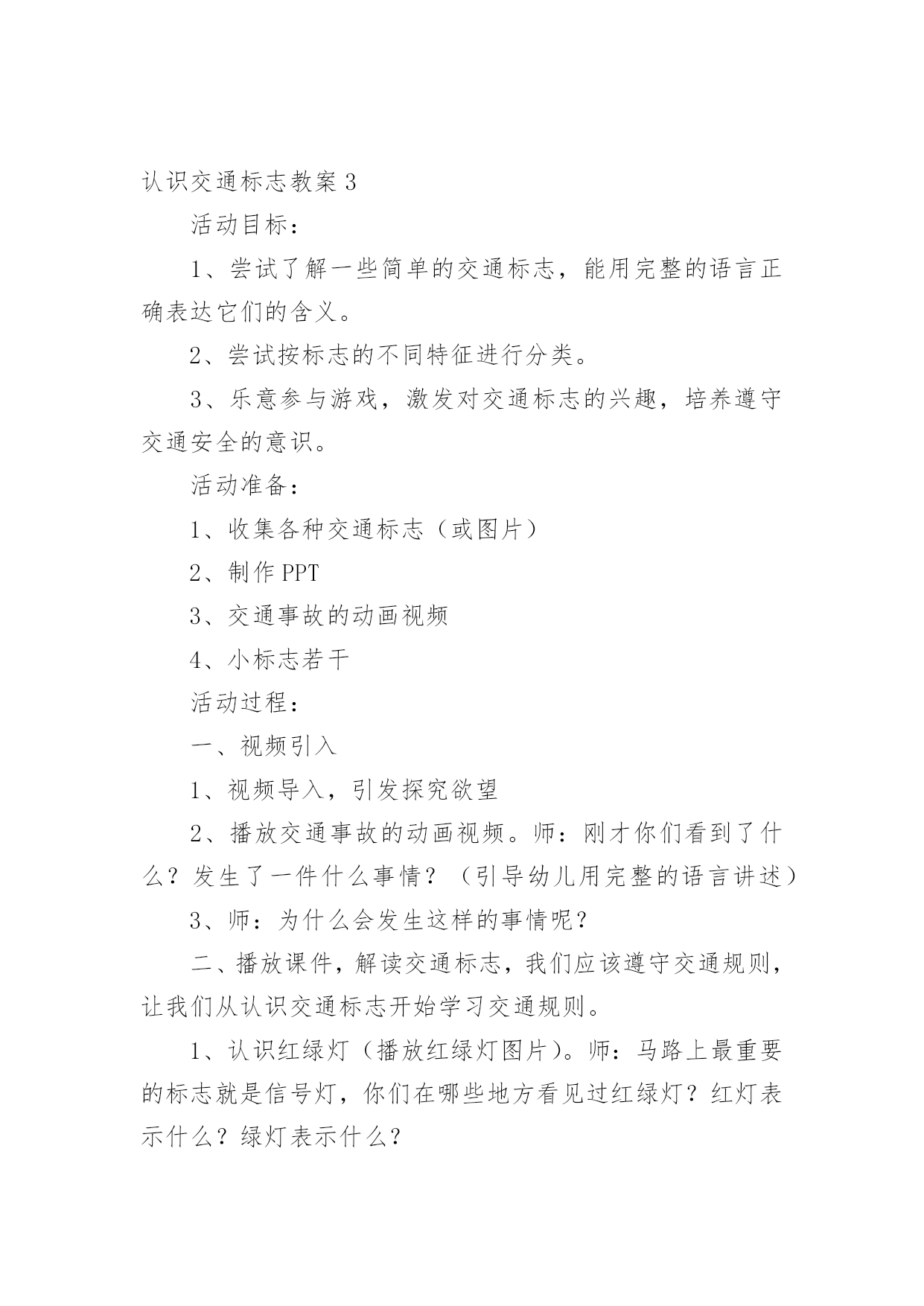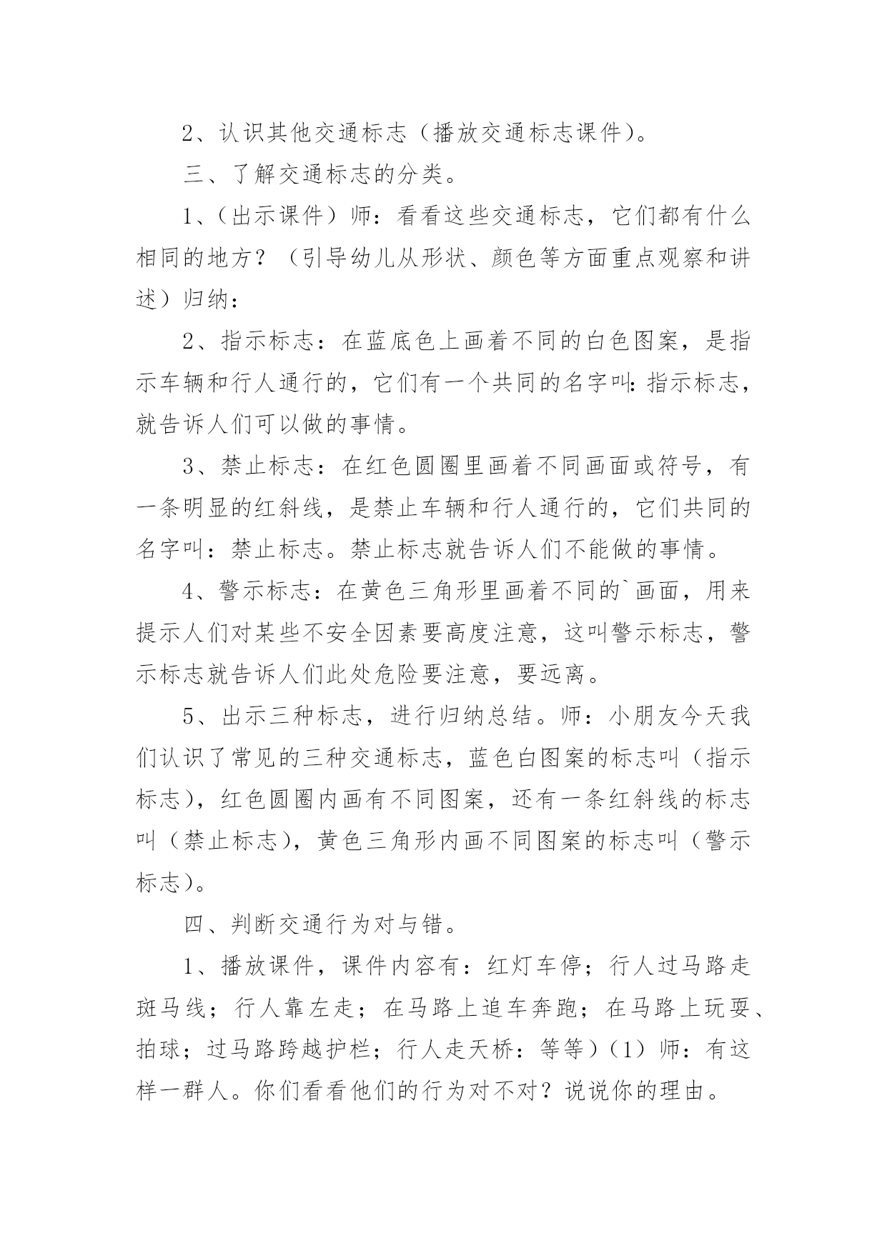 认识交通标志教案作为一名教师,总不可避免地需要编写教案,教案有助于顺利而有效地开展教学活动。写教案需要注意哪些格式呢?以下是小编帮大家整理的认识交通标志教案,仅供参考,大家一起来看看吧。认识交通标志教案1活动设计背景幼儿年龄小,活泼好动,有必要进行安全常识的学习,特别是马路上的交通安全,所以设计了本节教学活动,让幼儿对交通标志有所认识,并按标志行动。活动目标1、教育幼儿走在马路上要注意安全,初步培养幼儿的自我保护意识。2、幼儿能认识简单的交通标记并了解安全通过马路应遵守的交通规则。3、鼓励幼儿大胆表述自己的想法,并能与同伴进行合作学习。4、遵守社会交通规则,不做“禁止”的事。5、培养幼儿敏锐的观察能力。教学重点、难点能认识几种交通标志,知道标志的作用和特征。活动准备交通标志图若干,音乐光碟、挂图活动过程一、开始部分:课前律动。1、老师带领幼儿伴随音乐玩开小汽车的游戏。2、中途会出现斑马线、红绿灯等标志引出课题。二、基本部分:认识一些常见的交通标志及重要性。1、逐一出示刚才游戏中看到的斑马线、红绿灯标志、人行横道、地下通道、步行街等标志,引导幼儿说出其名称及作用。A、提问:如何过马路?安全过马路有什么好处?培养幼儿的自我保护意识。2、结合幼儿实际,用互动谈话的形式请幼儿说说自己都见过那些交通标志,它们都告诉我们什么?三、找朋友1、每名幼儿身前贴一张标志图,看看自己身上的标志图与黑板上的相同就站在一起。2、音乐伴奏《找朋友》。3、让找到好朋友的各组队员说说自己身上的标志图名称,还有我们平时应该怎样遵守交通规则。四、课的`总结和延伸1、今天老师和小朋友一起认识了一些交通标志,懂得了它的作用,牢记安全第一,我们要做一个遵守交通规则的好孩子。2、如果有谁发现了其它的标志,可以用笔画下来,回到班上和小朋友一起来认识。教学反思1、教学活动中游戏环节是幼儿最感兴趣的,课堂气氛活跃。2、通过游戏认识一些常见的交通标志及其代表的意义,再通过谈一谈交通标志的含义及作用,让幼儿知道遵守交通规则的重要性,培养幼儿遵守交通规则的意识。孩子们自主地和其他的小朋友去交流,这样既锻炼了口头语言表达能力,让孩子感受在一起玩的快乐。3、游戏时间过长,导致课的结尾仓促。认识交通标志教案2一、活动目标:1.认识并了解一些常见的交通信号、交通标志和交通标线的作用。2.知道出行要按交通标志行走,要服从交警指挥,有初步的交通安全意识。3.学习收集整理材料的方法,通过交流分享主动获取新知识。4.培养幼儿对事物的判断能力。5.能说出不易玩耍的地方存在什么样的安全隐患。二、活动准备:安全事例,幼儿搜集的交通标志记录单(附后)。三、活动过程:一、讲述交通事故案例导入:教师讲述交通事故你觉得为什么会发生车祸的呢?(幼儿交流讨论可能发生车祸的原因。)师:发生车祸太可怕了。为了不让这样的事情再发生,交通管理部门设计了很多交通信号和交通标志,提醒大家要注意交通安全。二、认识常见的交通标志和信号1.分组交流2.集体分享。师:请每组推荐一个代表来介绍你们小组的交流成果。3.认识标志。三、了解简单的'交通指挥手势活动反思:近期对于幼儿的安全问题放在了幼儿园工作的首位,我园一直重视幼儿的安全教育,我们每星期都会给幼儿上交通安全课,还利用走廊把交通安全知识用儿歌贴出来。在外操场画了模拟交通安全图,平时让幼儿去走一走。《纲要》中所说:“既符合幼儿的现实需要,又利于其长远发展,既贴近幼儿的生活,选择感兴趣的事物或问题,又助于拓展幼儿的经验和视野。因此,次活动来源于社会生活,又能服务于幼儿的生活。交通安全要从幼儿抓起,本活动幼儿还是比较感兴趣的,但在游戏中有的幼儿不遵守游戏规则,今后还要多加强练习。认识交通标志教案3活动目标:1、尝试了解一些简单的交通标志,能用完整的语言正确表达它们的含义。2、尝试按标志的不同特征进行分类。3、乐意参与游戏,激发对交通标志的兴趣,培养遵守交通安全的意识。活动准备:1、收集各种交通标志(或图片)2、制作PPT3、交通事故的动画视频4、小标志若干活动过程:一、视频引入1、视频导入,引发探究欲望2、播放交通事故的动画视频。师:刚才你们看到了什么?发生了一件什么事情?(引导幼儿用完整的语言讲述)3、师:为什么会发生这样的事情呢?二、播放课件,解读交通标志,我们应该遵守交通规则,让我们从认识交通标志开始学习交通规则。1、认识红绿灯(播放红绿灯图片)。师:马路上最重要的标志就是信号灯,你们在哪些地方看见过红绿灯?红灯表示什么?绿灯表示什么?2、认识其他交通标志(播放交通标志课件)。三、了解交通标志的分类。1、(出示课件)师:看看这些交通标志,它们都有什么相同的地方?(引导幼儿从形状、颜色等方面重点观察和讲述)归纳:2、指示标志:在蓝底色上画着不同的白色图案,是指示车辆和行人通行的
