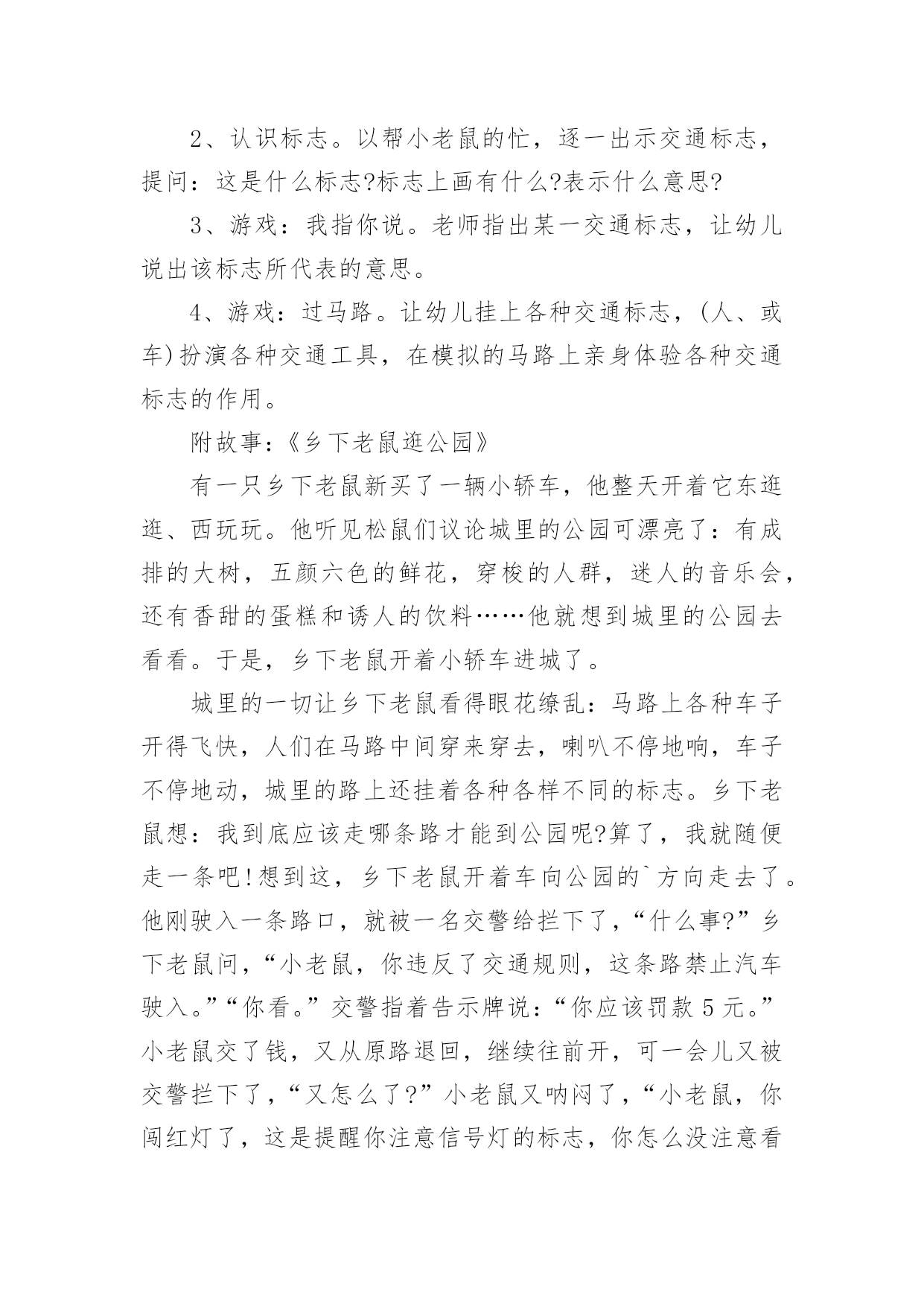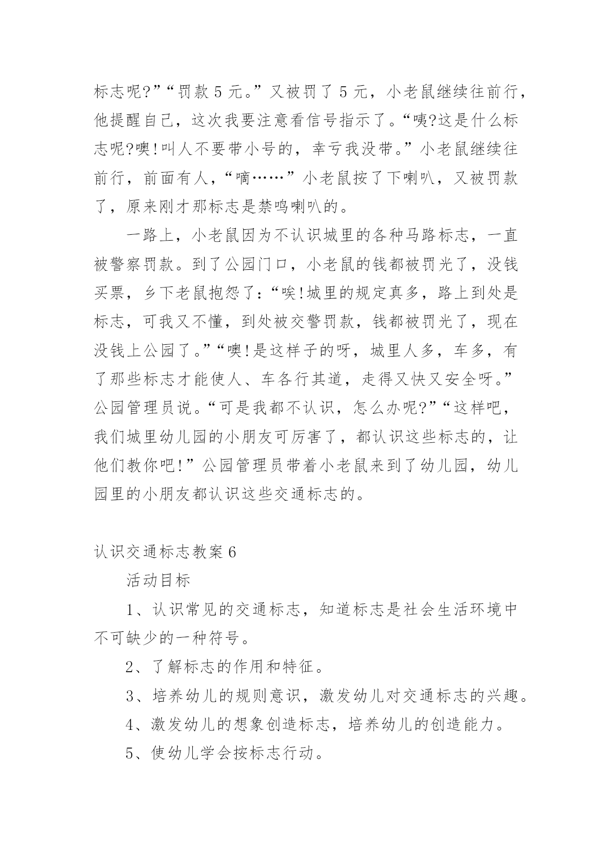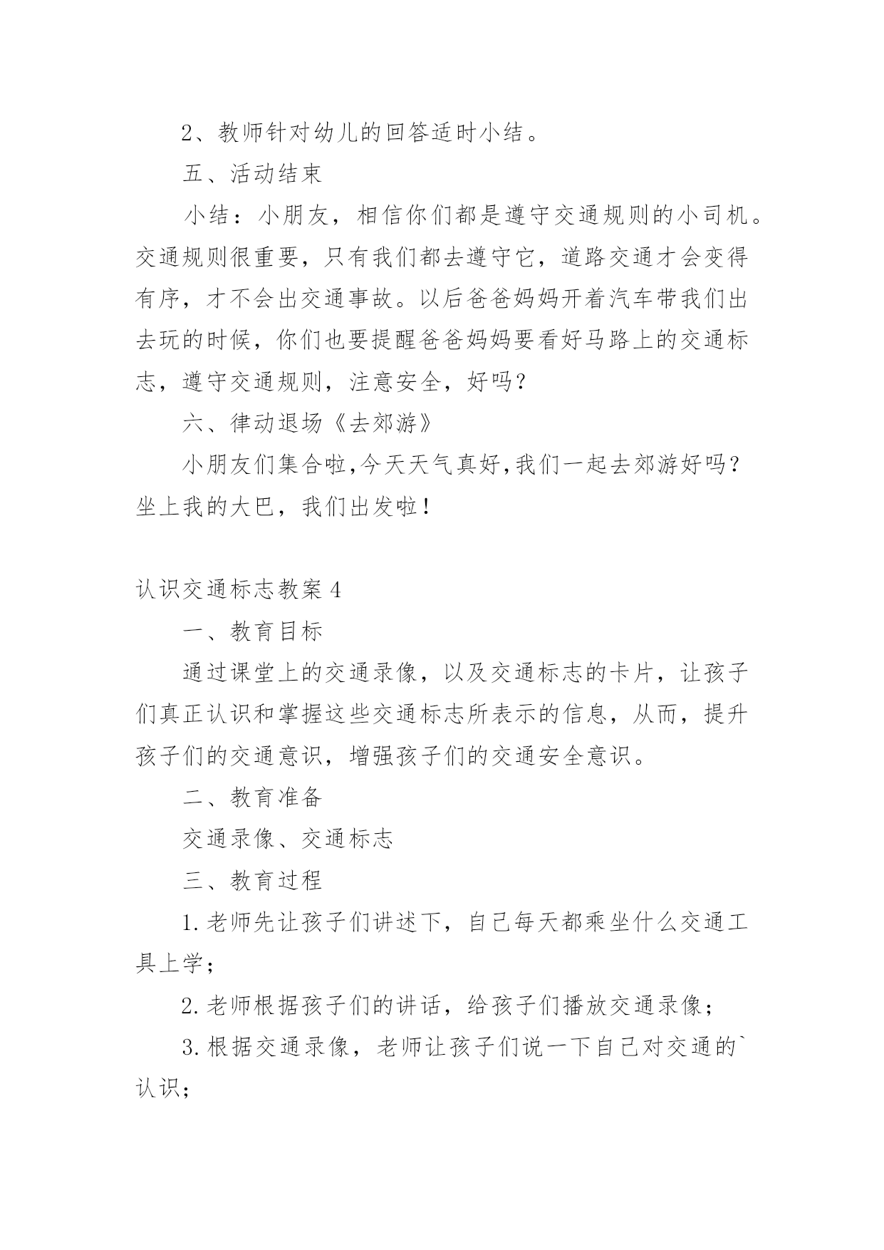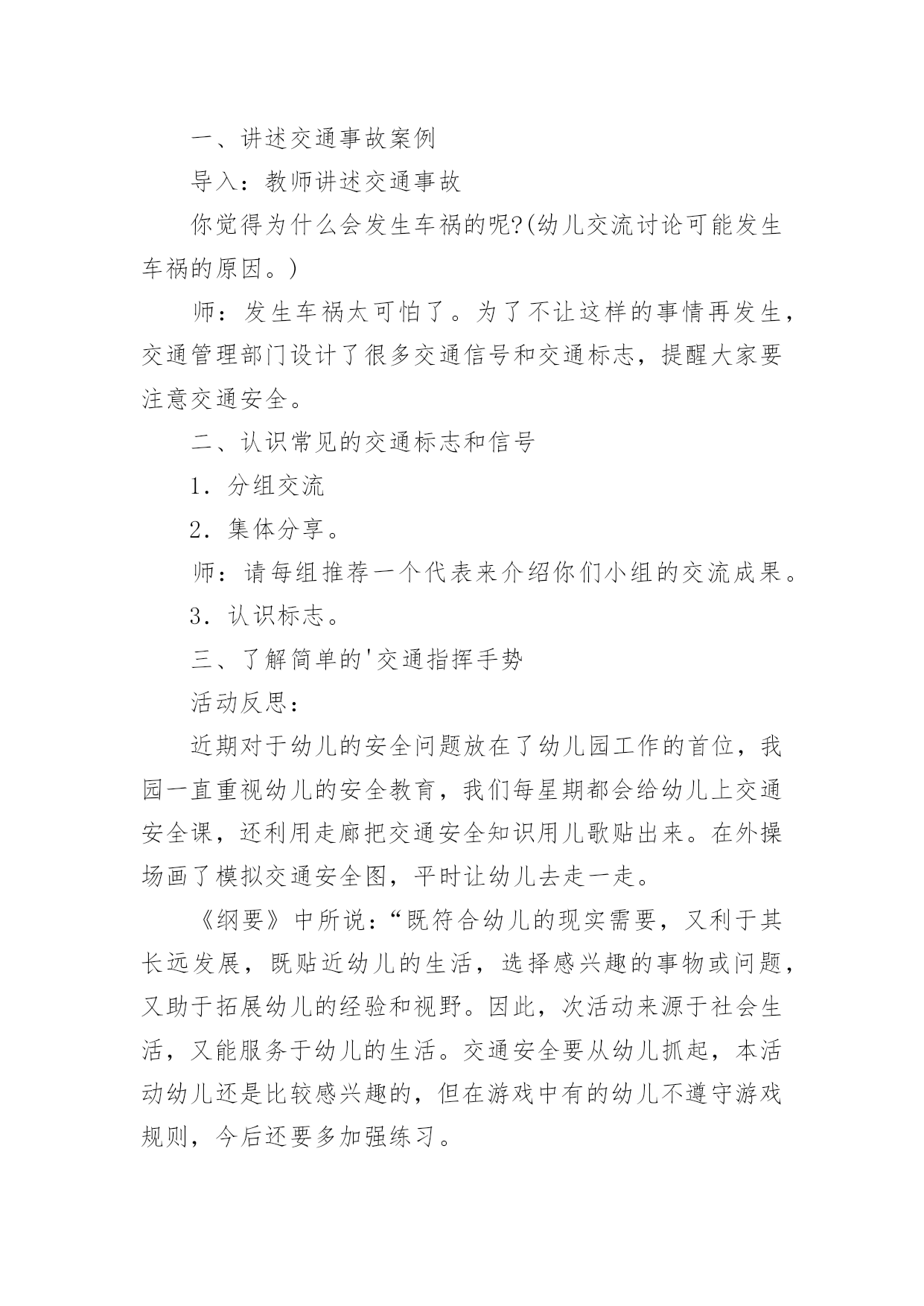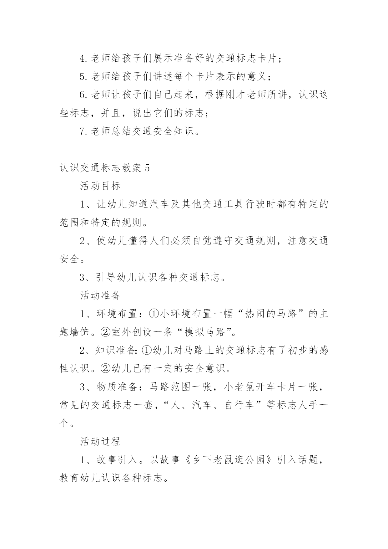 认识交通标志教案作为一名教师,总不可避免地需要编写教案,教案有助于顺利而有效地开展教学活动。写教案需要注意哪些格式呢?以下是小编帮大家整理的认识交通标志教案,仅供参考,大家一起来看看吧。认识交通标志教案1活动设计背景幼儿年龄小,活泼好动,有必要进行安全常识的学习,特别是马路上的交通安全,所以设计了本节教学活动,让幼儿对交通标志有所认识,并按标志行动。活动目标1、教育幼儿走在马路上要注意安全,初步培养幼儿的自我保护意识。2、幼儿能认识简单的交通标记并了解安全通过马路应遵守的交通规则。3、鼓励幼儿大胆表述自己的想法,并能与同伴进行合作学习。4、遵守社会交通规则,不做“禁止”的事。5、培养幼儿敏锐的观察能力。教学重点、难点能认识几种交通标志,知道标志的作用和特征。活动准备交通标志图若干,音乐光碟、挂图活动过程一、开始部分:课前律动。1、老师带领幼儿伴随音乐玩开小汽车的游戏。2、中途会出现斑马线、红绿灯等标志引出课题。二、基本部分:认识一些常见的交通标志及重要性。1、逐一出示刚才游戏中看到的斑马线、红绿灯标志、人行横道、地下通道、步行街等标志,引导幼儿说出其名称及作用。A、提问:如何过马路?安全过马路有什么好处?培养幼儿的自我保护意识。2、结合幼儿实际,用互动谈话的形式请幼儿说说自己都见过那些交通标志,它们都告诉我们什么?三、找朋友1、每名幼儿身前贴一张标志图,看看自己身上的标志图与黑板上的相同就站在一起。2、音乐伴奏《找朋友》。3、让找到好朋友的各组队员说说自己身上的标志图名称,还有我们平时应该怎样遵守交通规则。四、课的`总结和延伸1、今天老师和小朋友一起认识了一些交通标志,懂得了它的作用,牢记安全第一,我们要做一个遵守交通规则的好孩子。2、如果有谁发现了其它的标志,可以用笔画下来,回到班上和小朋友一起来认识。教学反思1、教学活动中游戏环节是幼儿最感兴趣的,课堂气氛活跃。2、通过游戏认识一些常见的交通标志及其代表的意义,再通过谈一谈交通标志的含义及作用,让幼儿知道遵守交通规则的重要性,培养幼儿遵守交通规则的意识。孩子们自主地和其他的小朋友去交流,这样既锻炼了口头语言表达能力,让孩子感受在一起玩的快乐。3、游戏时间过长,导致课的结尾仓促。认识交通标志教案2一、活动目标:1.认识并了解一些常见的交通信号、交通标志和交通标线的作用。2.知道出行要按交通标志行走,要服从交警指挥,有初步的交通安全意识。3.学习收集整理材料的方法,通过交流分享主动获取新知识。4.培养幼儿对事物的判断能力。5.能说出不易玩耍的地方存在什么样的安全隐患。二、活动准备:安全事例,幼儿搜集的交通标志记录单(附后)。三、活动过程:一、讲述交通事故案例导入:教师讲述交通事故你觉得为什么会发生车祸的呢?(幼儿交流讨论可能发生车祸的原因。)师:发生车祸太可怕了。为了不让这样的事情再发生,交通管理部门设计了很多交通信号和交通标志,提醒大家要注意交通安全。二、认识常见的交通标志和信号1.分组交流2.集体分享。师:请每组推荐一个代表来介绍你们小组的交流成果。3.认识标志。三、了解简单的'交通指挥手势活动反思:近期对于幼儿的安全问题放在了幼儿园工作的首位,我园一直重视幼儿的安全教育,我们每星期都会给幼儿上交通安全课,还利用走廊把交通安全知识用儿歌贴出来。在外操场画了模拟交通安全图,平时让幼儿去走一走。《纲要》中所说:“既符合幼儿的现实需要,又利于其长远发展,既贴近幼儿的生活,选择感兴趣的事物或问题,又助于拓展幼儿的经验和视野。因此,次活动来源于社会生活,又能服务于幼儿的生活。交通安全要从幼儿抓起,本活动幼儿还是比较感兴趣的,但在游戏中有的幼儿不遵守游戏规则,今后还要多加强练习。认识交通标志教案3活动目标:1、尝试了解一些简单的交通标志,能用完整的语言正确表达它们的含义。2、尝试按标志的不同特征进行分类。3、乐意参与游戏,激发对交通标志的兴趣,培养遵守交通安全的意识。活动准备:1、收集各种交通标志(或图片)2、制作PPT3、交通事故的动画视频4、小标志若干活动过程:一、视频引入1、视频导入,引发探究欲望2、播放交通事故的动画视频。师:刚才你们看到了什么?发生了一件什么事情?(引导幼儿用完整的语言讲述)3、师:为什么会发生这样的事情呢?二、播放课件,解读交通标志,我们应该遵守交通规则,让我们从认识交通标志开始学习交通规则。1、认识红绿灯(播放红绿灯图片)。师:马路上最重要的标志就是信号灯,你们在哪些地方看见过红绿灯?红灯表示什么?绿灯表示什么?2、认识其他交通标志(播放交通标志课件)。三、了解交通标志的分类。1、(出示课件)师:看看这些交通标志,它们都有什么相同的地方?(引导幼儿从形状、颜色等方面重点观察和讲述)归纳:2、指示标志:在蓝底色上画着不同的白色图案,是指示车辆和行人通行的