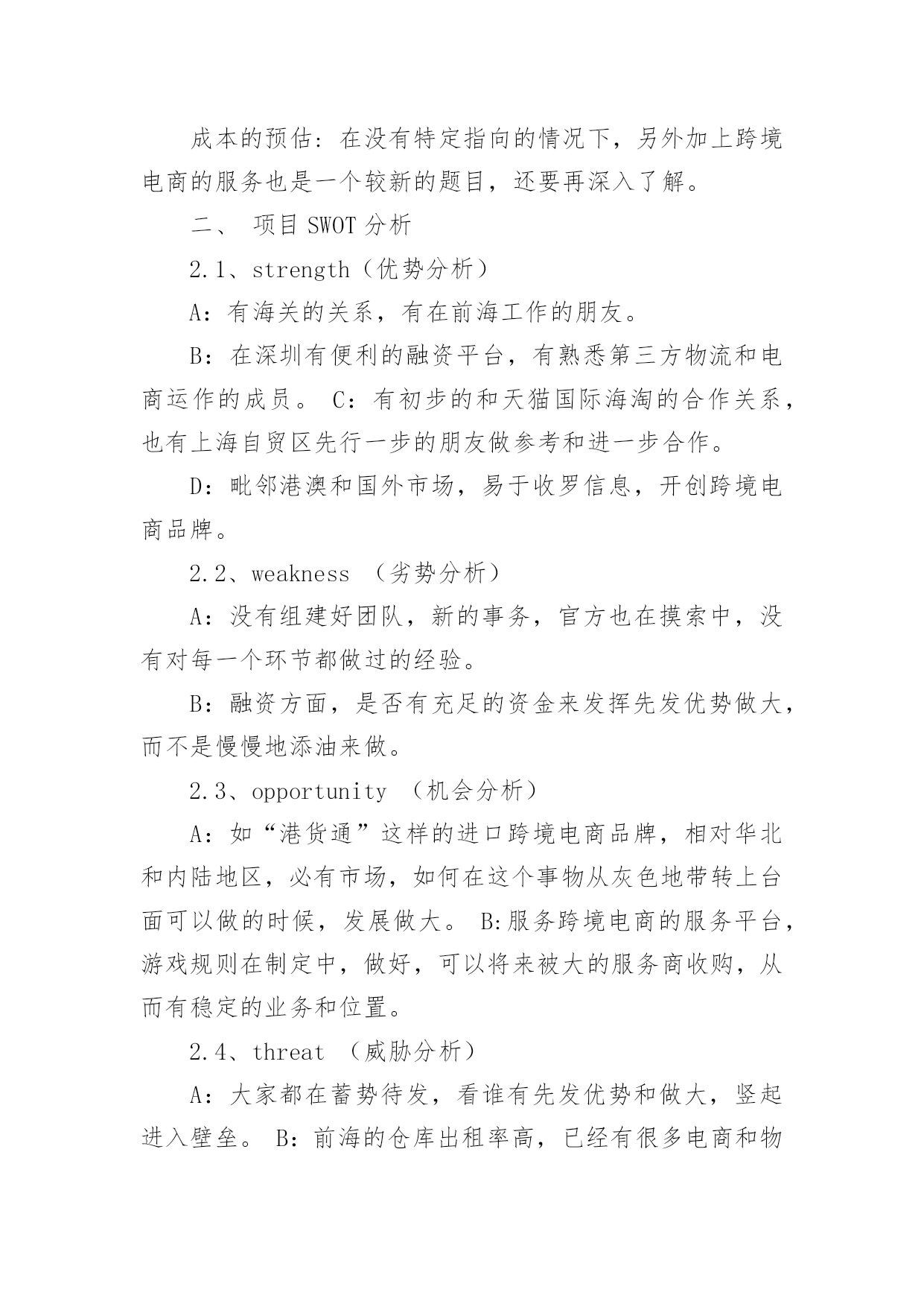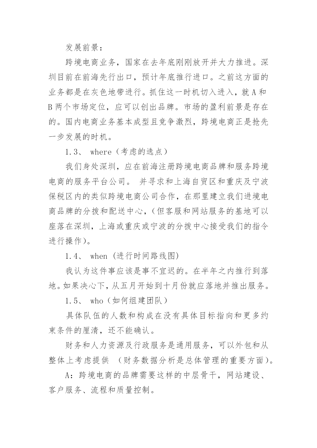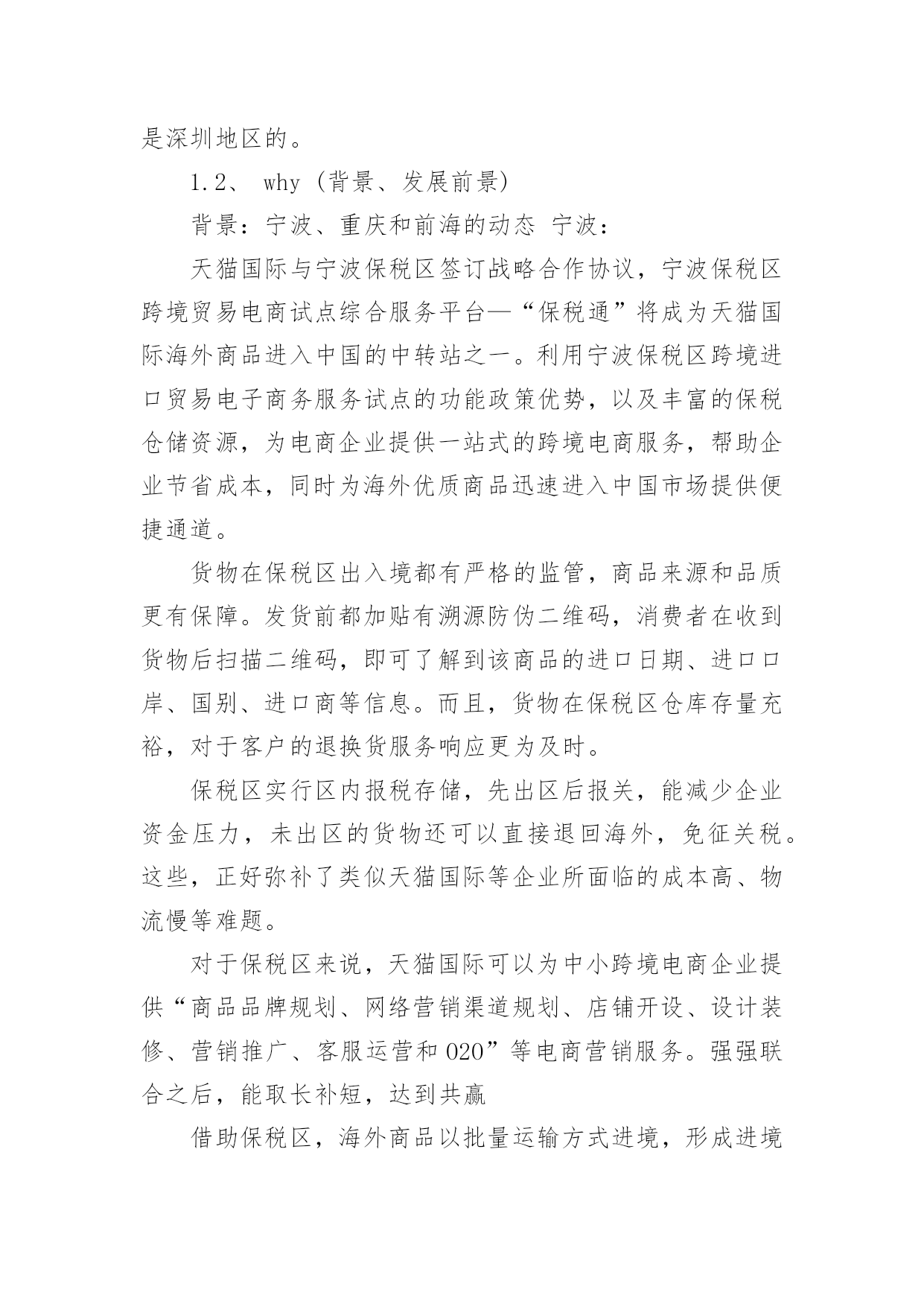 商业策划商业策划篇1一、从“5W2H”来分析1.1、what(商业模式)商业模式分析项目的定位和提供的服务以及目标客户。项目定位:A:发展自己的跨境电商品牌,设想如“港货通”这样的品牌,之前都是灰色地带,现在利用上海和宁波及重庆可以办理进口电商的业务,在华北和西南地区建立这样电商品牌的分拨中心,辐射长三角和西南地区,影响全国。类似于“港货通”的品牌在华北地区和内陆地区也应有些相对优势。B:建立跨境电商的服务平台,目前如前海的政府相关部门构建了大通关的服务平台,我们作为服务内容的提供商,进入这个平台。提供的服务:A:收罗香港地区的食品、药品等生活快速消费品,进行跨境电商进口和配送服务。B:这样的跨境电商服务平台,提供仓储、报关、报检、退税、缴税和安排配送及运输等服务。目标客户:A:抓住时机,将“港货通”推向长三角地区和内陆地区的电商用户。B:服务珠三角地区的跨境电商,重点当然是深圳地区的。1.2、why(背景、发展前景)背景:宁波、重庆和前海的动态宁波:天猫国际与宁波保税区签订战略合作协议,宁波保税区跨境贸易电商试点综合服务平台—“保税通”将成为天猫国际海外商品进入中国的中转站之一。利用宁波保税区跨境进口贸易电子商务服务试点的功能政策优势,以及丰富的保税仓储资源,为电商企业提供一站式的跨境电商服务,帮助企业节省成本,同时为海外优质商品迅速进入中国市场提供便捷通道。货物在保税区出入境都有严格的监管,商品来源和品质更有保障。发货前都加贴有溯源防伪二维码,消费者在收到货物后扫描二维码,即可了解到该商品的进口日期、进口口岸、国别、进口商等信息。而且,货物在保税区仓库存量充裕,对于客户的退换货服务响应更为及时。保税区实行区内报税存储,先出区后报关,能减少企业资金压力,未出区的货物还可以直接退回海外,免征关税。这些,正好弥补了类似天猫国际等企业所面临的成本高、物流慢等难题。对于保税区来说,天猫国际可以为中小跨境电商企业提供“商品品牌规划、网络营销渠道规划、店铺开设、设计装修、营销推广、客服运营和O2O”等电商营销服务。强强联合之后,能取长补短,达到共赢借助保税区,海外商品以批量运输方式进境,形成进境备案清单,在保税区内保税存储,消费者在天猫国际下单后,商品从保税区快递寄出,送达消费者手中,境外电商企业再向海关申报并缴纳行邮税。由于批量海运方式大幅降低物流成本,这将使海外直购商品便宜20%左右;保税区直接发货,也将减少消费者网购等待时间。以一罐奶粉为例,海外直邮运费需要约50元人民币,批量海运每罐成本大约只需10元人民币;以往海外直邮要半个月才能送到,现在只需2至3天。目前保税通与天猫国际合作的产品主要有尿不湿、保温杯、巧克力等,今后,更多的海外母婴、食品、家居电器等类目商品将进入消费者家中在这过程中,店家只需向海关申报并交纳行邮税,而大部分价值500元以下的日常用品是免征行邮税的,超过500元,一般按10%征收,大大低于关税和增值税。重庆:重庆成全国唯一跨境贸易电子商务全业务试点城市。跨境电商4种模式都可开展。20xx年8月,国家发改委、海关总署正式批准重庆、上海、杭州、郑州和宁波5个城市成为跨境贸易电子商务服务试点城市。在试点过程中,以上五大试点城市分别可开展哪些类型业务,各有不同,都需得到国家相关部门的批准。海关总署正式发文批复该方案,同意重庆试点方案中包括的跨境电子商务的4种业务模式,重庆市由此成为全国唯一具有全业务的试点城市。跨境电子商务业务模式共有四种,分别是“一般进口”、“保税进口”、“一般出口”和“保税出口”。在开展传统的跨境贸易电子商务时,存在难以快速通关、规范结汇及退税等问题。为破解瓶颈,重庆市将建立试点平台系统,与海关通关系统、外管和国税的联网核查系统相连接,将从根本解决跨境电子商务通关、结汇和退税的难题,从而打通跨境电子商务国际物流通道。届时,企业通过电商平台开展进出口业务,将更为规范、便捷。以“一般出口”为例,跨境电商企业会预先在试点平台系统中备案,如果有海外消费者通过该电商平台采购重庆产品,相关的企业信息、商品价格、交易金额等数据将自动记录在该平台的系统当中,这些数据还将与海关通关系统、外管和国税的联网核查系统相连接,以方便相关部门进行查询、处理。深圳前海:目前从事跨境电子商务的网站,因每单生意数量比较少,无法通过集装箱报关出口,只能从邮递渠道送达,造成资金结算只能通过地*钱庄的.局面。深圳海关将整合国内的跨境电子商务网站,统一拼单出口,有望改变目前的局面。据海关统计,20xx年中国的网上出口交易额约1400亿人民币,生成包裹数量约为5亿个。海关调研发现,国内的跨境电子商务,大多处于半地下状态。海关工作人员称:“目前,跨境电子商务在国内还没有正常渠道,很多都是以邮包的形式进行交易。这样一方面增加了成本,另外一方