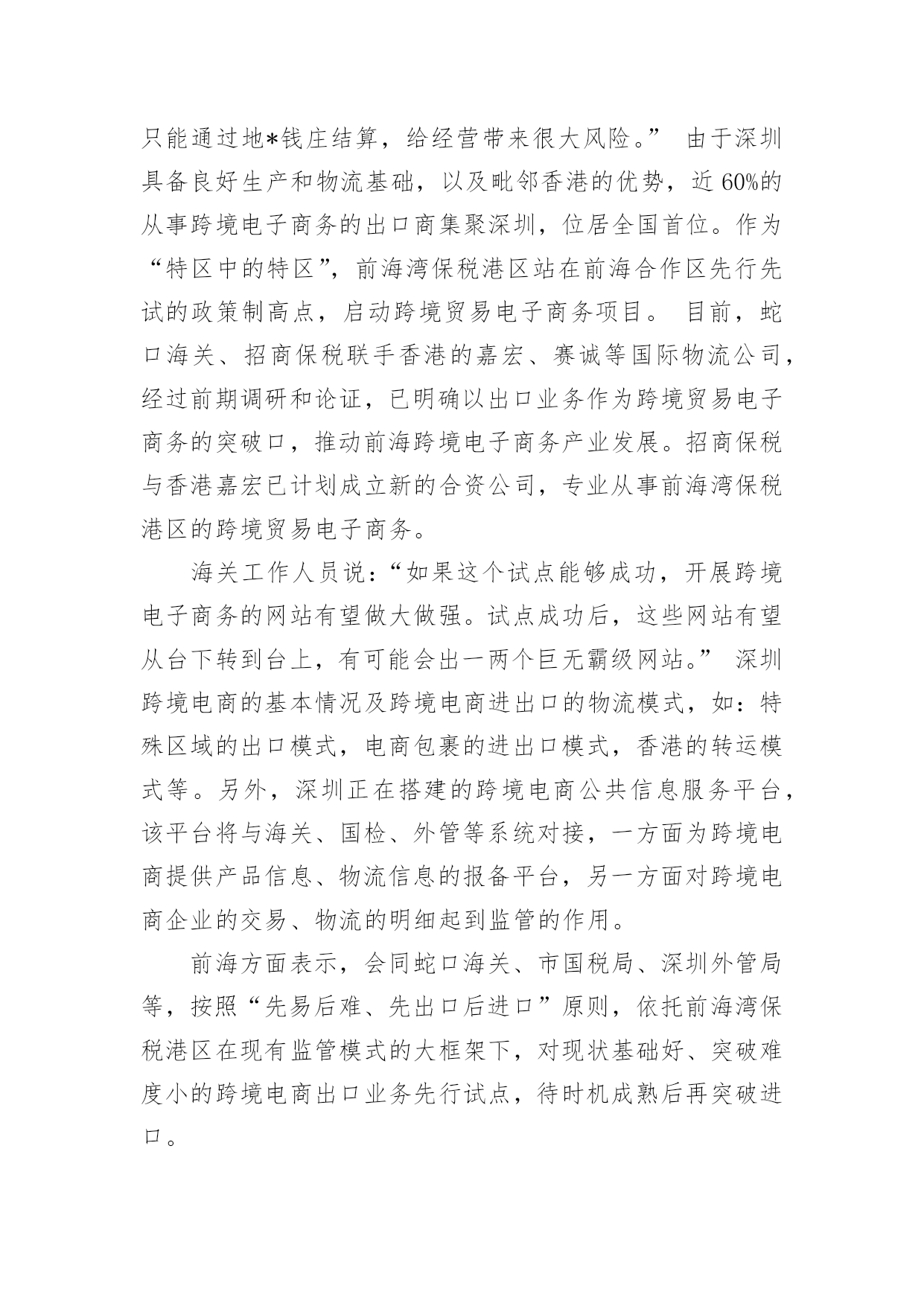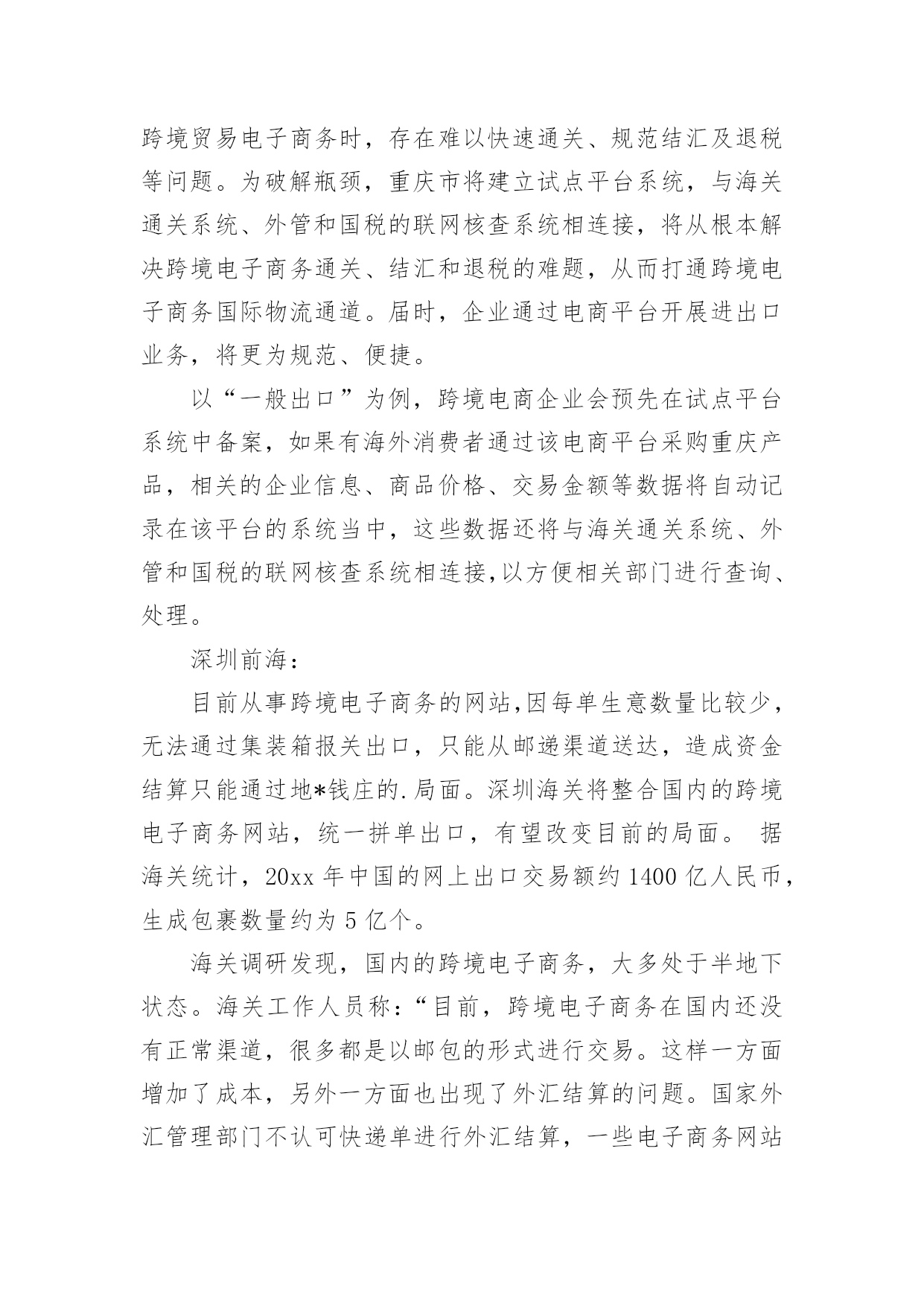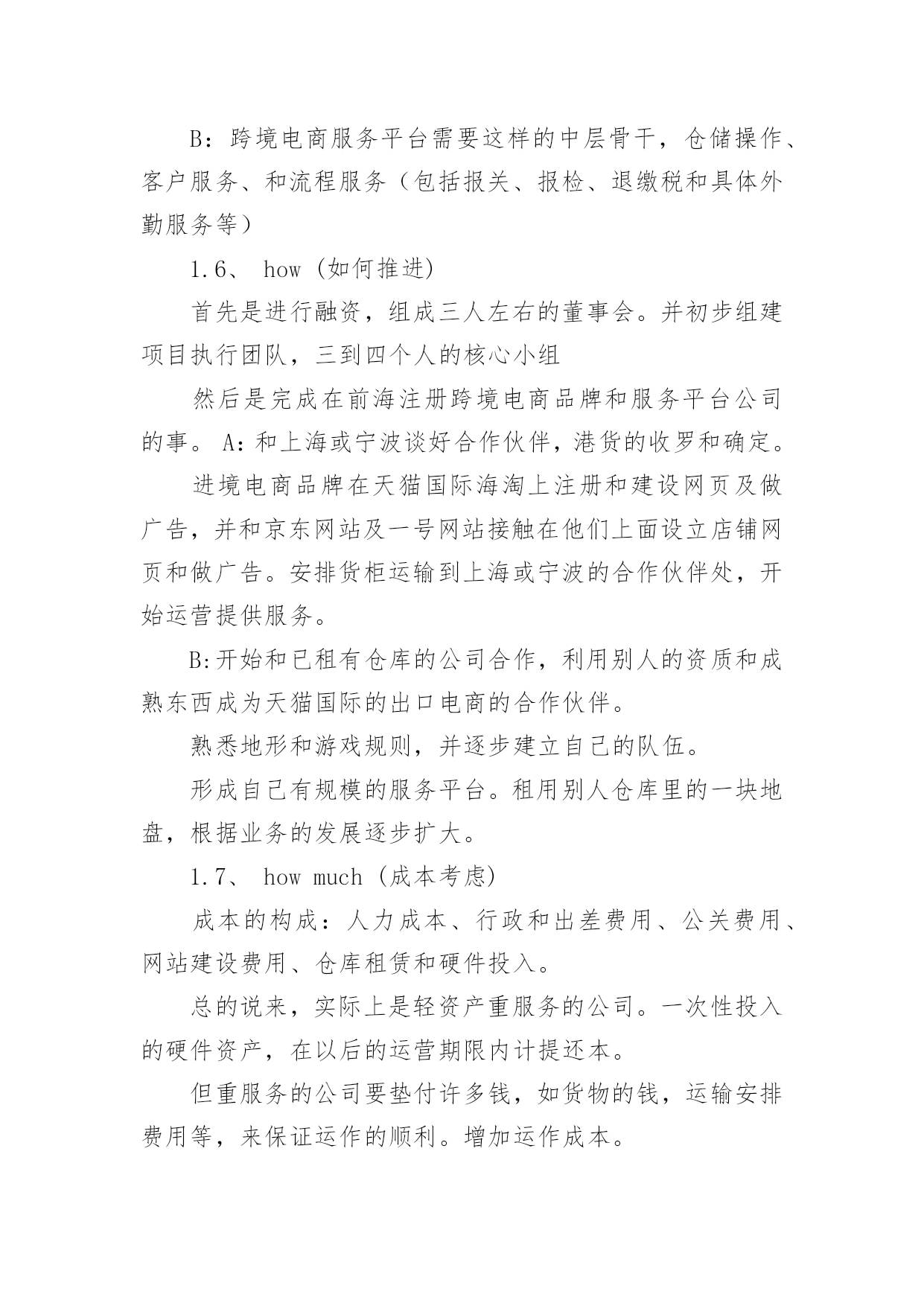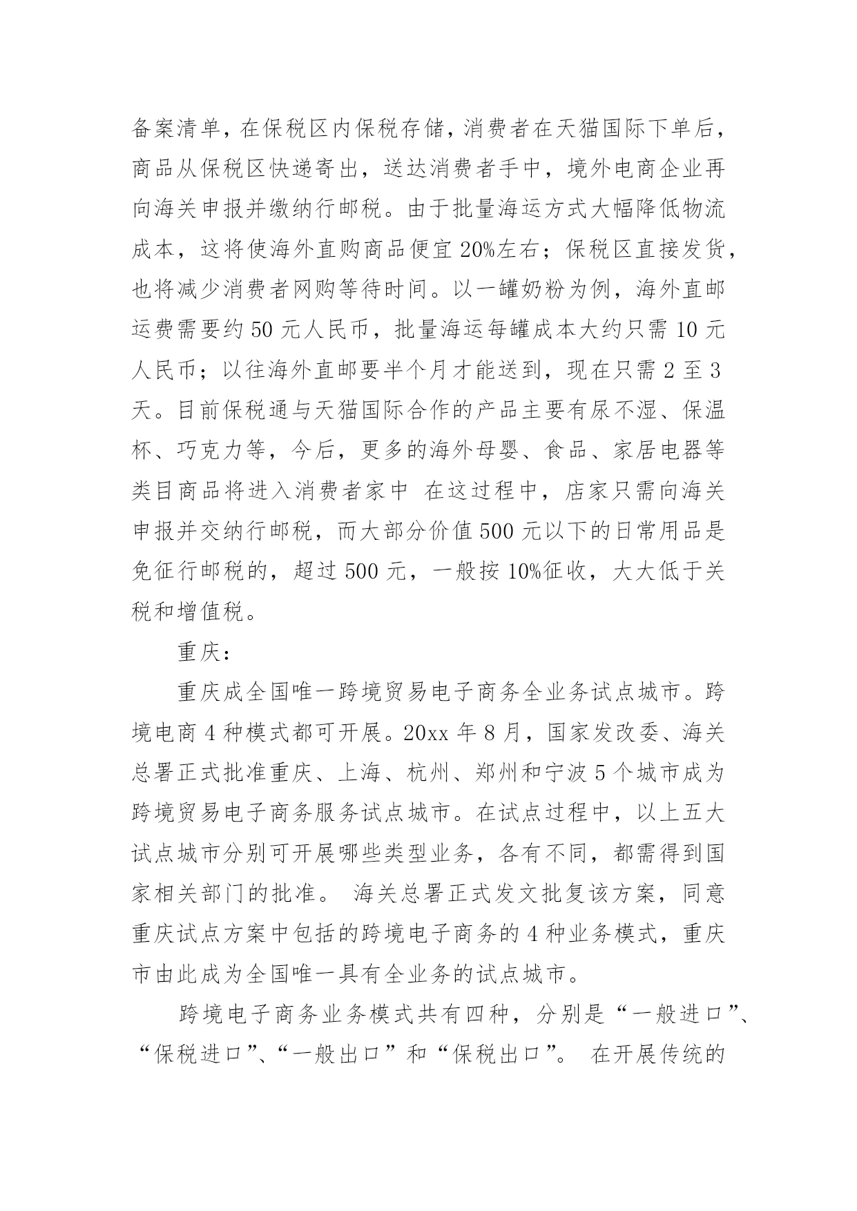 商业策划商业策划篇1一、从“5W2H”来分析1.1、what(商业模式)商业模式分析项目的定位和提供的服务以及目标客户。项目定位:A:发展自己的跨境电商品牌,设想如“港货通”这样的品牌,之前都是灰色地带,现在利用上海和宁波及重庆可以办理进口电商的业务,在华北和西南地区建立这样电商品牌的分拨中心,辐射长三角和西南地区,影响全国。类似于“港货通”的品牌在华北地区和内陆地区也应有些相对优势。B:建立跨境电商的服务平台,目前如前海的政府相关部门构建了大通关的服务平台,我们作为服务内容的提供商,进入这个平台。提供的服务:A:收罗香港地区的食品、药品等生活快速消费品,进行跨境电商进口和配送服务。B:这样的跨境电商服务平台,提供仓储、报关、报检、退税、缴税和安排配送及运输等服务。目标客户:A:抓住时机,将“港货通”推向长三角地区和内陆地区的电商用户。B:服务珠三角地区的跨境电商,重点当然是深圳地区的。1.2、why(背景、发展前景)背景:宁波、重庆和前海的动态宁波:天猫国际与宁波保税区签订战略合作协议,宁波保税区跨境贸易电商试点综合服务平台—“保税通”将成为天猫国际海外商品进入中国的中转站之一。利用宁波保税区跨境进口贸易电子商务服务试点的功能政策优势,以及丰富的保税仓储资源,为电商企业提供一站式的跨境电商服务,帮助企业节省成本,同时为海外优质商品迅速进入中国市场提供便捷通道。货物在保税区出入境都有严格的监管,商品来源和品质更有保障。发货前都加贴有溯源防伪二维码,消费者在收到货物后扫描二维码,即可了解到该商品的进口日期、进口口岸、国别、进口商等信息。而且,货物在保税区仓库存量充裕,对于客户的退换货服务响应更为及时。保税区实行区内报税存储,先出区后报关,能减少企业资金压力,未出区的货物还可以直接退回海外,免征关税。这些,正好弥补了类似天猫国际等企业所面临的成本高、物流慢等难题。对于保税区来说,天猫国际可以为中小跨境电商企业提供“商品品牌规划、网络营销渠道规划、店铺开设、设计装修、营销推广、客服运营和O2O”等电商营销服务。强强联合之后,能取长补短,达到共赢借助保税区,海外商品以批量运输方式进境,形成进境备案清单,在保税区内保税存储,消费者在天猫国际下单后,商品从保税区快递寄出,送达消费者手中,境外电商企业再向海关申报并缴纳行邮税。由于批量海运方式大幅降低物流成本,这将使海外直购商品便宜20%左右;保税区直接发货,也将减少消费者网购等待时间。以一罐奶粉为例,海外直邮运费需要约50元人民币,批量海运每罐成本大约只需10元人民币;以往海外直邮要半个月才能送到,现在只需2至3天。目前保税通与天猫国际合作的产品主要有尿不湿、保温杯、巧克力等,今后,更多的海外母婴、食品、家居电器等类目商品将进入消费者家中在这过程中,店家只需向海关申报并交纳行邮税,而大部分价值500元以下的日常用品是免征行邮税的,超过500元,一般按10%征收,大大低于关税和增值税。重庆:重庆成全国唯一跨境贸易电子商务全业务试点城市。跨境电商4种模式都可开展。20xx年8月,国家发改委、海关总署正式批准重庆、上海、杭州、郑州和宁波5个城市成为跨境贸易电子商务服务试点城市。在试点过程中,以上五大试点城市分别可开展哪些类型业务,各有不同,都需得到国家相关部门的批准。海关总署正式发文批复该方案,同意重庆试点方案中包括的跨境电子商务的4种业务模式,重庆市由此成为全国唯一具有全业务的试点城市。跨境电子商务业务模式共有四种,分别是“一般进口”、“保税进口”、“一般出口”和“保税出口”。在开展传统的跨境贸易电子商务时,存在难以快速通关、规范结汇及退税等问题。为破解瓶颈,重庆市将建立试点平台系统,与海关通关系统、外管和国税的联网核查系统相连接,将从根本解决跨境电子商务通关、结汇和退税的难题,从而打通跨境电子商务国际物流通道。届时,企业通过电商平台开展进出口业务,将更为规范、便捷。以“一般出口”为例,跨境电商企业会预先在试点平台系统中备案,如果有海外消费者通过该电商平台采购重庆产品,相关的企业信息、商品价格、交易金额等数据将自动记录在该平台的系统当中,这些数据还将与海关通关系统、外管和国税的联网核查系统相连接,以方便相关部门进行查询、处理。深圳前海:目前从事跨境电子商务的网站,因每单生意数量比较少,无法通过集装箱报关出口,只能从邮递渠道送达,造成资金结算只能通过地*钱庄的.局面。深圳海关将整合国内的跨境电子商务网站,统一拼单出口,有望改变目前的局面。据海关统计,20xx年中国的网上出口交易额约1400亿人民币,生成包裹数量约为5亿个。海关调研发现,国内的跨境电子商务,大多处于半地下状态。海关工作人员称:“目前,跨境电子商务在国内还没有正常渠道,很多都是以邮包的形式进行交易。这样一方面增加了成本,另外一方