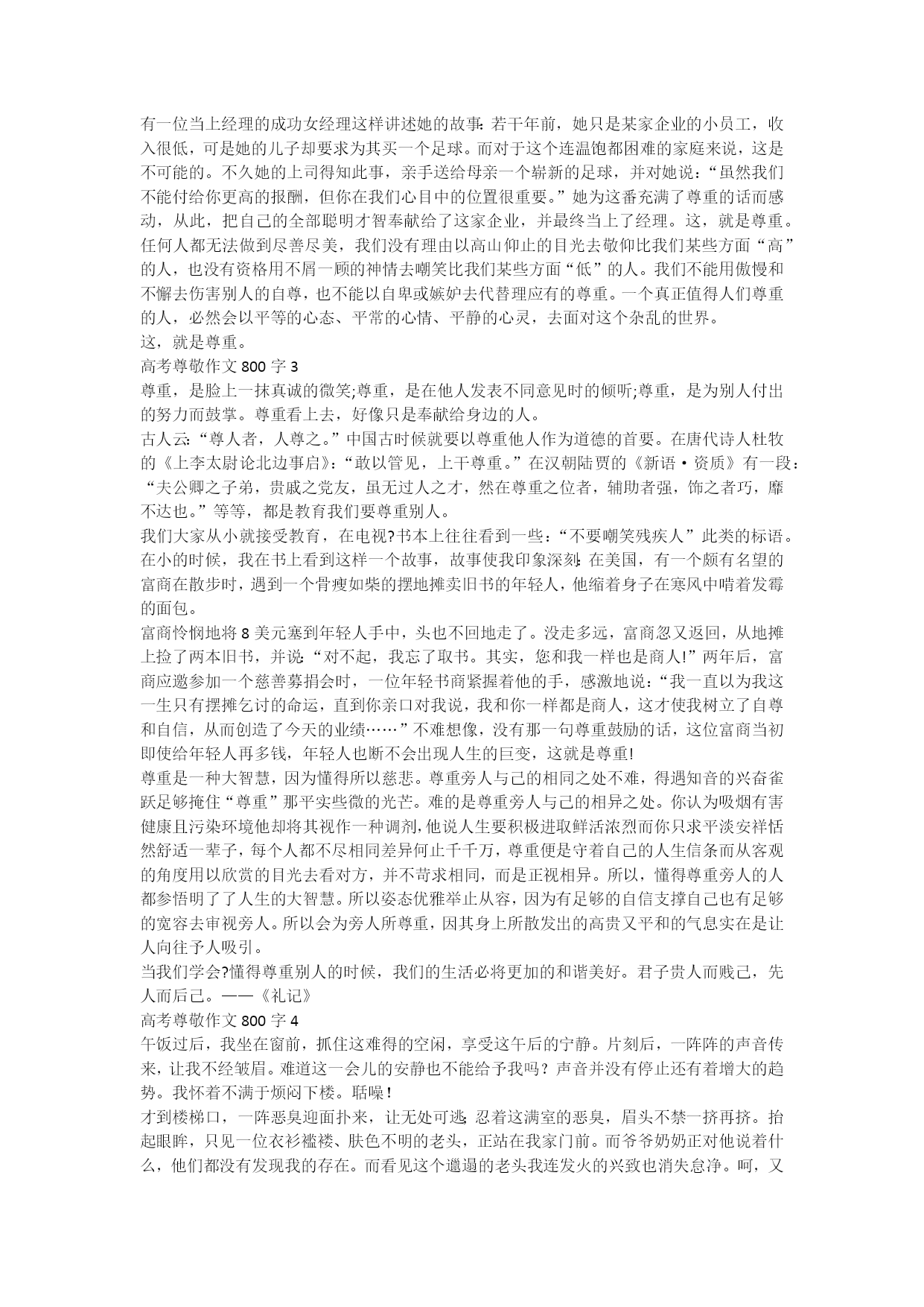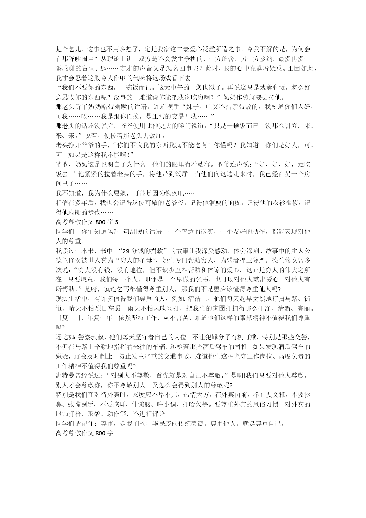 高考尊敬作文800字每个人都有自己尊敬的人。有的遥不可及,比如明星歌手伟人等,有的近在咫尺比如:父母、亲戚、朋友……,下面是xx给大家带来的高考尊敬作文800字,欢迎大家阅读参考,我们一起来看看吧!高考尊敬作文800字1我尊敬的一个人,不是爸爸妈妈,也亦不是爷爷奶奶。而是我的二姐。虽不是亲的,但却胜过最亲的。因为她是所有的兄弟姐妹中,最关心我的人。很小的时候,我最害怕的就是我二姐。因为她最喜欢捉弄我了,并且我还反抗不了。每次遇见她,我都会很倒霉,都没有人帮助我,她就像恶魔一样,在我的童年留下深刻的印象。不知道过了多久,记忆中的那个爱欺负我的姐姐变了。她变得很知书达礼,个性是落落大方,给人的感觉是慢慢的高贵气质,还有聪慧过人,眼光独特,一阵见血的那种(当然这个主要还是对我)。家中的长辈们都很喜欢她,因为她是那么的聪明,有气质,也很耀眼。二姐不仅如此,她身材高挑,穿衣打扮都很有品味。即便如此,她还是更倾向于我。不过这次不是欺负我,而是关心我,照顾我。可我却依旧怕她,因为我的成绩。我不是成绩出色的人,也没有那种智慧。可我二姐拥有,尤其是理科,相反我偏偏就是理科的“黑洞”,年年都是惨不忍睹的成绩分数。于是,我的灾难又开始了。她关注我学习情况,常常自己一有空就来找我给我补课。每次教导我时,我是两眼发花,更让我头疼的就是,她会问我怎么做。可是我本来就听得不太理解,这让我如何说出口。吱吱唔唔的小声说出口,结果我被批评了。临走前,会留下“深奥的题目”给我,那一刻我是想死的。但这并不影响我对她其他的想法,她是个令我尊敬的“人生老师”。在人生旅途上,我总是磕磕盼盼的走着,因为我安静又懦弱的性格,常常说着不找边际的话。使得家里亲戚都不大喜欢我,不,也许是讨厌我。可是我并不会那些为人处事,是我二姐教会了我,她就是我前进的光明和鼓励我的导师。无论我做了什么,她从来不会嫌弃我,甚至加倍对我好,教会了我很多很多的事情,这是我的爸爸妈妈都不能比拟的。我喜欢又害怕她。因为她,我不再是那个自卑胆怯的女孩;不再让人讨厌的#39;孩子;不再是那个只会哭的爱哭鬼了。她教会了我很多很多,我却无法报答。她是我人生路途中的伙伴,导师!梦里多少次我在想着,未来的我,也样成为这样的人,因为她是那么的耀眼,让人憧憬!高考尊敬作文800字2它与真诚、谦逊、宽容、赞赏、善良相得益彰,与虚伪、狂妄、刻薄、嘲讽、凶恶、水火不容。给成功的人以尊重,表达了对成功者的敬佩与追求;给失败的人以尊重,表达了对失败者的同情鼓励。这,就是尊重。一个位商人看到一个衣衫褴褛的铅笔推销员,顿生怜悯之情。他不假思索地将10元钱塞到这个人的手中。走了没几步,他忽然觉得这样做不妥,于是连忙返回来,并抱歉地解释说自己忘了取笔,希望不要介意。最后,他郑重其事地说:你和我一样,都是商人。两年之后,在一个热闹的市场,一位身着西装革履,风度翩翩的推销商迎上这位商人,感激地自我介绍道:您可能早已忘记我了,而我也不知道您的名字,但我永远不会忘记您。您就是那位重新给了我自尊和自信的人。我一直觉得自己是个推销铅笔的乞丐,直到您亲口对我说,我和您一样都是商人为止。没想到商这么一句简简单单的话,竟使一个自卑的人树立起了自尊,使一个处境窘迫的人重新找回了自信。正是有了这种自尊与自信,才使他看到了真实的自己,并通过不懈的努力创造了今天的自己。这,就是尊重。这个乞丐似的铅笔推销员得到别人的尊重是偶然的。然而,只有你真心的将尊重给予别人,你得到别人的尊重才是必然的:有一位当上经理的成功女经理这样讲述她的故事:若干年前,她只是某家企业的小员工,收入很低,可是她的儿子却要求为其买一个足球。而对于这个连温饱都困难的家庭来说,这是不可能的。不久她的上司得知此事,亲手送给母亲一个崭新的足球,并对她说:“虽然我们不能付给你更高的报酬,但你在我们心目中的位置很重要。”她为这番充满了尊重的话而感动,从此,把自己的全部聪明才智奉献给了这家企业,并最终当上了经理。这,就是尊重。任何人都无法做到尽善尽美,我们没有理由以高山仰止的目光去敬仰比我们某些方面“高”的人,也没有资格用不屑一顾的神情去嘲笑比我们某些方面“低”的人。我们不能用傲慢和不懈去伤害别人的自尊,也不能以自卑或嫉妒去代替理应有的尊重。一个真正值得人们尊重的人,必然会以平等的心态、平常的心情、平静的心灵,去面对这个杂乱的世界。这,就是尊重。高考尊敬作文800字3尊重,是脸上一抹真诚的微笑;尊重,是在他人发表不同意见时的倾听;尊重,是为别人付出的努力而鼓掌。尊重看上去,好像只是奉献给身边的人。古人云:“尊人者,人尊之。”中国古时候就要以尊重他人作为道德的首要。在唐代诗人杜牧的《上李太尉论北边事启》:“敢以管见,上干尊重。”在汉朝陆贾的《新语·资质》有一段:“夫公卿之子
