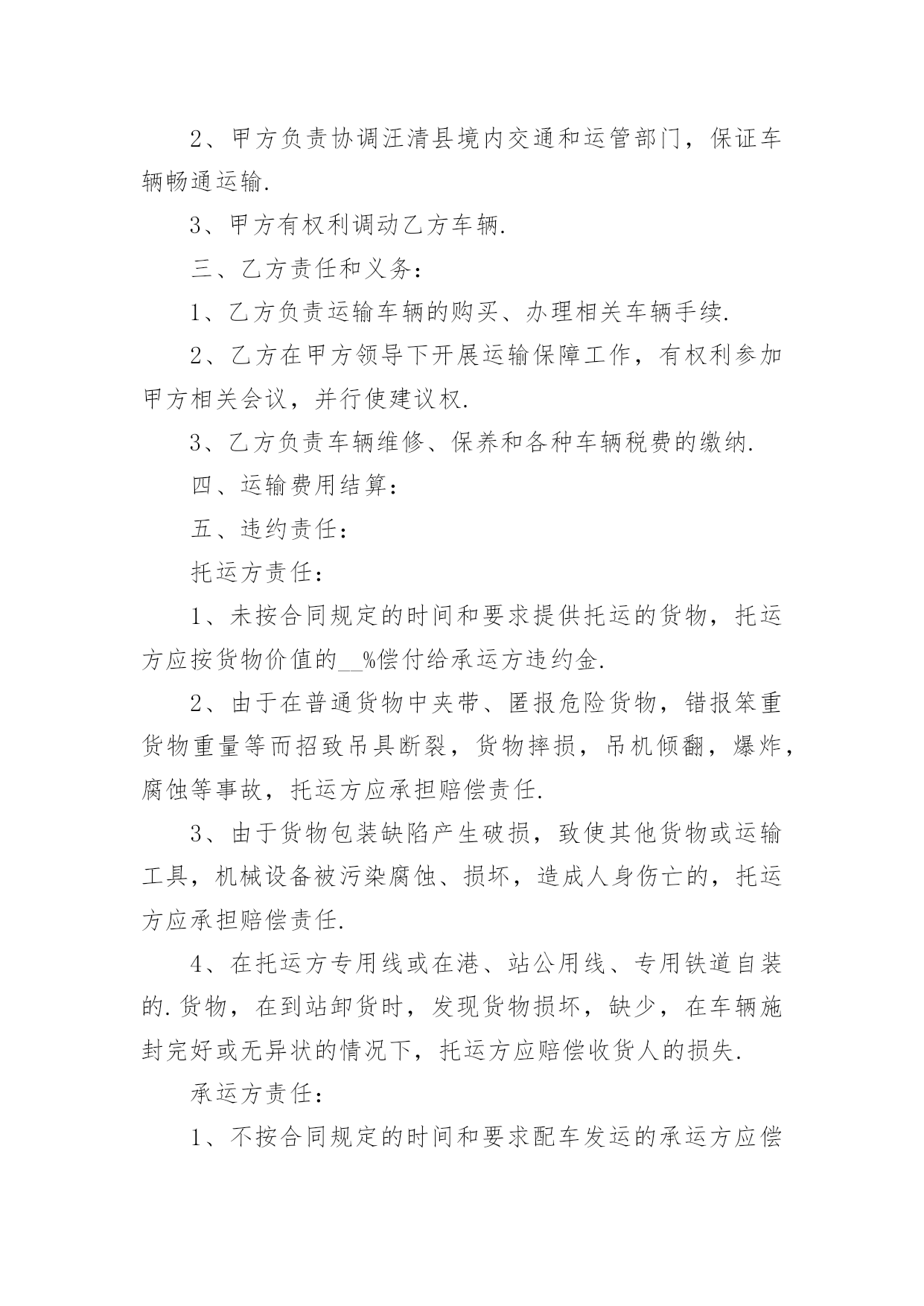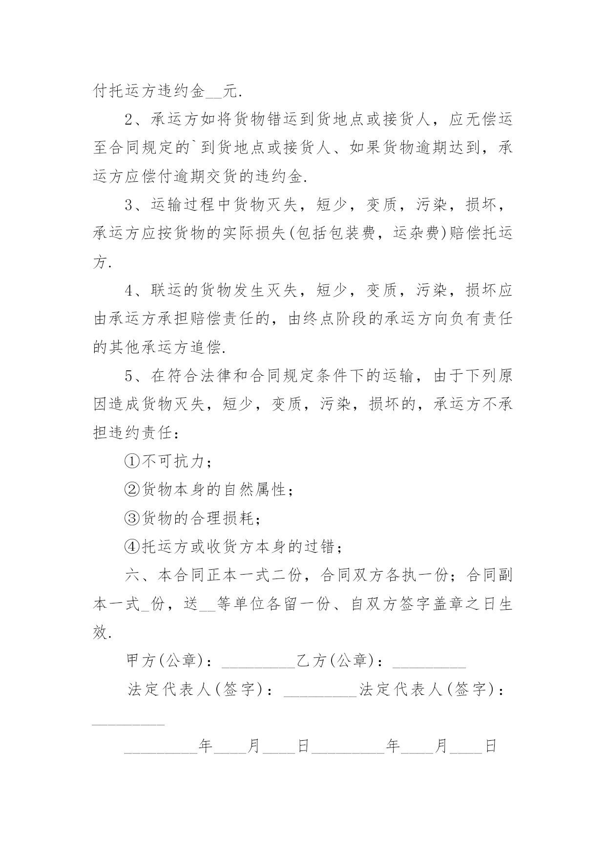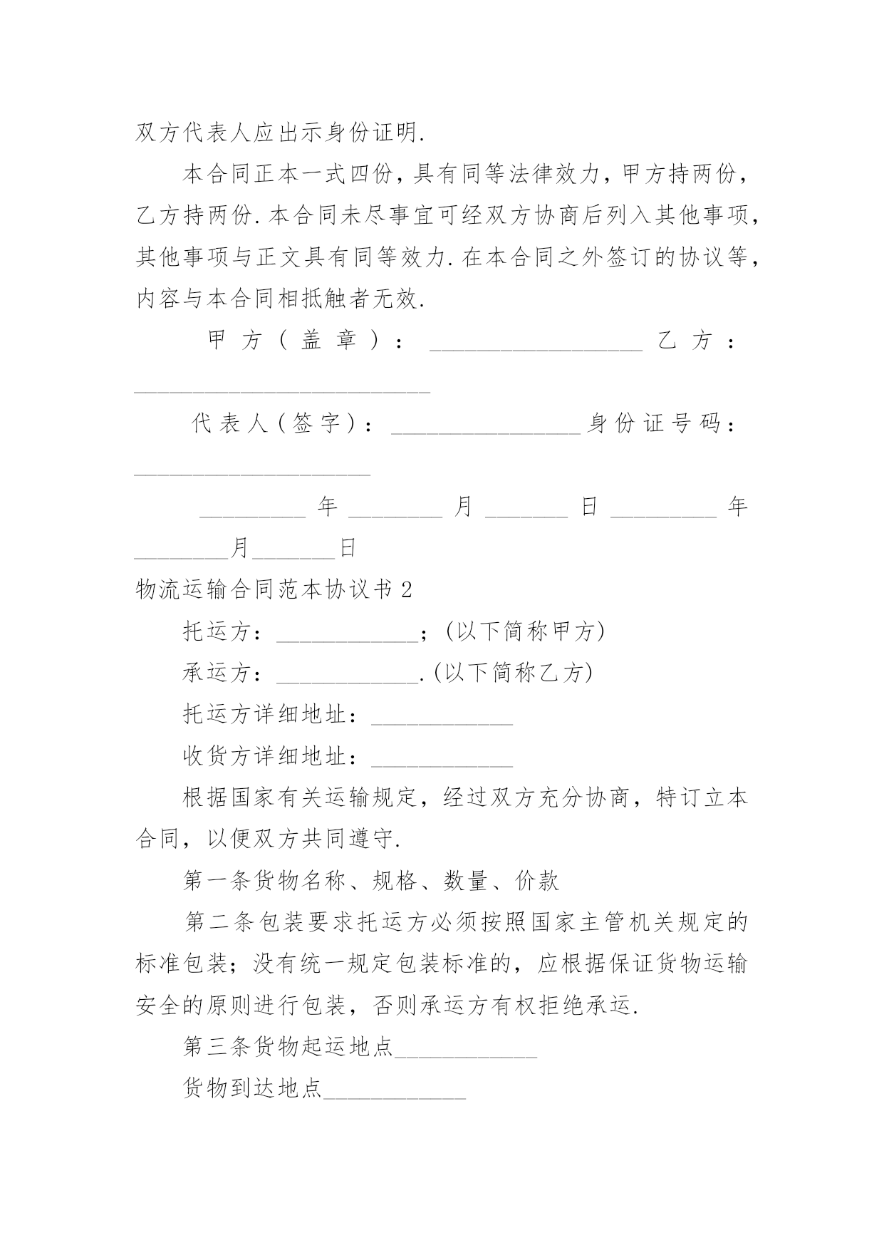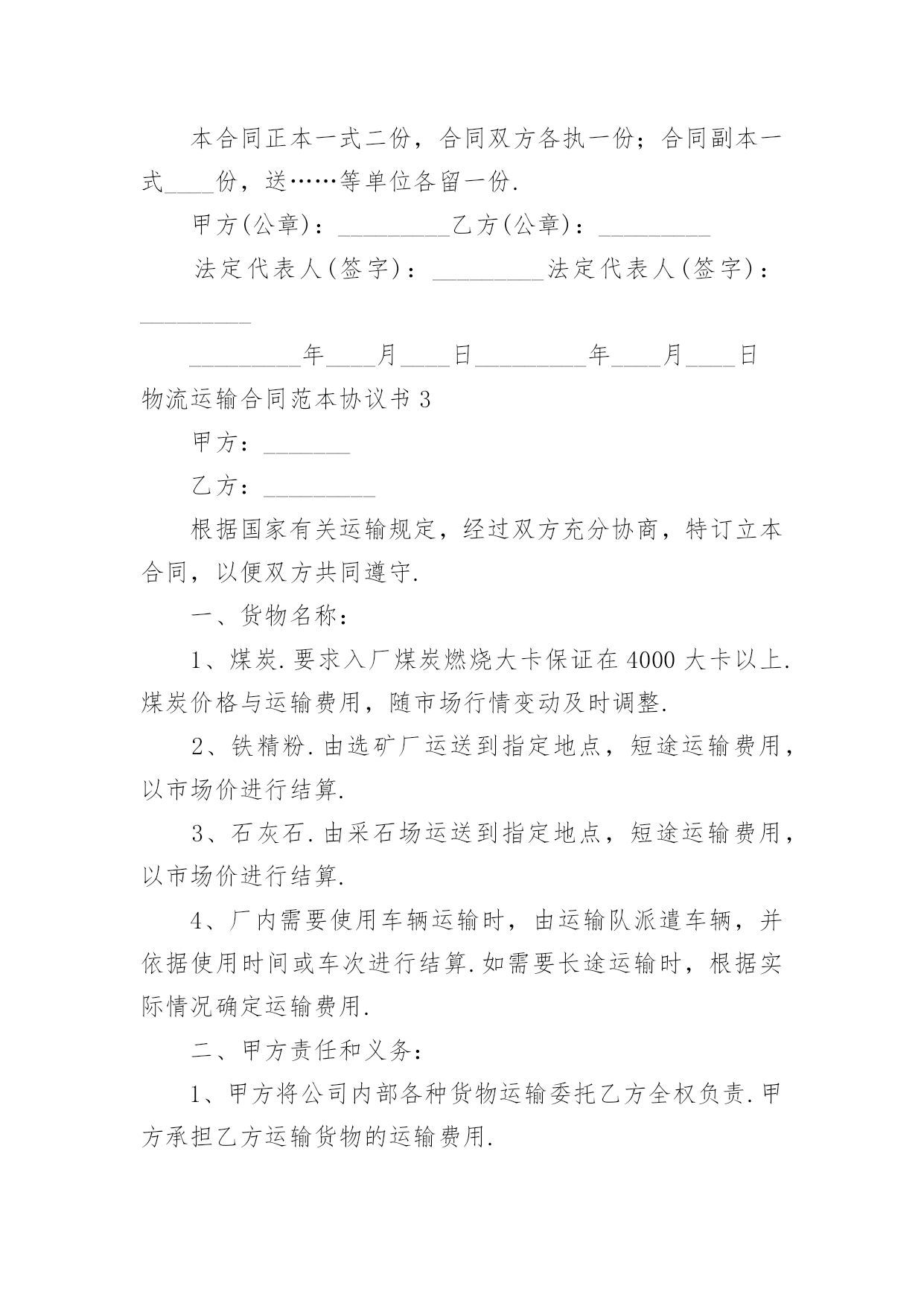 物流运输合同协议书物流运输合同范本协议书在日常生活和工作中,大家逐渐认识到协议的重要性,签订协议可以使双方受到法律的保护。大家知道协议的格式吗?以下是小编为大家收集的物流运输合同范本协议书,欢迎大家借鉴与参考,希望对大家有所帮助。物流运输合同范本协议书1甲方:_________--(以下简称甲方)乙方:____________-(以下简称乙方)根据《中华人民共和国合同法》及其它有关法律法规,遵循平等自愿、公正和诚实信用的原则,甲乙双方就建设工程劳务合作事项协商一致,订立本合同.第一条工程施工内容洞身土石方的运输.第二条合同工期工期以进洞时间开始计算,15个月以内完成.第三条合同价款第四条结算和支付1、合同价款的结算:施工期间按建设单位批复的当期计量进度进行结算,工程完成后,进行末次结算.2、合同价款的支付:当期工程价款按工程量结算单支付至70%,当期支付价款时,乙方需提供工人工资表,由甲方财务支付工资,支付工资后余下价款为乙方所得.工程完工,安全、进度能满足甲方要求的情况下进行末次结算,结算经甲乙双方共同确认后3个月内支付至90%.其余10%半年内付清.第五条安全施工及安全事故处理安全施工:甲方、乙方必须贯彻、执行国家和政府、行业主管部门颁布实施的有关安全生产的法律法规及各项规定,严格按安全标准组织施工,如乙方违章施工造成的安全责任由乙方自行承担全部的责任.1、发生重大伤亡事故,甲乙双方应采取紧急措施防止事态扩大并全力组织抢救伤者,保护事故现场并作出书面记录.2、按照有关规定,甲方乙方应分清责任,事故责任方承担相应的责任.甲乙双方对事故责任有争议时,应按政府有关部门的认定处理.第六条甲方的权利及义务甲方负责组织检查、验收,监督乙方的工程进度、安全施工,负责解决施工中存在或发生的.问题.第七条乙方的权利和义务乙方对与其确定劳动关系的作业工人必须认真审查,保证人员的政治素质、身体健康和技术水平,工人年龄不得低于18周岁,不得超过60周岁.乙方需将其作业人员登记造册(须写明姓名、性别、年龄、籍贯、工种、级别、工作证号码及身份证号码),作为本合同附件.第八条违约责任甲方违约责任1、甲方因故不能继续履行合同时,双方协商后可提前终止合同.由于甲方施工人员指挥错误造成的经济损失及有关责任由甲方承担.2、甲方违反财务管理规定,违约支付劳务费的,除纠正违约支付行为外,还应当在违约支付的额度范围内与过错方对乙方由此遭受的经济损失承担连带责任.1、因乙方原因造成甲方工期延误以及不服从甲方的管理时,如上班迟到半小时扣除每人每工作班50元,迟到1小时扣除每人每工作班100元,以此累计,当月迟到3次以上甲方将扣除乙方当期计价款的10%作为处罚.2、乙方未按甲方要求的施工车辆进场(保证8辆出渣车,配备熟练的驾驶人员),甲方有权要求乙方进行更换、调整.3、乙方中途停工、怠工,甲方提出整改乙方仍继续违约时,甲方将扣除乙方总金额的20%补偿甲方的损失,并终止合同,要求乙方3日内退场.第九条合同争议的解决在履行合同过程中发生争议,甲乙双方首先进行协商,协商不成,可向有关部门申请调解.当调解或和解不成的,可约定以下方式解决争议:当地仲裁委员会申请仲裁或向当地人民法院起诉.第十条合同的生效与终止本合同经双方签字后生效,工程交工验收合格后终止,双方代表人应出示身份证明.本合同正本一式四份,具有同等法律效力,甲方持两份,乙方持两份.本合同未尽事宜可经双方协商后列入其他事项,其他事项与正文具有同等效力.在本合同之外签订的协议等,内容与本合同相抵触者无效.甲方(盖章):__________________乙方:_________________________代表人(签字):________________身份证号码:_____________________________年________月_______日_________年________月_______日物流运输合同范本协议书2托运方:____________;(以下简称甲方)承运方:____________.(以下简称乙方)托运方详细地址:____________收货方详细地址:____________根据国家有关运输规定,经过双方充分协商,特订立本合同,以便双方共同遵守.第一条货物名称、规格、数量、价款第二条包装要求托运方必须按照国家主管机关规定的标准包装;没有统一规定包装标准的,应根据保证货物运输安全的原则进行包装,否则承运方有权拒绝承运.第三条货物起运地点____________货物到达地点____________第四条货物承运日期____________货物运到期限____________第五条运输质量及安全要求_____________________第六条货物装卸责任和方法________第七条收货