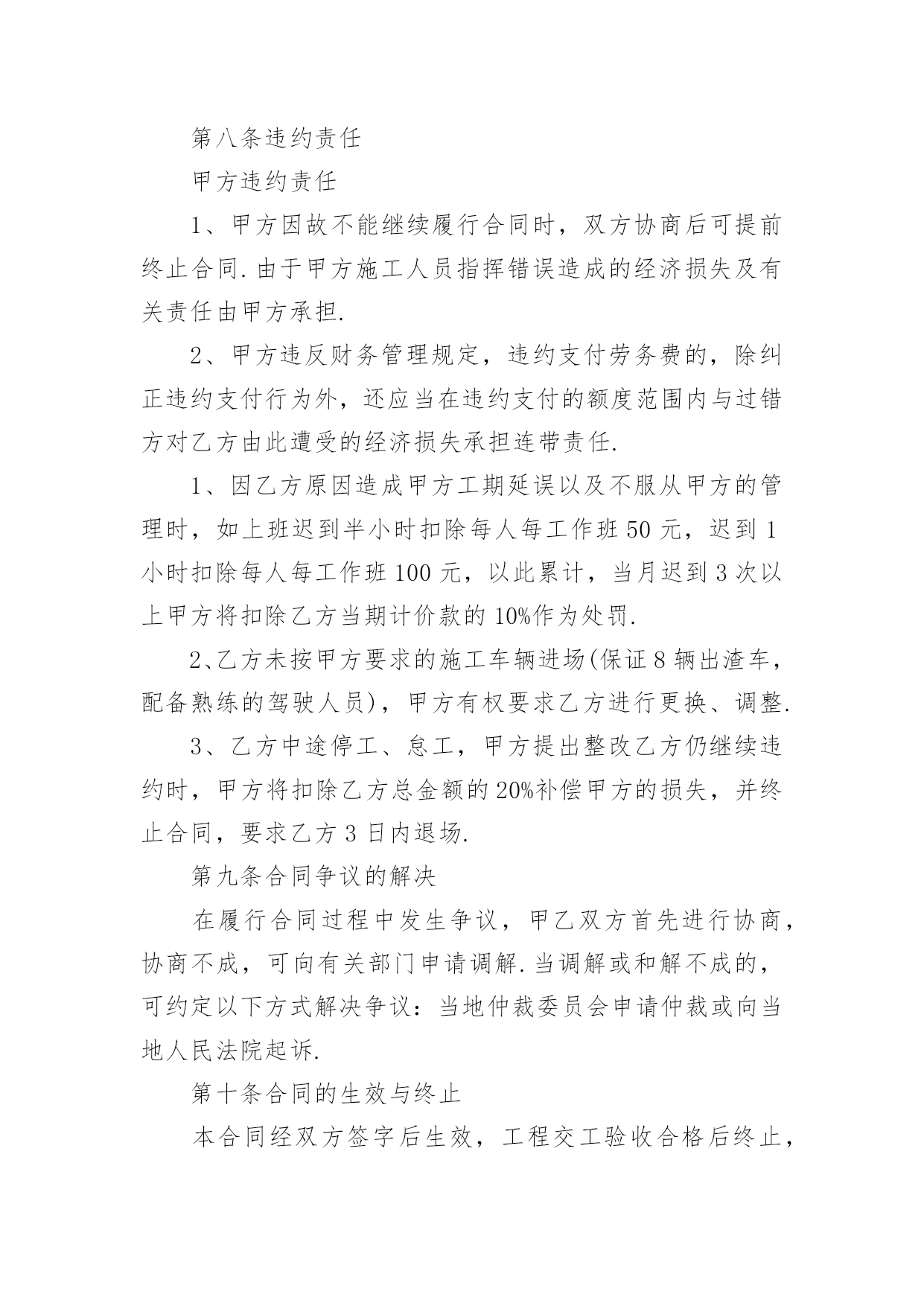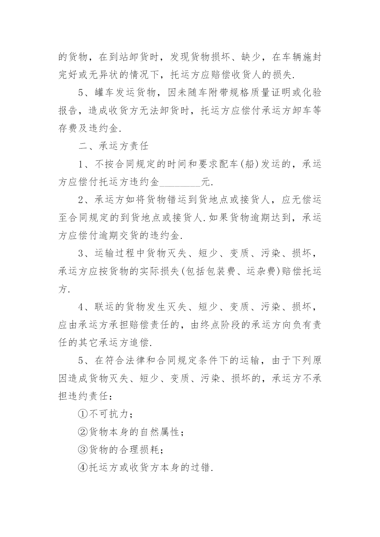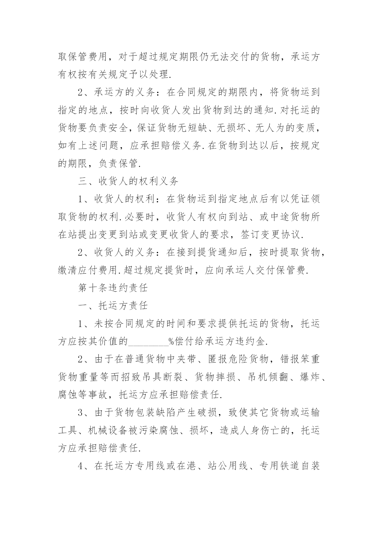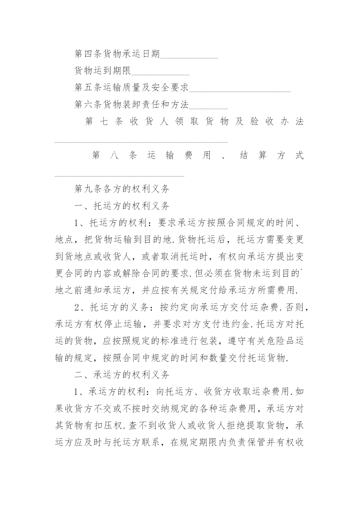 物流运输合同协议书物流运输合同范本协议书在日常生活和工作中,大家逐渐认识到协议的重要性,签订协议可以使双方受到法律的保护。大家知道协议的格式吗?以下是小编为大家收集的物流运输合同范本协议书,欢迎大家借鉴与参考,希望对大家有所帮助。物流运输合同范本协议书1甲方:_________--(以下简称甲方)乙方:____________-(以下简称乙方)根据《中华人民共和国合同法》及其它有关法律法规,遵循平等自愿、公正和诚实信用的原则,甲乙双方就建设工程劳务合作事项协商一致,订立本合同.第一条工程施工内容洞身土石方的运输.第二条合同工期工期以进洞时间开始计算,15个月以内完成.第三条合同价款第四条结算和支付1、合同价款的结算:施工期间按建设单位批复的当期计量进度进行结算,工程完成后,进行末次结算.2、合同价款的支付:当期工程价款按工程量结算单支付至70%,当期支付价款时,乙方需提供工人工资表,由甲方财务支付工资,支付工资后余下价款为乙方所得.工程完工,安全、进度能满足甲方要求的情况下进行末次结算,结算经甲乙双方共同确认后3个月内支付至90%.其余10%半年内付清.第五条安全施工及安全事故处理安全施工:甲方、乙方必须贯彻、执行国家和政府、行业主管部门颁布实施的有关安全生产的法律法规及各项规定,严格按安全标准组织施工,如乙方违章施工造成的安全责任由乙方自行承担全部的责任.1、发生重大伤亡事故,甲乙双方应采取紧急措施防止事态扩大并全力组织抢救伤者,保护事故现场并作出书面记录.2、按照有关规定,甲方乙方应分清责任,事故责任方承担相应的责任.甲乙双方对事故责任有争议时,应按政府有关部门的认定处理.第六条甲方的权利及义务甲方负责组织检查、验收,监督乙方的工程进度、安全施工,负责解决施工中存在或发生的.问题.第七条乙方的权利和义务乙方对与其确定劳动关系的作业工人必须认真审查,保证人员的政治素质、身体健康和技术水平,工人年龄不得低于18周岁,不得超过60周岁.乙方需将其作业人员登记造册(须写明姓名、性别、年龄、籍贯、工种、级别、工作证号码及身份证号码),作为本合同附件.第八条违约责任甲方违约责任1、甲方因故不能继续履行合同时,双方协商后可提前终止合同.由于甲方施工人员指挥错误造成的经济损失及有关责任由甲方承担.2、甲方违反财务管理规定,违约支付劳务费的,除纠正违约支付行为外,还应当在违约支付的额度范围内与过错方对乙方由此遭受的经济损失承担连带责任.1、因乙方原因造成甲方工期延误以及不服从甲方的管理时,如上班迟到半小时扣除每人每工作班50元,迟到1小时扣除每人每工作班100元,以此累计,当月迟到3次以上甲方将扣除乙方当期计价款的10%作为处罚.2、乙方未按甲方要求的施工车辆进场(保证8辆出渣车,配备熟练的驾驶人员),甲方有权要求乙方进行更换、调整.3、乙方中途停工、怠工,甲方提出整改乙方仍继续违约时,甲方将扣除乙方总金额的20%补偿甲方的损失,并终止合同,要求乙方3日内退场.第九条合同争议的解决在履行合同过程中发生争议,甲乙双方首先进行协商,协商不成,可向有关部门申请调解.当调解或和解不成的,可约定以下方式解决争议:当地仲裁委员会申请仲裁或向当地人民法院起诉.第十条合同的生效与终止本合同经双方签字后生效,工程交工验收合格后终止,双方代表人应出示身份证明.本合同正本一式四份,具有同等法律效力,甲方持两份,乙方持两份.本合同未尽事宜可经双方协商后列入其他事项,其他事项与正文具有同等效力.在本合同之外签订的协议等,内容与本合同相抵触者无效.甲方(盖章):__________________乙方:_________________________代表人(签字):________________身份证号码:_____________________________年________月_______日_________年________月_______日物流运输合同范本协议书2托运方:____________;(以下简称甲方)承运方:____________.(以下简称乙方)托运方详细地址:____________收货方详细地址:____________根据国家有关运输规定,经过双方充分协商,特订立本合同,以便双方共同遵守.第一条货物名称、规格、数量、价款第二条包装要求托运方必须按照国家主管机关规定的标准包装;没有统一规定包装标准的,应根据保证货物运输安全的原则进行包装,否则承运方有权拒绝承运.第三条货物起运地点____________货物到达地点____________第四条货物承运日期____________货物运到期限____________第五条运输质量及安全要求_____________________第六条货物装卸责任和方法________第七条收货