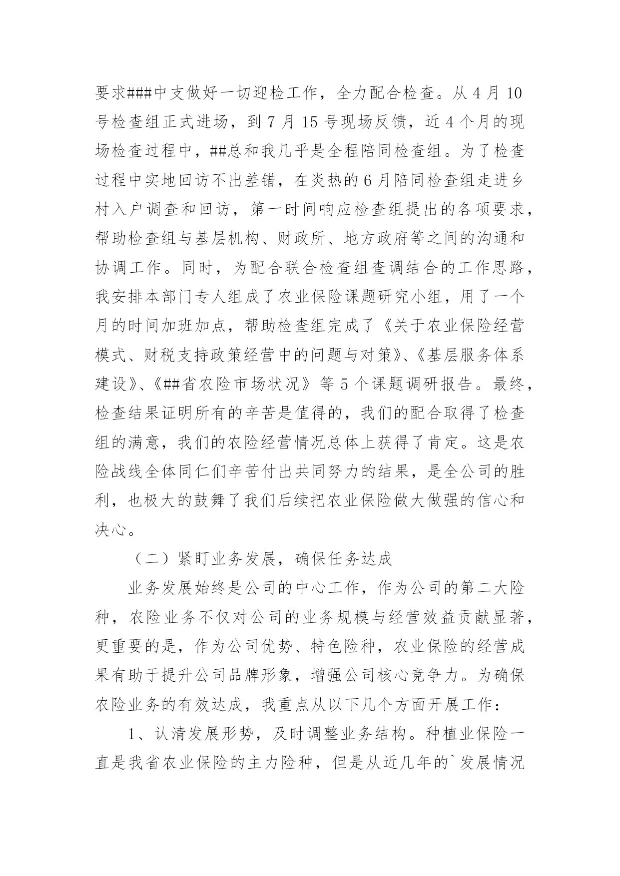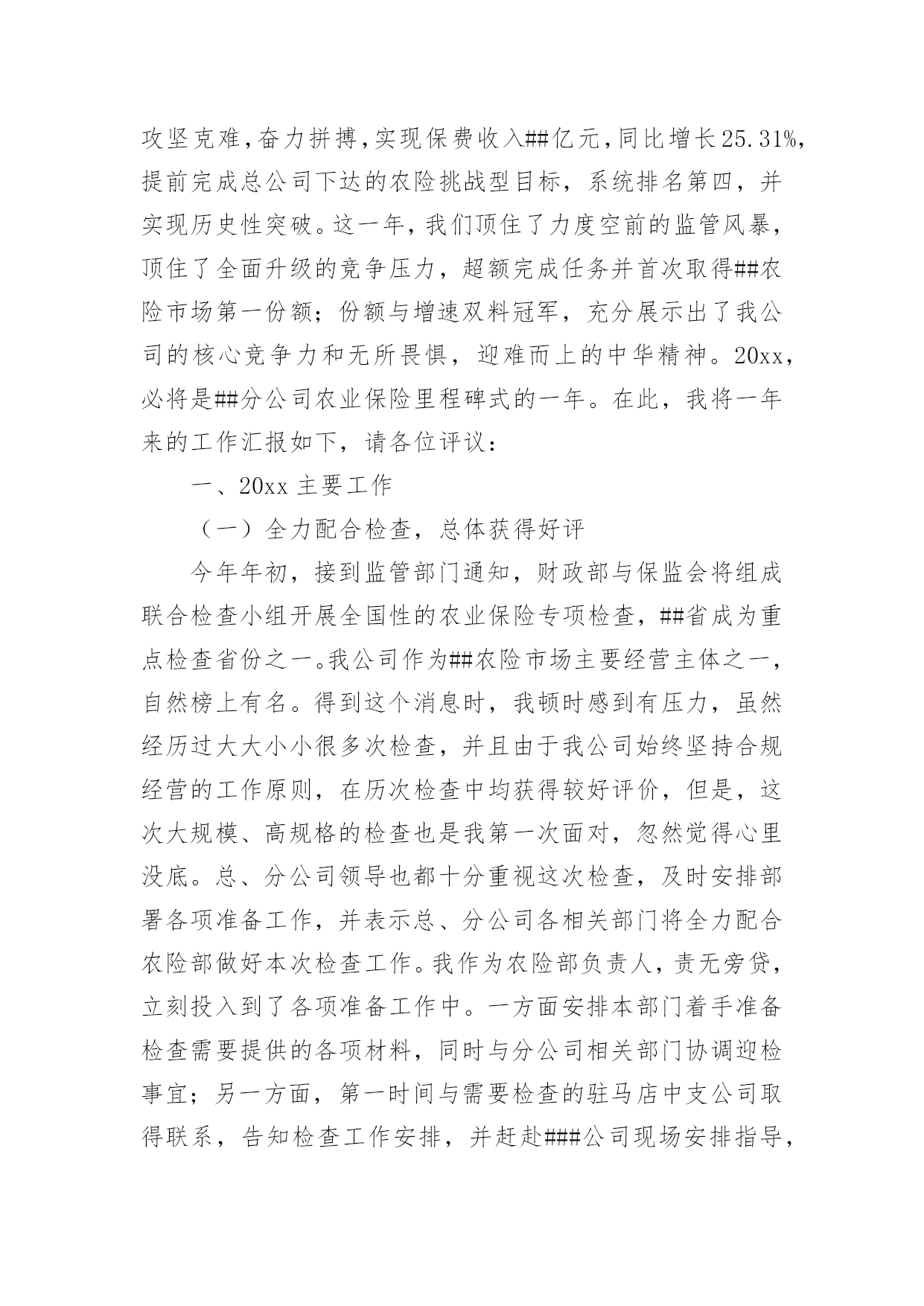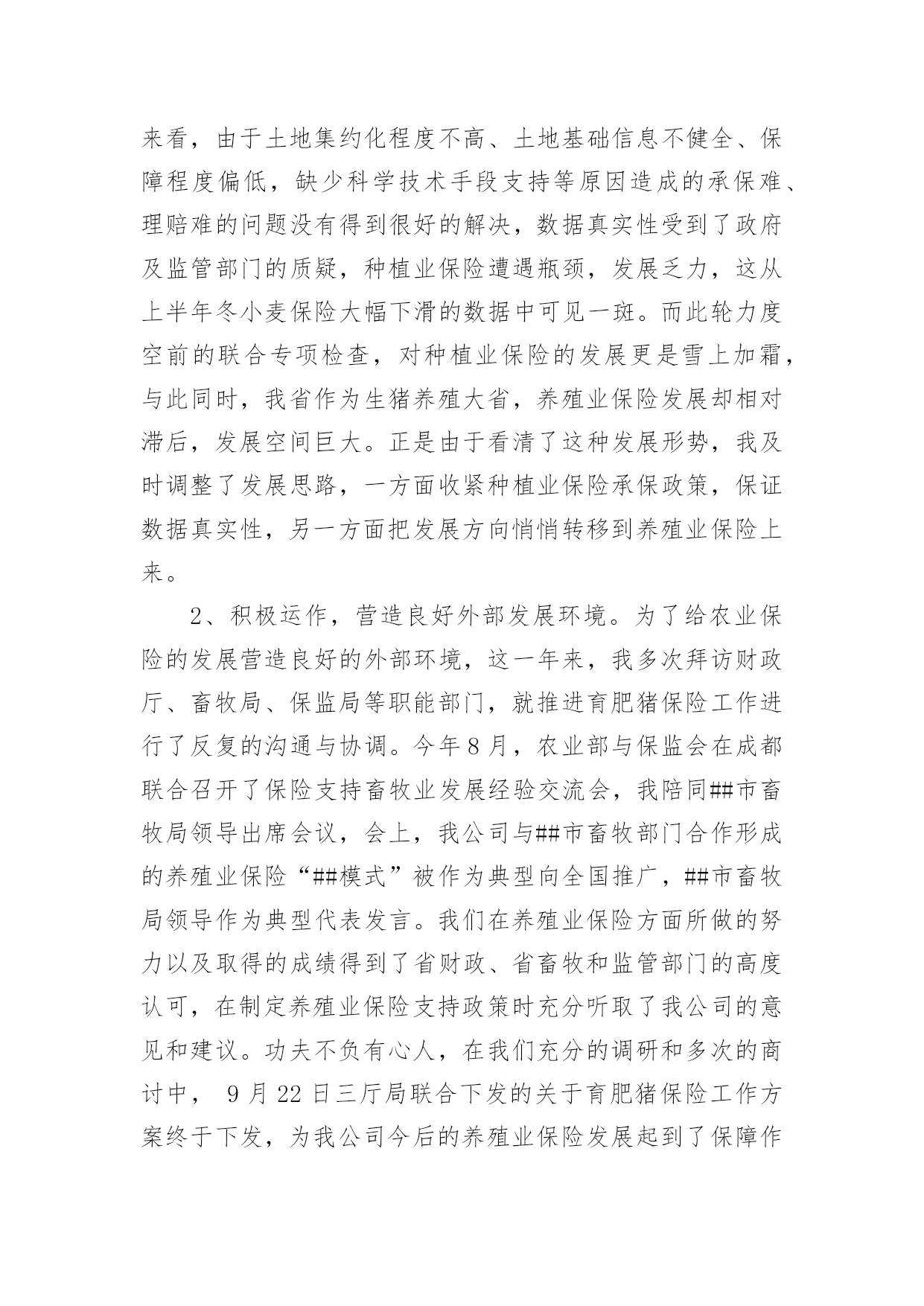 保险公司述职报告【推荐】保险公司述职报告在经济发展迅速的今天,报告使用的次数愈发增长,报告具有语言陈述性的特点。那么报告应该怎么写才合适呢?下面是小编帮大家整理的保险公司述职报告,仅供参考,希望能够帮助到大家。保险公司述职报告1尊敬的各位领导、各位同仁:转眼间,又到了年末,20xx就这样在忙忙碌碌中不知不觉的过去,但这一年,仿佛过的格外快。回想一年前的今天,刚刚经历了20xx年农险在重重压力下实现突破发展,我显得信心满满,所以当面对今年5.2亿的全年任务时,比起压力,更多的是挑战新高度的欲望和信心。如今,20xx已尘埃落定,全年任务超额完成,终于松了一口气。面对这样的结果,有不负众望的轻松和喜悦,也有这一年忙碌的感悟与思考。比起最初的踌躇满志,现在我更多的是对这一年来农险经历曲折发展的感悟和对未来发展的冷静思考。今年以来,在分公司的正确领导下、在机关各部门的支持配合和农险条线全体同仁的通力合作下,紧紧围绕公司农险业务发展战略部署,坚持“发展为中心、效益为目标、合规为底线、抢抓机遇、加快发展”的工作思路,上下一心,攻坚克难,奋力拼搏,实现保费收入##亿元,同比增长25.31%,提前完成总公司下达的农险挑战型目标,系统排名第四,并实现历史性突破。这一年,我们顶住了力度空前的监管风暴,顶住了全面升级的竞争压力,超额完成任务并首次取得##农险市场第一份额;份额与增速双料冠军,充分展示出了我公司的核心竞争力和无所畏惧,迎难而上的中华精神。20xx,必将是##分公司农业保险里程碑式的一年。在此,我将一年来的工作汇报如下,请各位评议:一、20xx主要工作(一)全力配合检查,总体获得好评今年年初,接到监管部门通知,财政部与保监会将组成联合检查小组开展全国性的农业保险专项检查,##省成为重点检查省份之一。我公司作为##农险市场主要经营主体之一,自然榜上有名。得到这个消息时,我顿时感到有压力,虽然经历过大大小小很多次检查,并且由于我公司始终坚持合规经营的工作原则,在历次检查中均获得较好评价,但是,这次大规模、高规格的检查也是我第一次面对,忽然觉得心里没底。总、分公司领导也都十分重视这次检查,及时安排部署各项准备工作,并表示总、分公司各相关部门将全力配合农险部做好本次检查工作。我作为农险部负责人,责无旁贷,立刻投入到了各项准备工作中。一方面安排本部门着手准备检查需要提供的各项材料,同时与分公司相关部门协调迎检事宜;另一方面,第一时间与需要检查的驻马店中支公司取得联系,告知检查工作安排,并赶赴###公司现场安排指导,要求###中支做好一切迎检工作,全力配合检查。从4月10号检查组正式进场,到7月15号现场反馈,近4个月的现场检查过程中,##总和我几乎是全程陪同检查组。为了检查过程中实地回访不出差错,在炎热的6月陪同检查组走进乡村入户调查和回访,第一时间响应检查组提出的各项要求,帮助检查组与基层机构、财政所、地方政府等之间的沟通和协调工作。同时,为配合联合检查组查调结合的工作思路,我安排本部门专人组成了农业保险课题研究小组,用了一个月的时间加班加点,帮助检查组完成了《关于农业保险经营模式、财税支持政策经营中的问题与对策》、《基层服务体系建设》、《##省农险市场状况》等5个课题调研报告。最终,检查结果证明所有的辛苦是值得的,我们的配合取得了检查组的满意,我们的农险经营情况总体上获得了肯定。这是农险战线全体同仁们辛苦付出共同努力的结果,是全公司的胜利,也极大的鼓舞了我们后续把农业保险做大做强的信心和决心。(二)紧盯业务发展,确保任务达成业务发展始终是公司的中心工作,作为公司的第二大险种,农险业务不仅对公司的业务规模与经营效益贡献显著,更重要的是,作为公司优势、特色险种,农业保险的经营成果有助于提升公司品牌形象,增强公司核心竞争力。为确保农险业务的有效达成,我重点从以下几个方面开展工作:1、认清发展形势,及时调整业务结构。种植业保险一直是我省农业保险的主力险种,但是从近几年的`发展情况来看,由于土地集约化程度不高、土地基础信息不健全、保障程度偏低,缺少科学技术手段支持等原因造成的承保难、理赔难的问题没有得到很好的解决,数据真实性受到了政府及监管部门的质疑,种植业保险遭遇瓶颈,发展乏力,这从上半年冬小麦保险大幅下滑的数据中可见一斑。而此轮力度空前的联合专项检查,对种植业保险的发展更是雪上加霜,与此同时,我省作为生猪养殖大省,养殖业保险发展却相对滞后,发展空间巨大。正是由于看清了这种发展形势,我及时调整了发展思路,一方面收紧种植业保险承保政策,保证数据真实性,另一方面把发展方向悄悄转移到养殖业保险上来。2、积极运作,营造良好外部发展环境。为了给农业保险的发展营造良好的外部环境,这一年来,我多次拜访财政厅、畜牧局、保监局等职能部门,就推进育肥猪保险工作进行了反