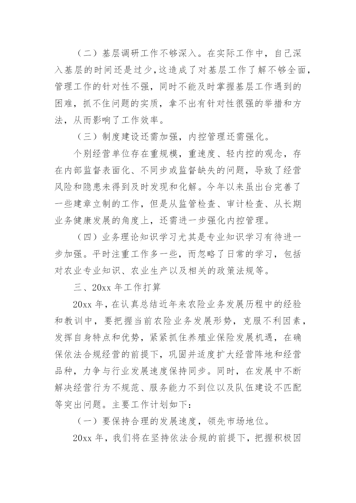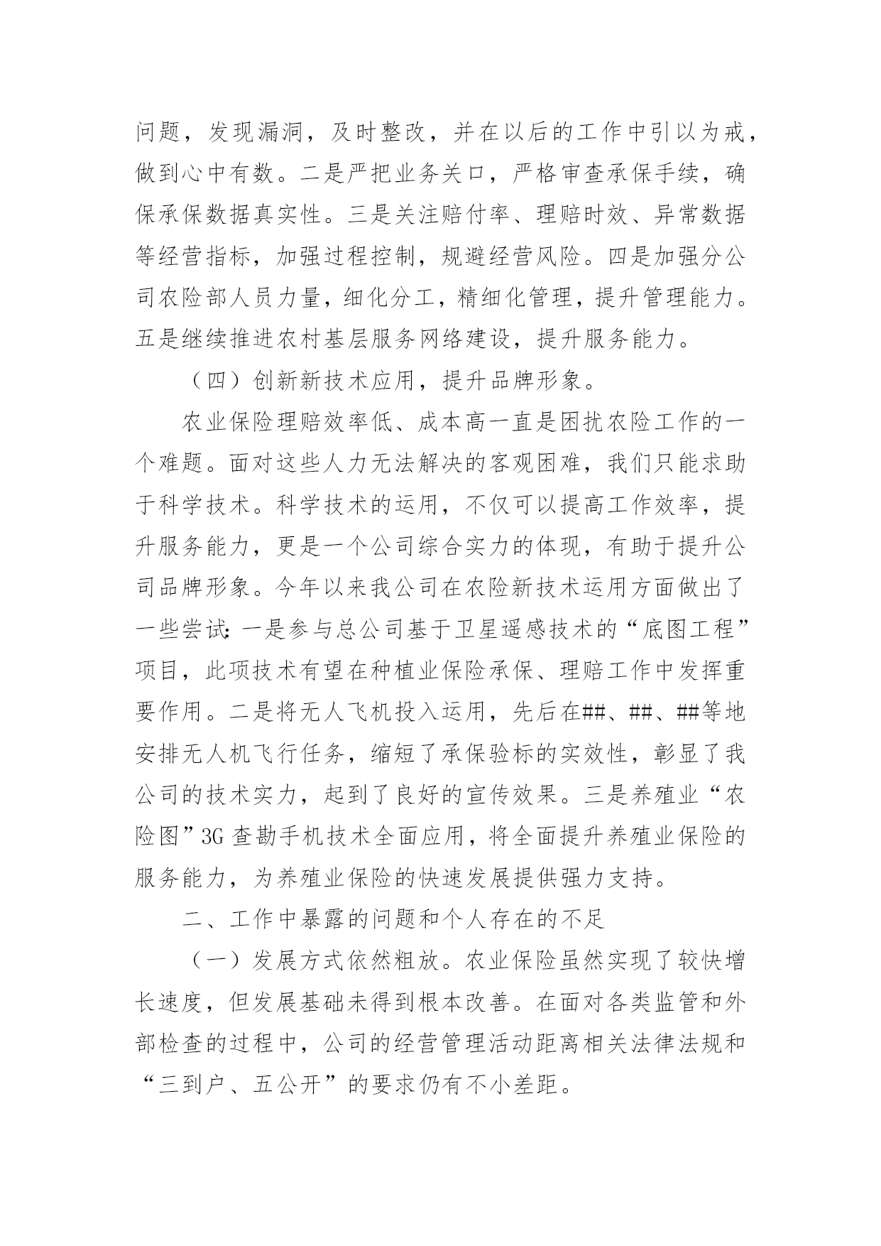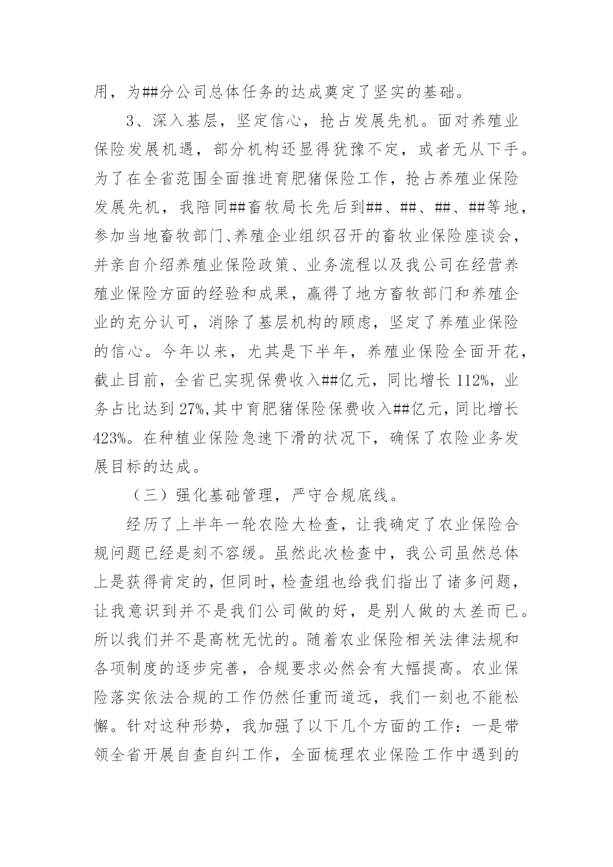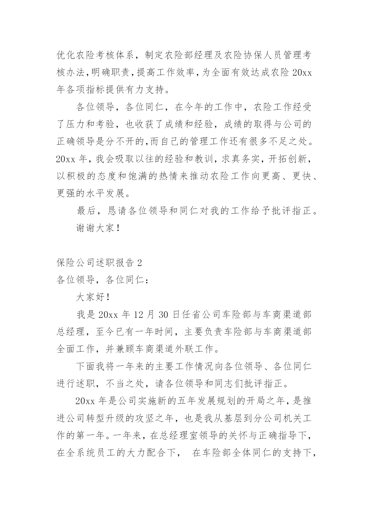 保险公司述职报告【推荐】保险公司述职报告在经济发展迅速的今天,报告使用的次数愈发增长,报告具有语言陈述性的特点。那么报告应该怎么写才合适呢?下面是小编帮大家整理的保险公司述职报告,仅供参考,希望能够帮助到大家。保险公司述职报告1尊敬的各位领导、各位同仁:转眼间,又到了年末,20xx就这样在忙忙碌碌中不知不觉的过去,但这一年,仿佛过的格外快。回想一年前的今天,刚刚经历了20xx年农险在重重压力下实现突破发展,我显得信心满满,所以当面对今年5.2亿的全年任务时,比起压力,更多的是挑战新高度的欲望和信心。如今,20xx已尘埃落定,全年任务超额完成,终于松了一口气。面对这样的结果,有不负众望的轻松和喜悦,也有这一年忙碌的感悟与思考。比起最初的踌躇满志,现在我更多的是对这一年来农险经历曲折发展的感悟和对未来发展的冷静思考。今年以来,在分公司的正确领导下、在机关各部门的支持配合和农险条线全体同仁的通力合作下,紧紧围绕公司农险业务发展战略部署,坚持“发展为中心、效益为目标、合规为底线、抢抓机遇、加快发展”的工作思路,上下一心,攻坚克难,奋力拼搏,实现保费收入##亿元,同比增长25.31%,提前完成总公司下达的农险挑战型目标,系统排名第四,并实现历史性突破。这一年,我们顶住了力度空前的监管风暴,顶住了全面升级的竞争压力,超额完成任务并首次取得##农险市场第一份额;份额与增速双料冠军,充分展示出了我公司的核心竞争力和无所畏惧,迎难而上的中华精神。20xx,必将是##分公司农业保险里程碑式的一年。在此,我将一年来的工作汇报如下,请各位评议:一、20xx主要工作(一)全力配合检查,总体获得好评今年年初,接到监管部门通知,财政部与保监会将组成联合检查小组开展全国性的农业保险专项检查,##省成为重点检查省份之一。我公司作为##农险市场主要经营主体之一,自然榜上有名。得到这个消息时,我顿时感到有压力,虽然经历过大大小小很多次检查,并且由于我公司始终坚持合规经营的工作原则,在历次检查中均获得较好评价,但是,这次大规模、高规格的检查也是我第一次面对,忽然觉得心里没底。总、分公司领导也都十分重视这次检查,及时安排部署各项准备工作,并表示总、分公司各相关部门将全力配合农险部做好本次检查工作。我作为农险部负责人,责无旁贷,立刻投入到了各项准备工作中。一方面安排本部门着手准备检查需要提供的各项材料,同时与分公司相关部门协调迎检事宜;另一方面,第一时间与需要检查的驻马店中支公司取得联系,告知检查工作安排,并赶赴###公司现场安排指导,要求###中支做好一切迎检工作,全力配合检查。从4月10号检查组正式进场,到7月15号现场反馈,近4个月的现场检查过程中,##总和我几乎是全程陪同检查组。为了检查过程中实地回访不出差错,在炎热的6月陪同检查组走进乡村入户调查和回访,第一时间响应检查组提出的各项要求,帮助检查组与基层机构、财政所、地方政府等之间的沟通和协调工作。同时,为配合联合检查组查调结合的工作思路,我安排本部门专人组成了农业保险课题研究小组,用了一个月的时间加班加点,帮助检查组完成了《关于农业保险经营模式、财税支持政策经营中的问题与对策》、《基层服务体系建设》、《##省农险市场状况》等5个课题调研报告。最终,检查结果证明所有的辛苦是值得的,我们的配合取得了检查组的满意,我们的农险经营情况总体上获得了肯定。这是农险战线全体同仁们辛苦付出共同努力的结果,是全公司的胜利,也极大的鼓舞了我们后续把农业保险做大做强的信心和决心。(二)紧盯业务发展,确保任务达成业务发展始终是公司的中心工作,作为公司的第二大险种,农险业务不仅对公司的业务规模与经营效益贡献显著,更重要的是,作为公司优势、特色险种,农业保险的经营成果有助于提升公司品牌形象,增强公司核心竞争力。为确保农险业务的有效达成,我重点从以下几个方面开展工作:1、认清发展形势,及时调整业务结构。种植业保险一直是我省农业保险的主力险种,但是从近几年的`发展情况来看,由于土地集约化程度不高、土地基础信息不健全、保障程度偏低,缺少科学技术手段支持等原因造成的承保难、理赔难的问题没有得到很好的解决,数据真实性受到了政府及监管部门的质疑,种植业保险遭遇瓶颈,发展乏力,这从上半年冬小麦保险大幅下滑的数据中可见一斑。而此轮力度空前的联合专项检查,对种植业保险的发展更是雪上加霜,与此同时,我省作为生猪养殖大省,养殖业保险发展却相对滞后,发展空间巨大。正是由于看清了这种发展形势,我及时调整了发展思路,一方面收紧种植业保险承保政策,保证数据真实性,另一方面把发展方向悄悄转移到养殖业保险上来。2、积极运作,营造良好外部发展环境。为了给农业保险的发展营造良好的外部环境,这一年来,我多次拜访财政厅、畜牧局、保监局等职能部门,就推进育肥猪保险工作进行了反