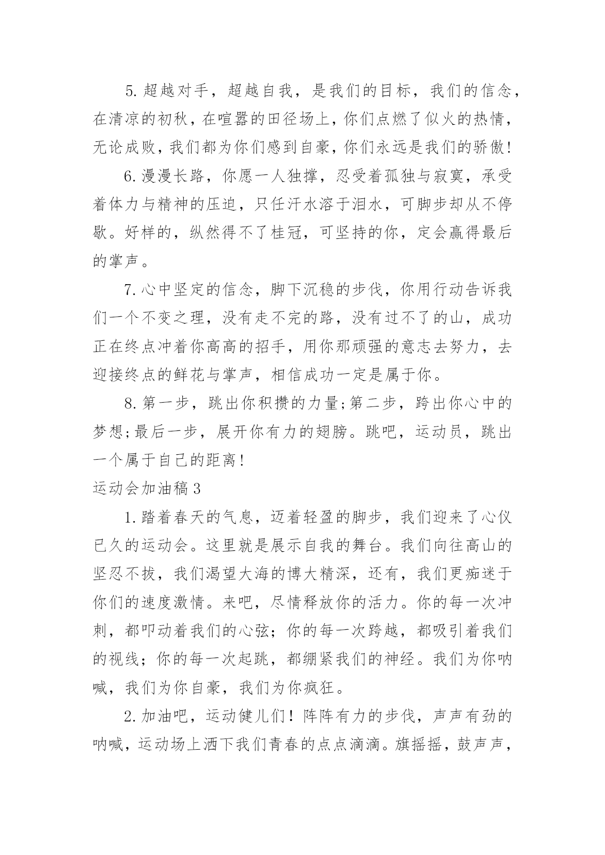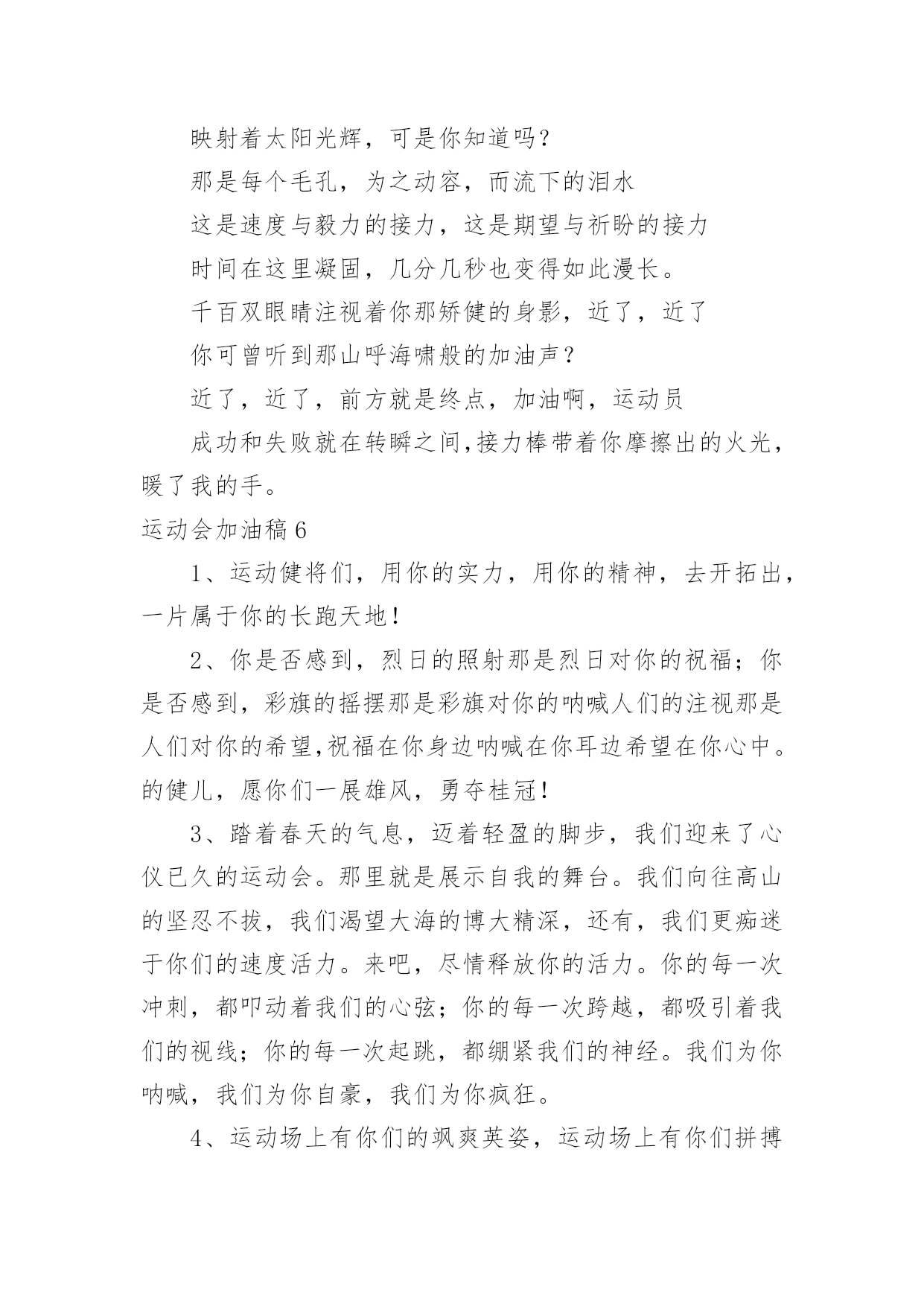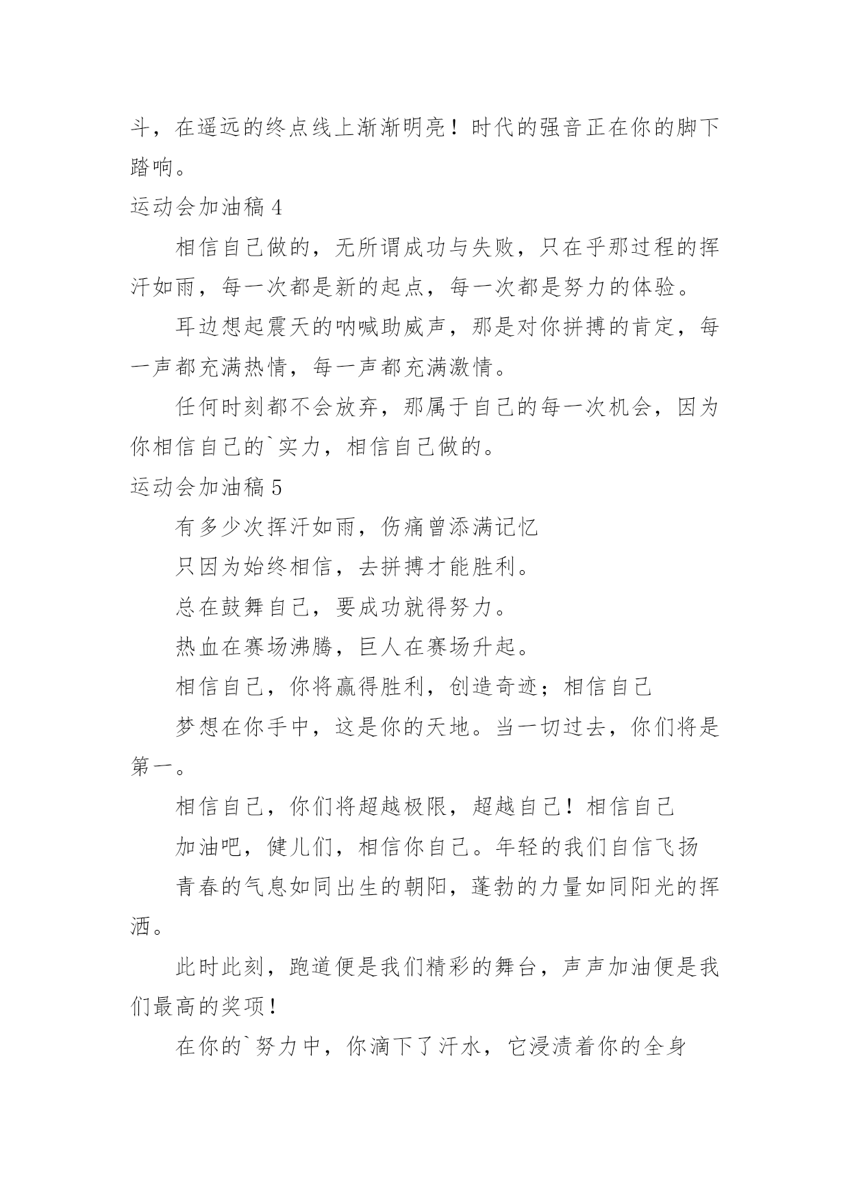 运动会加油稿运动会加油稿15篇(优秀)在不断进步的社会中,我们越来越需要加油稿,借助加油稿可以激励他人的士气。那要怎么写好加油稿呢?以下是小编帮大家整理的运动会加油稿,欢迎阅读,希望大家能够喜欢。运动会加油稿11、看,终点就在眼前,听,同学为你呼喊。鼓起勇气奋力向前,用你的荣誉带给我们希望。2、看!那一面面迎风飘舞的彩旗,是一朵朵盛开的鲜花;听!那一阵阵惊天动地的欢呼,是回响在耳边胜利的风声。运动场上的你们,是胜利的标志,运动场上的你们,是青春的赞叹。去吧!去迎接那伟大的挑战,去吧!去做一名追风的少年。3、人生的路,有坦途,也有坎坷;做过的岁月,有欢笑,也有苦涩,泪水告诉我一个跌倒的故事,汗水使我多了一份沉重,几多成熟。4、也许流星并不少见,但它燃一烧的刹那,留给人间最美丽的回忆!也许笑脸并不少见,但胜利的喜悦,总会留给世界精彩的一瞬!是的,那些曾经美妙的东西只有短短的一瞬间,但那却把最辉煌的一刻留给了人间。胜利,是每个人所追求的,胜利的喜悦,是胜利与重新开始的转折,胜利是新的开始!5、不长不短的距离,需要的`是全身心全程投入,自始至终你们都在拼全力此时此刻,你们处在最风光的一刻,无论第几坚持胜利的信心,只要跑下来,你们就是英雄6、时间在流逝,赛道在延伸,成功在你面前展现心脏的跳动,热血在沸腾,辉煌在你脚下铸就加油吧,健儿们,7、这是意志的拼搏。这是速度的挑战。胜利在向你们招手/胜利在向你们呼唤8、不为鲜花的围绕,不为刹那的荣耀,只有执着的信念,化作不停的奔跑,心中燃一烧着梦想,脚下不停的步伐,9、运动场上有你们的飒爽英姿,运动场上有你们拼搏的身影,面对漫漫的征程,你没有畏惧和退缩,任汗水打湿脊背,任疲惫爬满全身,依然分离追赶,只有一个目标,只有一个信念,为班级赢得荣誉,拼搏吧,我为你们呐喊,加油,10、场上英姿显自豪,脚下步伐在飞奔。你们是骄傲。你们是自豪,跑道因你幻彩,面对红色跑道,你们挥洒自如,不惧一切冲向重点,11、面对艰苦的征程,你们毫不畏惧,接力棒在你们手中传递着集体的力量,听,我们在为你呐喊,你们诠释着奥运的精神,你们是我们心中的骄傲,深深的呼吸,等待你的是艰难的800米。相信胜利会属于你们,但在这征一途上,需要你勇敢的心去面对。我们在为你加油,你是否听到了我们发自内心的呐喊,困难和胜利都在向你招手,去呀,不要犹豫,快去击败困难,快去夺取胜利,相信你会送给我们一个汗水浸一湿的微笑12、你用行动述说着过城的重要,没有无尽的终点,没有无法攀登的险峰,希望载着终点在向你微笑,拼搏吧!经历是一种精彩,迸发你全部的能量,成功是你汗水的写照。运动会加油稿21.倘若力量来自呼吸,呼吸来自生命,生命的真谛注释力量的永恒,呼吸的瞬间注释生命的价值,南无呼吸的艰难,力量的渐逝在此刻都可得到最美的解释,将这美坚持到底,即使失败,也觉得无怨无悔。2.泰戈尔在诗中说,天空没有翅膀的影子,但我已飞过;艾青对朋友说,也许有人到达不了彼岸,但我们共同拥有大海。也许你们没有显赫的成绩,但运动场上留下了你们的足迹。也许你们没有奖品,但我们心中留下了你们拼搏的身影。所有的努力都是为了迎接这一刹那,所有的拼搏都是为了这一声令下。3.你是否感到,烈日的照射那是烈日对你的祝福;你是否感到,彩旗的摇摆那是彩旗对你的'呐喊人们的注视那是人们对你的希望,祝福在你身边呐喊在你耳边希望在你心中。的健儿,愿你们一展雄风,勇夺桂冠!4.坚定而又有力量,眼睛看着的不是眼前的跑道,而是那最终的目标,不管汗洒如雨,步伐迟缓到后,不退缩,不气馁,加油,健儿!5.超越对手,超越自我,是我们的目标,我们的信念,在清凉的初秋,在喧嚣的田径场上,你们点燃了似火的热情,无论成败,我们都为你们感到自豪,你们永远是我们的骄傲!6.漫漫长路,你愿一人独撑,忍受着孤独与寂寞,承受着体力与精神的压迫,只任汗水溶于泪水,可脚步却从不停歇。好样的,纵然得不了桂冠,可坚持的你,定会赢得最后的掌声。7.心中坚定的信念,脚下沉稳的步伐,你用行动告诉我们一个不变之理,没有走不完的路,没有过不了的山,成功正在终点冲着你高高的招手,用你那顽强的意志去努力,去迎接终点的鲜花与掌声,相信成功一定是属于你。8.第一步,跳出你积攒的力量;第二步,跨出你心中的梦想;最后一步,展开你有力的翅膀。跳吧,运动员,跳出一个属于自己的距离!运动会加油稿31.踏着春天的气息,迈着轻盈的脚步,我们迎来了心仪已久的运动会。这里就是展示自我的舞台。我们向往高山的坚忍不拔,我们渴望大海的博大精深,还有,我们更痴迷于你们的速度激情。来吧,尽情释放你的活力。你的每一次冲刺,都叩动着我们的心弦;你的每一次跨越,都吸引着我们的视线;你的每一次起跳,都绷紧我们的神经。我们为你呐喊,我们为你自豪,我们为你疯狂。2.加油吧,运动健儿们!阵阵有力的步伐,