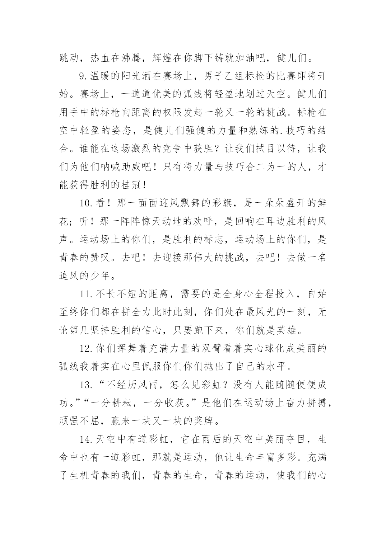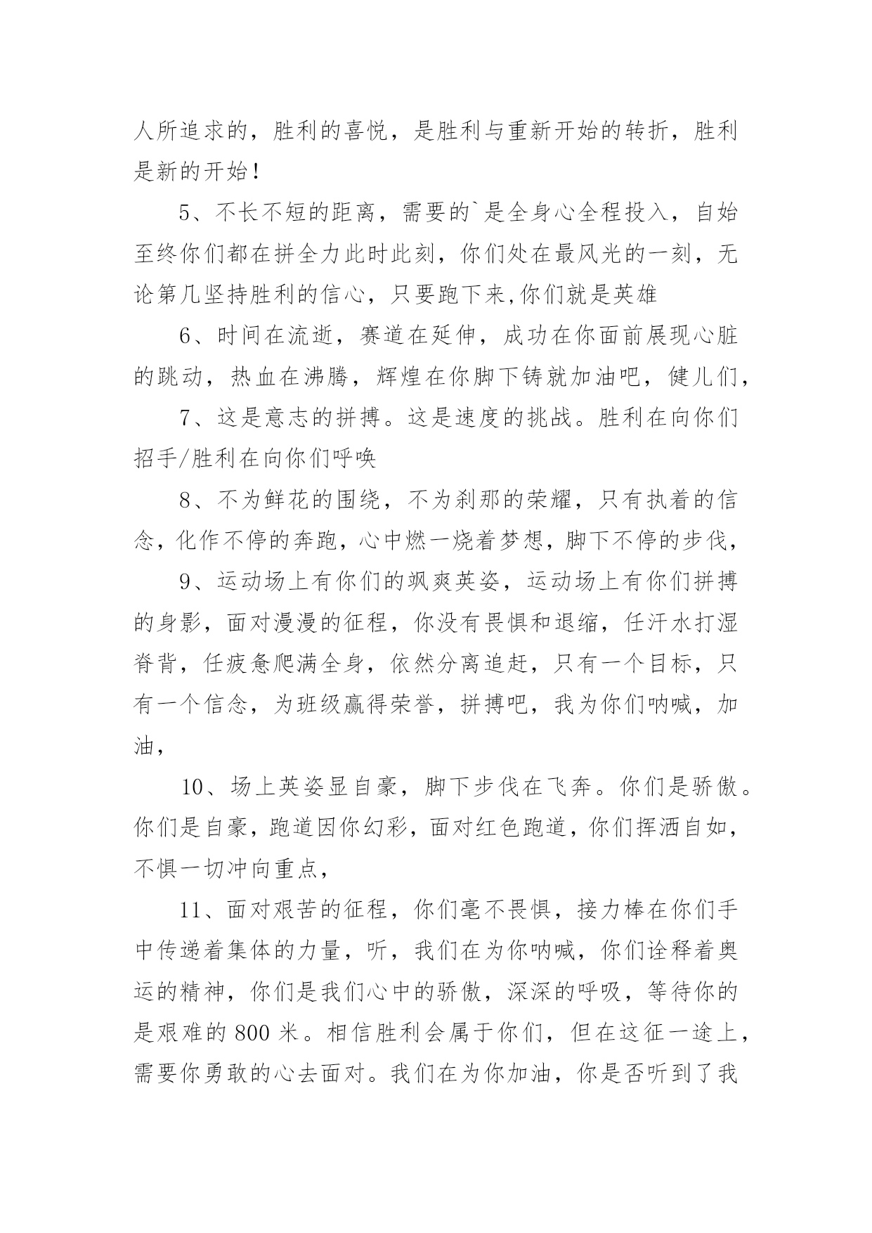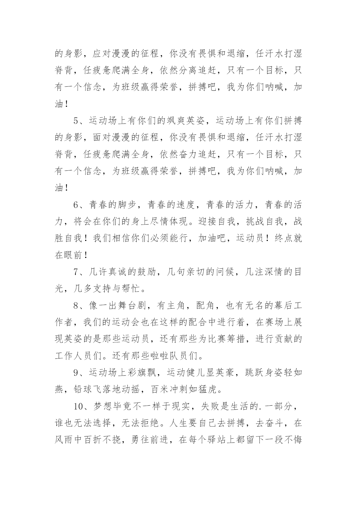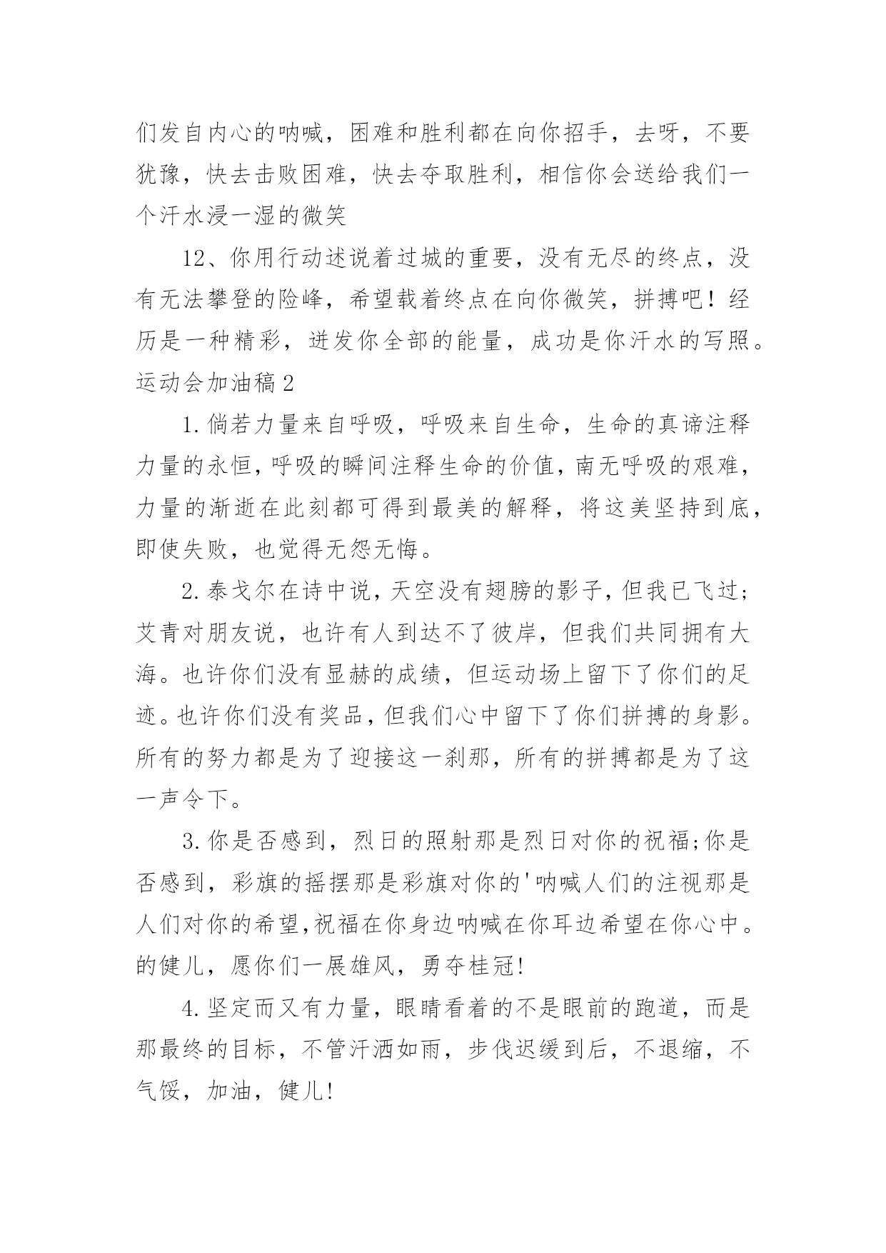 运动会加油稿运动会加油稿15篇(优秀)在不断进步的社会中,我们越来越需要加油稿,借助加油稿可以激励他人的士气。那要怎么写好加油稿呢?以下是小编帮大家整理的运动会加油稿,欢迎阅读,希望大家能够喜欢。运动会加油稿11、看,终点就在眼前,听,同学为你呼喊。鼓起勇气奋力向前,用你的荣誉带给我们希望。2、看!那一面面迎风飘舞的彩旗,是一朵朵盛开的鲜花;听!那一阵阵惊天动地的欢呼,是回响在耳边胜利的风声。运动场上的你们,是胜利的标志,运动场上的你们,是青春的赞叹。去吧!去迎接那伟大的挑战,去吧!去做一名追风的少年。3、人生的路,有坦途,也有坎坷;做过的岁月,有欢笑,也有苦涩,泪水告诉我一个跌倒的故事,汗水使我多了一份沉重,几多成熟。4、也许流星并不少见,但它燃一烧的刹那,留给人间最美丽的回忆!也许笑脸并不少见,但胜利的喜悦,总会留给世界精彩的一瞬!是的,那些曾经美妙的东西只有短短的一瞬间,但那却把最辉煌的一刻留给了人间。胜利,是每个人所追求的,胜利的喜悦,是胜利与重新开始的转折,胜利是新的开始!5、不长不短的距离,需要的`是全身心全程投入,自始至终你们都在拼全力此时此刻,你们处在最风光的一刻,无论第几坚持胜利的信心,只要跑下来,你们就是英雄6、时间在流逝,赛道在延伸,成功在你面前展现心脏的跳动,热血在沸腾,辉煌在你脚下铸就加油吧,健儿们,7、这是意志的拼搏。这是速度的挑战。胜利在向你们招手/胜利在向你们呼唤8、不为鲜花的围绕,不为刹那的荣耀,只有执着的信念,化作不停的奔跑,心中燃一烧着梦想,脚下不停的步伐,9、运动场上有你们的飒爽英姿,运动场上有你们拼搏的身影,面对漫漫的征程,你没有畏惧和退缩,任汗水打湿脊背,任疲惫爬满全身,依然分离追赶,只有一个目标,只有一个信念,为班级赢得荣誉,拼搏吧,我为你们呐喊,加油,10、场上英姿显自豪,脚下步伐在飞奔。你们是骄傲。你们是自豪,跑道因你幻彩,面对红色跑道,你们挥洒自如,不惧一切冲向重点,11、面对艰苦的征程,你们毫不畏惧,接力棒在你们手中传递着集体的力量,听,我们在为你呐喊,你们诠释着奥运的精神,你们是我们心中的骄傲,深深的呼吸,等待你的是艰难的800米。相信胜利会属于你们,但在这征一途上,需要你勇敢的心去面对。我们在为你加油,你是否听到了我们发自内心的呐喊,困难和胜利都在向你招手,去呀,不要犹豫,快去击败困难,快去夺取胜利,相信你会送给我们一个汗水浸一湿的微笑12、你用行动述说着过城的重要,没有无尽的终点,没有无法攀登的险峰,希望载着终点在向你微笑,拼搏吧!经历是一种精彩,迸发你全部的能量,成功是你汗水的写照。运动会加油稿21.倘若力量来自呼吸,呼吸来自生命,生命的真谛注释力量的永恒,呼吸的瞬间注释生命的价值,南无呼吸的艰难,力量的渐逝在此刻都可得到最美的解释,将这美坚持到底,即使失败,也觉得无怨无悔。2.泰戈尔在诗中说,天空没有翅膀的影子,但我已飞过;艾青对朋友说,也许有人到达不了彼岸,但我们共同拥有大海。也许你们没有显赫的成绩,但运动场上留下了你们的足迹。也许你们没有奖品,但我们心中留下了你们拼搏的身影。所有的努力都是为了迎接这一刹那,所有的拼搏都是为了这一声令下。3.你是否感到,烈日的照射那是烈日对你的祝福;你是否感到,彩旗的摇摆那是彩旗对你的'呐喊人们的注视那是人们对你的希望,祝福在你身边呐喊在你耳边希望在你心中。的健儿,愿你们一展雄风,勇夺桂冠!4.坚定而又有力量,眼睛看着的不是眼前的跑道,而是那最终的目标,不管汗洒如雨,步伐迟缓到后,不退缩,不气馁,加油,健儿!5.超越对手,超越自我,是我们的目标,我们的信念,在清凉的初秋,在喧嚣的田径场上,你们点燃了似火的热情,无论成败,我们都为你们感到自豪,你们永远是我们的骄傲!6.漫漫长路,你愿一人独撑,忍受着孤独与寂寞,承受着体力与精神的压迫,只任汗水溶于泪水,可脚步却从不停歇。好样的,纵然得不了桂冠,可坚持的你,定会赢得最后的掌声。7.心中坚定的信念,脚下沉稳的步伐,你用行动告诉我们一个不变之理,没有走不完的路,没有过不了的山,成功正在终点冲着你高高的招手,用你那顽强的意志去努力,去迎接终点的鲜花与掌声,相信成功一定是属于你。8.第一步,跳出你积攒的力量;第二步,跨出你心中的梦想;最后一步,展开你有力的翅膀。跳吧,运动员,跳出一个属于自己的距离!运动会加油稿31.踏着春天的气息,迈着轻盈的脚步,我们迎来了心仪已久的运动会。这里就是展示自我的舞台。我们向往高山的坚忍不拔,我们渴望大海的博大精深,还有,我们更痴迷于你们的速度激情。来吧,尽情释放你的活力。你的每一次冲刺,都叩动着我们的心弦;你的每一次跨越,都吸引着我们的视线;你的每一次起跳,都绷紧我们的神经。我们为你呐喊,我们为你自豪,我们为你疯狂。2.加油吧,运动健儿们!阵阵有力的步伐,