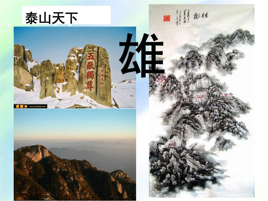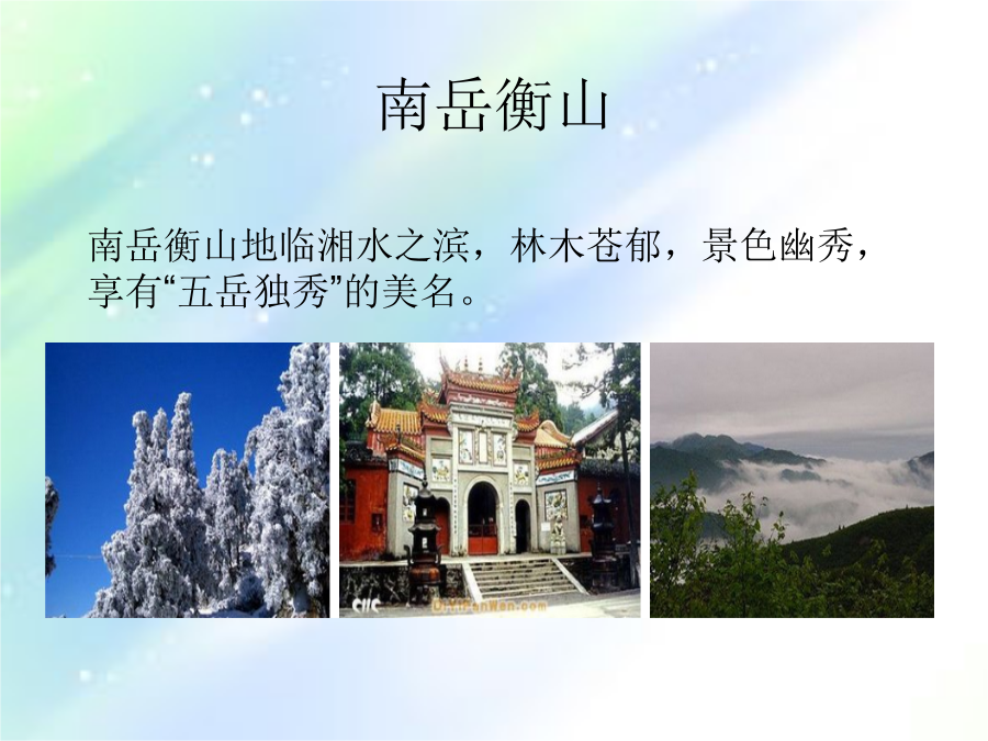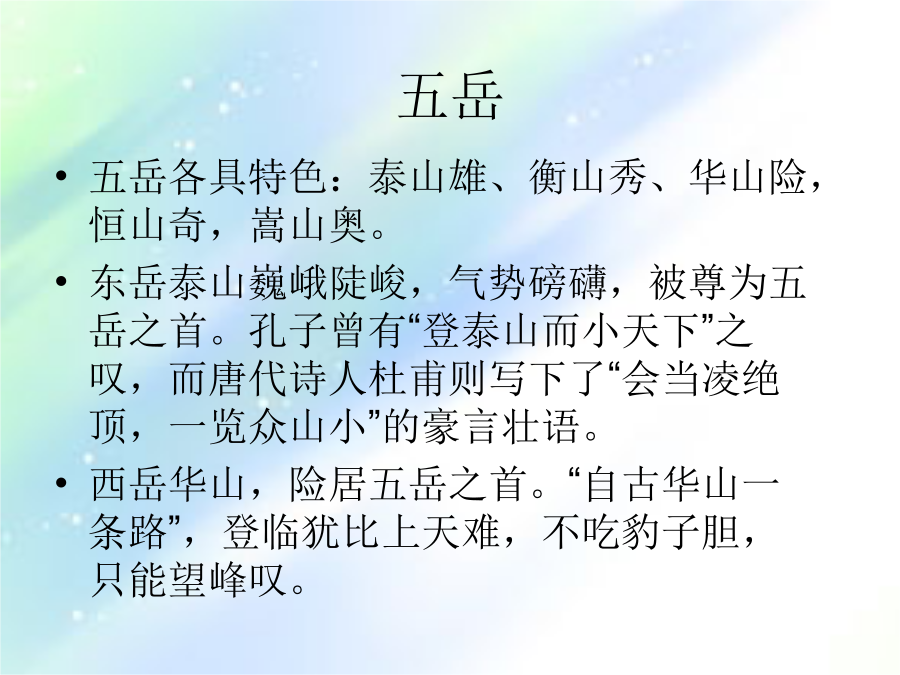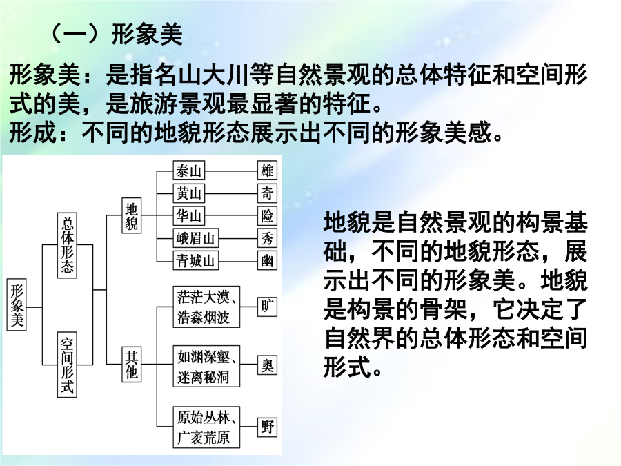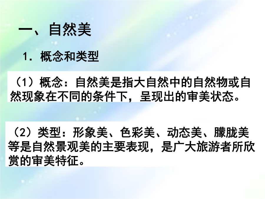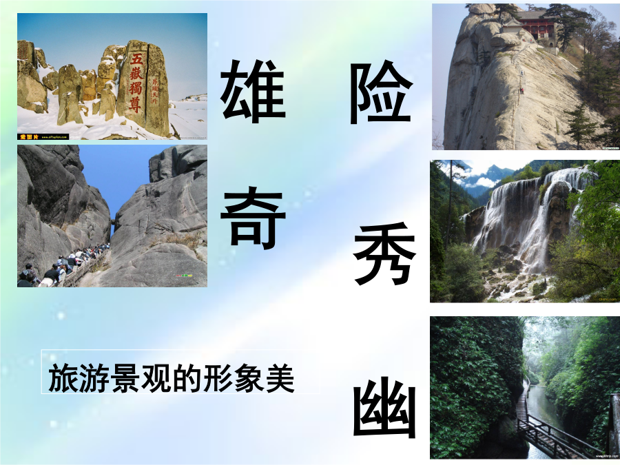 学习目标:1.知道旅游景观的两大类审美形态,并理解两者概念的区别。2.掌握自然景观美的主要表现,理解这些审美特征的含义。3.了解古典园林、古建筑等的美学特征。4.了解自然景观中的人文景观的作用。一、自然美泰山天下华山天下峨眉天下青城天下雄五岳南岳衡山北岳恒山中岳嵩山色彩美是以色彩的冷、暖等色调,以及它们的对比、协调等组合关系表现出来的形式美。欣赏者对色彩美的感受,既受到生理因素的影响,也有明显的地方、民族和历史时代的特征海之美霞之美叶之美花之美花海花卉经济——云南旅游景观的色彩美飞瀑、流水使自然景观富有动感。风吹林动、流水飘烟、飞禽走兽等也使自然景观展示出动态美。美感形成:自然景观中的动态美,由波涛、飞瀑、溪泉以及云雾飘动等引起。飞瀑流泉烟、雨、云、雾,以及晨曦、暮霭,都使自然景观呈现出朦胧美。美感形成:自然景观透过某种朦胧模糊的形式含蓄地表现出来,使欣赏者获得审美享受泰山日出朦胧之美风景如画——旅游景观的朦胧美《饮湖上初晴后雨》作者:苏轼年代:宋水光潋滟晴方好,山色空蒙雨亦奇。欲把西湖比西子,淡妆浓抹总相宜。二、人工美1.概念:能够吸引人们旅游活动、反映古今人类创造的___________和精神文明的事物所呈现出的__________。2.表现形式3.旅游景观的人工美是如何形成的?人文景观的历史文化意蕴人文景观的历史文化意蕴人文景观的历史文化意蕴人文景观的历史文化意蕴人文景观的历史文化意蕴人文景观的旅游审美价值丽江古城苏州园林不同的国家和民族由于历史条件、地理环境不同,所表现出来的观念、文化、民俗和风情也是迥然各异的。正因为每个民族都有它特殊的历史传统和风俗习惯,如独特的衣着服饰、音乐舞蹈、饮食起居、崇拜信仰、婚俗节日等,才会对其他民族的旅游者产生新奇的感受。黄河母亲--黄河的雕塑艺术品中最具艺术价值的。作品由"母亲"和"男婴"组成构图,分别象征了黄河母亲和华夏子孙。为兰州的标志性雕塑,也代表着兰州形象。街头雕塑江汉路步行街这尊高达21.8米的观音雕像是用80吨青铜,历时近一年铸成的。雕像坐北朝南,分别由直径达30米的圆形基座和长50米的方形底坐托垫,表现了佛教天圆地方的宇宙观,基座及护栏全部由花岗岩雕凿而成。除自然美和人工美之外,许多风景区往往流传着一些名人轶事和民间传说,这给风景区增添了传奇情趣,丰富了审美内涵。4.自然景观中人造景物的类型及作用自然美与人工美的统一:和谐美自然与人文和谐的思想,不仅体现在自然风景区的人文景观建设上,也体现在其它人文景观建设上