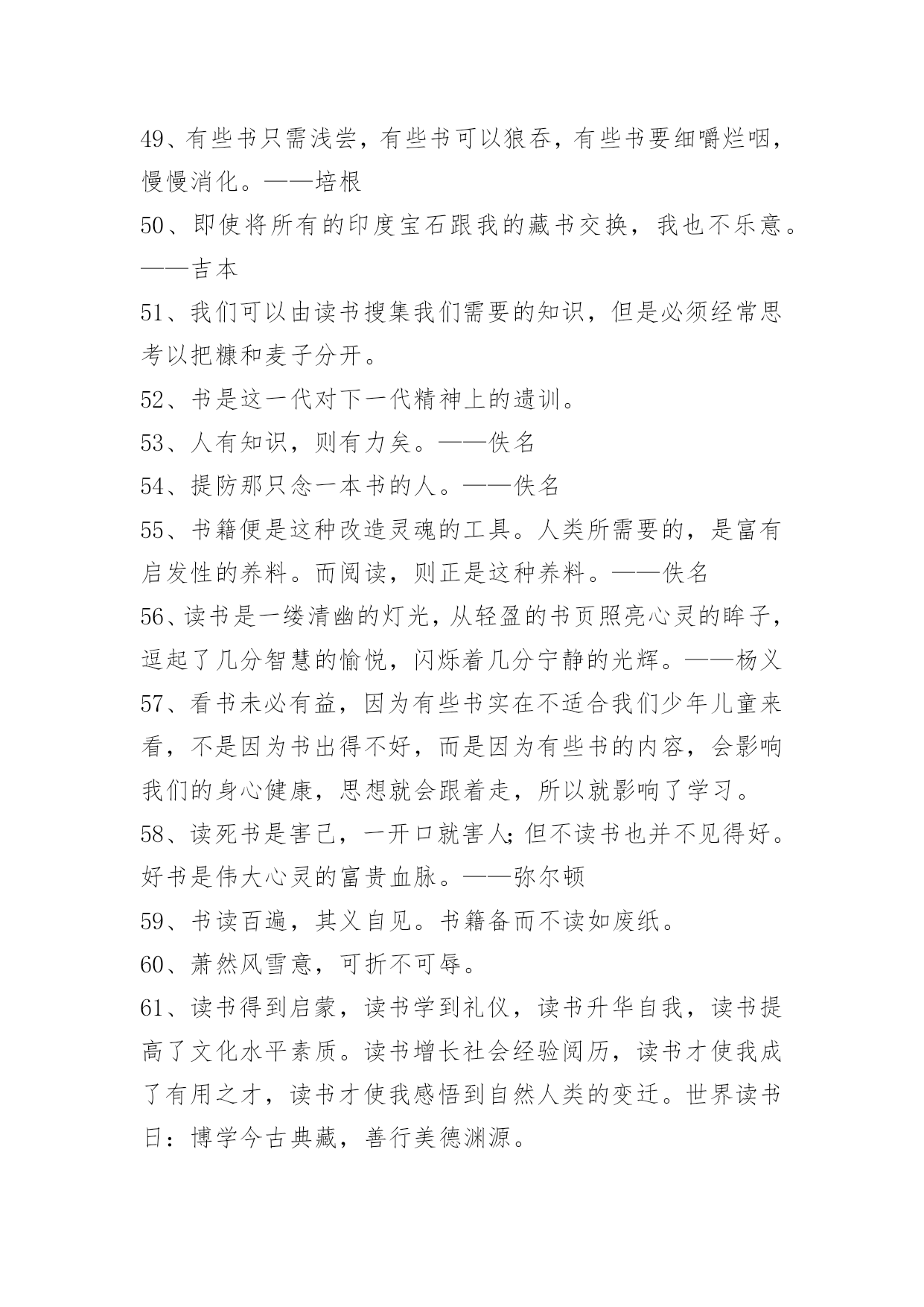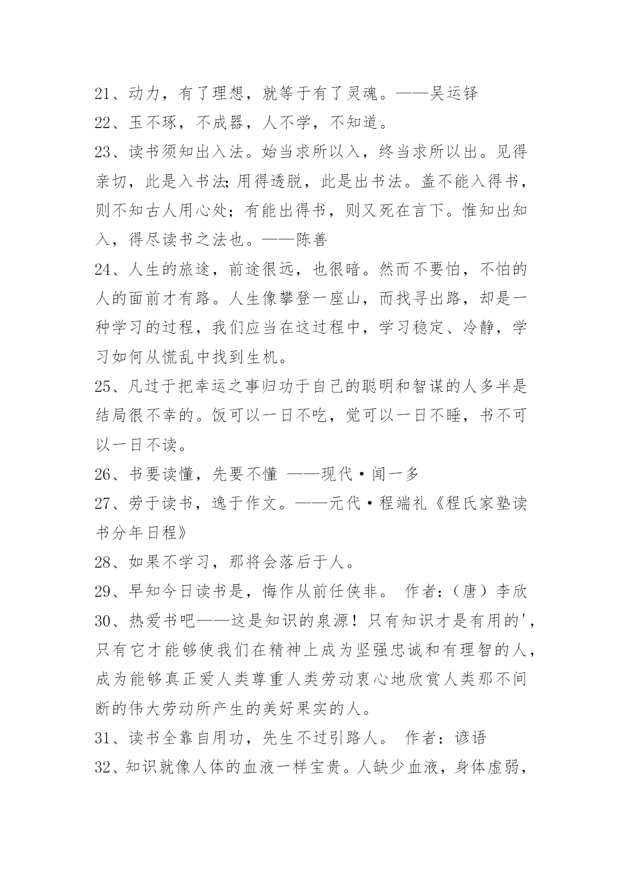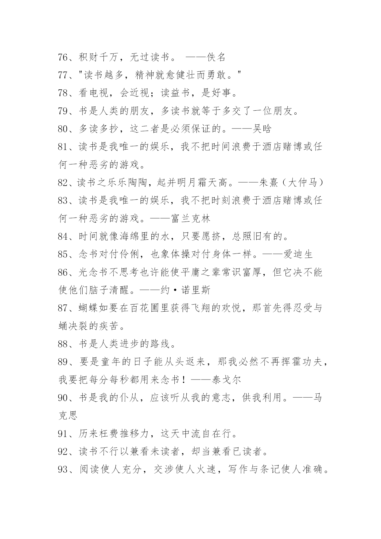爱读书的名言99条2021年实用的爱读书的名言集锦99条读书不得方式,劳而无功。——张之洞下面是关于爱读书的名言99条,欢迎参考。1、卖弄风骚的女人和卖弄学问的男人好比两个邻居。他们的关系可以从自命不凡的态度上看出来。2、读书是吸收营养,实践是释放能量。3、感到自己是人们所需要的和亲近的人——这是生活最大的享受,最高的喜悦。这是真理,不要忘记这个真理,它会给你们无限的幸福。4、读书有三到,谓心到,眼到,口到。心不在此,则眼不看仔细,心眼即不专一,却只漫浪诵读,决不能记,记不能久也。三到之中,心到最急。5、书之论事,昭如日月。——《尚书》6、读书悟道知识新,实践悟道成果新。7、假有学穷千载,书总五车,见良直而不见其善,逢抵捂而不知其失,葛洪所谓"藏书之箱筐""五经之主人"而夫子有云:"虽多亦奚以为?"——刘知几8、有的书给了我许多启发,有的书令我失望,即使在那些令我失望的书面前,我还是感觉有收获。——严文井9、如果一个人深入思考所读课文的内容,那么,虽然他并没有努力去记住材料,而材料却能很容易地印入并牢固地保存在记忆里。——赞科夫10、藏书不难,能看为难;看书不难,能读为难;读书不难,能思为难;能思不难,能记为难。——张潮11、读书有不解处,标出以问知者,慎勿轻自改窜,银根之误,遗笑于古。——申涵光12、当我明白自己读书非常少的时候,我就产生了求学的强烈愿望。当我知道了世界上书籍如何庞大的时候,我又产生了分辨好坏,选择好书的愿望。——严文井13、有些人稍读了几本,还不知其中甘苦,便认为白纸上写黑字,读书是容易不过的事。也有人知难而退,认为读书比什么都难。这两种思想,实际上都反映了一些人对学习的艰苦性认识不足。——曹方14、当顾问窘得脸色发白时,书籍会表述得一清二楚。——弗兰西斯·培根15、调动全部心智机能,创造性地运用科学的读书方法,是掌握读书的艺术的前提。——张之16、每个人都要摸索适合自己的读书方法,要从读书中去发现自己的长处,进而发扬自己的长处。有的人是早上读书效果最好,有的人则是晚上读书最好;有的人敏捷,眼明口快,有的人却十分认真、严谨。——严济慈17、壮不努力,老大徒伤悲。18、知识是智慧的火炬。19、人的一生,应当不遗余力地奉献一切于社会。20、做人的高境界是不善于自我表现,那样才是明智的。21、动力,有了理想,就等于有了灵魂。——吴运铎22、玉不琢,不成器,人不学,不知道。23、读书须知出入法。始当求所以入,终当求所以出。见得亲切,此是入书法;用得透脱,此是出书法。盖不能入得书,则不知古人用心处;有能出得书,则又死在言下。惟知出知入,得尽读书之法也。——陈善24、人生的旅途,前途很远,也很暗。然而不要怕,不怕的人的面前才有路。人生像攀登一座山,而找寻出路,却是一种学习的过程,我们应当在这过程中,学习稳定、冷静,学习如何从慌乱中找到生机。25、凡过于把幸运之事归功于自己的聪明和智谋的人多半是结局很不幸的。饭可以一日不吃,觉可以一日不睡,书不可以一日不读。26、书要读懂,先要不懂——现代·闻一多27、劳于读书,逸于作文。——元代·程端礼《程氏家塾读书分年日程》28、如果不学习,那将会落后于人。29、早知今日读书是,悔作从前任侠非。作者:(唐)李欣30、热爱书吧——这是知识的泉源!只有知识才是有用的',只有它才能够使我们在精神上成为坚强忠诚和有理智的人,成为能够真正爱人类尊重人类劳动衷心地欣赏人类那不间断的伟大劳动所产生的美好果实的人。31、读书全靠自用功,先生不过引路人。作者:谚语32、知识就像人体的血液一样宝贵。人缺少血液,身体虚弱,人的知识的缺乏,大脑就会干涸。33、读书是灵魂的壮游,随时可发现名山巨川、古迹名胜、深林幽谷、奇花异卉。——[美]法朗士34、读书对于一个有文化教养的人,是种高尚的享受;书籍应该使我们这些劳碌终生的人感到慰藉。35、读书不趁早,后来徒悔懊。作者:《清诗铎·趁早歌》36、有些人生来只会吸收书中的毒素。——琼森37、凡读无益之书,皆是玩物丧志。38、自家慢诩便便腹,开卷方知未读书。作者:(清)张月楼39、买书如山倒,读书如抽丝。40、不患莫己知,求为可知也。41、为乐趣而读书。作者:毛姆42、读书人不一定有知识,真正的常识是懂得知识,会思想,能工作。作者:徐特立43、所谓天才,就是发奋的力量。——德怀特44、天机云锦用在我,剪裁妙处非刀尺。45、死读书者,和读死书者,都是社会的白痴。46、读书像加油,书读的太多,就变成了油罐车,跑不动了。47、科学是人类智慧的结晶和硕果……展望科学的未来,人类将高举科学的火炬登上宇宙的天堂。48、中国自己就可以成为科学、思想发展的源泉,中国自己就可以成为生产者,它有这种潜力和能力,中国不仅是一个知识消费者,它还是一个制造者。——阿尔文·托夫勒49、有些书