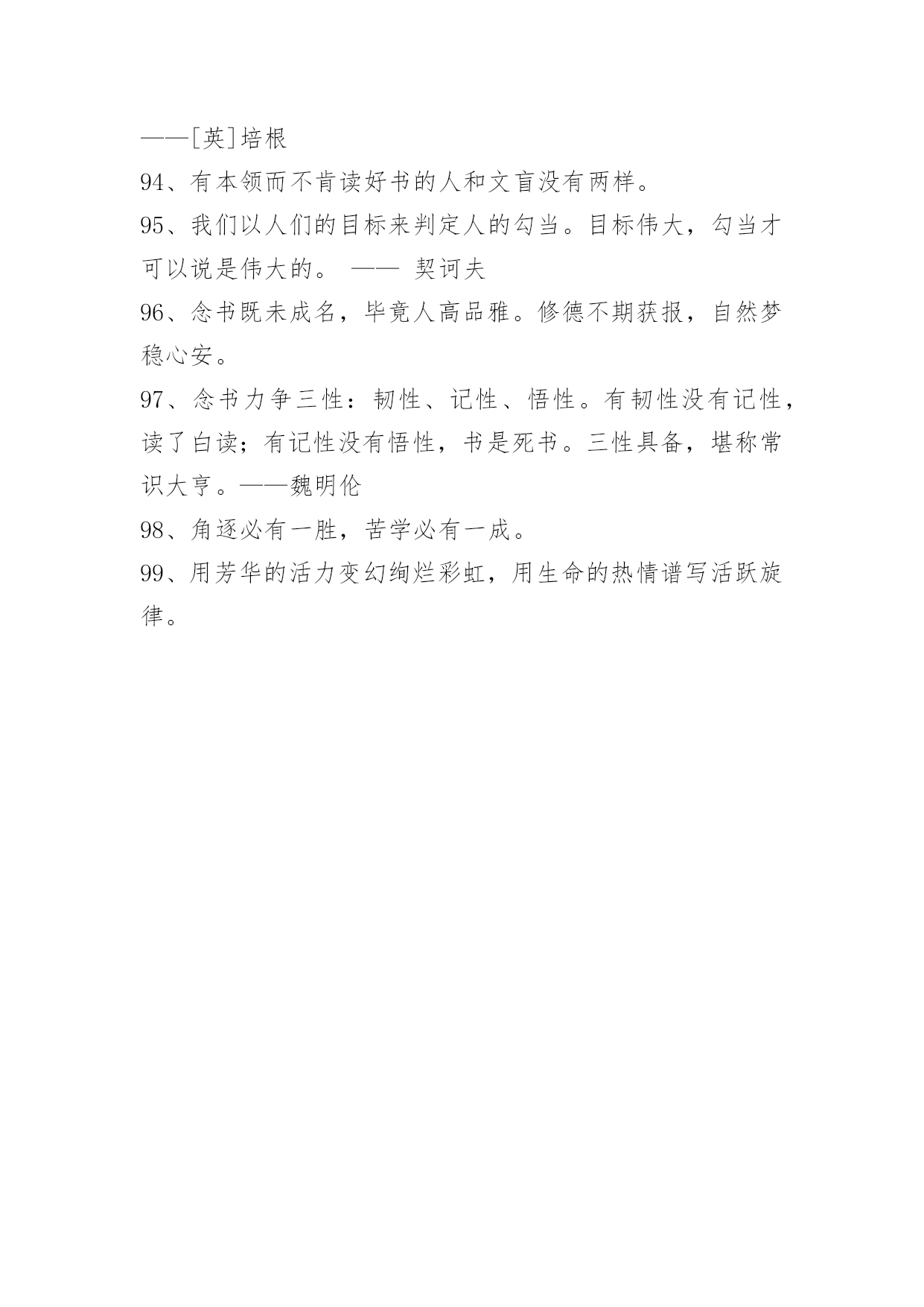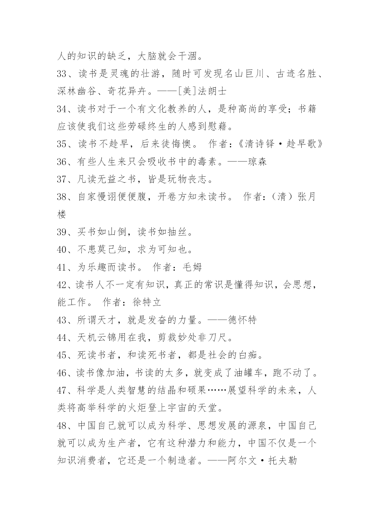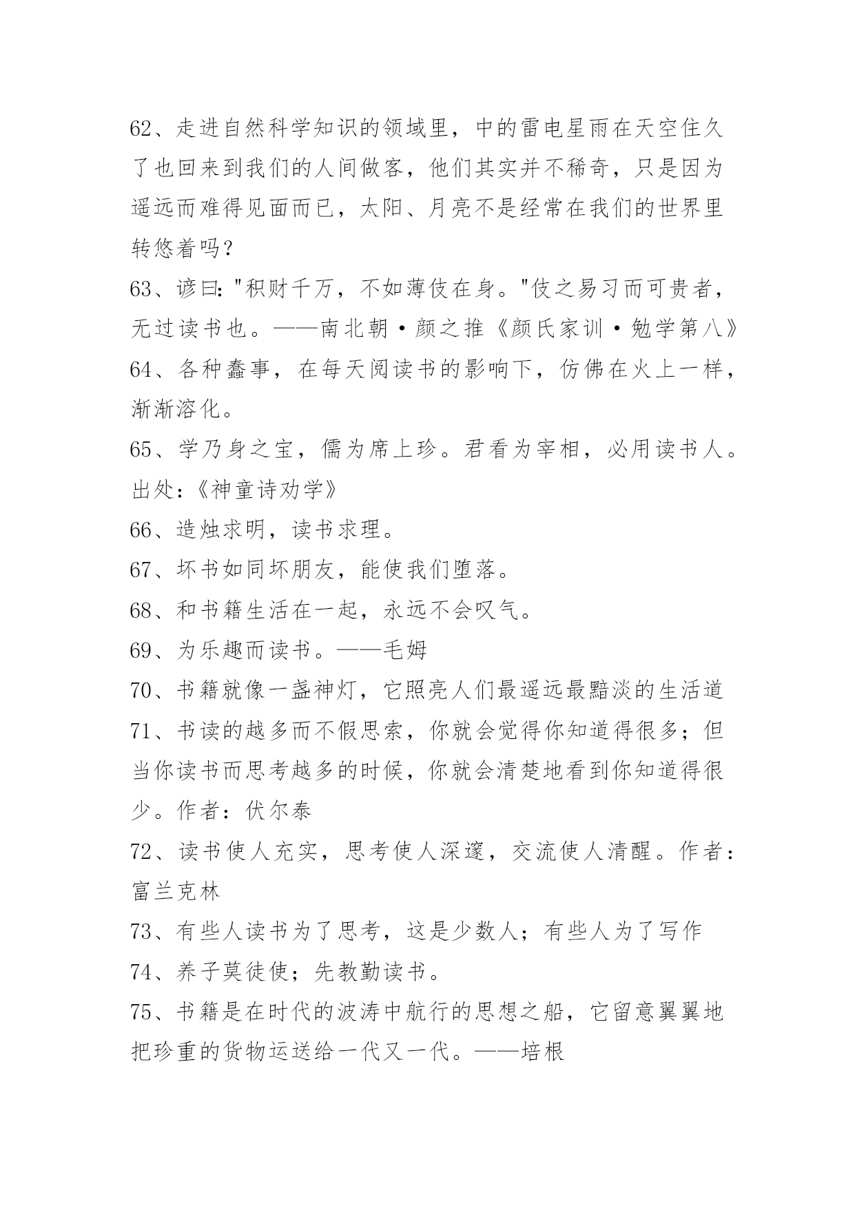 爱读书的名言99条2021年实用的爱读书的名言集锦99条读书不得方式,劳而无功。——张之洞下面是关于爱读书的名言99条,欢迎参考。1、卖弄风骚的女人和卖弄学问的男人好比两个邻居。他们的关系可以从自命不凡的态度上看出来。2、读书是吸收营养,实践是释放能量。3、感到自己是人们所需要的和亲近的人——这是生活最大的享受,最高的喜悦。这是真理,不要忘记这个真理,它会给你们无限的幸福。4、读书有三到,谓心到,眼到,口到。心不在此,则眼不看仔细,心眼即不专一,却只漫浪诵读,决不能记,记不能久也。三到之中,心到最急。5、书之论事,昭如日月。——《尚书》6、读书悟道知识新,实践悟道成果新。7、假有学穷千载,书总五车,见良直而不见其善,逢抵捂而不知其失,葛洪所谓"藏书之箱筐""五经之主人"而夫子有云:"虽多亦奚以为?"——刘知几8、有的书给了我许多启发,有的书令我失望,即使在那些令我失望的书面前,我还是感觉有收获。——严文井9、如果一个人深入思考所读课文的内容,那么,虽然他并没有努力去记住材料,而材料却能很容易地印入并牢固地保存在记忆里。——赞科夫10、藏书不难,能看为难;看书不难,能读为难;读书不难,能思为难;能思不难,能记为难。——张潮11、读书有不解处,标出以问知者,慎勿轻自改窜,银根之误,遗笑于古。——申涵光12、当我明白自己读书非常少的时候,我就产生了求学的强烈愿望。当我知道了世界上书籍如何庞大的时候,我又产生了分辨好坏,选择好书的愿望。——严文井13、有些人稍读了几本,还不知其中甘苦,便认为白纸上写黑字,读书是容易不过的事。也有人知难而退,认为读书比什么都难。这两种思想,实际上都反映了一些人对学习的艰苦性认识不足。——曹方14、当顾问窘得脸色发白时,书籍会表述得一清二楚。——弗兰西斯·培根15、调动全部心智机能,创造性地运用科学的读书方法,是掌握读书的艺术的前提。——张之16、每个人都要摸索适合自己的读书方法,要从读书中去发现自己的长处,进而发扬自己的长处。有的人是早上读书效果最好,有的人则是晚上读书最好;有的人敏捷,眼明口快,有的人却十分认真、严谨。——严济慈17、壮不努力,老大徒伤悲。18、知识是智慧的火炬。19、人的一生,应当不遗余力地奉献一切于社会。20、做人的高境界是不善于自我表现,那样才是明智的。21、动力,有了理想,就等于有了灵魂。——吴运铎22、玉不琢,不成器,人不学,不知道。23、读书须知出入法。始当求所以入,终当求所以出。见得亲切,此是入书法;用得透脱,此是出书法。盖不能入得书,则不知古人用心处;有能出得书,则又死在言下。惟知出知入,得尽读书之法也。——陈善24、人生的旅途,前途很远,也很暗。然而不要怕,不怕的人的面前才有路。人生像攀登一座山,而找寻出路,却是一种学习的过程,我们应当在这过程中,学习稳定、冷静,学习如何从慌乱中找到生机。25、凡过于把幸运之事归功于自己的聪明和智谋的人多半是结局很不幸的。饭可以一日不吃,觉可以一日不睡,书不可以一日不读。26、书要读懂,先要不懂——现代·闻一多27、劳于读书,逸于作文。——元代·程端礼《程氏家塾读书分年日程》28、如果不学习,那将会落后于人。29、早知今日读书是,悔作从前任侠非。作者:(唐)李欣30、热爱书吧——这是知识的泉源!只有知识才是有用的',只有它才能够使我们在精神上成为坚强忠诚和有理智的人,成为能够真正爱人类尊重人类劳动衷心地欣赏人类那不间断的伟大劳动所产生的美好果实的人。31、读书全靠自用功,先生不过引路人。作者:谚语32、知识就像人体的血液一样宝贵。人缺少血液,身体虚弱,人的知识的缺乏,大脑就会干涸。33、读书是灵魂的壮游,随时可发现名山巨川、古迹名胜、深林幽谷、奇花异卉。——[美]法朗士34、读书对于一个有文化教养的人,是种高尚的享受;书籍应该使我们这些劳碌终生的人感到慰藉。35、读书不趁早,后来徒悔懊。作者:《清诗铎·趁早歌》36、有些人生来只会吸收书中的毒素。——琼森37、凡读无益之书,皆是玩物丧志。38、自家慢诩便便腹,开卷方知未读书。作者:(清)张月楼39、买书如山倒,读书如抽丝。40、不患莫己知,求为可知也。41、为乐趣而读书。作者:毛姆42、读书人不一定有知识,真正的常识是懂得知识,会思想,能工作。作者:徐特立43、所谓天才,就是发奋的力量。——德怀特44、天机云锦用在我,剪裁妙处非刀尺。45、死读书者,和读死书者,都是社会的白痴。46、读书像加油,书读的太多,就变成了油罐车,跑不动了。47、科学是人类智慧的结晶和硕果……展望科学的未来,人类将高举科学的火炬登上宇宙的天堂。48、中国自己就可以成为科学、思想发展的源泉,中国自己就可以成为生产者,它有这种潜力和能力,中国不仅是一个知识消费者,它还是一个制造者。——阿尔文·托夫勒49、有些书