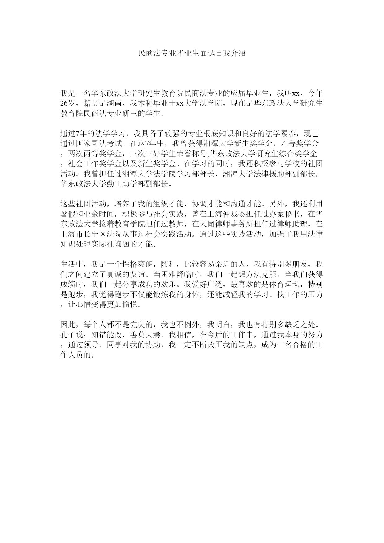 民商法专业毕业生面试自我介绍我是一名华东政法大学研究生教育院民商法专业的应届毕业生,我叫xx。今年26岁,籍贯是湖南。我本科毕业于xx大学法学院,现在是华东政法大学研究生教育院民商法专业研三的学生。通过7年的法学学习,我具备了较强的专业根底知识和良好的法学素养,现已通过国家司法考试。在这7年中,我曾获得湘潭大学新生奖学金,乙等奖学金,两次丙等奖学金,三次三好学生荣誉称号;华东政法大学研究生综合奖学金,社会工作奖学金以及新生奖学金。在学习的同时,我还积极参与学校的社团活动。我曾担任过湘潭大学法学院学习部部长,湘潭大学法律援助部副部长,华东政法大学勤工助学部副部长。这些社团活动,培养了我的组织才能、协调才能和沟通才能。另外,我还利用暑假和业余时间,积极参与社会实践,曾在上海仲裁委担任过办案秘书,在华东政法大学接着教育学院担任过教师,在天闻律师事务所担任过律师助理,在上海市长宁区法院从事过社会实践活动。通过这些实践活动,加强了我用法律知识处理实际征询题的才能。生活中,我是一个性格爽朗,随和,比较容易亲近的人。我有特别多朋友,我们之间建立了真诚的友谊。当困难降临时,我们一起想方法克服,当我们获得成绩时,我们一起分享成功的欢乐。我爱好广泛,最喜欢的是体育运动,特别是跑步,我觉得跑步不仅能锻炼我的身体,还能减轻我的学习、找工作的压力,让心情变得更加愉悦。因此,每个人都不是完美的,我也不例外,我明白,我也有特别多缺乏之处。孔子说:知错能改,善莫大焉。我相信,在今后的工作中,通过我本身的努力,通过领导、同事对我的协助,我一定不断改正我的缺点,成为一名合格的工作人员的。