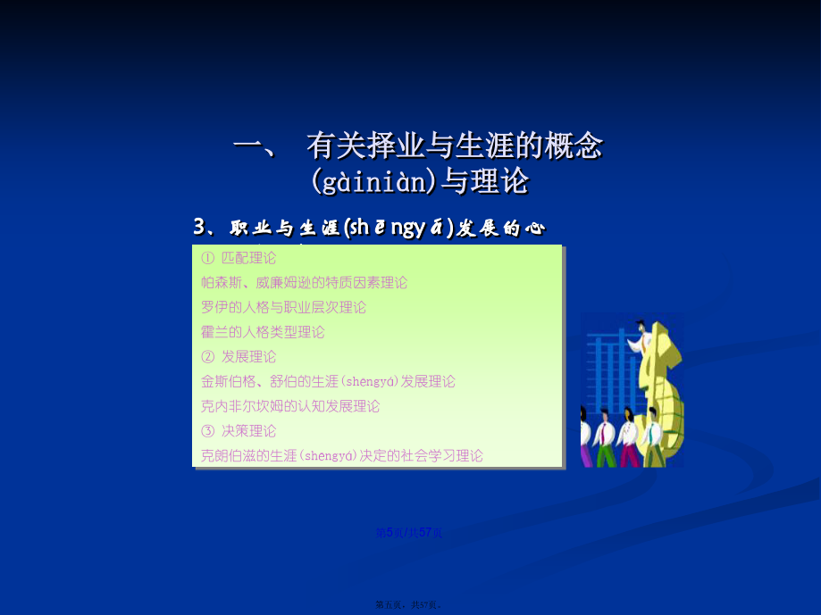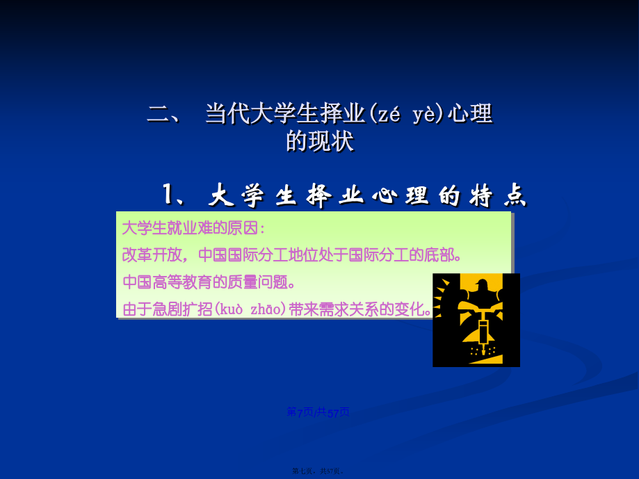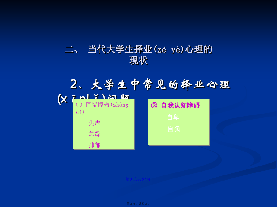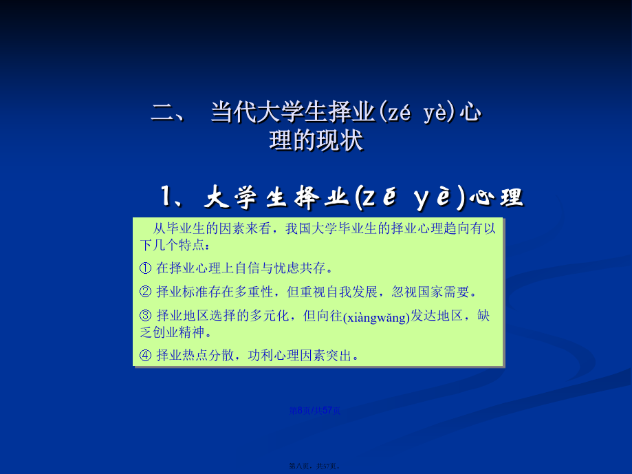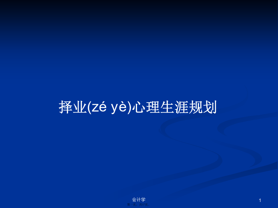 会计学大学生的择业(zéyè)心理一、有关(yǒuguān)择业与生涯的概念与理论一、有关择业(zéyè)与生涯的概念与理论一、有关择业与生涯的概念(gàiniàn)与理论大学生的择业(zéyè)心理二、当代大学生择业(zéyè)心理的现状二、当代大学生择业(zéyè)心理的现状二、当代大学生择业(zéyè)心理的现状二、当代大学生择业心理(xīnlǐ)的现状二、当代(dāngdài)大学生择业心理的现状大学生的择业(zéyè)心理三、大学生择业与生涯(shēngyá)心理辅导1、国内外大学生职业与生涯(shēngyá)辅导现状①国外大学生职业与生涯(shēngyá)辅导的历史与现状三、大学生择业(zéyè)与生涯心理辅导三、大学生择业与生涯(shēngyá)心理辅导三、大学生择业(zéyè)与生涯心理辅导三、大学生择业与生涯心理(xīnlǐ)辅导三、大学生择业与生涯心理(xīnlǐ)辅导三、大学生择业与生涯心理(xīnlǐ)辅导三、大学生择业与生涯心理(xīnlǐ)辅导三、大学生择业与生涯(shēngyá)心理辅导①建立科学的择业(zéyè)意识树立(shùlì)科学的择业观择业观主要回答两个问题,第二个问题是“我从工作中能够获得什么?”这是涉及工作意义和价值(jiàzhí)的问题。职业是个人通过各种工作来实现自己社会价值(jiàzhí)的途径,它既是人们谋生的手段,也是人们服务于社会的工具,职业的社会意义在于贡献。树立科学的择业观不仅是为了适应社会发展(fāzhǎn),更是保障大学生择业求职心理健康的根本条件。①树立科学(kēxué)的择业意识第一,了解即将(jíjiāng)踏入的工作世界。首先看看社会对职业的要求。再看看职业对人才的要求。社会对人才需求的层次不断攀升:市场对外语类、金融财会类、商贸类、旅游类、法律类以及经济管理类等专业毕业生的需求形势会逐渐(zhújiàn)走俏,近年来一直不景气的国际经济贸易类和涉外专业毕业生的需求量也可能大幅度飙升。传统专业毕业生就业形势严峻,从目前情况看,这类专业有历史学及考古专业、基础教育学、物理学、社会学等。人才市场的新动向:在大学生就业中,社会各类人士与大学毕业生竞争就业岗位的趋势不容忽视。把握人才市场的脉搏,以便在择业时有充分的心理准备。“海归派”结队登陆,回国创业初见端倪。高职称高学历人员递增,择业竞争不容忽视。再就业人员异军突起(yìjūntūqǐ),竞争实力不容低估。从最近几年的毕业生就业情况看,下面几种类型的毕业生最受用人单位的欢迎:一是思想政治素质较高的毕业生。二是有事业心与责任感的毕业生。三是有吃苦精神的毕业生。四是基础(jīchǔ)扎实、知识面宽、外语水平高的毕业生。五是懂专业、会管理、善交际的毕业生。第二,充分认识自我。首先,要了解(liǎojiě)自己的职业兴趣。其次,要了解(liǎojiě)自的职业能力。再者,要了解(liǎojiě)自己的职业气质。还要了解(liǎojiě)自己的职业生理特征。全面客观地认识和评价自己。(自我反省、社会比较、心理测验(cèyàn))进行角色转换:大学生——求职者(进入择业竞技角色)进入择业竞技角色必须:战胜自我、战胜竞争对手、战胜环境第三,择业必须遵循的原则符合社会需要原则发挥个人(gèrén)素质优势原则主动选择原则分清主次原则着眼长远,面向未来原则在各个不同的阶段,社会对于知识结构及水平的要求并不相同。在大学学习生活的前阶段,学习重点在于(zàiyú)知识点的学习与获取,目的在于(zàiyú)打好坚实的理论基础;到了毕业前夕的择业阶段,则要求将学会的知识融会贯通,达到理论与实践相结合的水平。/////////三、大学生择业(zéyè)心理辅导②培养健康的择业(zéyè)心理培养良好的职业理想(lǐxiǎng)和职业道德锻炼职业(zhíyè)必备的综合能力学习一些(yīxiē)基本择业技巧择业(zéyè)必备的心理素质三、大学生择业心理(xīnlǐ)辅导大学生择业心理(xīnlǐ)的误区大学生择业心理(xīnlǐ)障碍的预防与调适大学生择业(zéyè)心理的误区培养积极主动的职业意向(yìxiàng)调整好就业期望值培养自信心培养竞争意识培养变通与适应的能力培养决策能力培养豁达开朗的心境掌握(zhǎngwò)有效的心理调适方法:理性情绪法合理宣泄法自我慰藉法情绪转移法自我激励法松弛练习法祝大家(dàjiā)成功远航!感谢您的观看(guānkàn)!
