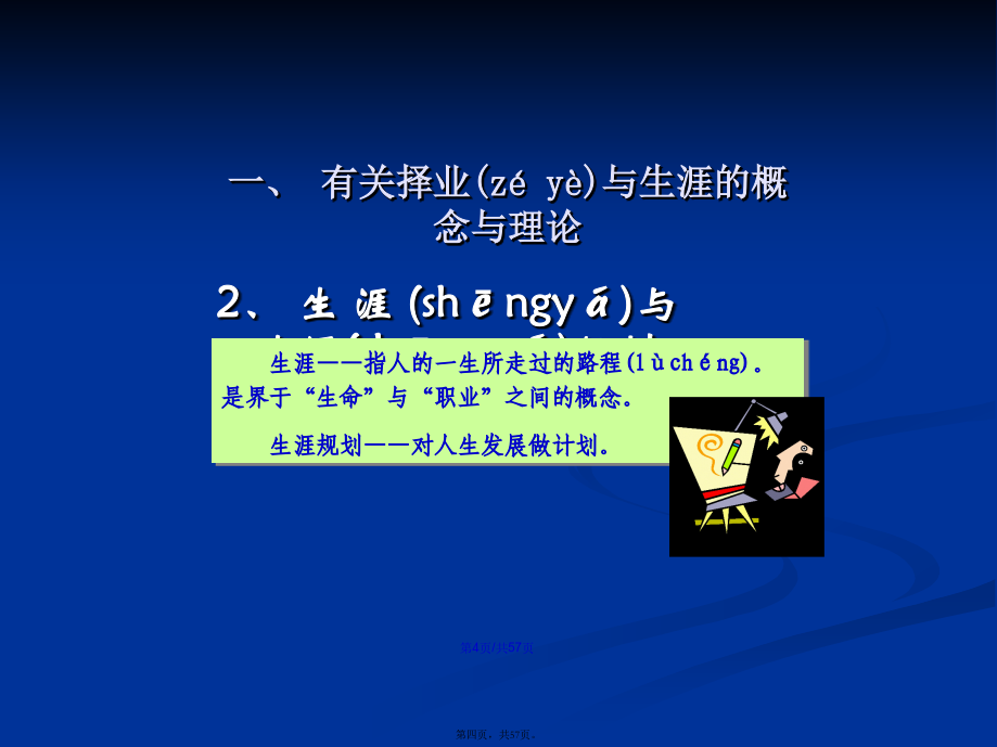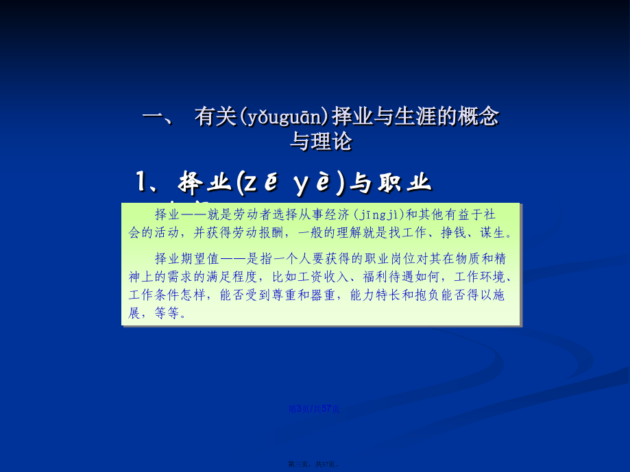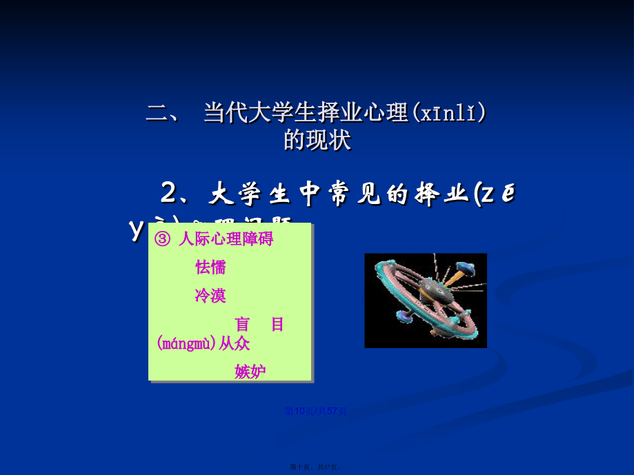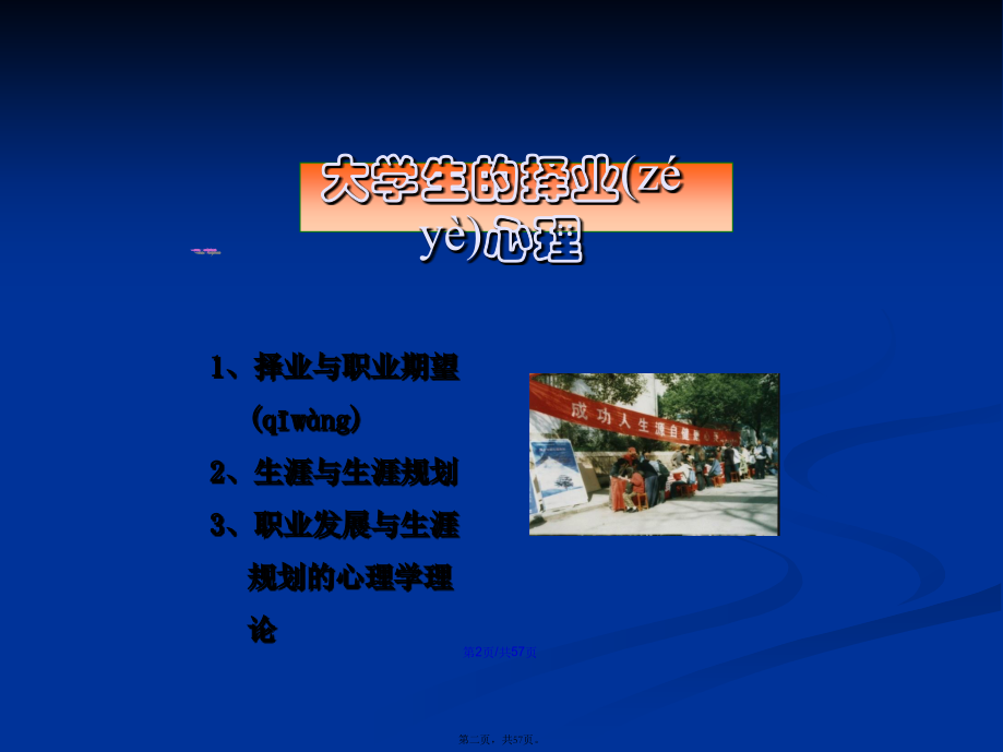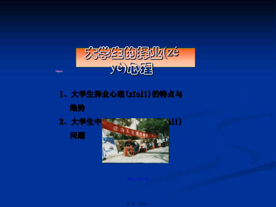 会计学大学生的择业(zéyè)心理一、有关(yǒuguān)择业与生涯的概念与理论一、有关择业(zéyè)与生涯的概念与理论一、有关择业与生涯的概念(gàiniàn)与理论大学生的择业(zéyè)心理二、当代大学生择业(zéyè)心理的现状二、当代大学生择业(zéyè)心理的现状二、当代大学生择业(zéyè)心理的现状二、当代大学生择业心理(xīnlǐ)的现状二、当代(dāngdài)大学生择业心理的现状大学生的择业(zéyè)心理三、大学生择业与生涯(shēngyá)心理辅导1、国内外大学生职业与生涯(shēngyá)辅导现状①国外大学生职业与生涯(shēngyá)辅导的历史与现状三、大学生择业(zéyè)与生涯心理辅导三、大学生择业与生涯(shēngyá)心理辅导三、大学生择业(zéyè)与生涯心理辅导三、大学生择业与生涯心理(xīnlǐ)辅导三、大学生择业与生涯心理(xīnlǐ)辅导三、大学生择业与生涯心理(xīnlǐ)辅导三、大学生择业与生涯心理(xīnlǐ)辅导三、大学生择业与生涯(shēngyá)心理辅导①建立科学的择业(zéyè)意识树立(shùlì)科学的择业观择业观主要回答两个问题,第二个问题是“我从工作中能够获得什么?”这是涉及工作意义和价值(jiàzhí)的问题。职业是个人通过各种工作来实现自己社会价值(jiàzhí)的途径,它既是人们谋生的手段,也是人们服务于社会的工具,职业的社会意义在于贡献。树立科学的择业观不仅是为了适应社会发展(fāzhǎn),更是保障大学生择业求职心理健康的根本条件。①树立科学(kēxué)的择业意识第一,了解即将(jíjiāng)踏入的工作世界。首先看看社会对职业的要求。再看看职业对人才的要求。社会对人才需求的层次不断攀升:市场对外语类、金融财会类、商贸类、旅游类、法律类以及经济管理类等专业毕业生的需求形势会逐渐(zhújiàn)走俏,近年来一直不景气的国际经济贸易类和涉外专业毕业生的需求量也可能大幅度飙升。传统专业毕业生就业形势严峻,从目前情况看,这类专业有历史学及考古专业、基础教育学、物理学、社会学等。人才市场的新动向:在大学生就业中,社会各类人士与大学毕业生竞争就业岗位的趋势不容忽视。把握人才市场的脉搏,以便在择业时有充分的心理准备。“海归派”结队登陆,回国创业初见端倪。高职称高学历人员递增,择业竞争不容忽视。再就业人员异军突起(yìjūntūqǐ),竞争实力不容低估。从最近几年的毕业生就业情况看,下面几种类型的毕业生最受用人单位的欢迎:一是思想政治素质较高的毕业生。二是有事业心与责任感的毕业生。三是有吃苦精神的毕业生。四是基础(jīchǔ)扎实、知识面宽、外语水平高的毕业生。五是懂专业、会管理、善交际的毕业生。第二,充分认识自我。首先,要了解(liǎojiě)自己的职业兴趣。其次,要了解(liǎojiě)自的职业能力。再者,要了解(liǎojiě)自己的职业气质。还要了解(liǎojiě)自己的职业生理特征。全面客观地认识和评价自己。(自我反省、社会比较、心理测验(cèyàn))进行角色转换:大学生——求职者(进入择业竞技角色)进入择业竞技角色必须:战胜自我、战胜竞争对手、战胜环境第三,择业必须遵循的原则符合社会需要原则发挥个人(gèrén)素质优势原则主动选择原则分清主次原则着眼长远,面向未来原则在各个不同的阶段,社会对于知识结构及水平的要求并不相同。在大学学习生活的前阶段,学习重点在于(zàiyú)知识点的学习与获取,目的在于(zàiyú)打好坚实的理论基础;到了毕业前夕的择业阶段,则要求将学会的知识融会贯通,达到理论与实践相结合的水平。/////////三、大学生择业(zéyè)心理辅导②培养健康的择业(zéyè)心理培养良好的职业理想(lǐxiǎng)和职业道德锻炼职业(zhíyè)必备的综合能力学习一些(yīxiē)基本择业技巧择业(zéyè)必备的心理素质三、大学生择业心理(xīnlǐ)辅导大学生择业心理(xīnlǐ)的误区大学生择业心理(xīnlǐ)障碍的预防与调适大学生择业(zéyè)心理的误区培养积极主动的职业意向(yìxiàng)调整好就业期望值培养自信心培养竞争意识培养变通与适应的能力培养决策能力培养豁达开朗的心境掌握(zhǎngwò)有效的心理调适方法:理性情绪法合理宣泄法自我慰藉法情绪转移法自我激励法松弛练习法祝大家(dàjiā)成功远航!感谢您的观看(guānkàn)!