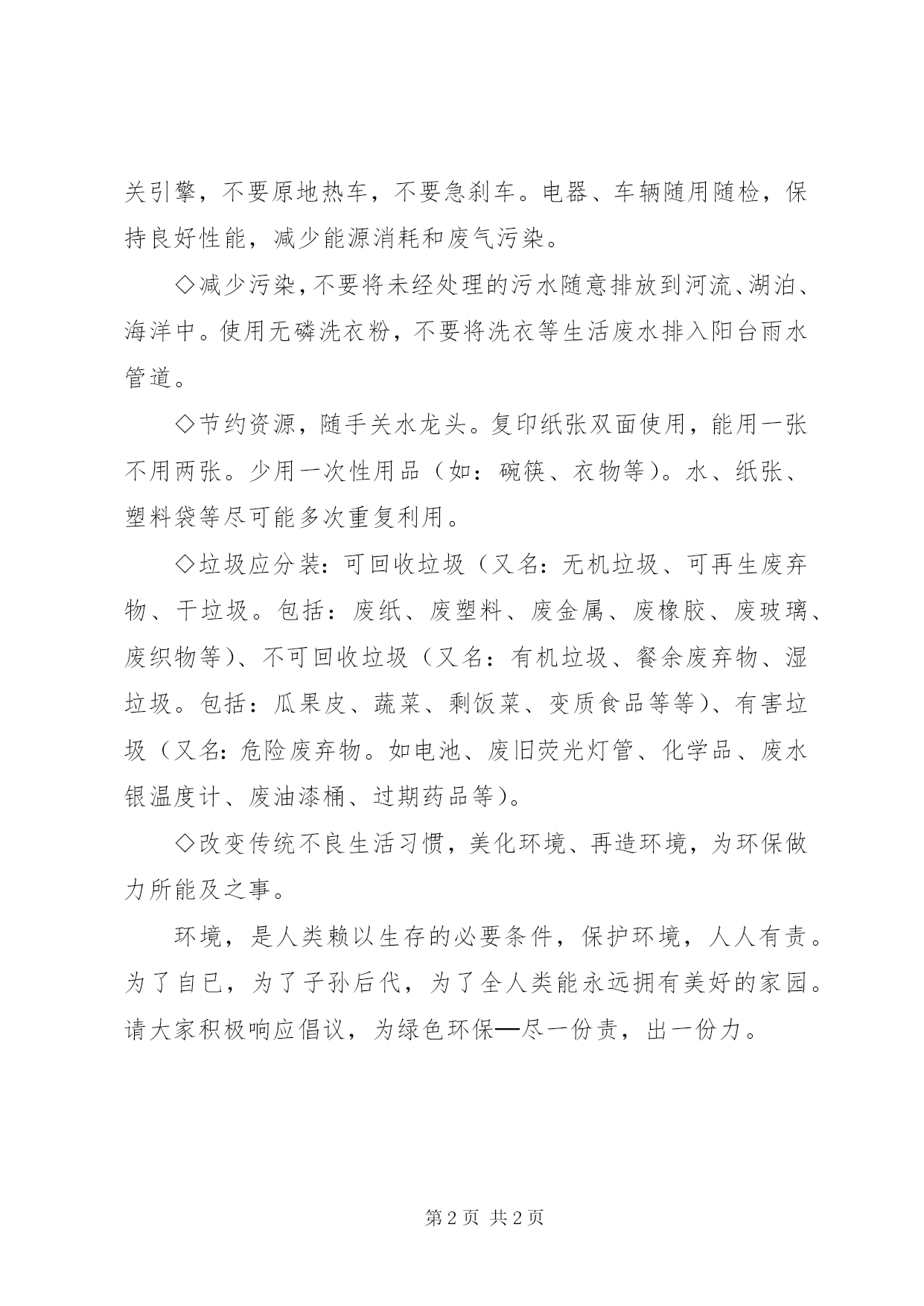 第PAGE\*Arabic\*MERGEFORMAT2页共NUMPAGES\*MERGEFORMAT2页我的环保倡议书新的世纪,我们渴望干净的地球,渴望健康的生命,渴望环保的家园,渴望绿色、健康、卫生的生活环境。伟大的事业,需要伟大的创造。让我们这群新世纪的见证者,义不容辞地承担起各自的使命,共创绿色环保、健康卫生的新社会。地球只有一个,她的生命是脆弱的,不能因为我们为着眼前的发展和获得微小利益,以肆虐的行为、无度的获取,使本已脆弱的躯体更加脆弱。保护地球,就是保护我们自已。我们口号是:绿色环保,举手之劳;从我做起,从点滴做起。我们倡议:◇努力学习环保科学知识,主动增强环保意识。◇倡导文明行为,不随地吐痰,不乱扔脏物,不践踏草坪,不随意摘花折草,保护绿色生命。在大自然中游玩,除了美好记忆,什么也不要留下。◇保护生物,使生物与人类共存,使万物与环境和谐相处。不可随意引入外来物种,不可随处放生动物,以免破坏生态平衡。◇节约用电,随手关灯关空调关电脑。使用节能用具(如节能灯、节水马桶等),空调调高1度。电器不要待机,待机一样耗电。随手关掉长时间待机的电脑、下班时拔掉已不需要使用的饮水机电源插头。◇出行尽量乘坐公共交通工具或步行。开车时,较长等待请关引擎,不要原地热车,不要急刹车。电器、车辆随用随检,保持良好性能,减少能源消耗和废气污染。◇减少污染,不要将未经处理的污水随意排放到河流、湖泊、海洋中。使用无磷洗衣粉,不要将洗衣等生活废水排入阳台雨水管道。◇节约资源,随手关水龙头。复印纸张双面使用,能用一张不用两张。少用一次性用品(如:碗筷、衣物等)。水、纸张、塑料袋等尽可能多次重复利用。◇垃圾应分装:可回收垃圾(又名:无机垃圾、可再生废弃物、干垃圾。包括:废纸、废塑料、废金属、废橡胶、废玻璃、废织物等)、不可回收垃圾(又名:有机垃圾、餐余废弃物、湿垃圾。包括:瓜果皮、蔬菜、剩饭菜、变质食品等等)、有害垃圾(又名:危险废弃物。如电池、废旧荧光灯管、化学品、废水银温度计、废油漆桶、过期药品等)。◇改变传统不良生活习惯,美化环境、再造环境,为环保做力所能及之事。环境,是人类赖以生存的必要条件,保护环境,人人有责。为了自已,为了子孙后代,为了全人类能永远拥有美好的家园。请大家积极响应倡议,为绿色环保─尽一份责,出一份力。