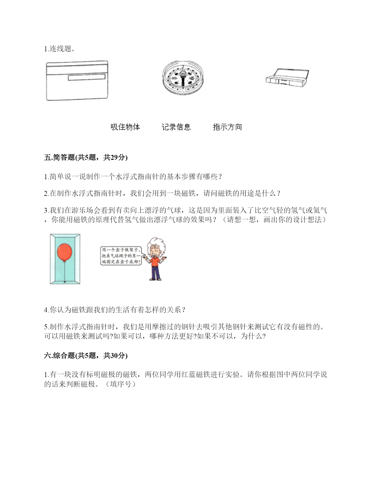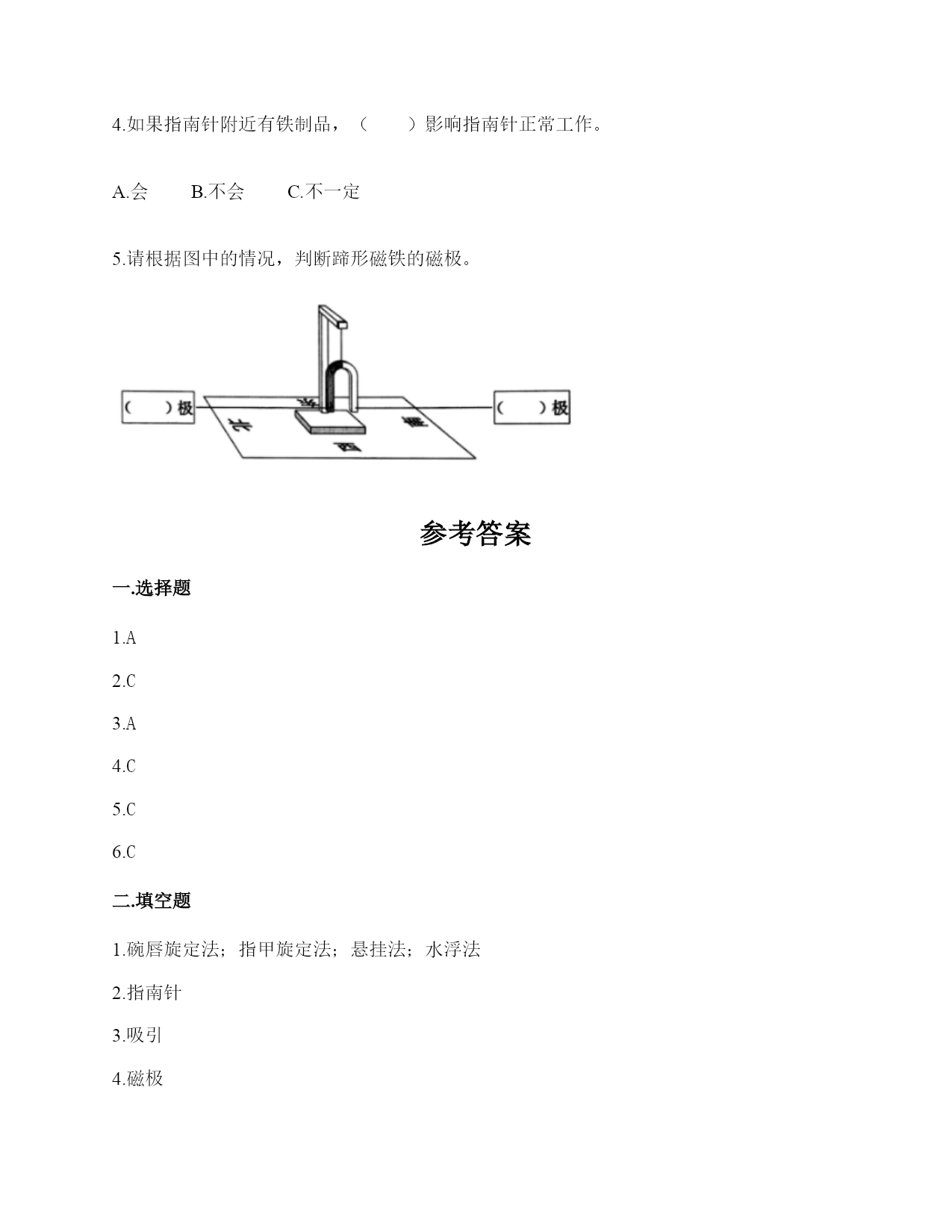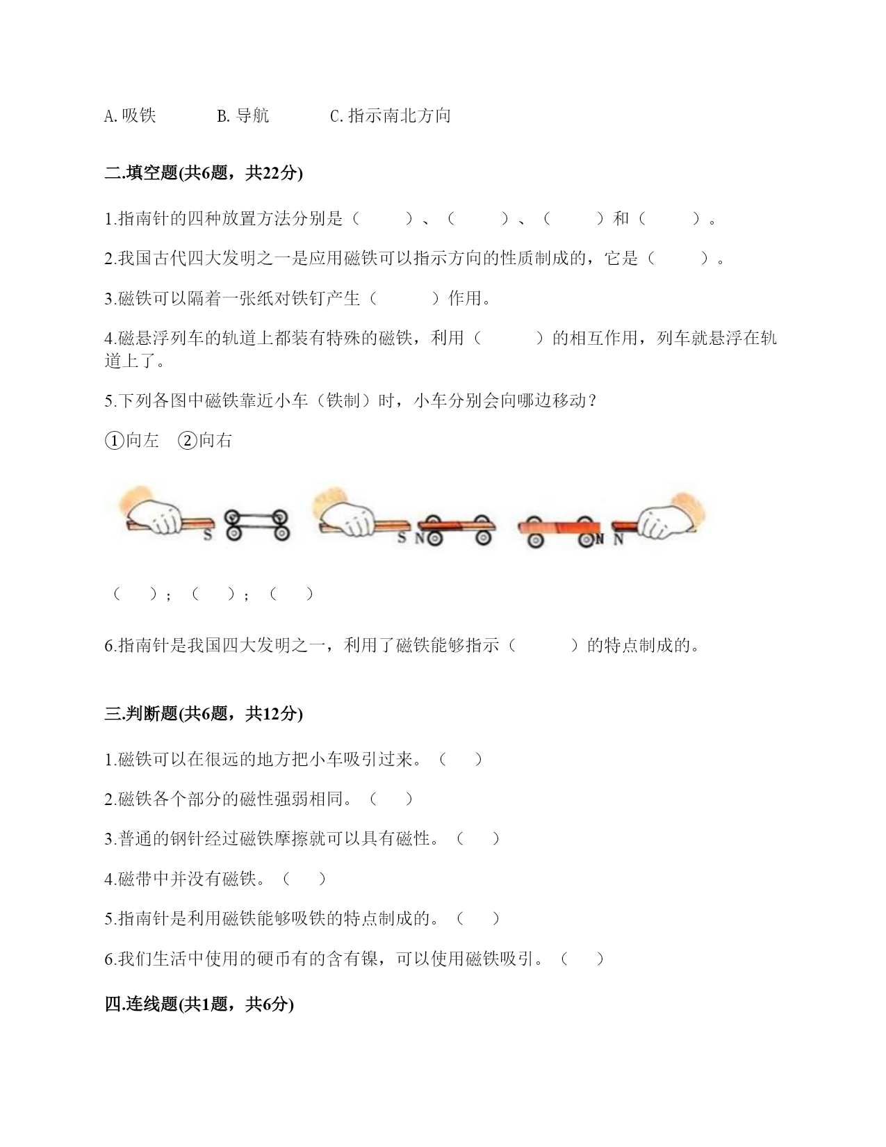 小学科学《磁铁》练习题一.选择题(共6题,共12分)1.指南针中字母S表示的方向为()。A.南B.北C.西2.下列关于磁铁的描述正确的是()。A.磁铁都是天然形成的B.磁铁隔着很厚的书也能吸铁C.磁铁有不同的形状,是因为它们的用途不同3.用磁化的小磁针靠近指南针,结果如图所示,说明针尖一端是()。A.S极B.北极C.N极4.下列物体中,()没有用到磁铁。A.B.C.5.把一块条形磁铁悬挂在空中使它能自由转动等磁铁静止时我们发现——磁极的两端分别指向()。A.东、西B.东、南C.南、北D.东、北6.指南针是利用磁铁能够()的特点制成的。A.吸铁B.导航C.指示南北方向二.填空题(共6题,共22分)1.指南针的四种放置方法分别是()、()、()和()。2.我国古代四大发明之一是应用磁铁可以指示方向的性质制成的,它是()。3.磁铁可以隔着一张纸对铁钉产生()作用。4.磁悬浮列车的轨道上都装有特殊的磁铁,利用()的相互作用,列车就悬浮在轨道上了。5.下列各图中磁铁靠近小车(铁制)时,小车分别会向哪边移动?①向左②向右();();()6.指南针是我国四大发明之一,利用了磁铁能够指示()的特点制成的。三.判断题(共6题,共12分)1.磁铁可以在很远的地方把小车吸引过来。()2.磁铁各个部分的磁性强弱相同。()3.普通的钢针经过磁铁摩擦就可以具有磁性。()4.磁带中并没有磁铁。()5.指南针是利用磁铁能够吸铁的特点制成的。()6.我们生活中使用的硬币有的含有镍,可以使用磁铁吸引。()四.连线题(共1题,共6分)1.连线题。五.简答题(共5题,共29分)1.简单说一说制作一个水浮式指南针的基本步骤有哪些?2.在制作水浮式指南针时,我们会用到一块磁铁,请问磁铁的用途是什么?3.我们在游乐场会看到有卖向上漂浮的气球,这是因为里面装入了比空气轻的氢气或氦气,你能用磁铁的原理代替氢气做出漂浮气球的效果吗?(请想一想,画出你的设计想法)4.你认为磁铁跟我们的生活有着怎样的关系?5.制作水浮式指南针时,我们是用摩擦过的钢针去吸引其他钢针来测试它有没有磁性的。可以用磁铁来测试吗?如果可以,哪种方法更好?如果不可以,为什么?六.综合题(共5题,共30分)1.有一块没有标明磁极的磁铁,两位同学用红蓝磁铁进行实验。请你根据图中两位同学说的话来判断磁极。(填序号)2.小明的爸爸是个户外运动爱好者,家里有很多户外运动装备,小明在爸爸的登山包的金属挂扣上发现了指南针。如下图所示,请你仔细观察图片,回答相关问题。使用这个指南针时,应该将挂扣()。A.平着放B.立着放C.倾斜放这种挂扣的材质不可能是()。A.铜B.塑料C.铁小明在指南针的方位盘上发现了N,这个方向是()。A.东B.北C.南3.2000多年前,人们把天然磁石制成勺形,放在一个光滑的刻有方向的钢盘上(如图),这就是世界上最早的“指南针”——“司南”。(1)指南针是利用()的性质制成的,“司南”为什么要放在光滑的铜盘上呢?(2)怎样制作指南针。写出步骤:4.小欣的爸爸给她买了一个指南针,请你教她如何使用指南针吧!1.观察上图这个指南针,它的刻度盘上有()个方位。A.2B.4C.82.指南针刻度盘上的南方用字母()表示A.NB.SC.W3.正确使用指南针时,磁针静止后,白色的一端指向()方。A.东B.南C.北4.如果指南针附近有铁制品,()影响指南针正常工作。A.会B.不会C.不一定5.请根据图中的情况,判断蹄形磁铁的磁极。参考答案一.选择题1.A2.C3.A4.C5.C6.C二.填空题1.碗唇旋定法;指甲旋定法;悬挂法;水浮法2.指南针3.吸引4.磁极5.①;①;①6.南北方向三.判断题1.×2.×3.√4.×5.×6.√四.连线题1.如下:五.简答题1.制作步骤为:(1)准备材料;(2)制作磁针;(3)安装磁针;(4)校验磁针;(5)标注磁极。2.磁铁的用途是使钢针变得具有磁性。3.在气球顶上粘一个回形针,在气球上方的盒子上粘一块磁铁,让气球在磁铁的磁力作用下实现漂浮。4.磁铁的应用在各种领域的功能是不同的,磁铁方便着我们的生活。5.可以。用钢针测试更好,因为更方便快捷。六.综合题1.①;②2.A;C;B3.磁铁指示南北方向;防止勺子与接触面的摩擦力影响方向的准确性;①用磁铁的磁极在钢针上沿一个方向摩擦,重复做20-30次。②用细线系在磁针的中间,将磁针悬挂起来,使磁针自由转动,磁针静止时指示的就是南北方向。4.CBBA5.北南