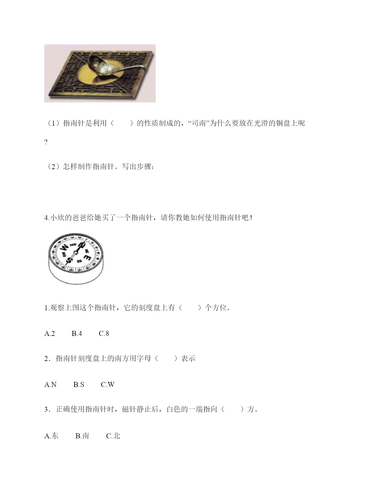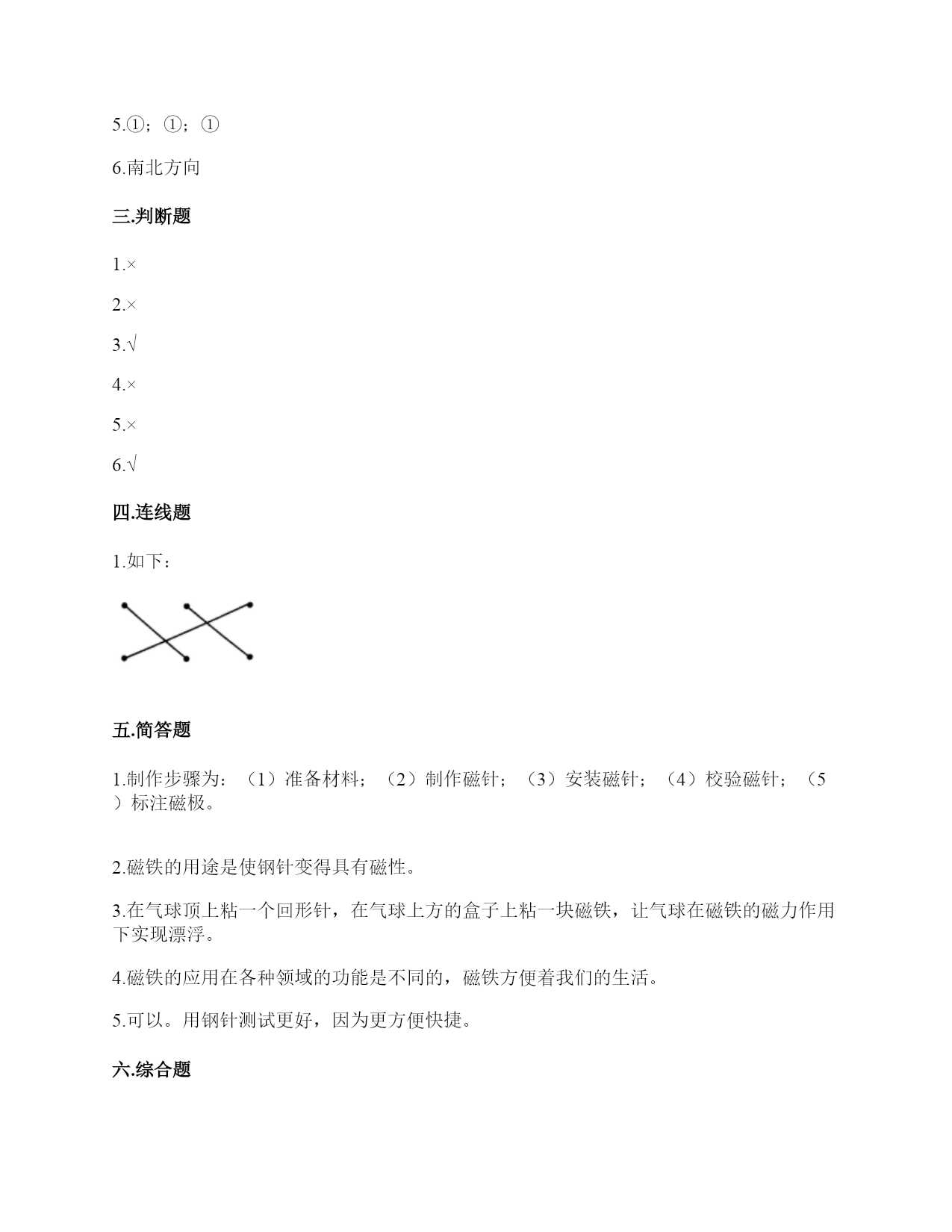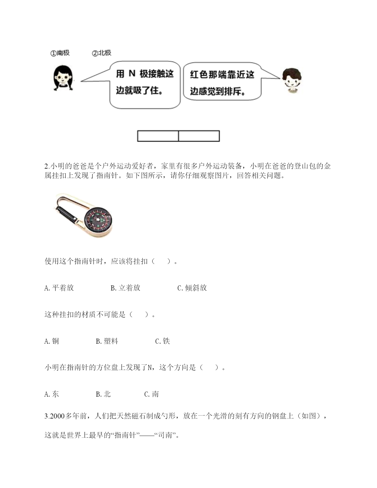 小学科学《磁铁》练习题一.选择题(共6题,共12分)1.指南针中字母S表示的方向为()。A.南B.北C.西2.下列关于磁铁的描述正确的是()。A.磁铁都是天然形成的B.磁铁隔着很厚的书也能吸铁C.磁铁有不同的形状,是因为它们的用途不同3.用磁化的小磁针靠近指南针,结果如图所示,说明针尖一端是()。A.S极B.北极C.N极4.下列物体中,()没有用到磁铁。A.B.C.5.把一块条形磁铁悬挂在空中使它能自由转动等磁铁静止时我们发现——磁极的两端分别指向()。A.东、西B.东、南C.南、北D.东、北6.指南针是利用磁铁能够()的特点制成的。A.吸铁B.导航C.指示南北方向二.填空题(共6题,共22分)1.指南针的四种放置方法分别是()、()、()和()。2.我国古代四大发明之一是应用磁铁可以指示方向的性质制成的,它是()。3.磁铁可以隔着一张纸对铁钉产生()作用。4.磁悬浮列车的轨道上都装有特殊的磁铁,利用()的相互作用,列车就悬浮在轨道上了。5.下列各图中磁铁靠近小车(铁制)时,小车分别会向哪边移动?①向左②向右();();()6.指南针是我国四大发明之一,利用了磁铁能够指示()的特点制成的。三.判断题(共6题,共12分)1.磁铁可以在很远的地方把小车吸引过来。()2.磁铁各个部分的磁性强弱相同。()3.普通的钢针经过磁铁摩擦就可以具有磁性。()4.磁带中并没有磁铁。()5.指南针是利用磁铁能够吸铁的特点制成的。()6.我们生活中使用的硬币有的含有镍,可以使用磁铁吸引。()四.连线题(共1题,共6分)1.连线题。五.简答题(共5题,共29分)1.简单说一说制作一个水浮式指南针的基本步骤有哪些?2.在制作水浮式指南针时,我们会用到一块磁铁,请问磁铁的用途是什么?3.我们在游乐场会看到有卖向上漂浮的气球,这是因为里面装入了比空气轻的氢气或氦气,你能用磁铁的原理代替氢气做出漂浮气球的效果吗?(请想一想,画出你的设计想法)4.你认为磁铁跟我们的生活有着怎样的关系?5.制作水浮式指南针时,我们是用摩擦过的钢针去吸引其他钢针来测试它有没有磁性的。可以用磁铁来测试吗?如果可以,哪种方法更好?如果不可以,为什么?六.综合题(共5题,共30分)1.有一块没有标明磁极的磁铁,两位同学用红蓝磁铁进行实验。请你根据图中两位同学说的话来判断磁极。(填序号)2.小明的爸爸是个户外运动爱好者,家里有很多户外运动装备,小明在爸爸的登山包的金属挂扣上发现了指南针。如下图所示,请你仔细观察图片,回答相关问题。使用这个指南针时,应该将挂扣()。A.平着放B.立着放C.倾斜放这种挂扣的材质不可能是()。A.铜B.塑料C.铁小明在指南针的方位盘上发现了N,这个方向是()。A.东B.北C.南3.2000多年前,人们把天然磁石制成勺形,放在一个光滑的刻有方向的钢盘上(如图),这就是世界上最早的“指南针”——“司南”。(1)指南针是利用()的性质制成的,“司南”为什么要放在光滑的铜盘上呢?(2)怎样制作指南针。写出步骤:4.小欣的爸爸给她买了一个指南针,请你教她如何使用指南针吧!1.观察上图这个指南针,它的刻度盘上有()个方位。A.2B.4C.82.指南针刻度盘上的南方用字母()表示A.NB.SC.W3.正确使用指南针时,磁针静止后,白色的一端指向()方。A.东B.南C.北4.如果指南针附近有铁制品,()影响指南针正常工作。A.会B.不会C.不一定5.请根据图中的情况,判断蹄形磁铁的磁极。参考答案一.选择题1.A2.C3.A4.C5.C6.C二.填空题1.碗唇旋定法;指甲旋定法;悬挂法;水浮法2.指南针3.吸引4.磁极5.①;①;①6.南北方向三.判断题1.×2.×3.√4.×5.×6.√四.连线题1.如下:五.简答题1.制作步骤为:(1)准备材料;(2)制作磁针;(3)安装磁针;(4)校验磁针;(5)标注磁极。2.磁铁的用途是使钢针变得具有磁性。3.在气球顶上粘一个回形针,在气球上方的盒子上粘一块磁铁,让气球在磁铁的磁力作用下实现漂浮。4.磁铁的应用在各种领域的功能是不同的,磁铁方便着我们的生活。5.可以。用钢针测试更好,因为更方便快捷。六.综合题1.①;②2.A;C;B3.磁铁指示南北方向;防止勺子与接触面的摩擦力影响方向的准确性;①用磁铁的磁极在钢针上沿一个方向摩擦,重复做20-30次。②用细线系在磁针的中间,将磁针悬挂起来,使磁针自由转动,磁针静止时指示的就是南北方向。4.CBBA5.北南