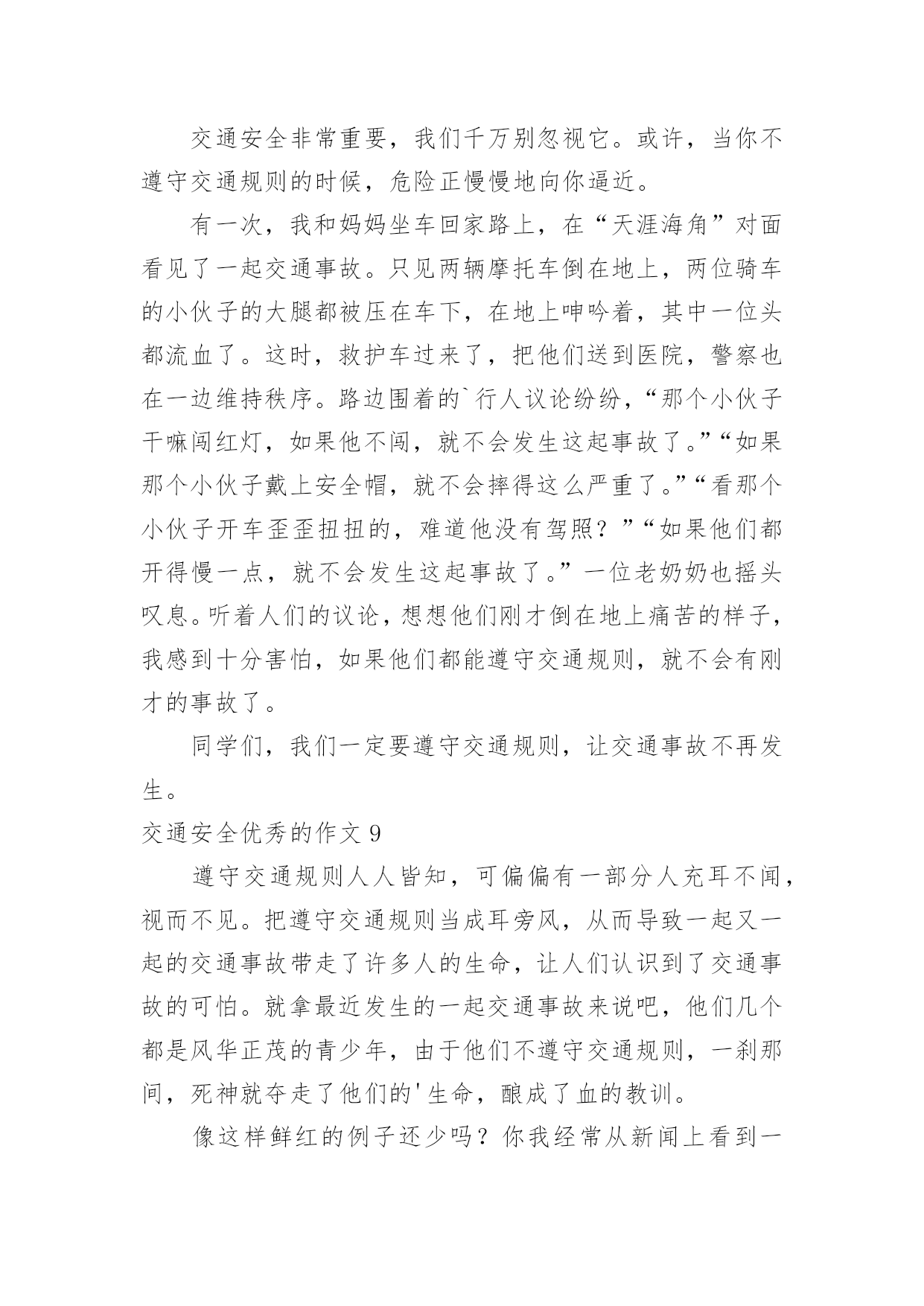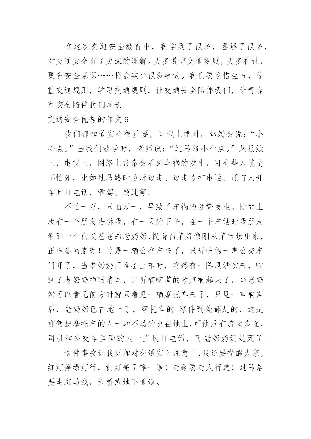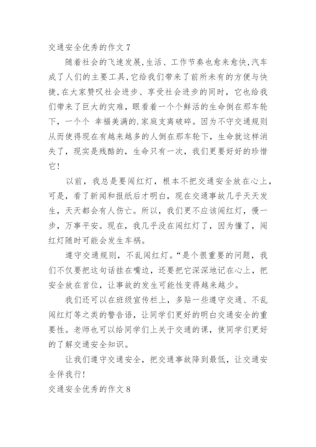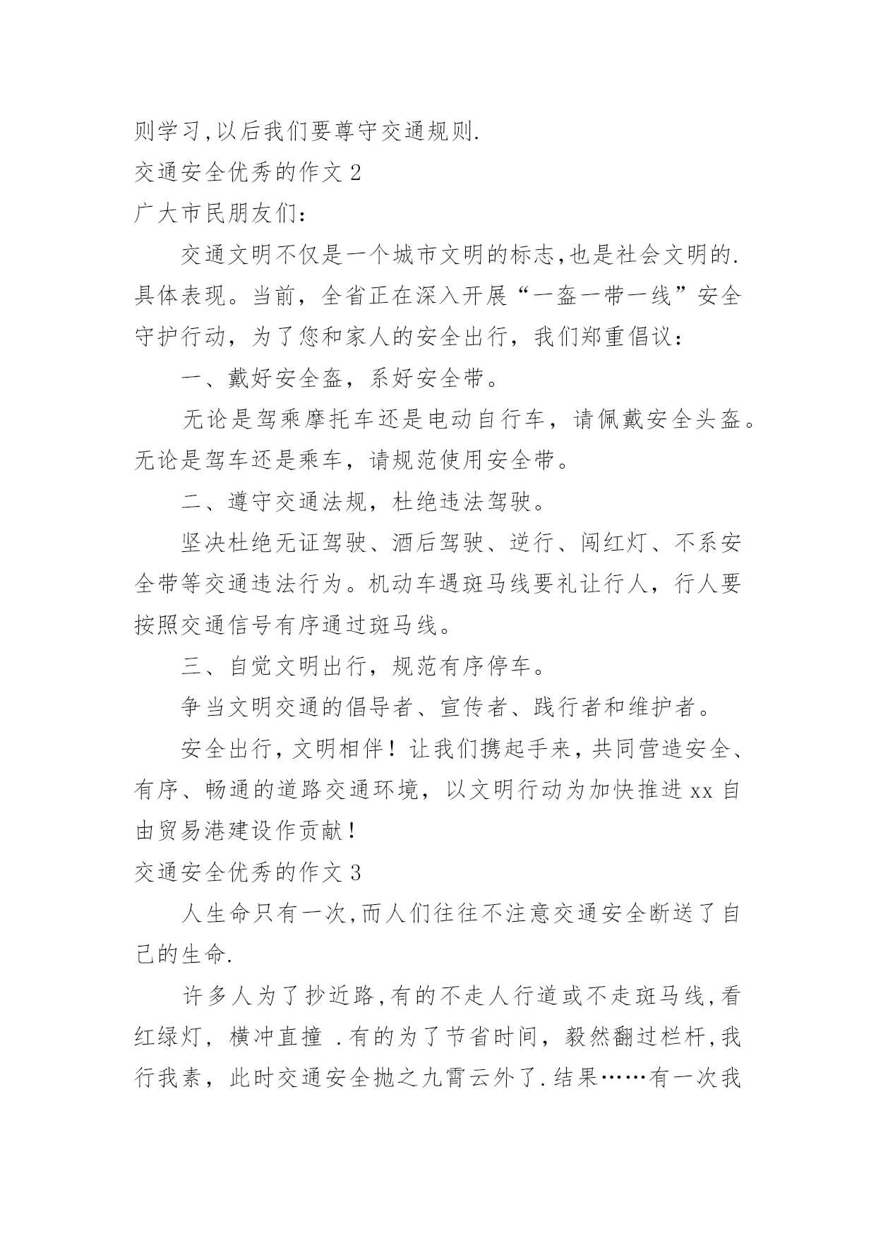 交通安全优秀的作文交通安全优秀的作文在日复一日的学习、工作或生活中,大家对作文都不陌生吧,作文是人们把记忆中所存储的有关知识、经验和思想用书面形式表达出来的记叙方式。你写作文时总是无从下笔?以下是小编帮大家整理的交通安全优秀的作文,仅供参考,大家一起来看看吧。交通安全优秀的作文1今天早上第三节课,我们学习道路交通安全知识,宣传刊里有一封>中我知道:日益发达的道路交通给我们带来便捷的同时,也给人们带来了许多伤痛.近几年来,我国都有10万左右的'人丧生于车轮下,因车祸而受伤的更是不计其数,马路已经成为无硝烟的战场,数以万计的青少年也在交通事故中被无情地夺走生命.20xx年上半年,我市一共发生事故359起,造成73人死亡,497人受伤,直接经济损失为元其中发生特大交通事故3起,死亡10人,受伤6人.这些血淋淋的事故背后绝大多数包含了不同程度的交通违法,正是这些人们不以为然的交通违法行为,给我们留下伤痛回忆.读完这一封信,心里非常愧疚,因为我也触犯过交通规则.一次风和日丽的早上,为了赶班车,像飞一样地跑着跑道马路我还没来得及看红绿灯叭叭,车全部叫了起来,我吓得跑了.通过交通规则学习,以后我们要尊守交通规则.交通安全优秀的作文2广大市民朋友们:交通文明不仅是一个城市文明的标志,也是社会文明的.具体表现。当前,全省正在深入开展“一盔一带一线”安全守护行动,为了您和家人的安全出行,我们郑重倡议:一、戴好安全盔,系好安全带。无论是驾乘摩托车还是电动自行车,请佩戴安全头盔。无论是驾车还是乘车,请规范使用安全带。二、遵守交通法规,杜绝违法驾驶。坚决杜绝无证驾驶、酒后驾驶、逆行、闯红灯、不系安全带等交通违法行为。机动车遇斑马线要礼让行人,行人要按照交通信号有序通过斑马线。三、自觉文明出行,规范有序停车。争当文明交通的倡导者、宣传者、践行者和维护者。安全出行,文明相伴!让我们携起手来,共同营造安全、有序、畅通的道路交通环境,以文明行动为加快推进xx自由贸易港建设作贡献!交通安全优秀的作文3人生命只有一次,而人们往往不注意交通安全断送了自己的生命.许多人为了抄近路,有的不走人行道或不走斑马线,看红绿灯,横冲直撞.有的为了节省时间,毅然翻过栏杆,我行我素,此时交通安全抛之九霄云外了.结果……有一次我去食杂店买盐.一个看去像17-18岁的`男孩,准备过马路.他横冲直撞,与一辆黑色的小汽车撞了个正着,倒在了地上,永远睁不开眼睛.这可是血的教训呀!现在许多人,骑车的速度十分快,好像有十万火急的事,结果车毁人亡,不堪设想.有一天晚上,我正在窗前写作业,感到十分疲惫,便倚在窗前休息.忽然,一个年青人,自以为车技好,竟然坐自行车不扶车把手,漫不经心.但“天有不测风云,人有旦夕之福”,正面冲一辆飞一般的摩托车,由于年青人来不及时转弯,只听“砰”地一声年青人被弹出去,头撞在水泥地上,血溅了一地,不省人事.我心里一痛:一个生命就这样消失了?怎叫人不刻骨铭心!嗨,不遵守交通规则,是要付出代价的,后果将是惨不忍睹的.“交通安全记心中”,让我们自觉遵守交通规则,以免乐及生悲!交通安全优秀的作文4交通安全离不开你我他,生活中处处有交通,所以处处也会有交通安全。先说最简单的,我们上学,肯定离不开交通。比如说我,我上学先要到公交车站,中间就有一条车比较多的马路。虽然车比较多,但还是没有红绿灯,所以只能靠自己了。我会左右看一看,沿着斑马线走到对面的公交车站。然后等车。上了公交车,我发现公交车一般都会开得比较慢,我想这也是处于我们车上乘客的安全起见。我仔细看着每一步,红绿灯遇到时,就算快到了红灯,驾驶员也会减速下来,不想有一些人是加足马力冲上去,尽量赶上绿灯,或者有一些人干脆就闯红灯,这种行为是最不安全的了。在乘车点到学校还有一段距离,中间有一条马路,有交警指挥,所以秩序比较好。生活中也有很多交通安全警示牌,是黄色的牌子。比如说我们一家去江西资溪,那里可是正宗的山区。有一处很有名的`山路,叫做“佛头岭”。那里的山路非常险,所以时不时会出现黄色的标志。有山体滑坡警告标志,也有连续弯道警告标志……如果看见了这种牌子,就一定要小心交通安全了。生活处处有交通,我们一定要小心交通上的危险!交通安全优秀的作文5在此之前,我只知道一些关于交通安全的知识,但是我对交通安全并没有深入的了解。在秋天的'交通安全亲子课上,我从那些令人震惊的例子中了解到交通安全的重要性。平时,人们总是说要注意安全,珍惜生命,却总是忽略了安全交通。他们总觉得自己没那么倒霉。他们过马路时不注意,冒险。然而,交通事故的发生总是那么的随机,却是生命中无法承受的重量。小小的疏忽,后果极其严重。我们只有一次生命,所以我们应该严格遵守交通安全。交通安全是多么重要,我们应该从小自觉遵守交通规则,不要翻越道路中间的安全护栏和隔离墩。我们要牢