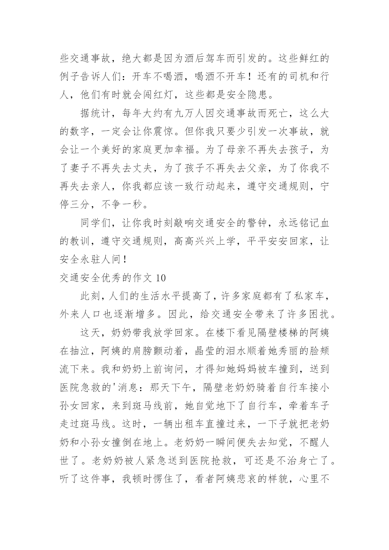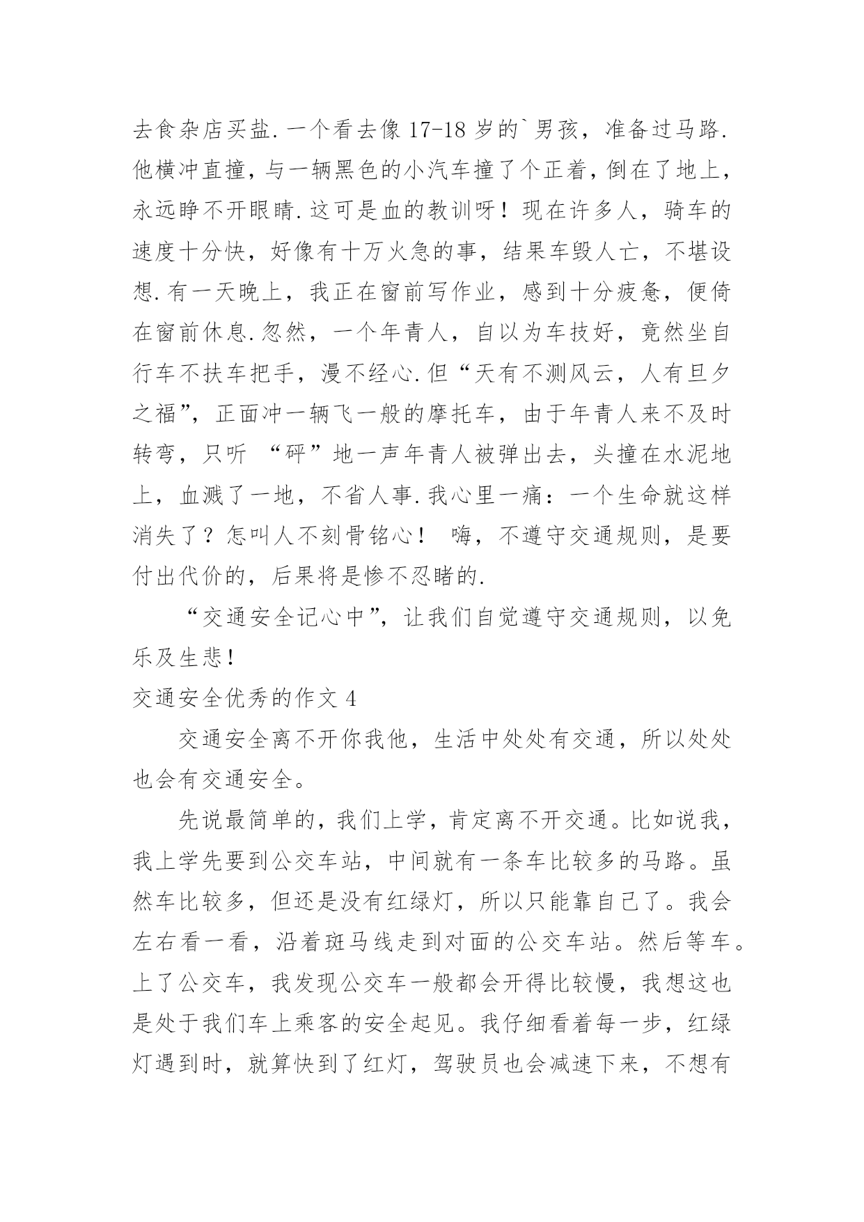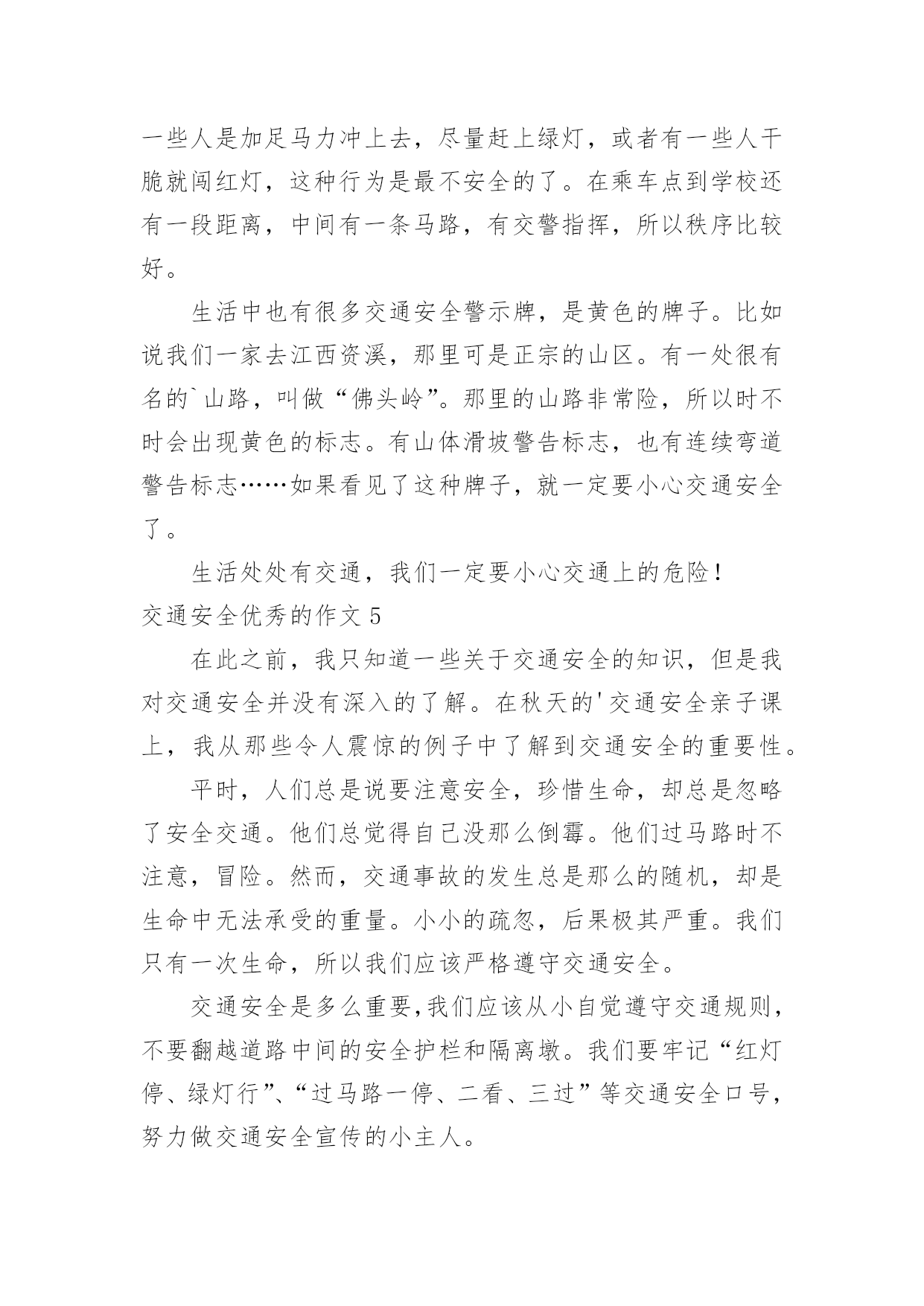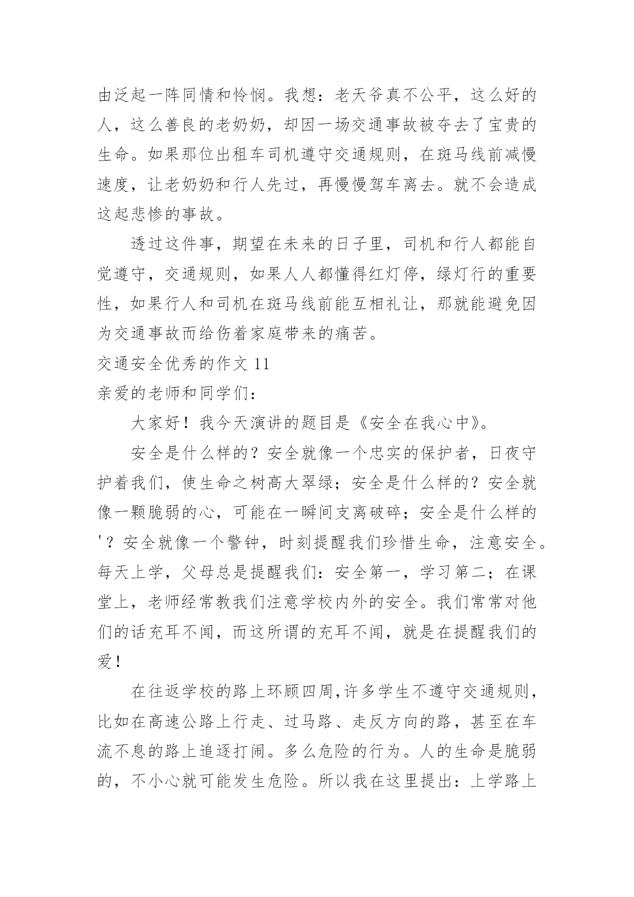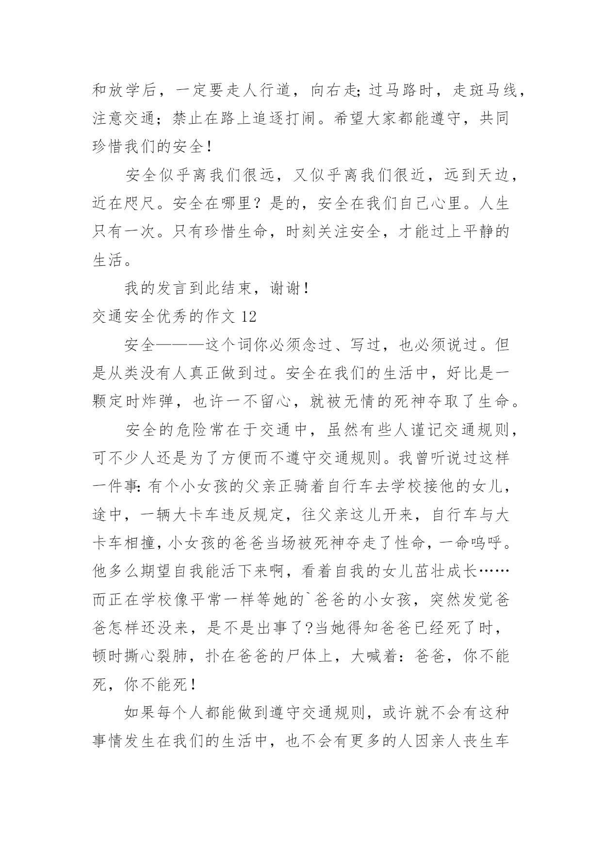 交通安全优秀的作文交通安全优秀的作文在日复一日的学习、工作或生活中,大家对作文都不陌生吧,作文是人们把记忆中所存储的有关知识、经验和思想用书面形式表达出来的记叙方式。你写作文时总是无从下笔?以下是小编帮大家整理的交通安全优秀的作文,仅供参考,大家一起来看看吧。交通安全优秀的作文1今天早上第三节课,我们学习道路交通安全知识,宣传刊里有一封>中我知道:日益发达的道路交通给我们带来便捷的同时,也给人们带来了许多伤痛.近几年来,我国都有10万左右的'人丧生于车轮下,因车祸而受伤的更是不计其数,马路已经成为无硝烟的战场,数以万计的青少年也在交通事故中被无情地夺走生命.20xx年上半年,我市一共发生事故359起,造成73人死亡,497人受伤,直接经济损失为元其中发生特大交通事故3起,死亡10人,受伤6人.这些血淋淋的事故背后绝大多数包含了不同程度的交通违法,正是这些人们不以为然的交通违法行为,给我们留下伤痛回忆.读完这一封信,心里非常愧疚,因为我也触犯过交通规则.一次风和日丽的早上,为了赶班车,像飞一样地跑着跑道马路我还没来得及看红绿灯叭叭,车全部叫了起来,我吓得跑了.通过交通规则学习,以后我们要尊守交通规则.交通安全优秀的作文2广大市民朋友们:交通文明不仅是一个城市文明的标志,也是社会文明的.具体表现。当前,全省正在深入开展“一盔一带一线”安全守护行动,为了您和家人的安全出行,我们郑重倡议:一、戴好安全盔,系好安全带。无论是驾乘摩托车还是电动自行车,请佩戴安全头盔。无论是驾车还是乘车,请规范使用安全带。二、遵守交通法规,杜绝违法驾驶。坚决杜绝无证驾驶、酒后驾驶、逆行、闯红灯、不系安全带等交通违法行为。机动车遇斑马线要礼让行人,行人要按照交通信号有序通过斑马线。三、自觉文明出行,规范有序停车。争当文明交通的倡导者、宣传者、践行者和维护者。安全出行,文明相伴!让我们携起手来,共同营造安全、有序、畅通的道路交通环境,以文明行动为加快推进xx自由贸易港建设作贡献!交通安全优秀的作文3人生命只有一次,而人们往往不注意交通安全断送了自己的生命.许多人为了抄近路,有的不走人行道或不走斑马线,看红绿灯,横冲直撞.有的为了节省时间,毅然翻过栏杆,我行我素,此时交通安全抛之九霄云外了.结果……有一次我去食杂店买盐.一个看去像17-18岁的`男孩,准备过马路.他横冲直撞,与一辆黑色的小汽车撞了个正着,倒在了地上,永远睁不开眼睛.这可是血的教训呀!现在许多人,骑车的速度十分快,好像有十万火急的事,结果车毁人亡,不堪设想.有一天晚上,我正在窗前写作业,感到十分疲惫,便倚在窗前休息.忽然,一个年青人,自以为车技好,竟然坐自行车不扶车把手,漫不经心.但“天有不测风云,人有旦夕之福”,正面冲一辆飞一般的摩托车,由于年青人来不及时转弯,只听“砰”地一声年青人被弹出去,头撞在水泥地上,血溅了一地,不省人事.我心里一痛:一个生命就这样消失了?怎叫人不刻骨铭心!嗨,不遵守交通规则,是要付出代价的,后果将是惨不忍睹的.“交通安全记心中”,让我们自觉遵守交通规则,以免乐及生悲!交通安全优秀的作文4交通安全离不开你我他,生活中处处有交通,所以处处也会有交通安全。先说最简单的,我们上学,肯定离不开交通。比如说我,我上学先要到公交车站,中间就有一条车比较多的马路。虽然车比较多,但还是没有红绿灯,所以只能靠自己了。我会左右看一看,沿着斑马线走到对面的公交车站。然后等车。上了公交车,我发现公交车一般都会开得比较慢,我想这也是处于我们车上乘客的安全起见。我仔细看着每一步,红绿灯遇到时,就算快到了红灯,驾驶员也会减速下来,不想有一些人是加足马力冲上去,尽量赶上绿灯,或者有一些人干脆就闯红灯,这种行为是最不安全的了。在乘车点到学校还有一段距离,中间有一条马路,有交警指挥,所以秩序比较好。生活中也有很多交通安全警示牌,是黄色的牌子。比如说我们一家去江西资溪,那里可是正宗的山区。有一处很有名的`山路,叫做“佛头岭”。那里的山路非常险,所以时不时会出现黄色的标志。有山体滑坡警告标志,也有连续弯道警告标志……如果看见了这种牌子,就一定要小心交通安全了。生活处处有交通,我们一定要小心交通上的危险!交通安全优秀的作文5在此之前,我只知道一些关于交通安全的知识,但是我对交通安全并没有深入的了解。在秋天的'交通安全亲子课上,我从那些令人震惊的例子中了解到交通安全的重要性。平时,人们总是说要注意安全,珍惜生命,却总是忽略了安全交通。他们总觉得自己没那么倒霉。他们过马路时不注意,冒险。然而,交通事故的发生总是那么的随机,却是生命中无法承受的重量。小小的疏忽,后果极其严重。我们只有一次生命,所以我们应该严格遵守交通安全。交通安全是多么重要,我们应该从小自觉遵守交通规则,不要翻越道路中间的安全护栏和隔离墩。我们要牢