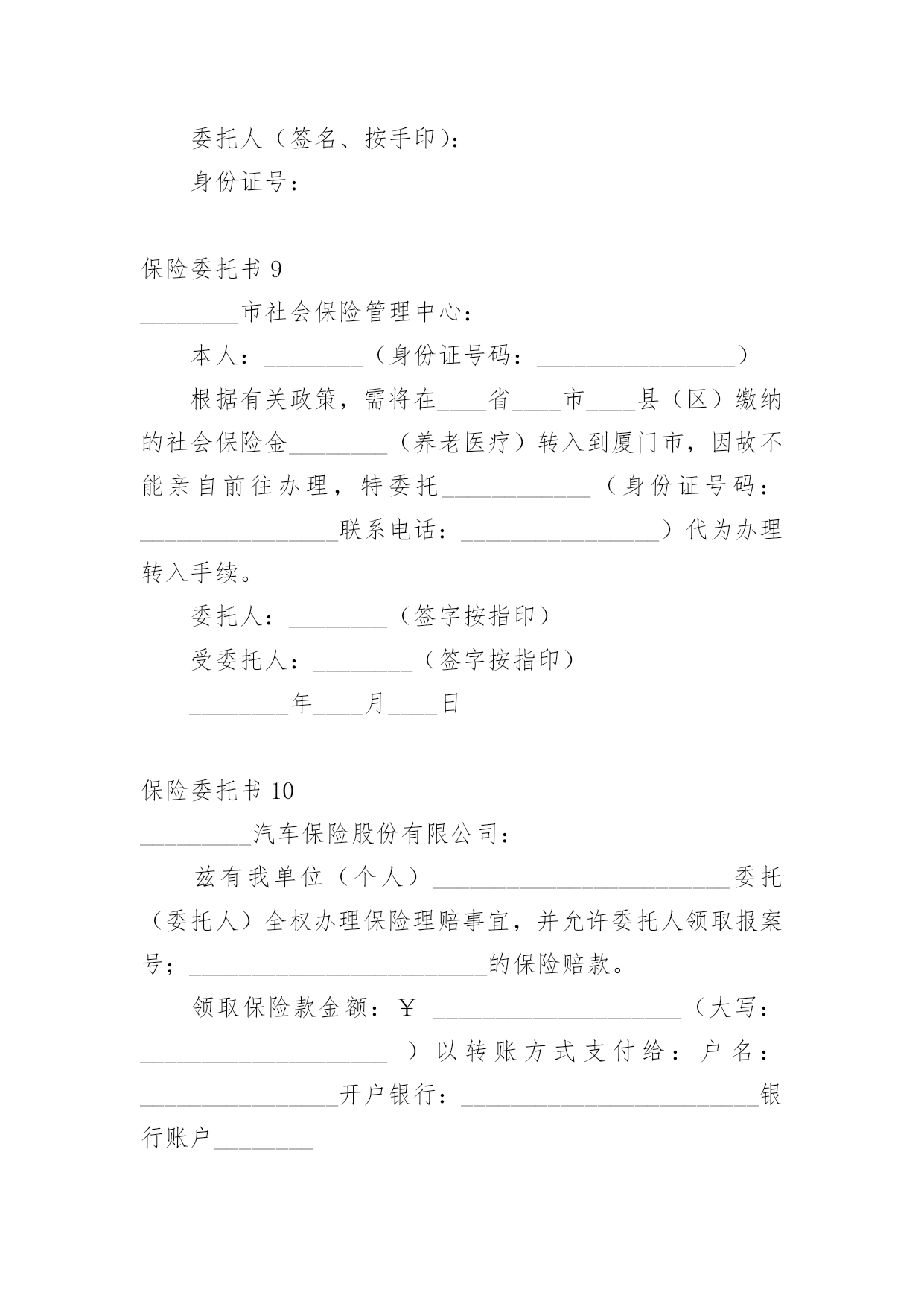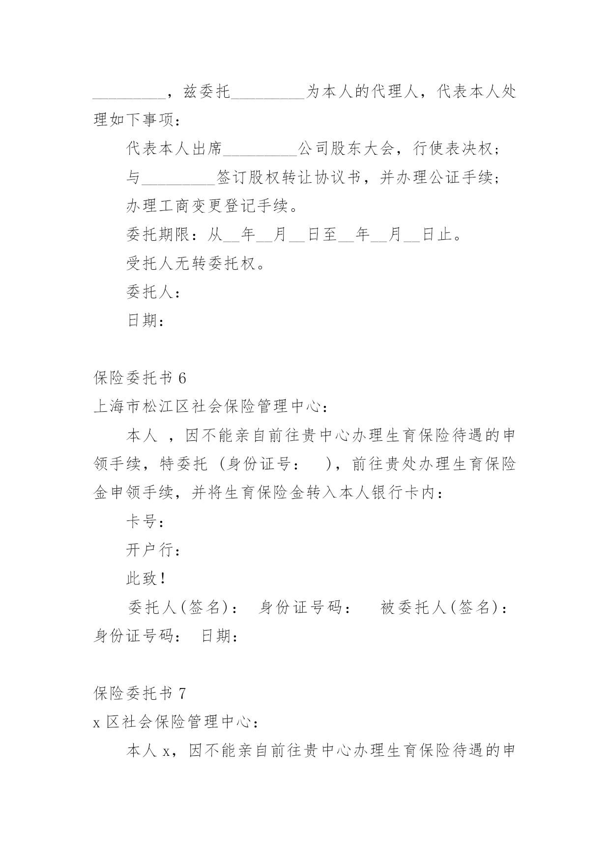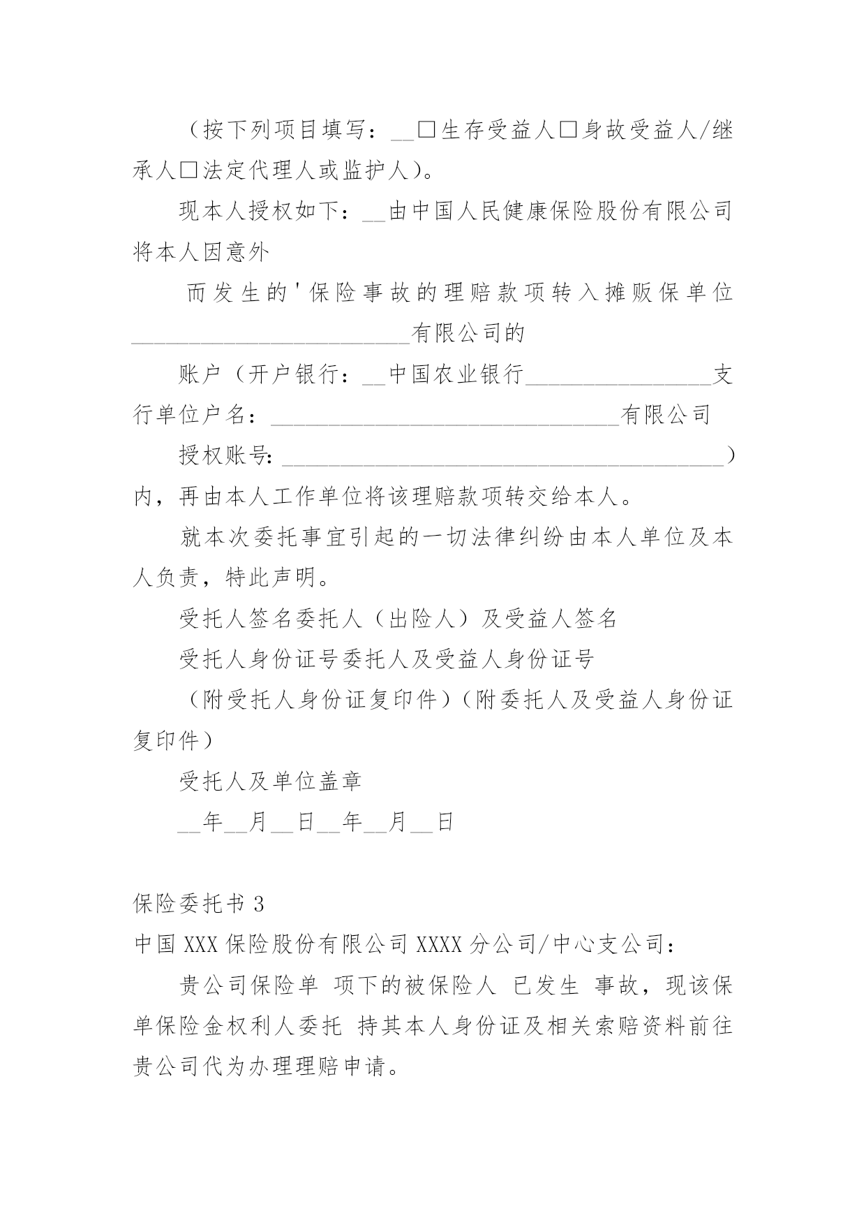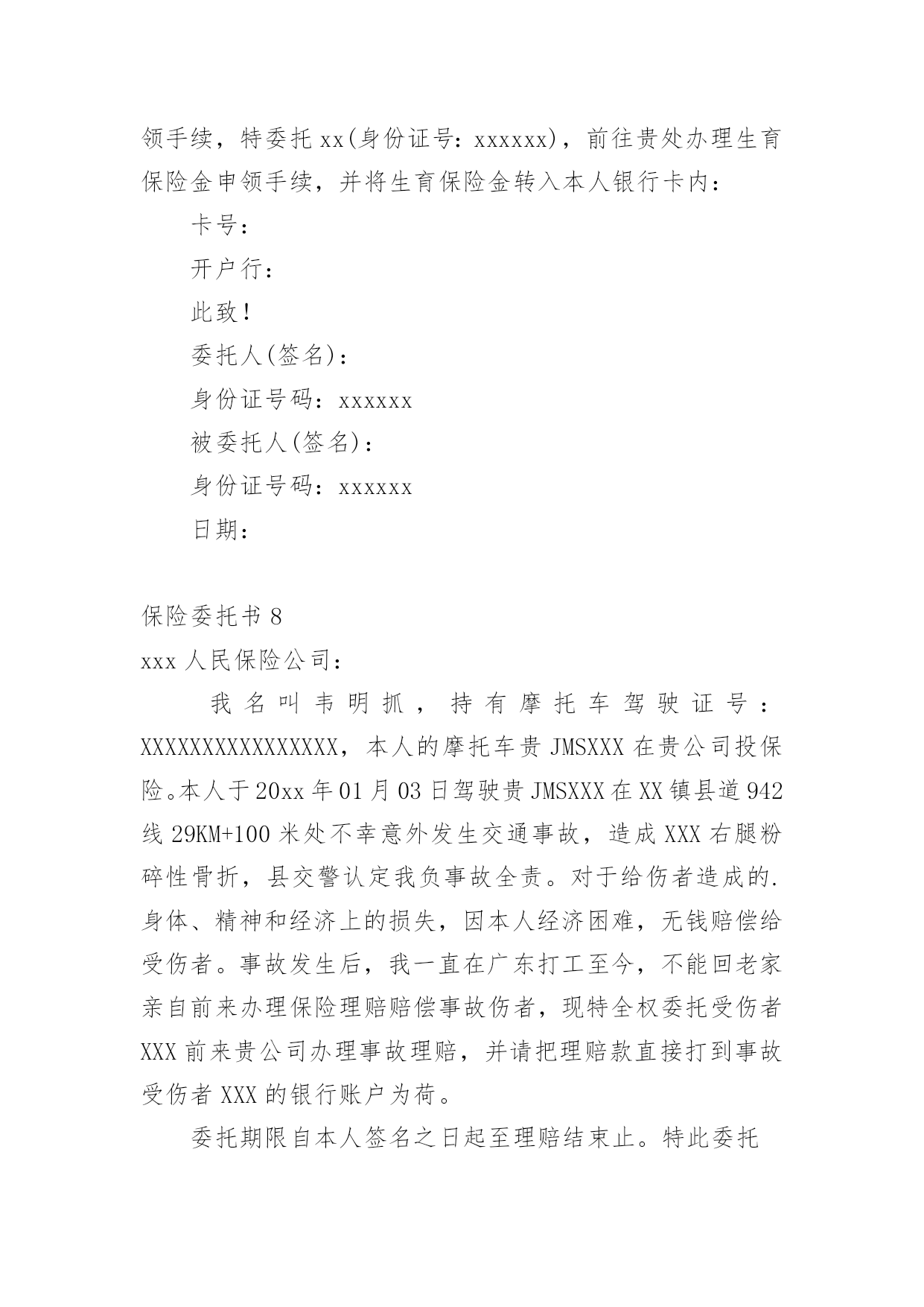 保险委托书(精品)保险委托书在委托人的委托书上的合法权益内,委托人不得以任何理由反悔委托事项。在我们平凡的日常里,委托书在处理事务上的使用越来越广泛,相信很多朋友都对写委托书感到非常苦恼吧,以下是小编精心整理的保险委托书,欢迎阅读,希望大家能够喜欢。保险委托书1市社会保险基金管理中心:兹委托同志前来办理参保人(姓名:,身份证号码:,保险编号:)的有关社会保险待遇(待遇项目:)申领手续。委托人签名:身份证号码:联系人电话:与参保人关系:年月日注:受托人需同时携带身份证原件、委托人身份证复印件和相关业务材料。保险委托书2中国人民健康保险股份有限公司广东分公司:本人系贵公司保险合同号________________________________下所属的(按下列项目填写:__□生存受益人□身故受益人/继承人□法定代理人或监护人)。现本人授权如下:__由中国人民健康保险股份有限公司将本人因意外而发生的'保险事故的理赔款项转入摊贩保单位________________________有限公司的账户(开户银行:__中国农业银行________________支行单位户名:______________________________有限公司授权账号:______________________________________)内,再由本人工作单位将该理赔款项转交给本人。就本次委托事宜引起的一切法律纠纷由本人单位及本人负责,特此声明。受托人签名委托人(出险人)及受益人签名受托人身份证号委托人及受益人身份证号(附受托人身份证复印件)(附委托人及受益人身份证复印件)受托人及单位盖章__年__月__日__年__月__日保险委托书3中国XXX保险股份有限公司XXXX分公司/中心支公司:贵公司保险单项下的被保险人已发生事故,现该保单保险金权利人委托持其本人身份证及相关索赔资料前往贵公司代为办理理赔申请。委托期限:自年月日至理赔结束时止。委托人郑重声明,凡由本授权委托书引发的任何法律或经济纠纷由委托人承担,与贵公司无关。委托人签名栏:委托人(签名)身份证号码:与被保险人关系:日期:受托人签名:身份证号:受托人联系电话:日期:注:1、未指定受益人的.,保险金作为被保险人遗产由第一顺序继承人继承(第一顺序继承人为父母、子女、配偶)2、请提供委托人和受托人身份证明原件保险理赔授权委托书(三)中国平安人寿保险股份有限公司/平安养老保险股份有限公司:本人(姓名)身份证件号码:系单位(保单号)下所载之:囗被保险人囗被保险人之法定代理人囗指定受益人囗继承人囗其他现根据贵公司规定全权委托先生/小姐身份证件号码:在年月日至年月日持本授权人身份证件,以本人名义前往贵公司就本合同办理囗理赔囗给付申请囗退保申请囗退费申请囗代领保险金囗其他受托人声明:第一、受托人保证授权人的`签名为亲笔签名,如有纠纷,受托人自愿承担相应责任;第二、受托人在授权有效期内代为办理委托,严格遵循授权人的真实意愿,所实施的行为如超出授权范围,受托人自愿承担相应责任。授权人签名:授权人证件号码:联系电话:受托人签名:受托人证件号码:联系电话:并委托中国平安人寿保险股份有限公司/平安养老保险股份有限公司分公司(以下简称保险人)在理赔案件结案后或给付办妥后将保险金转账至如下账户,转账给付汇总信息如下:开户行:授权转账账号:户名:与受益人关系:联系地址:联系电话:如保险金要求转入非受益人本人账户,请说明原因:如保险金经受益人授权要求转账至投保单位账户,请投保单位对以上转账信息进行盖章确认。授权人声明:本被保险人(或经被保险人同意之委托代理人或其法定法定代理人)作为授权人,已仔细核对上述转账给付信息无误,并同意若发生下述情况时,由授权人自行承担责任:1、若授权人所提供的授权书账号错误,而导致保险人无法转入或错误转入他人账号;2、若授权人所提供的授权书账号由于非保险人或非银行原因被注销,导致转账给付失败;3、若被保险人遗失转账账户后未及时通知保险人、并重新授权,导致保险人按遗失账号转入或转账给付失败;授权人签章:投保单位签章:证件号码:单位经办人签章:联系电话:联系电话:年月日保险委托书4中国人民财产保险股份有限公司____市分公司:我公司委托同志到贵公司办理车辆保险过户事宜,对受托人在办理上述事项过程中所签署的有关文件,我公司均予以认可,并承担相应的法律责任。受托人签名:20____年____月____日保险委托书5委托人:____,男(女),__年__月__日出生,身份证号码:___________________________委托书_________受托人:____,男(女),__年__月__日出生,身份证号码:__________________________________________本人系_