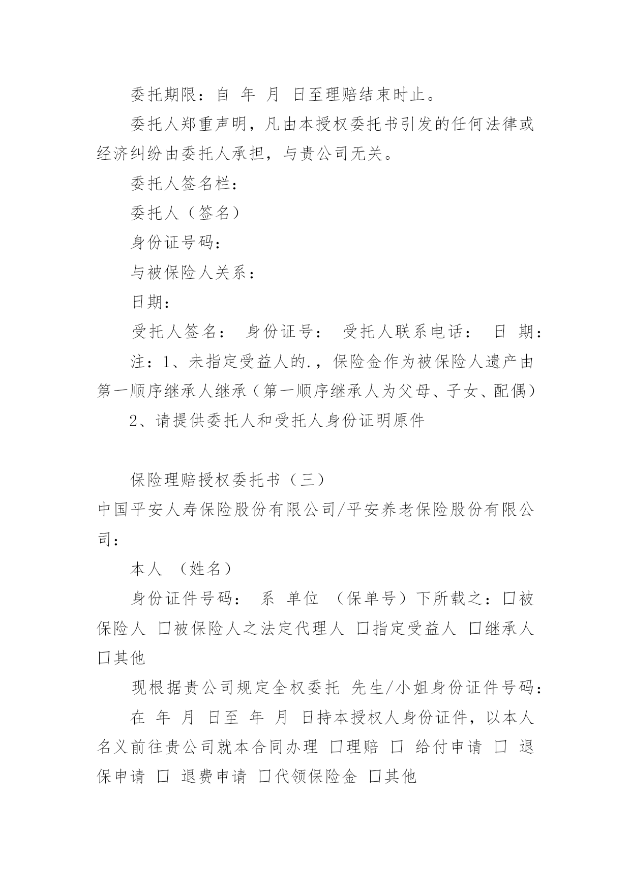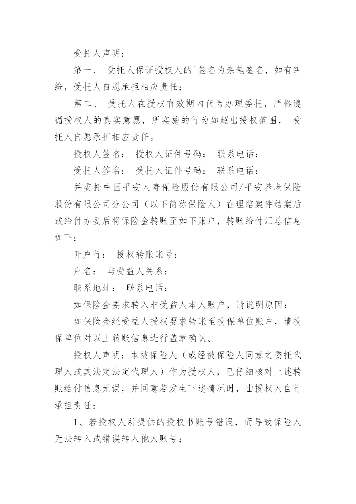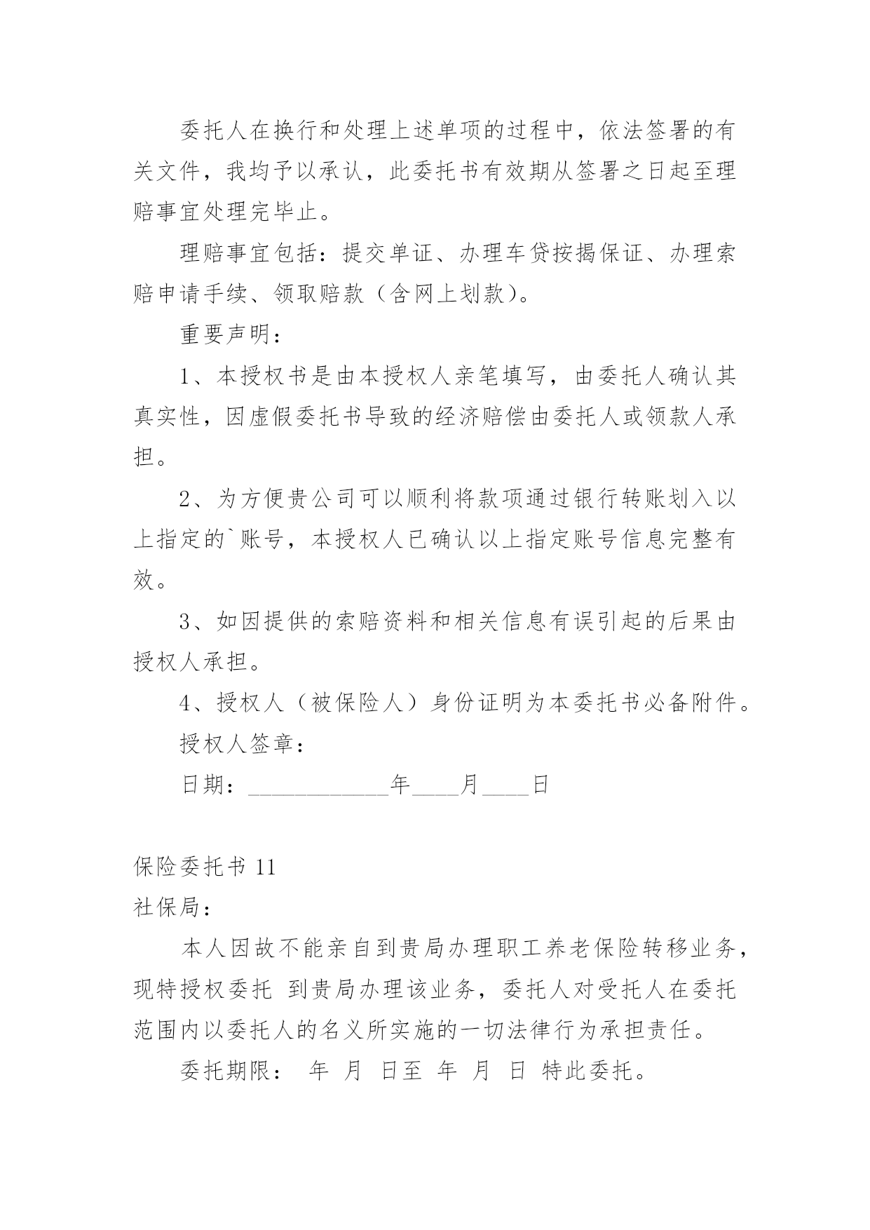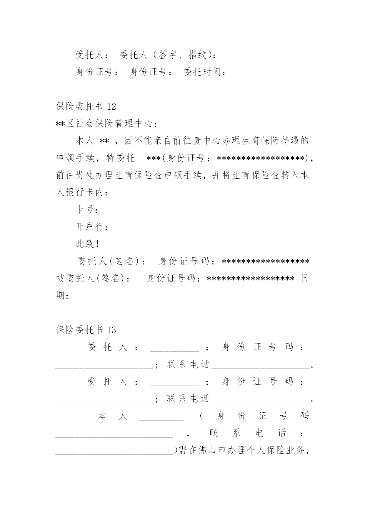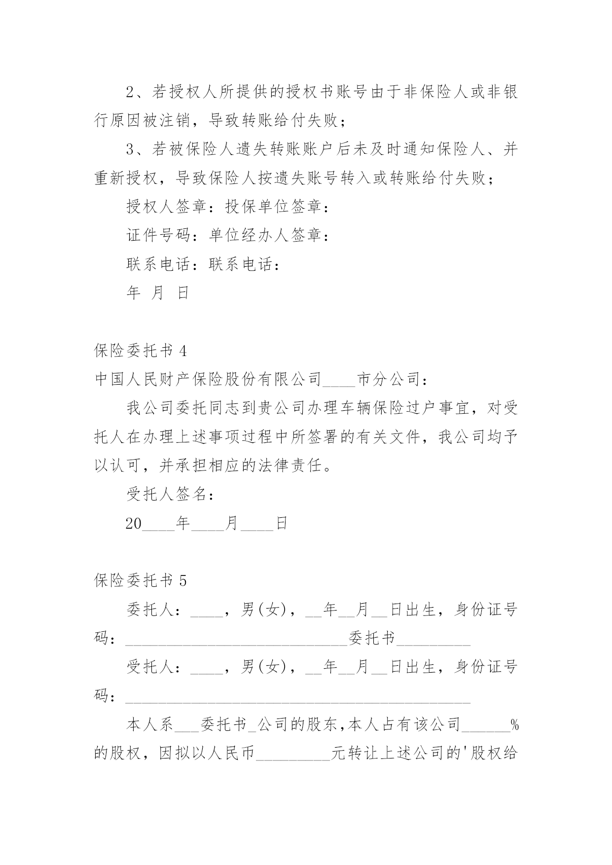 保险委托书(精品)保险委托书在委托人的委托书上的合法权益内,委托人不得以任何理由反悔委托事项。在我们平凡的日常里,委托书在处理事务上的使用越来越广泛,相信很多朋友都对写委托书感到非常苦恼吧,以下是小编精心整理的保险委托书,欢迎阅读,希望大家能够喜欢。保险委托书1市社会保险基金管理中心:兹委托同志前来办理参保人(姓名:,身份证号码:,保险编号:)的有关社会保险待遇(待遇项目:)申领手续。委托人签名:身份证号码:联系人电话:与参保人关系:年月日注:受托人需同时携带身份证原件、委托人身份证复印件和相关业务材料。保险委托书2中国人民健康保险股份有限公司广东分公司:本人系贵公司保险合同号________________________________下所属的(按下列项目填写:__□生存受益人□身故受益人/继承人□法定代理人或监护人)。现本人授权如下:__由中国人民健康保险股份有限公司将本人因意外而发生的'保险事故的理赔款项转入摊贩保单位________________________有限公司的账户(开户银行:__中国农业银行________________支行单位户名:______________________________有限公司授权账号:______________________________________)内,再由本人工作单位将该理赔款项转交给本人。就本次委托事宜引起的一切法律纠纷由本人单位及本人负责,特此声明。受托人签名委托人(出险人)及受益人签名受托人身份证号委托人及受益人身份证号(附受托人身份证复印件)(附委托人及受益人身份证复印件)受托人及单位盖章__年__月__日__年__月__日保险委托书3中国XXX保险股份有限公司XXXX分公司/中心支公司:贵公司保险单项下的被保险人已发生事故,现该保单保险金权利人委托持其本人身份证及相关索赔资料前往贵公司代为办理理赔申请。委托期限:自年月日至理赔结束时止。委托人郑重声明,凡由本授权委托书引发的任何法律或经济纠纷由委托人承担,与贵公司无关。委托人签名栏:委托人(签名)身份证号码:与被保险人关系:日期:受托人签名:身份证号:受托人联系电话:日期:注:1、未指定受益人的.,保险金作为被保险人遗产由第一顺序继承人继承(第一顺序继承人为父母、子女、配偶)2、请提供委托人和受托人身份证明原件保险理赔授权委托书(三)中国平安人寿保险股份有限公司/平安养老保险股份有限公司:本人(姓名)身份证件号码:系单位(保单号)下所载之:囗被保险人囗被保险人之法定代理人囗指定受益人囗继承人囗其他现根据贵公司规定全权委托先生/小姐身份证件号码:在年月日至年月日持本授权人身份证件,以本人名义前往贵公司就本合同办理囗理赔囗给付申请囗退保申请囗退费申请囗代领保险金囗其他受托人声明:第一、受托人保证授权人的`签名为亲笔签名,如有纠纷,受托人自愿承担相应责任;第二、受托人在授权有效期内代为办理委托,严格遵循授权人的真实意愿,所实施的行为如超出授权范围,受托人自愿承担相应责任。授权人签名:授权人证件号码:联系电话:受托人签名:受托人证件号码:联系电话:并委托中国平安人寿保险股份有限公司/平安养老保险股份有限公司分公司(以下简称保险人)在理赔案件结案后或给付办妥后将保险金转账至如下账户,转账给付汇总信息如下:开户行:授权转账账号:户名:与受益人关系:联系地址:联系电话:如保险金要求转入非受益人本人账户,请说明原因:如保险金经受益人授权要求转账至投保单位账户,请投保单位对以上转账信息进行盖章确认。授权人声明:本被保险人(或经被保险人同意之委托代理人或其法定法定代理人)作为授权人,已仔细核对上述转账给付信息无误,并同意若发生下述情况时,由授权人自行承担责任:1、若授权人所提供的授权书账号错误,而导致保险人无法转入或错误转入他人账号;2、若授权人所提供的授权书账号由于非保险人或非银行原因被注销,导致转账给付失败;3、若被保险人遗失转账账户后未及时通知保险人、并重新授权,导致保险人按遗失账号转入或转账给付失败;授权人签章:投保单位签章:证件号码:单位经办人签章:联系电话:联系电话:年月日保险委托书4中国人民财产保险股份有限公司____市分公司:我公司委托同志到贵公司办理车辆保险过户事宜,对受托人在办理上述事项过程中所签署的有关文件,我公司均予以认可,并承担相应的法律责任。受托人签名:20____年____月____日保险委托书5委托人:____,男(女),__年__月__日出生,身份证号码:___________________________委托书_________受托人:____,男(女),__年__月__日出生,身份证号码:__________________________________________本人系_
